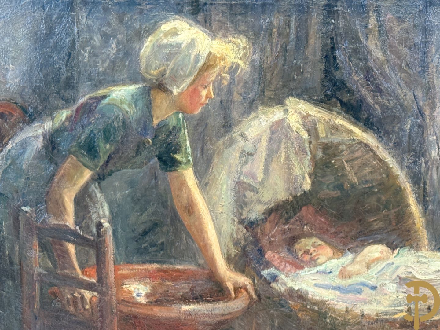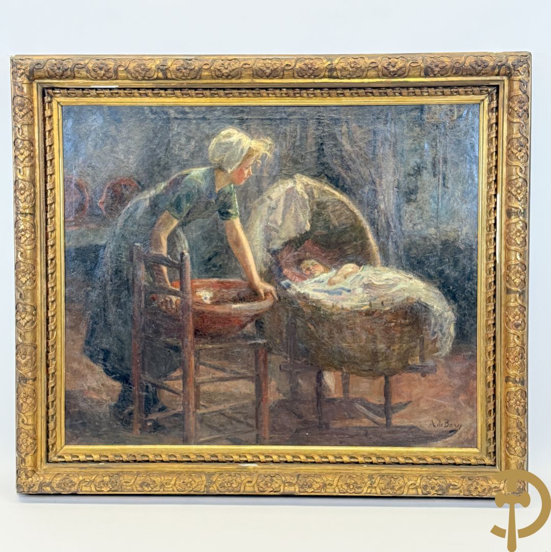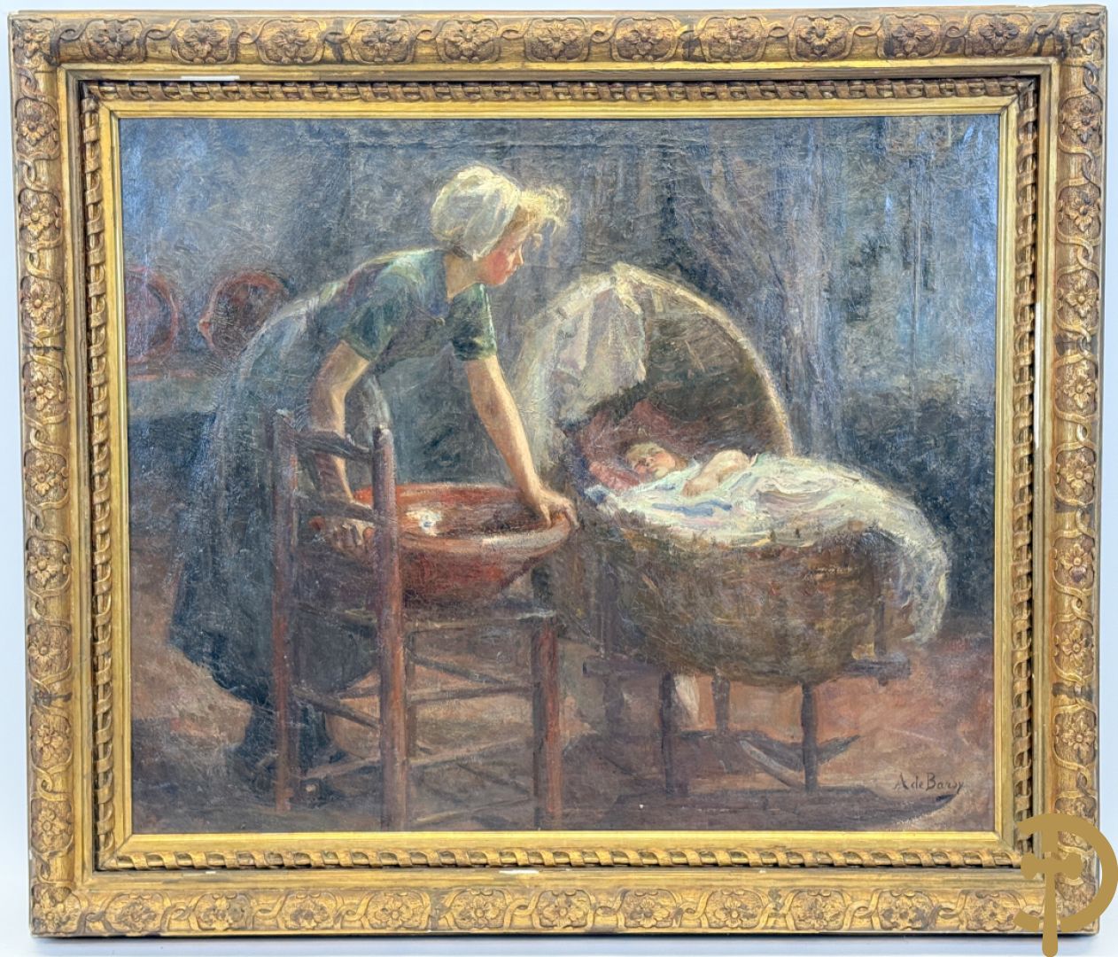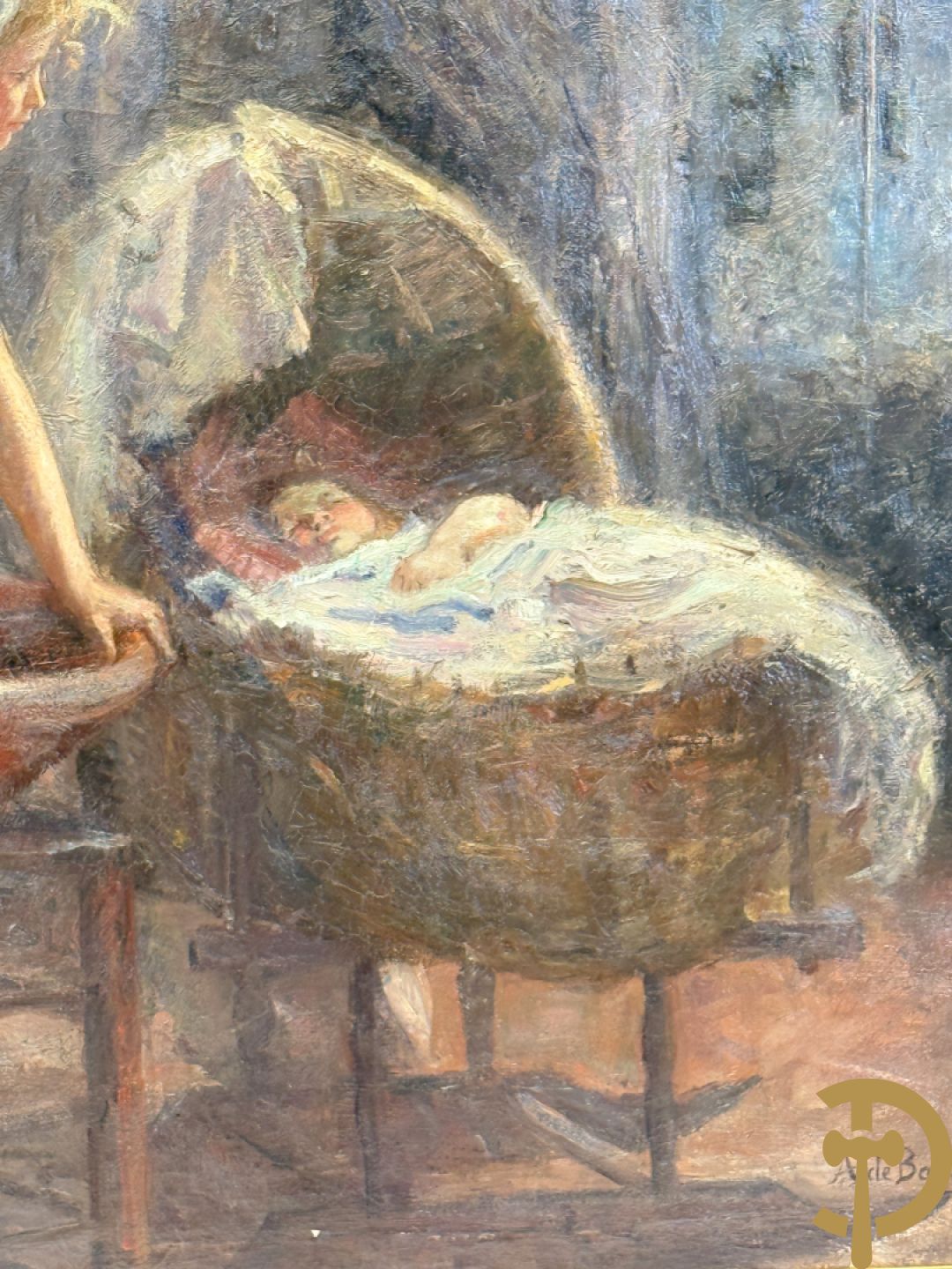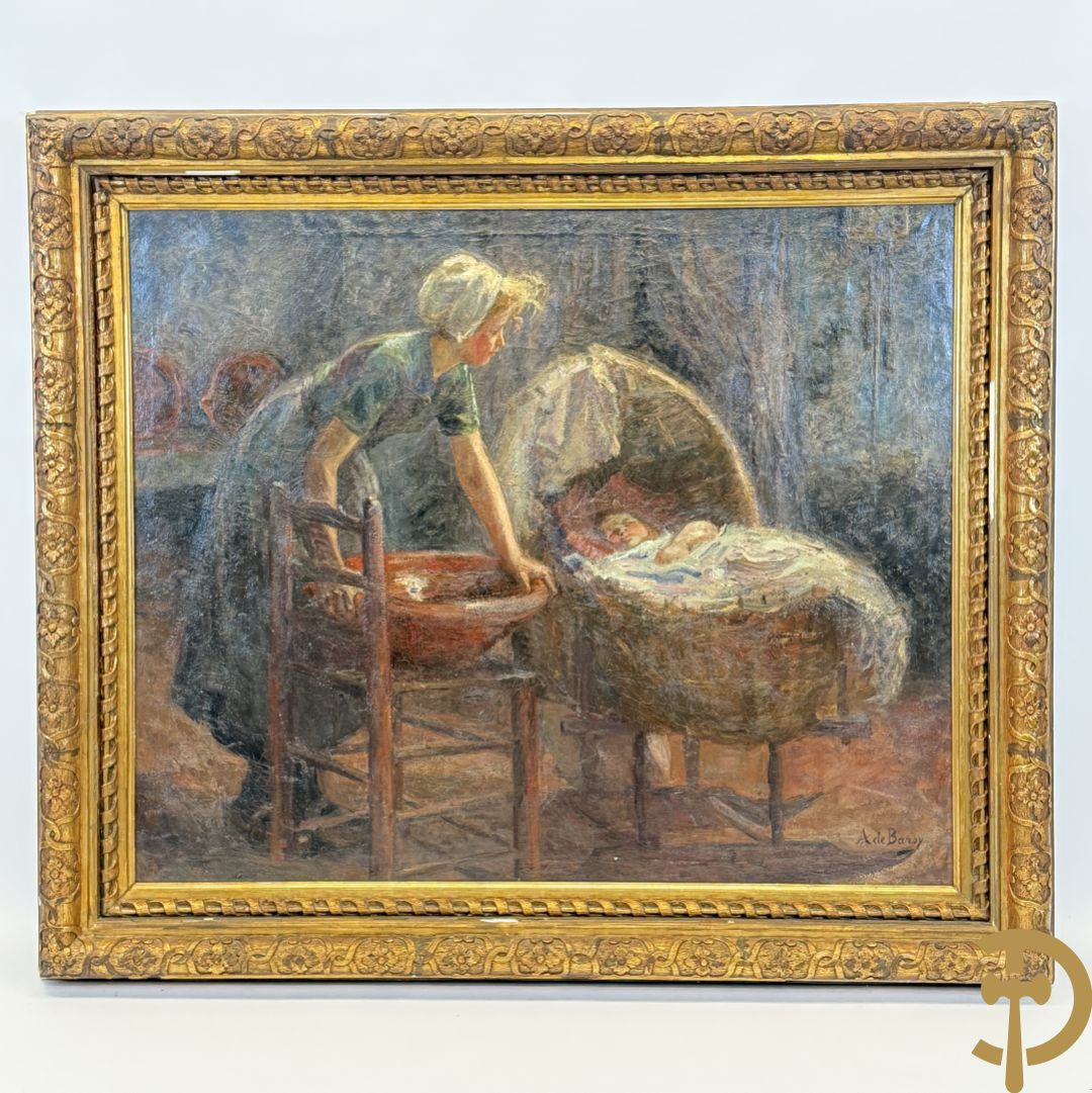 DE BARSY A. getekend (Anna) 1878-1949 'Geanimeerde interieurscène met jonge moeder en kind in de wieg' olie op doek