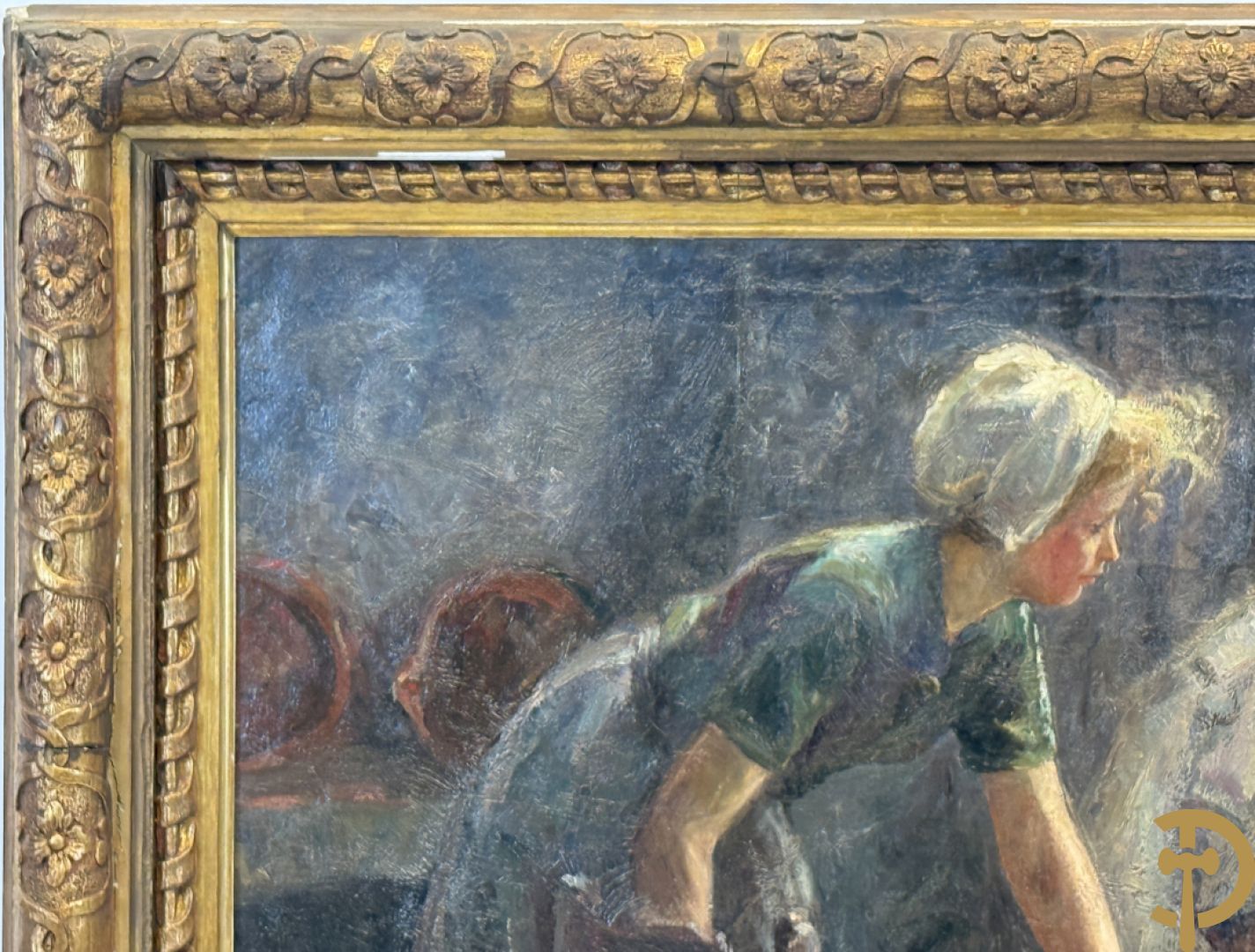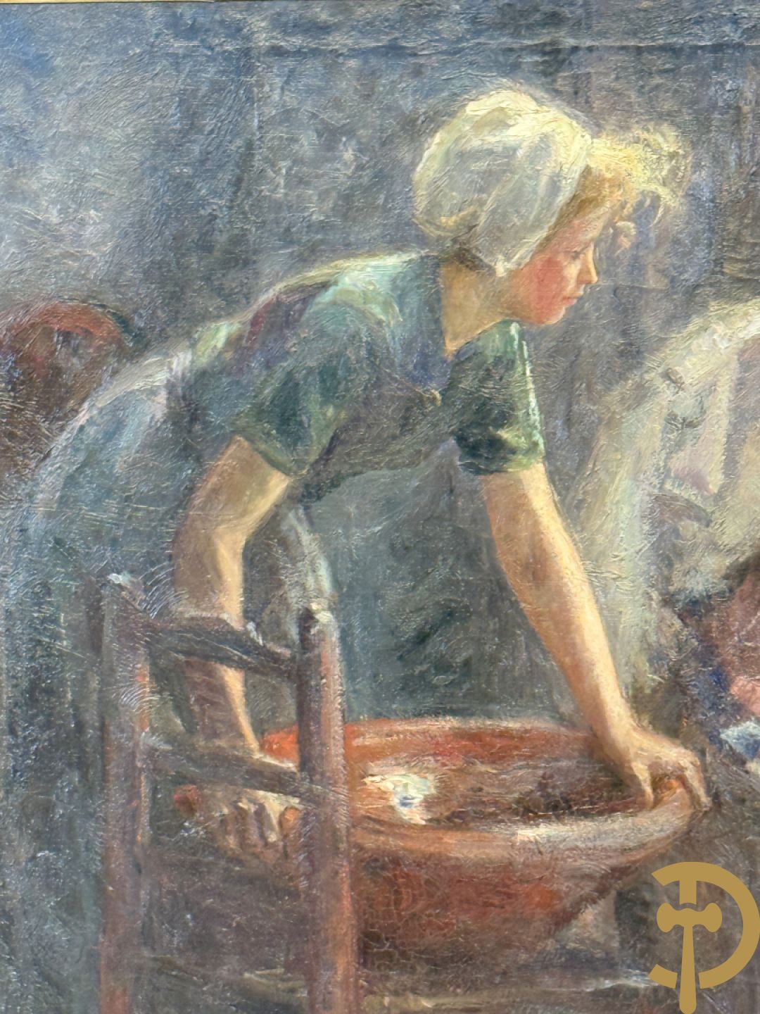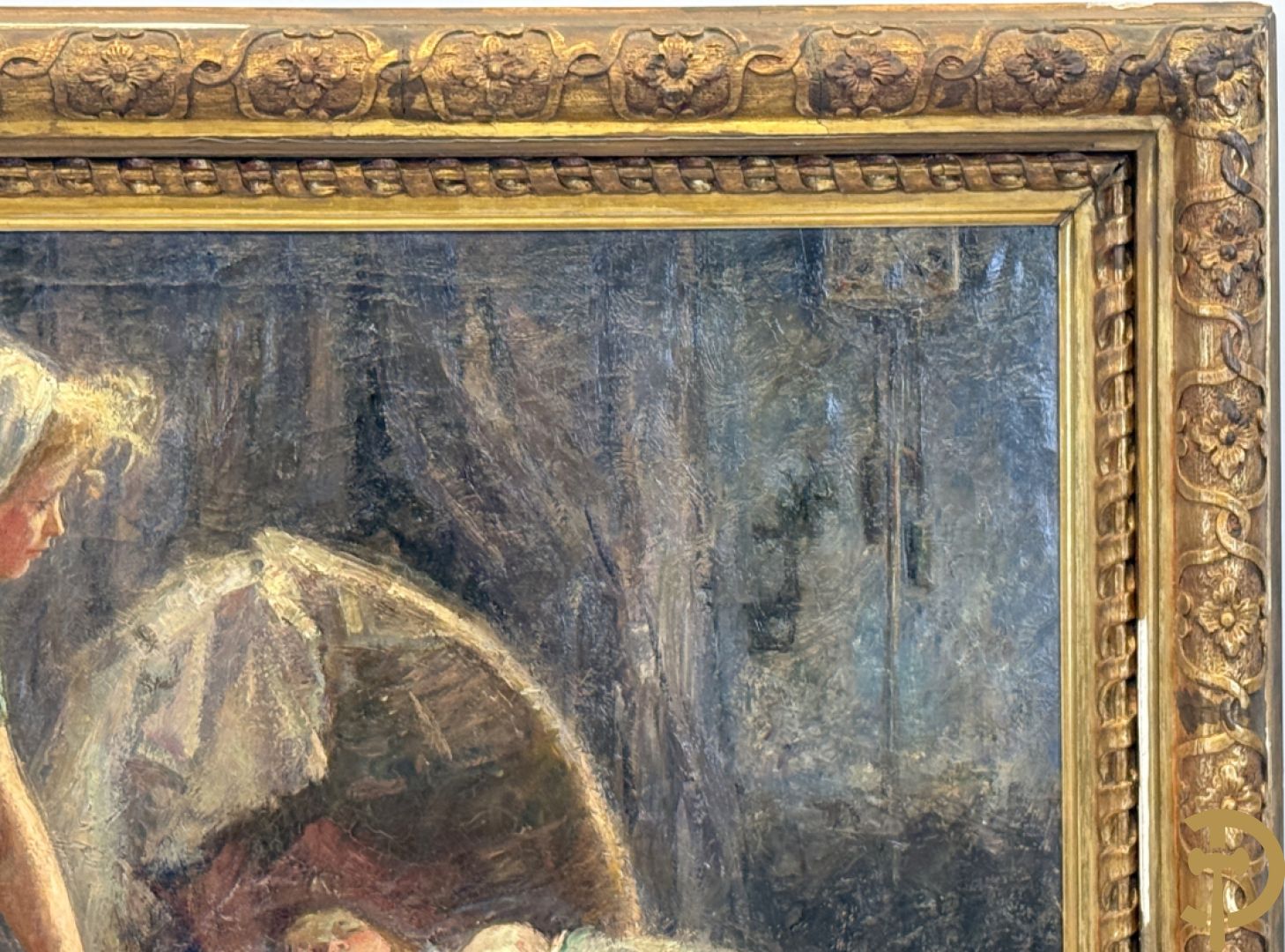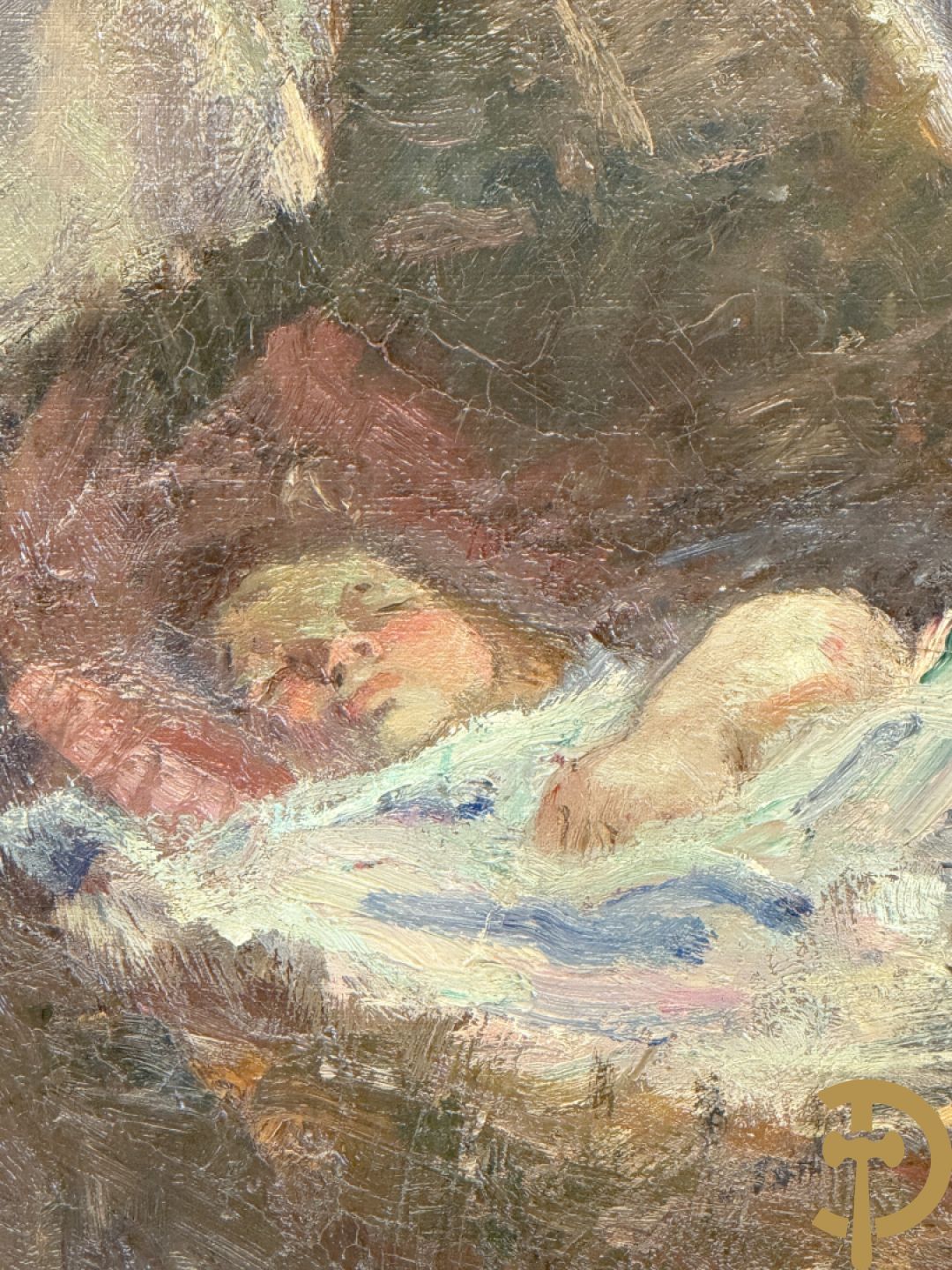 DE BARSY A. getekend (Anna) 1878-1949 'Geanimeerde interieurscène met jonge moeder en kind in de wieg' olie op doek