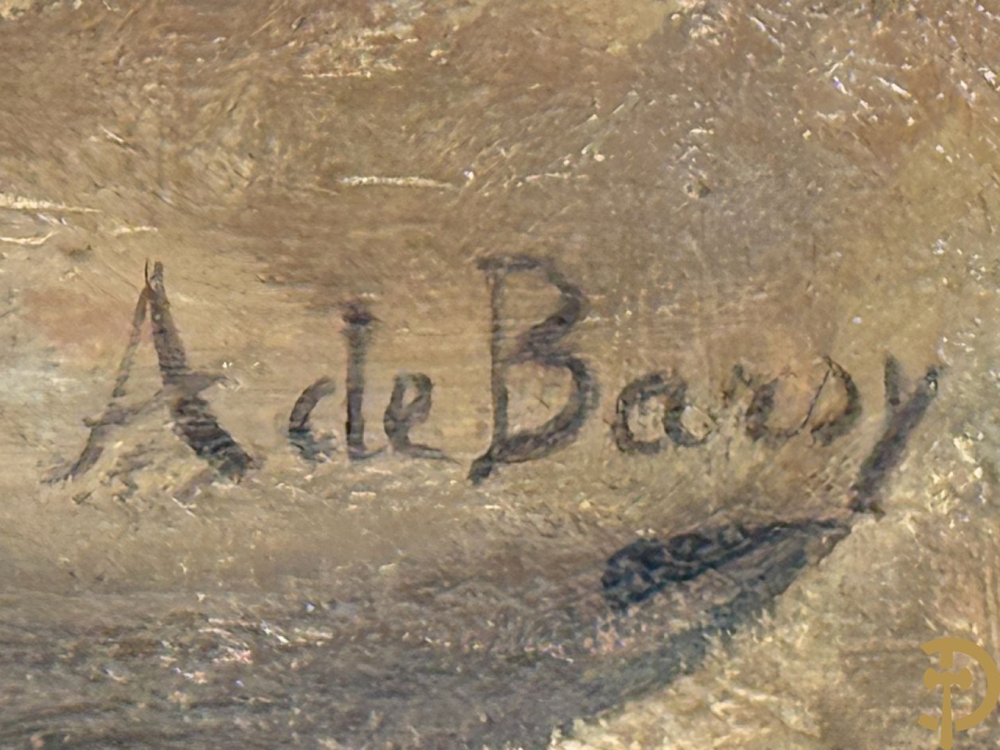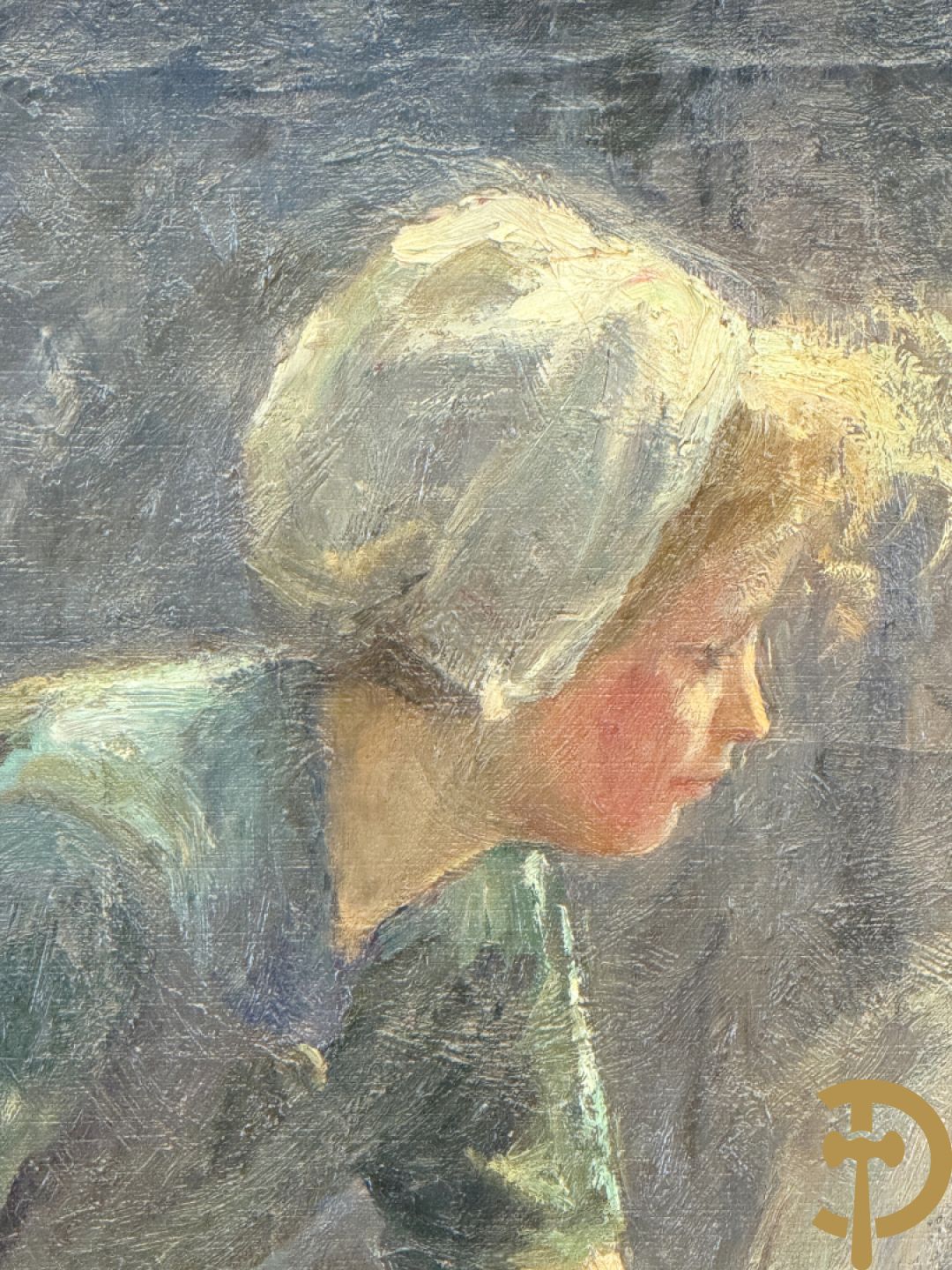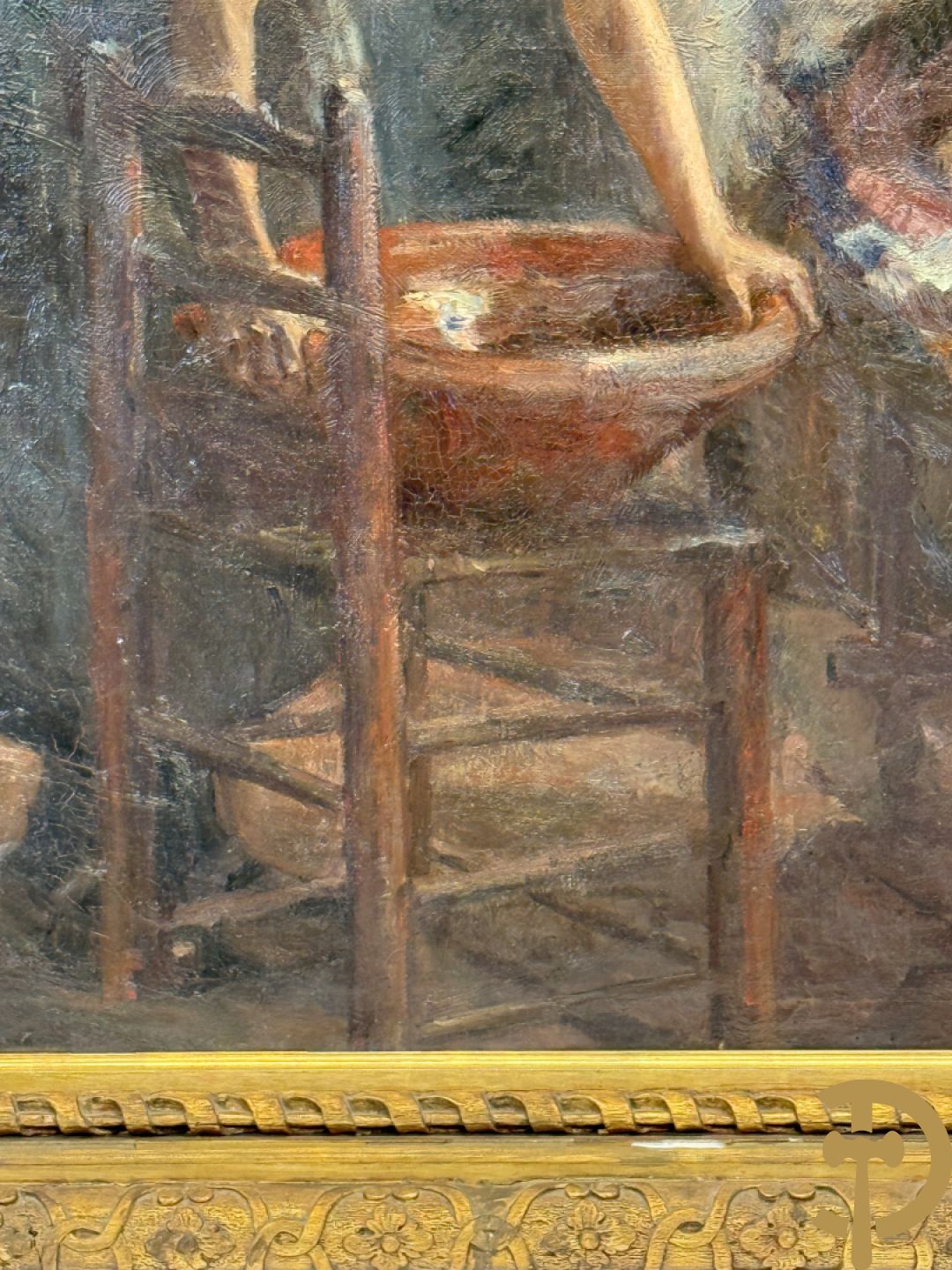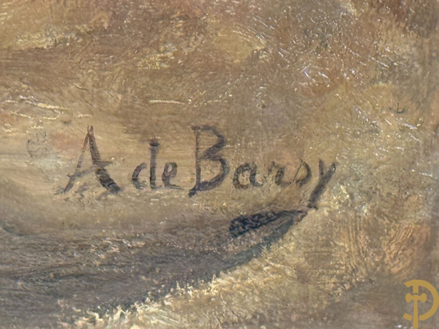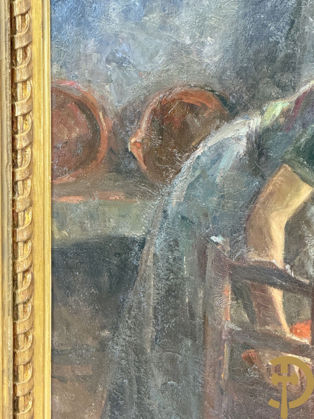 DE BARSY A. getekend (Anna) 1878-1949 'Geanimeerde interieurscène met jonge moeder en kind in de wieg' olie op doek