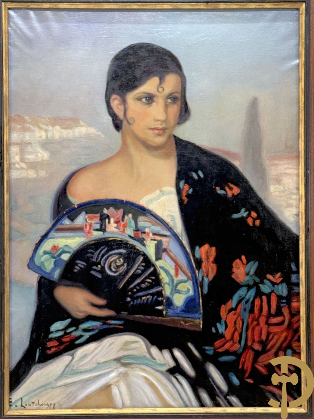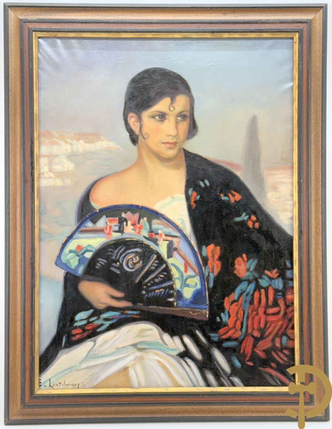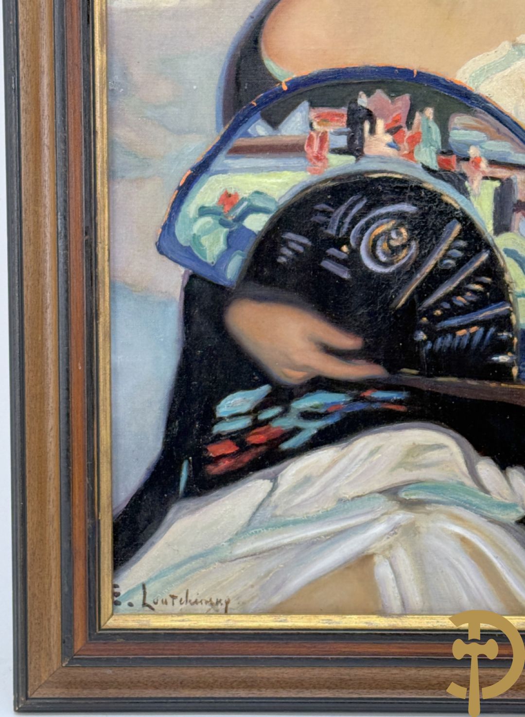 LOUTCHINSKY E. getekend 'Elegante dame met waaier' olie op doek