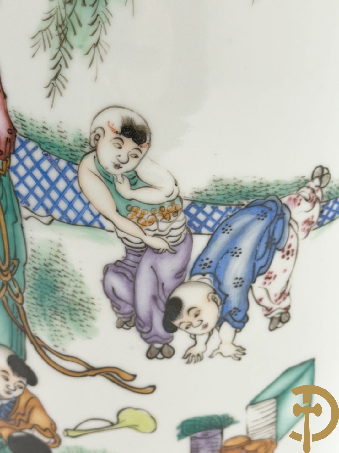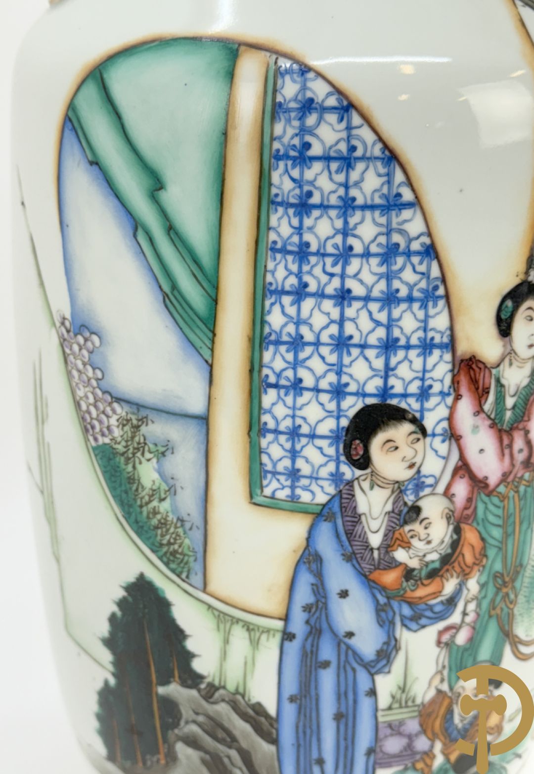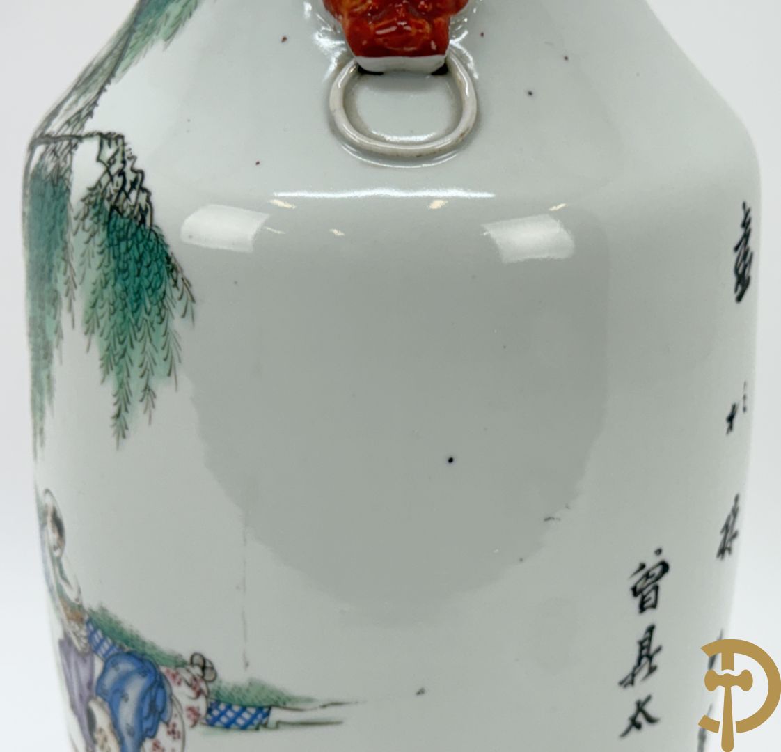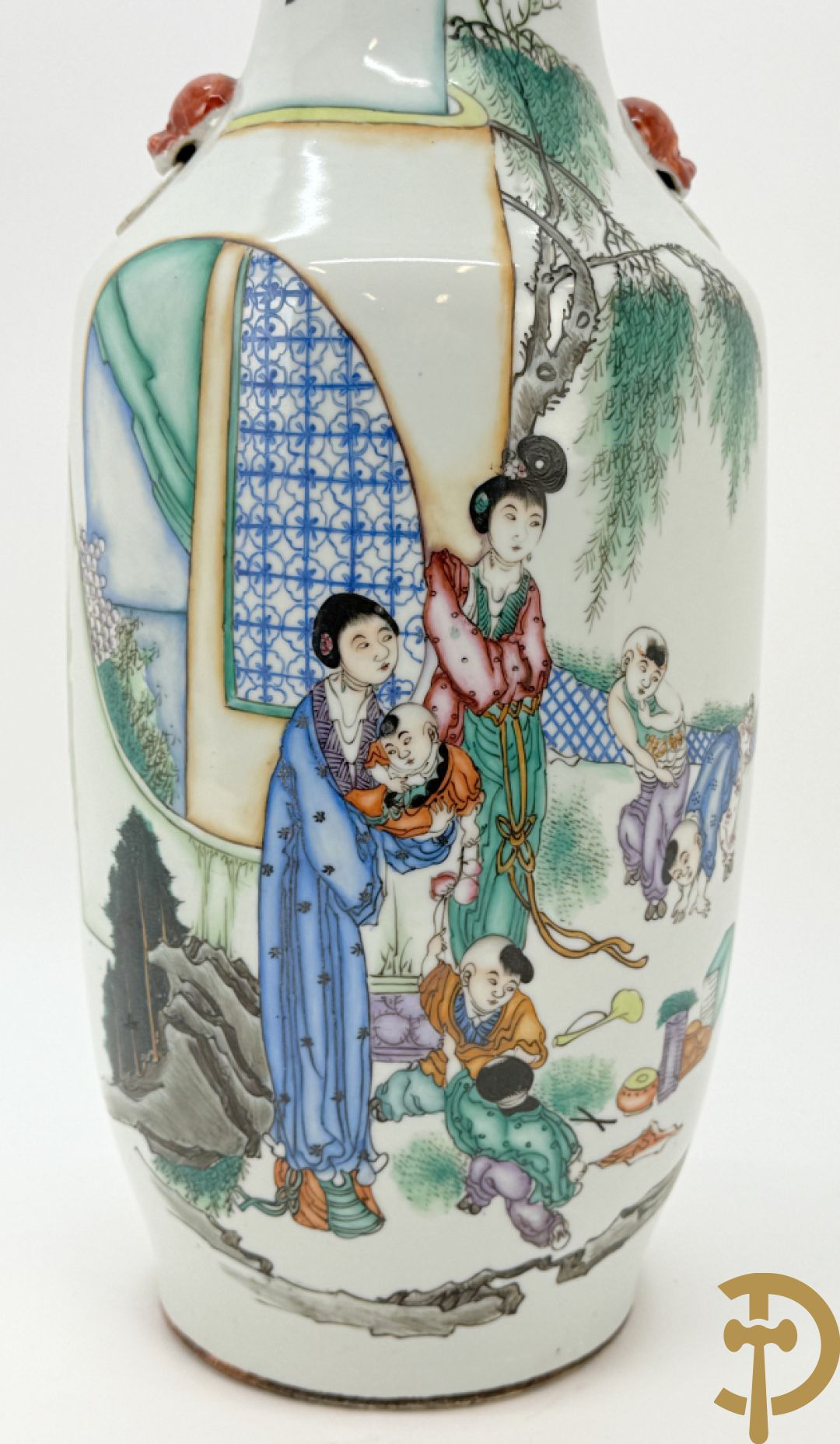 Chinese porseleinen vaas met decor van dames en kinderen - 2 fo honden met ringen opzij, bovenaan getekend