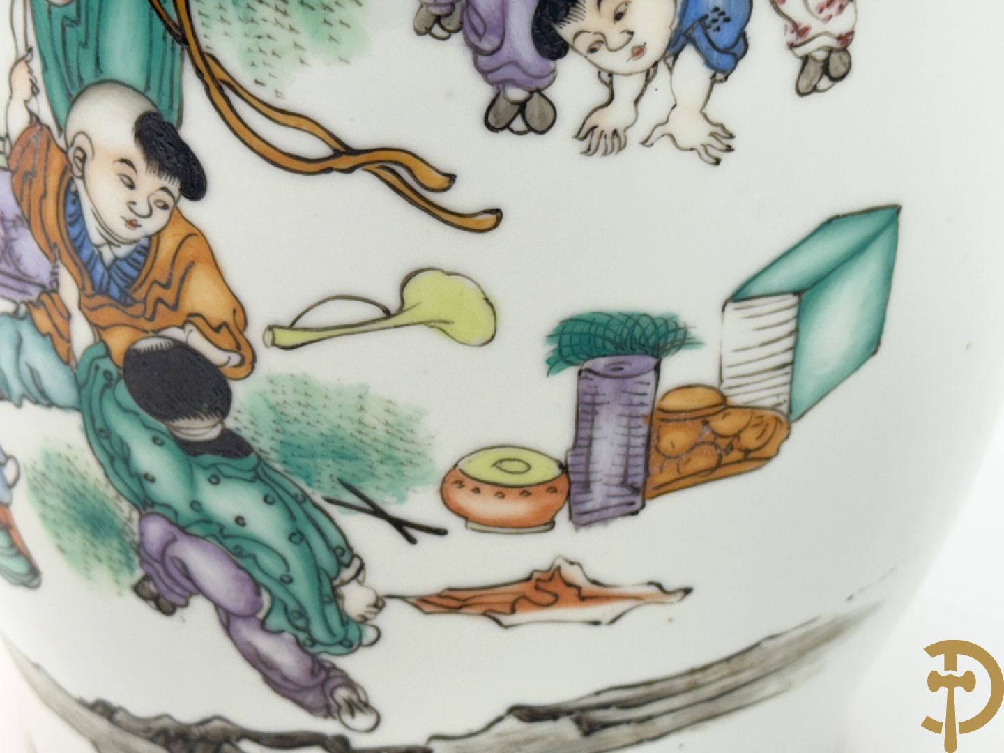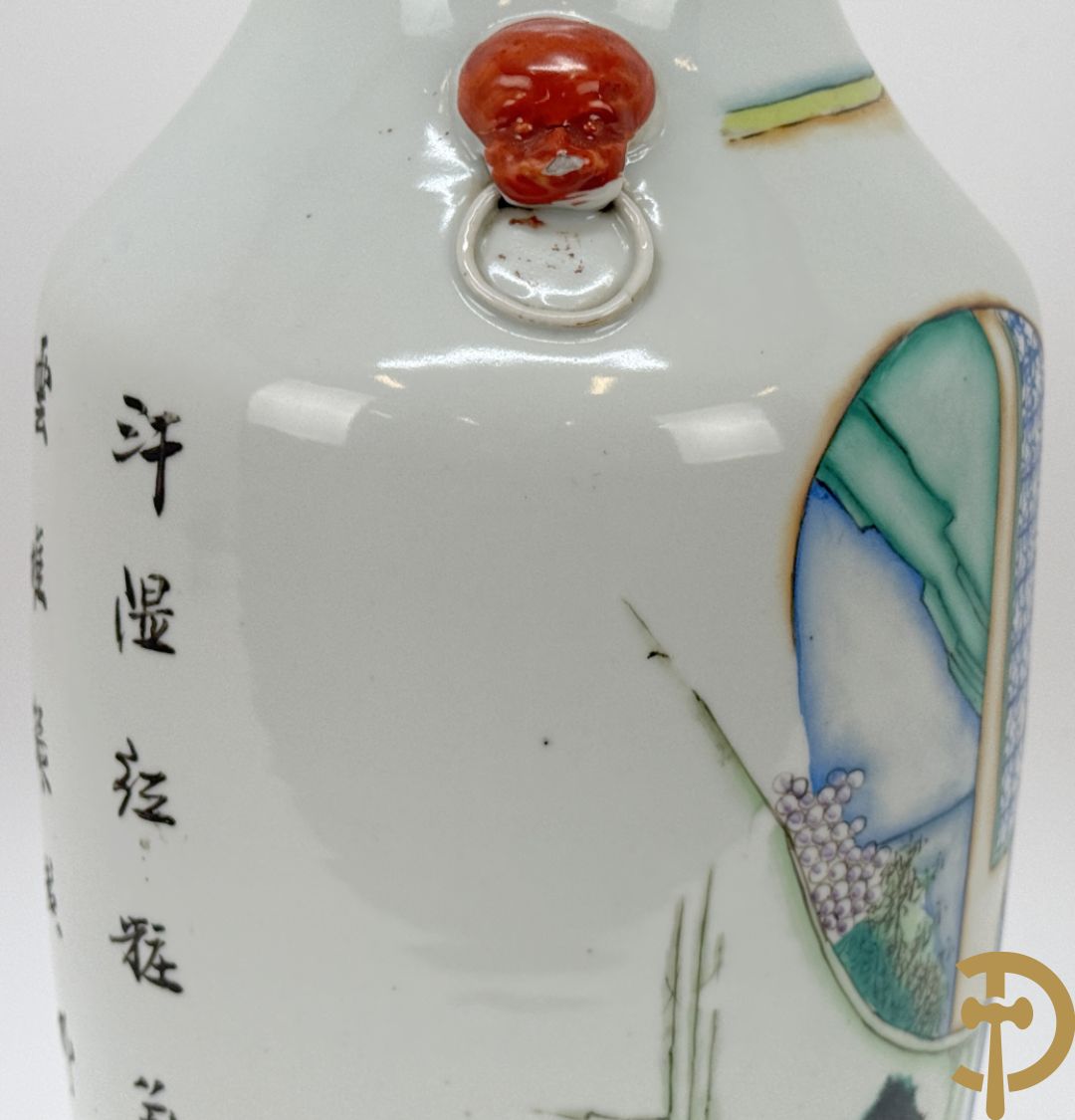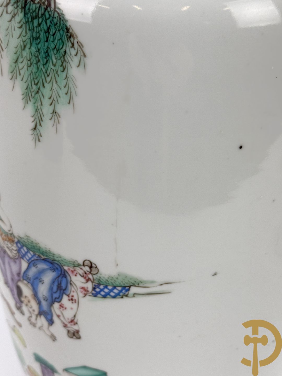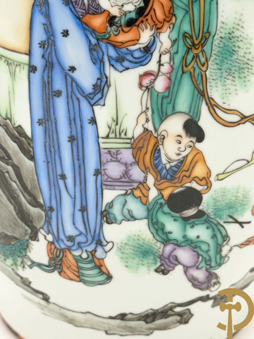 Chinese porseleinen vaas met decor van dames en kinderen - 2 fo honden met ringen opzij, bovenaan getekend