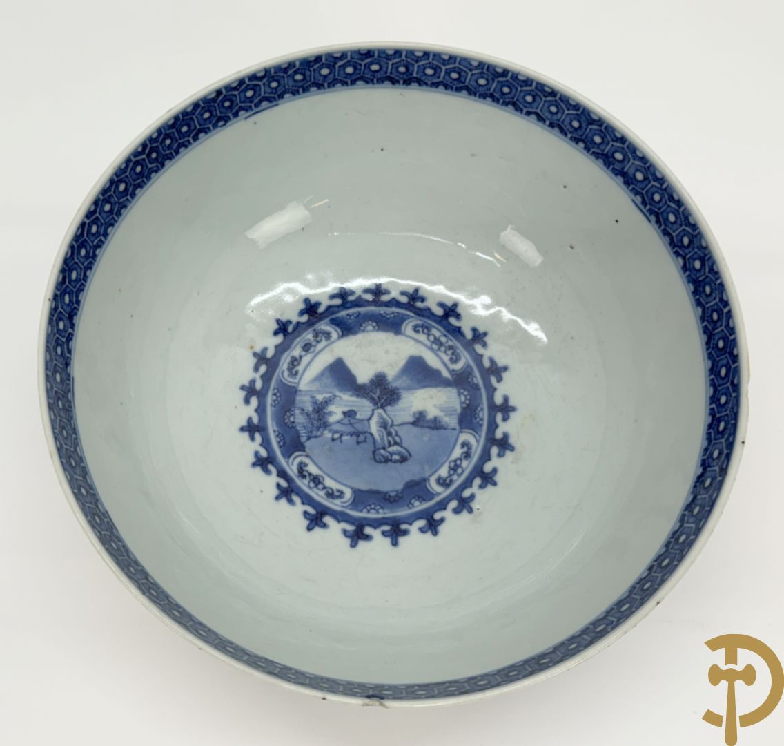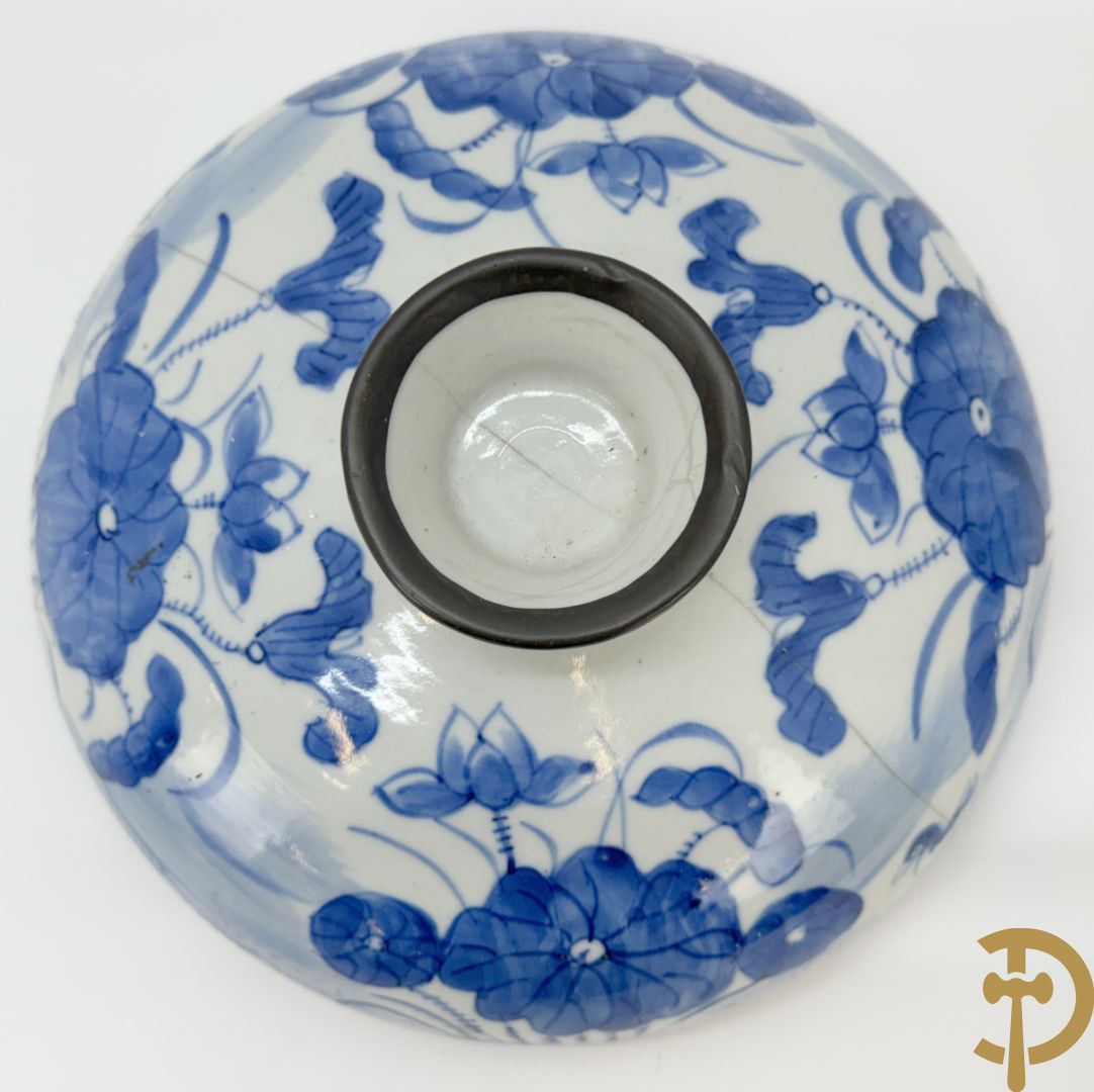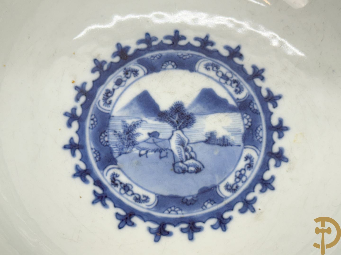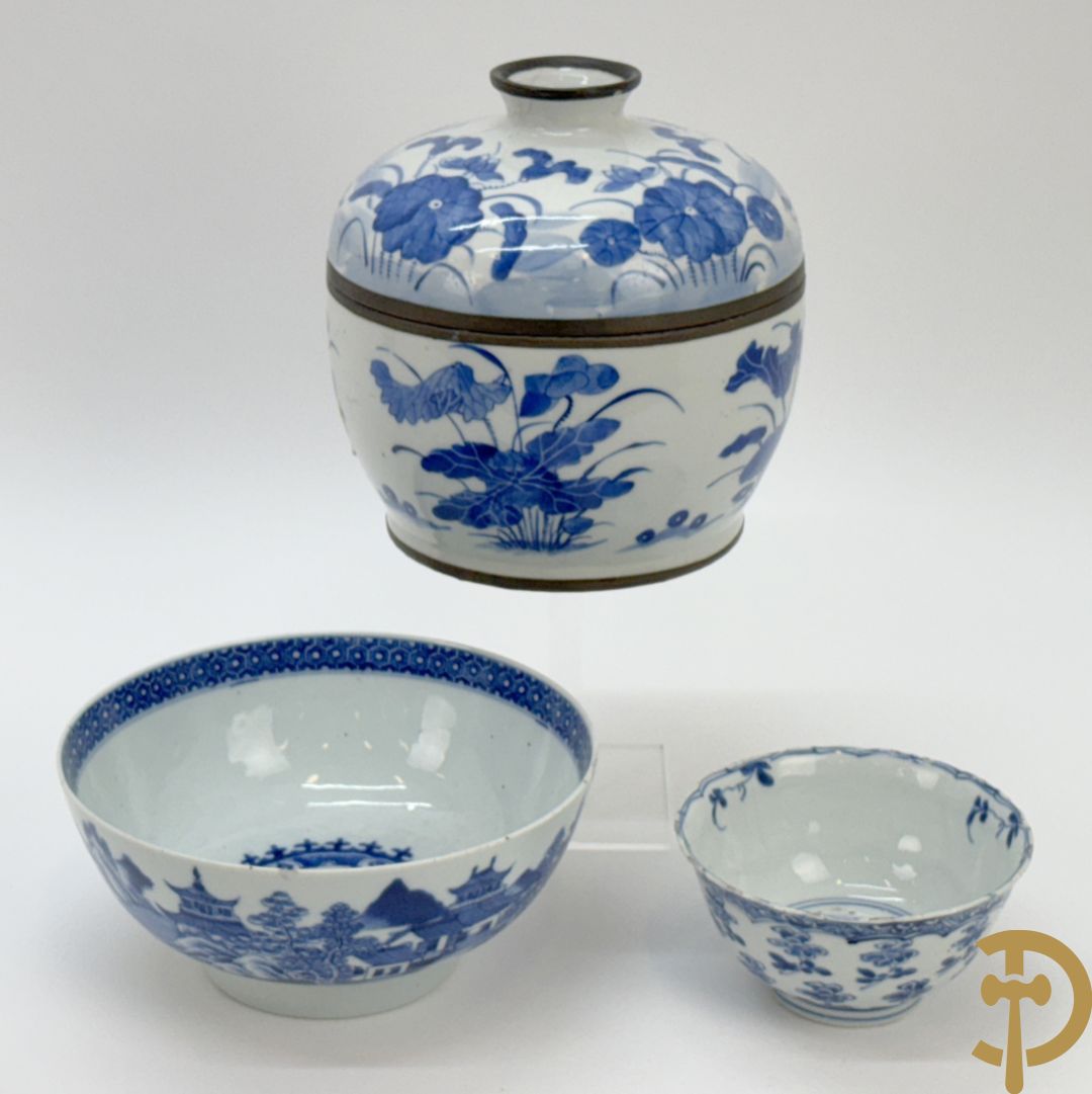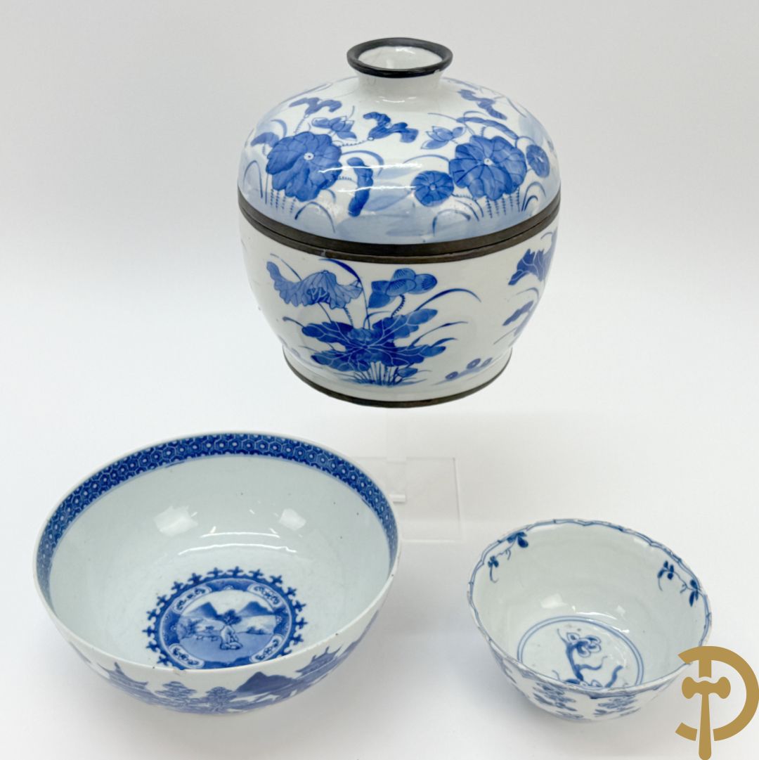 Chinese porseleinen blauw/wit coupe met landschapsdecor + kleine blauw/wit coupe met bloemendecor + porseleinen dekselkom met floraal decor