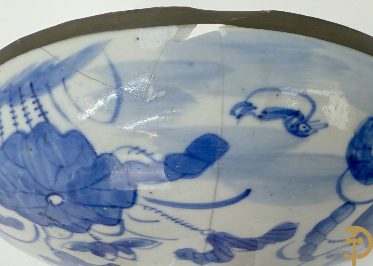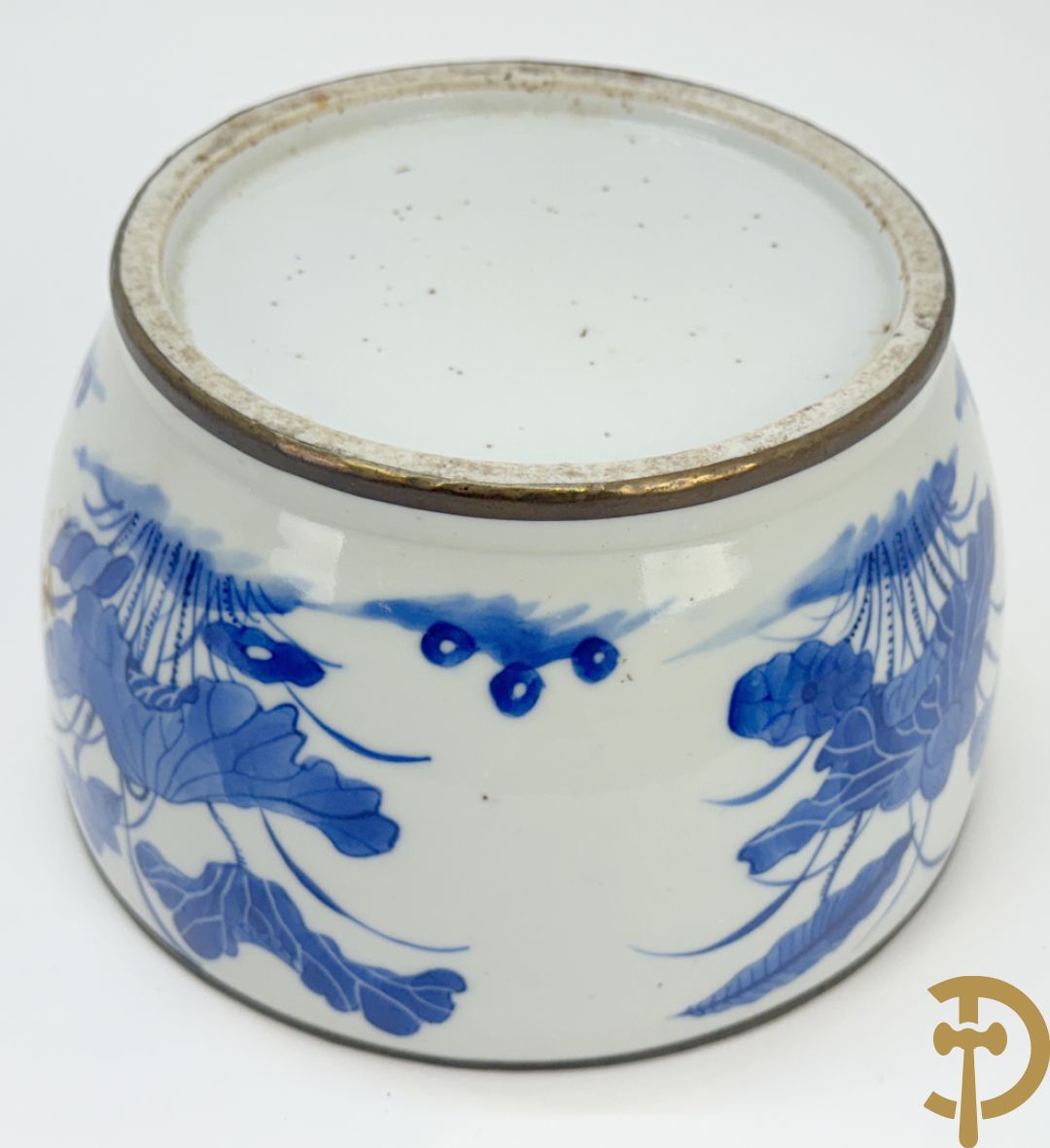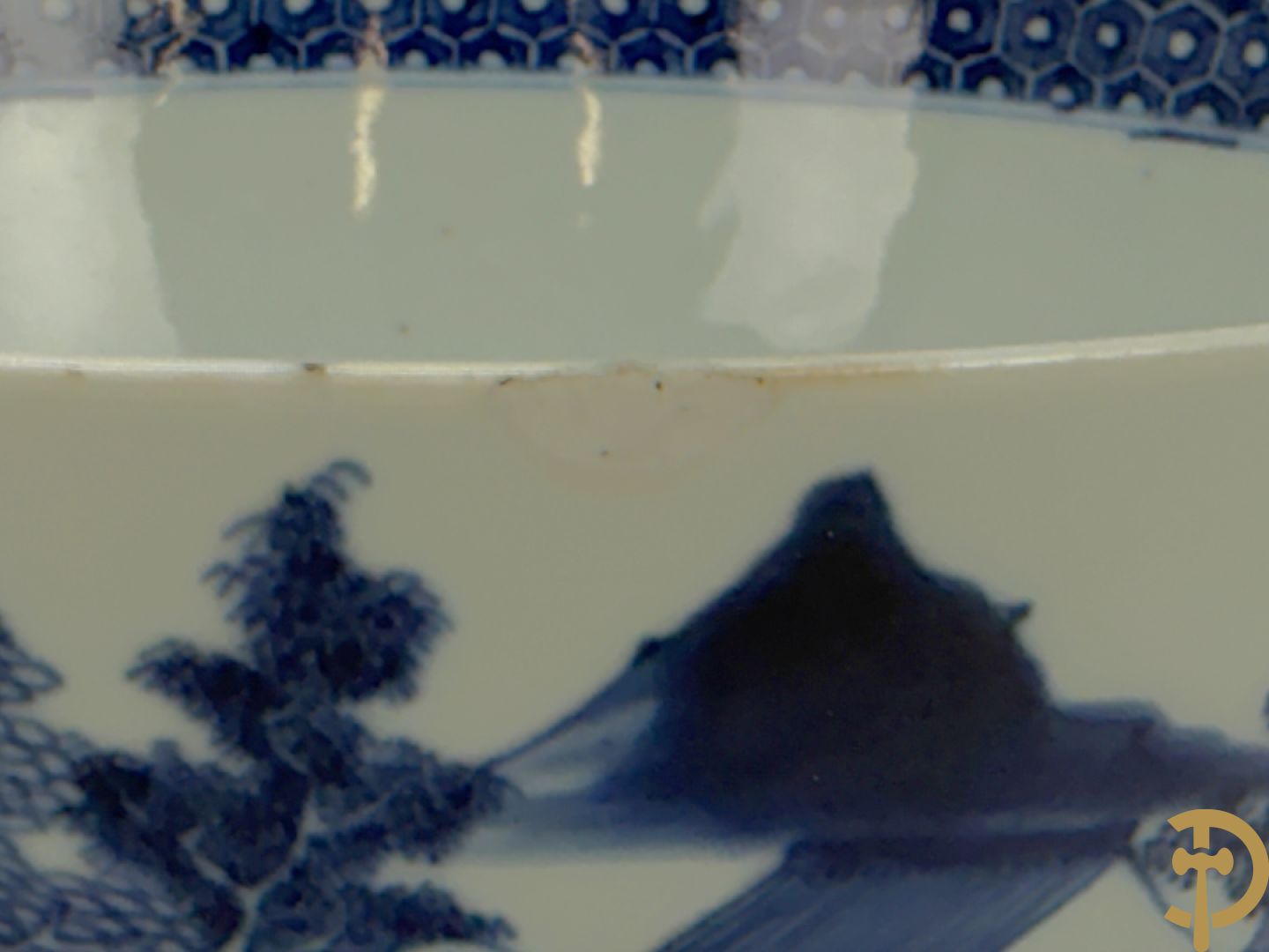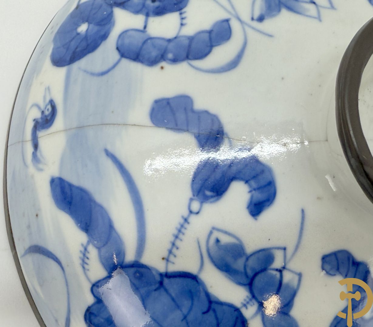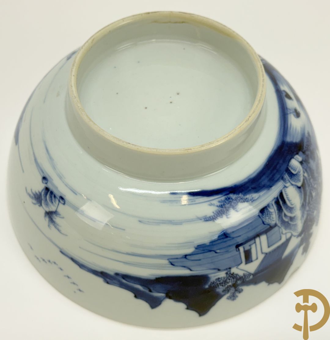 Chinese porseleinen blauw/wit coupe met landschapsdecor + kleine blauw/wit coupe met bloemendecor + porseleinen dekselkom met floraal decor