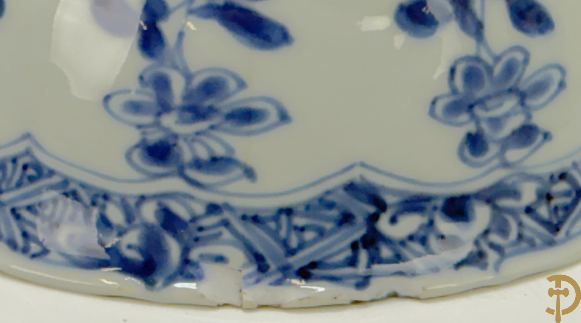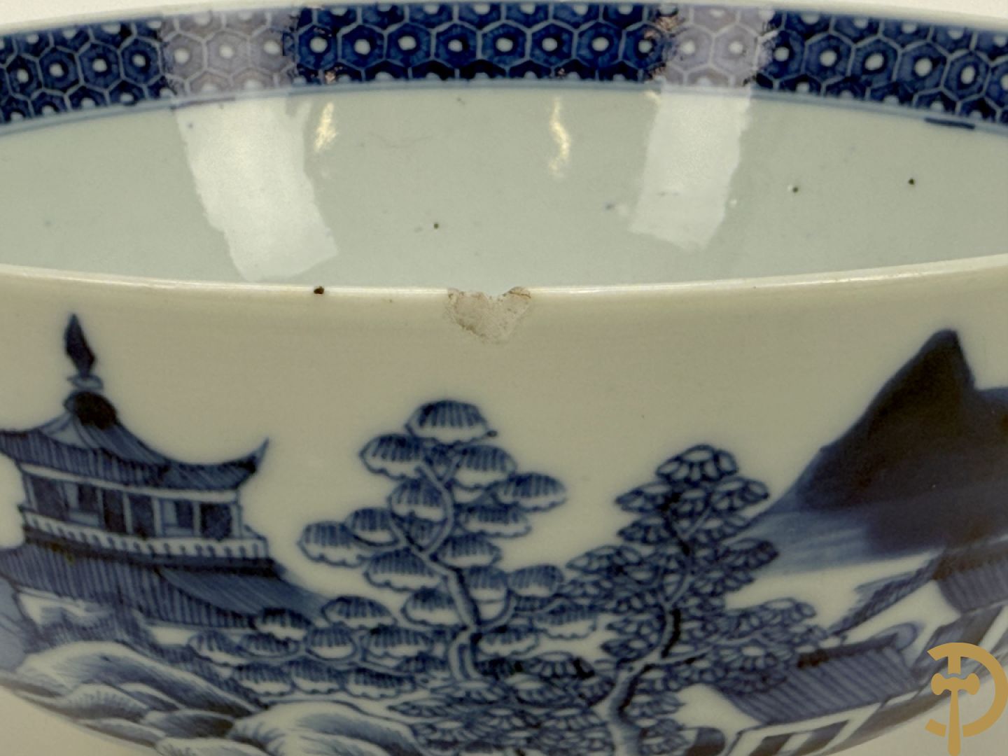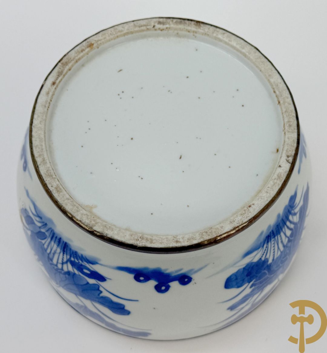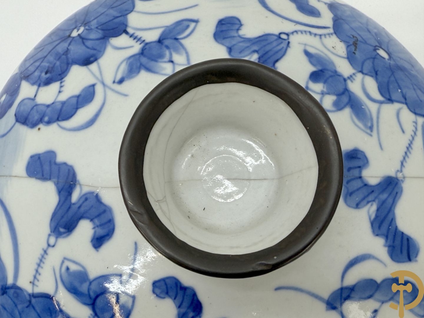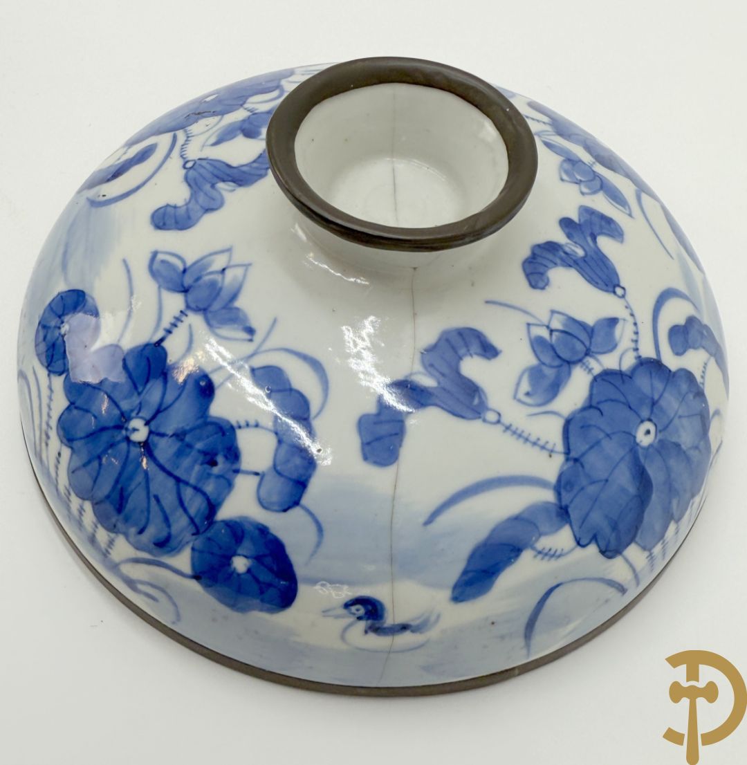 Chinese porseleinen blauw/wit coupe met landschapsdecor + kleine blauw/wit coupe met bloemendecor + porseleinen dekselkom met floraal decor
