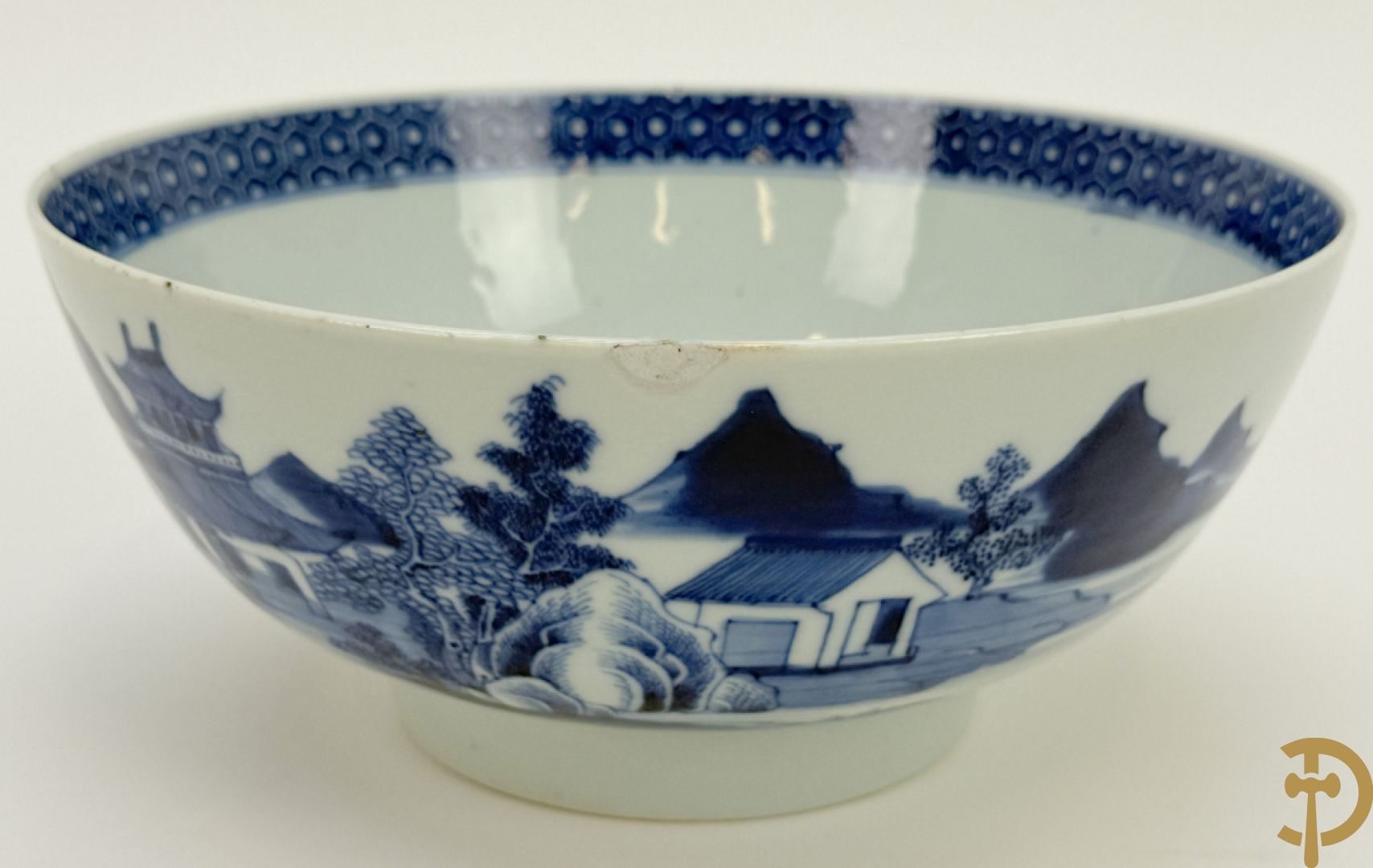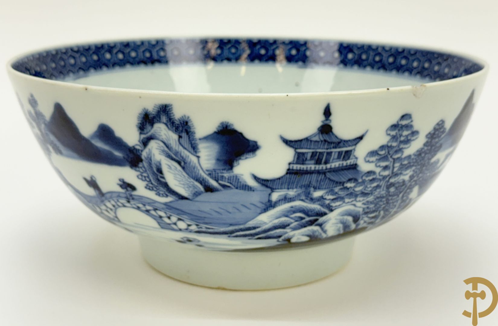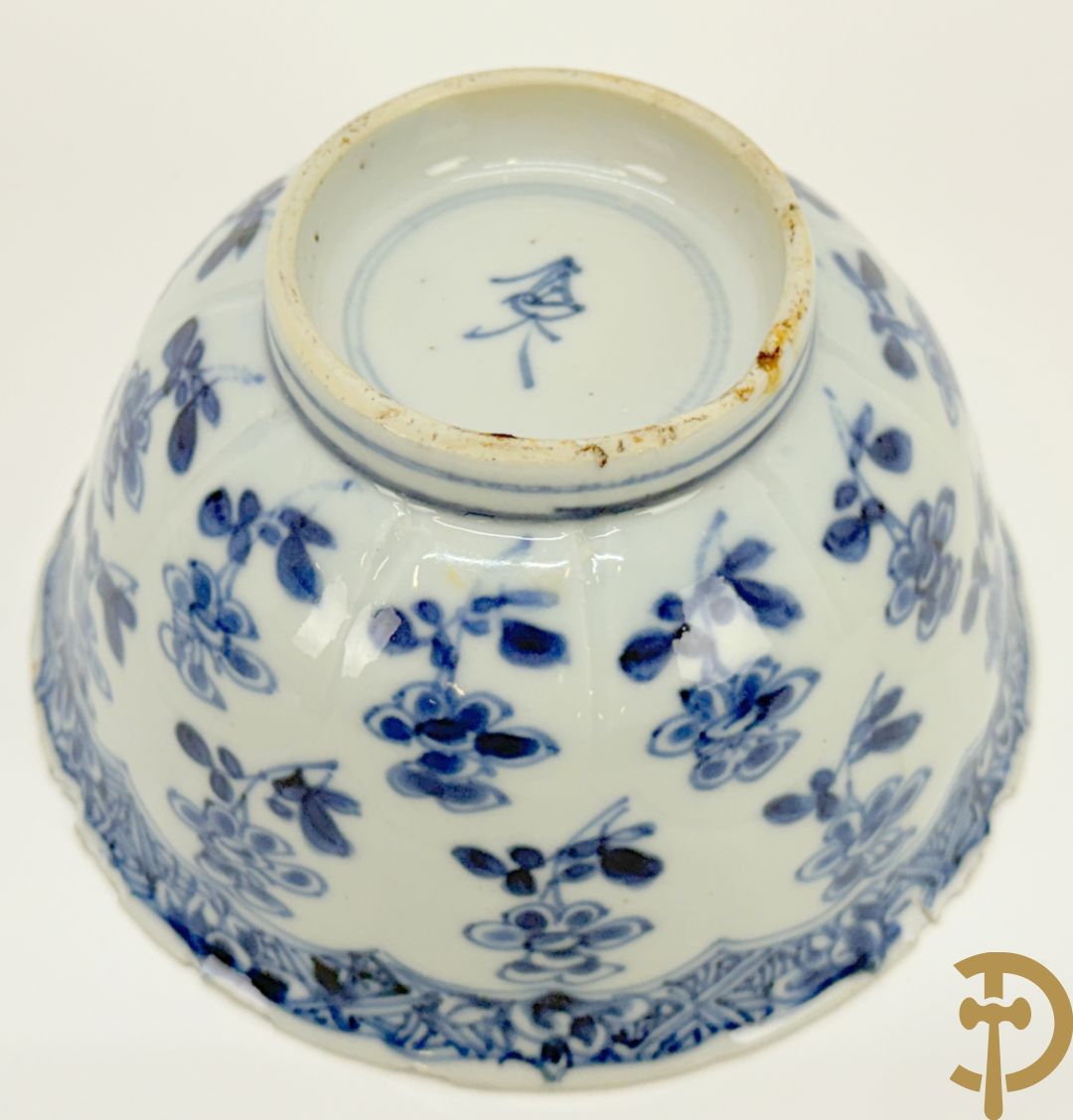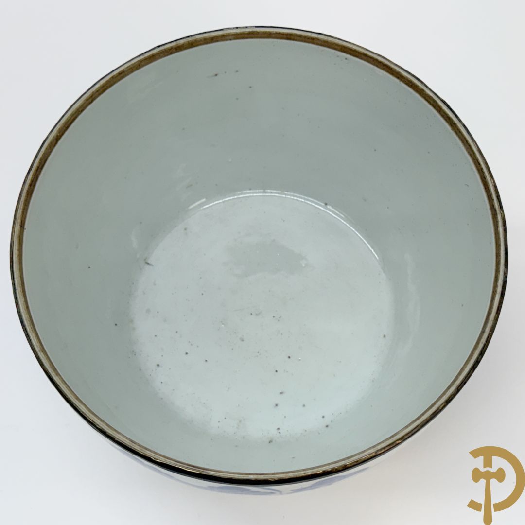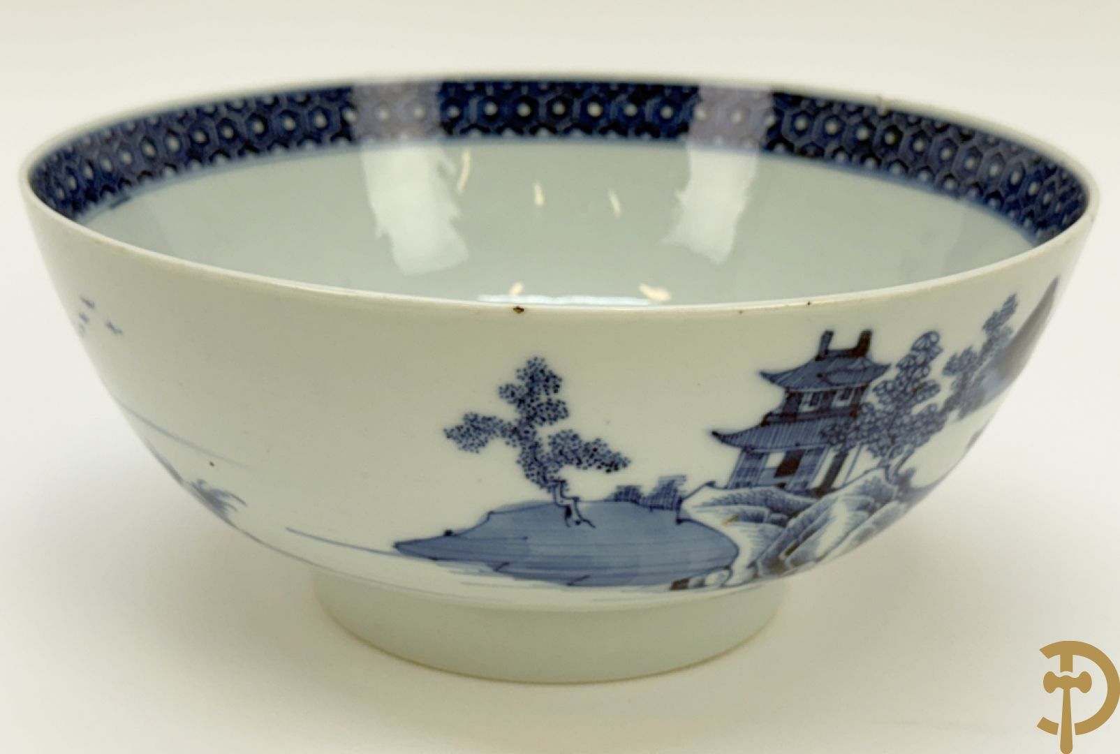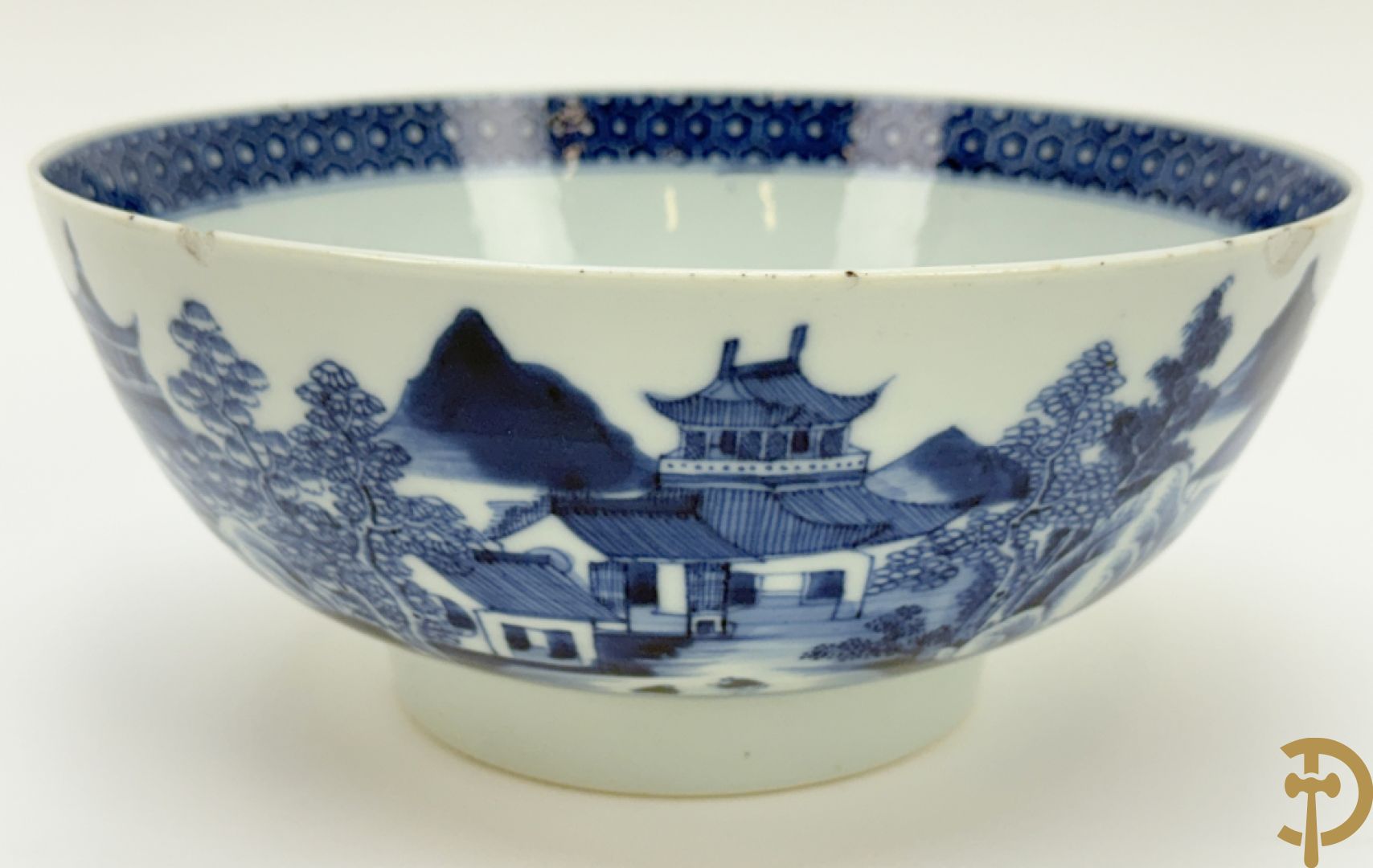 Chinese porseleinen blauw/wit coupe met landschapsdecor + kleine blauw/wit coupe met bloemendecor + porseleinen dekselkom met floraal decor