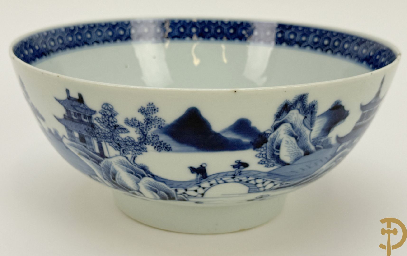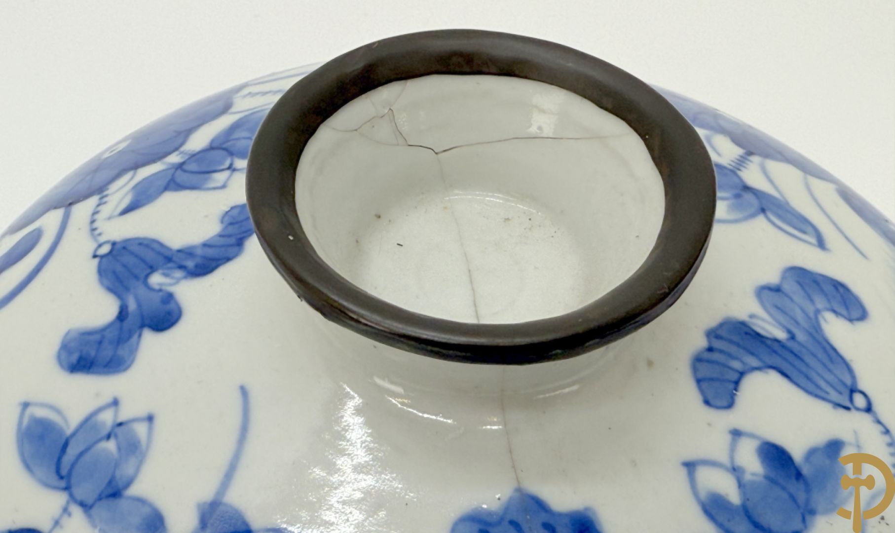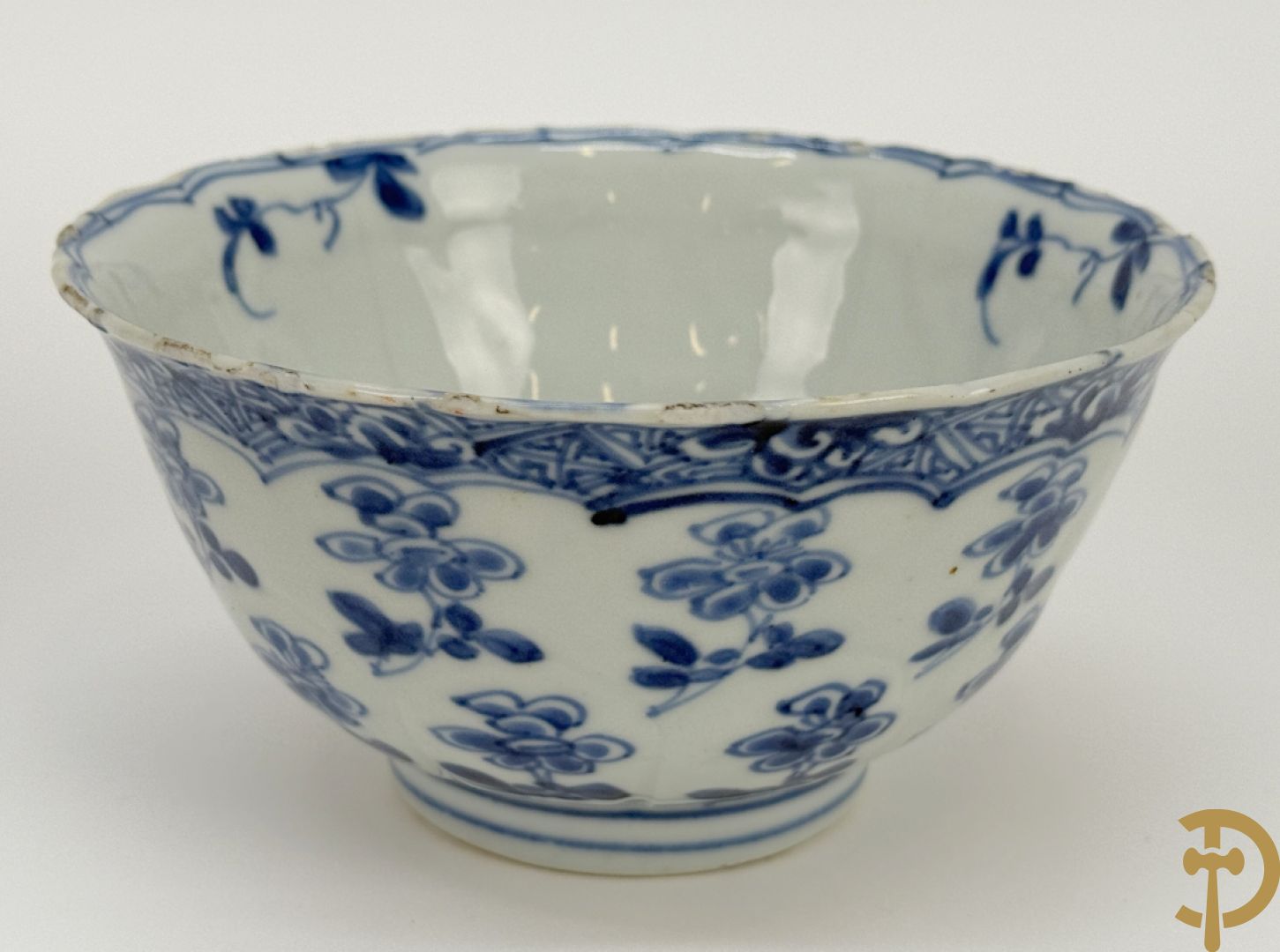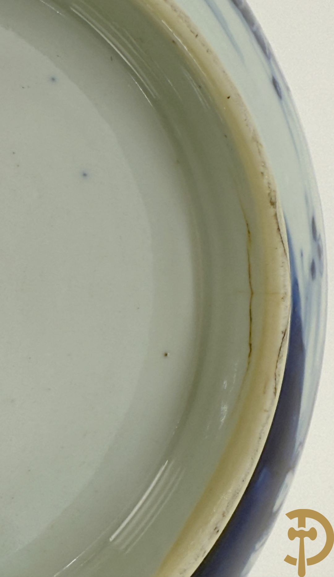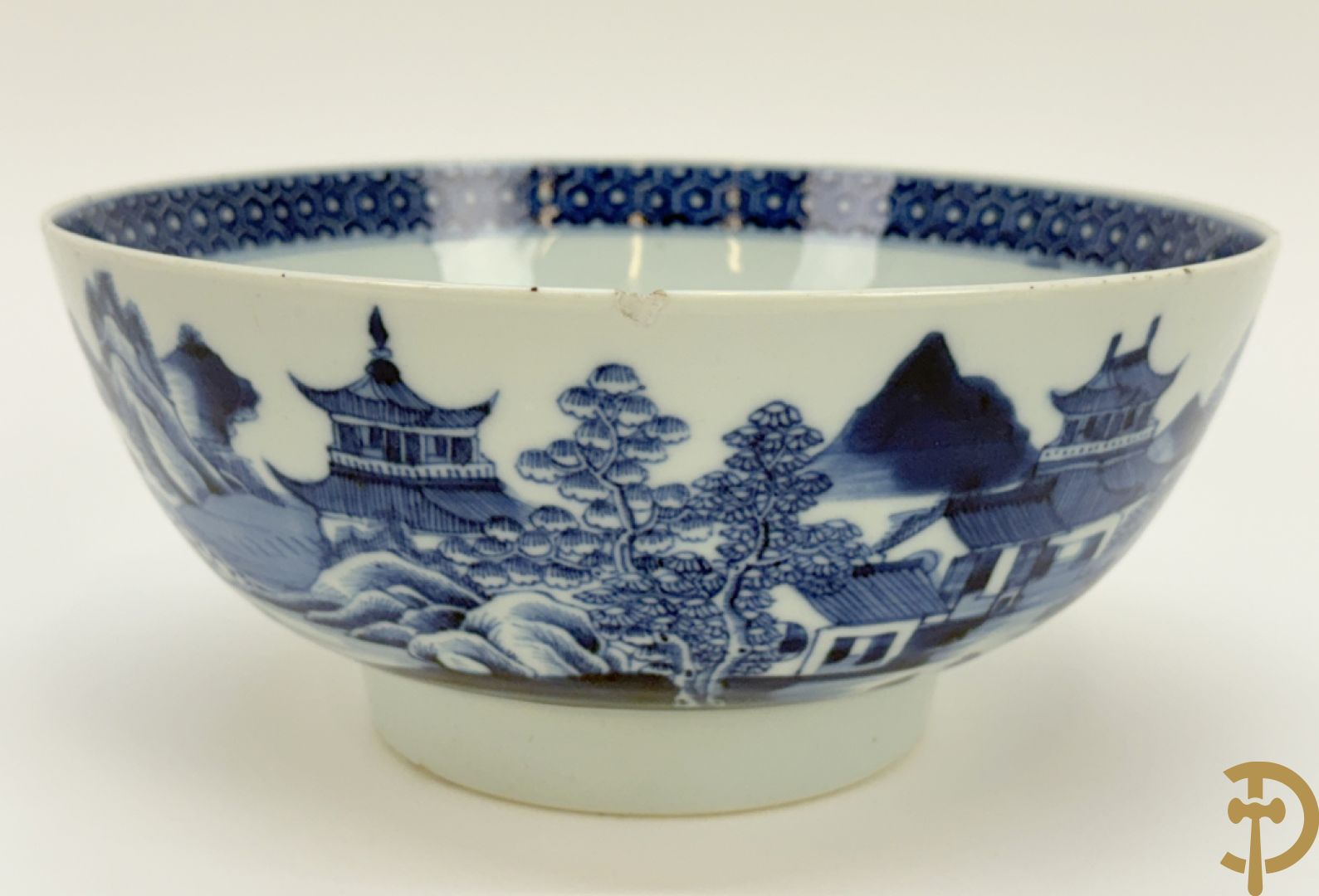 Chinese porseleinen blauw/wit coupe met landschapsdecor + kleine blauw/wit coupe met bloemendecor + porseleinen dekselkom met floraal decor