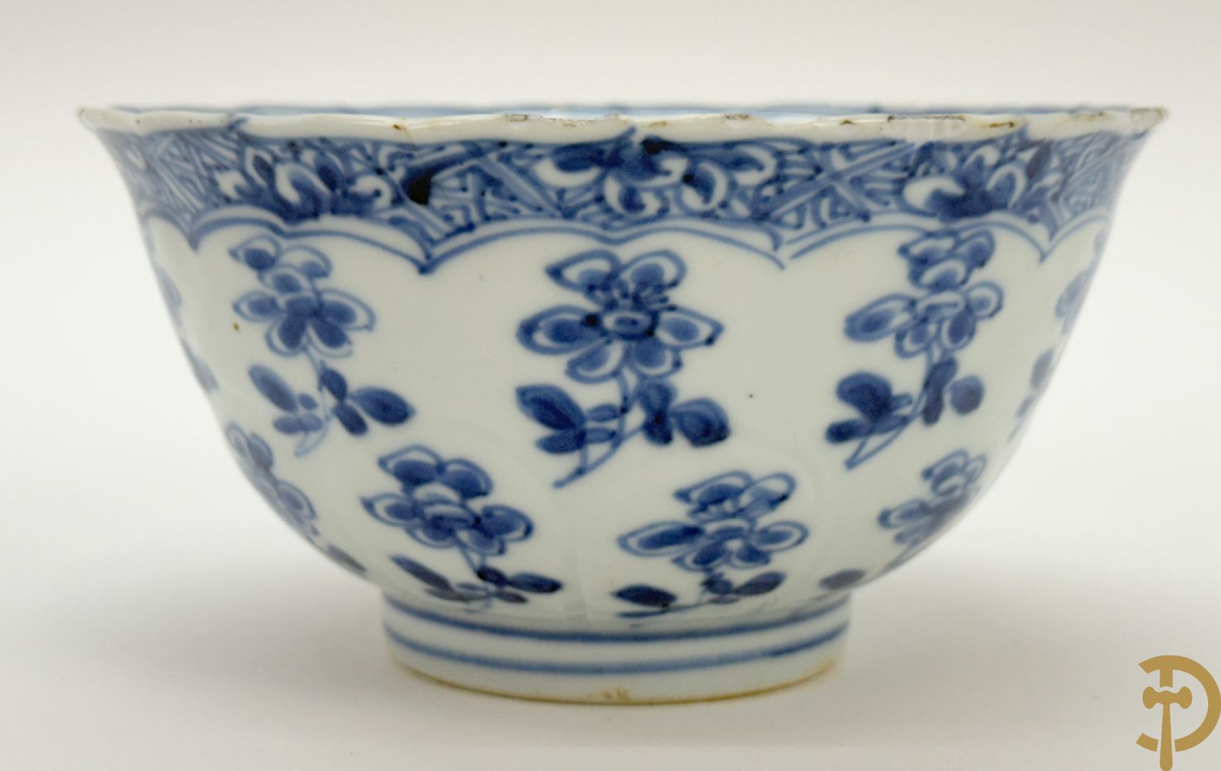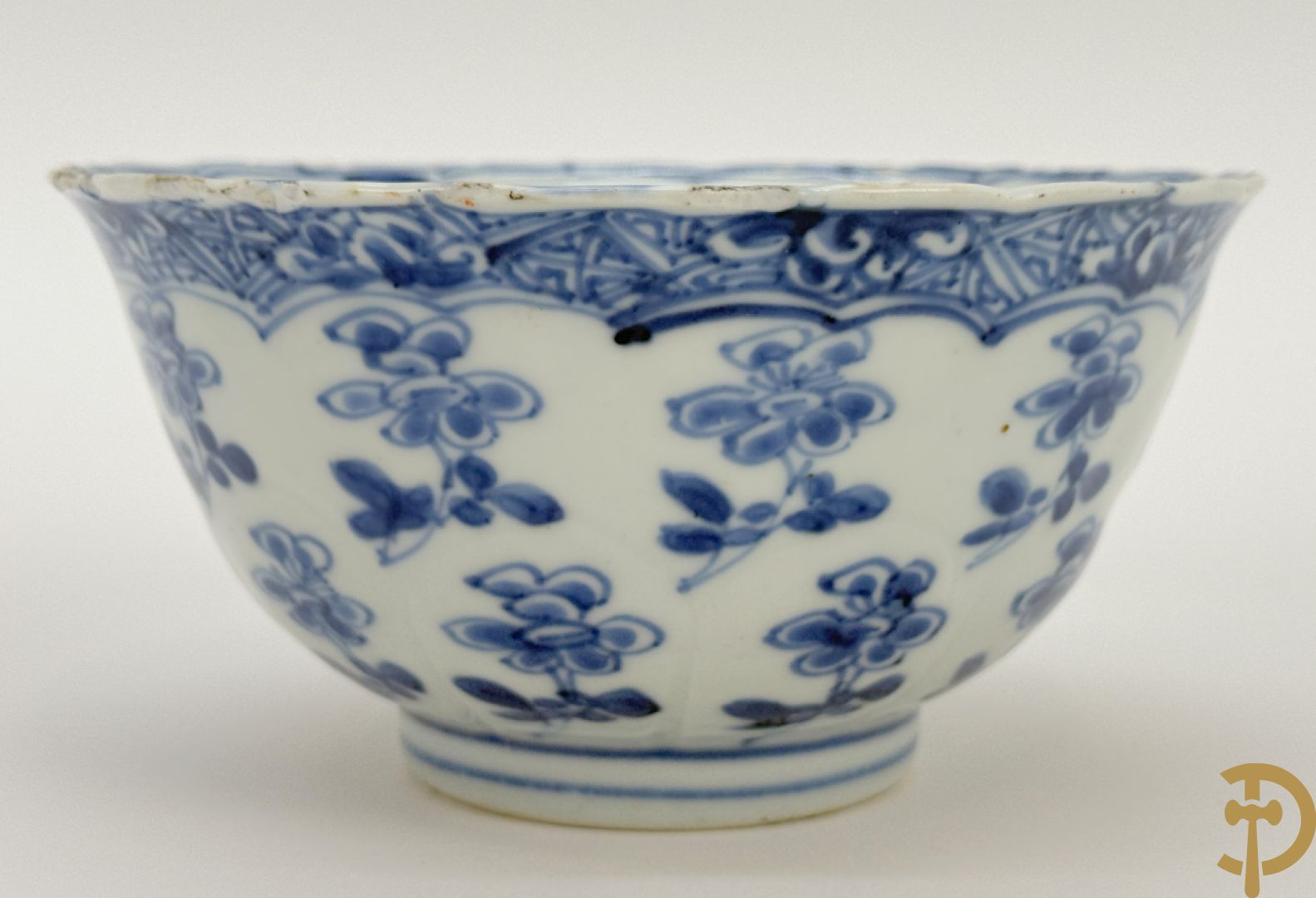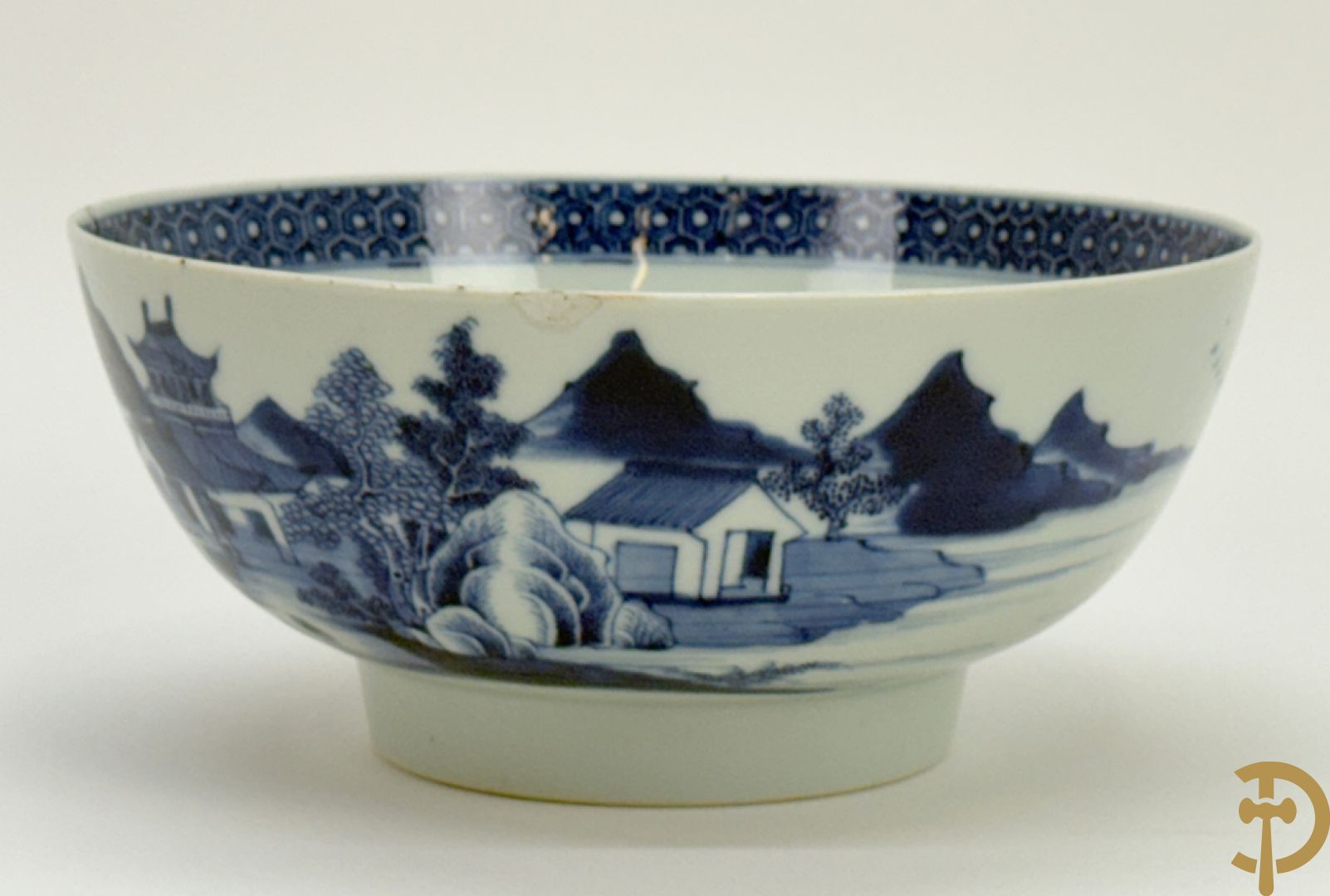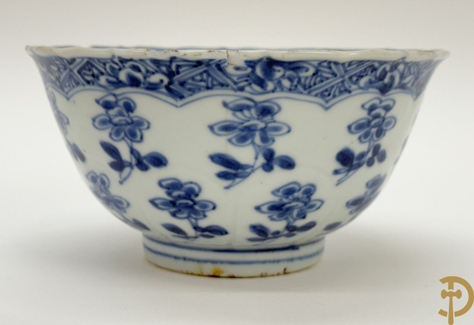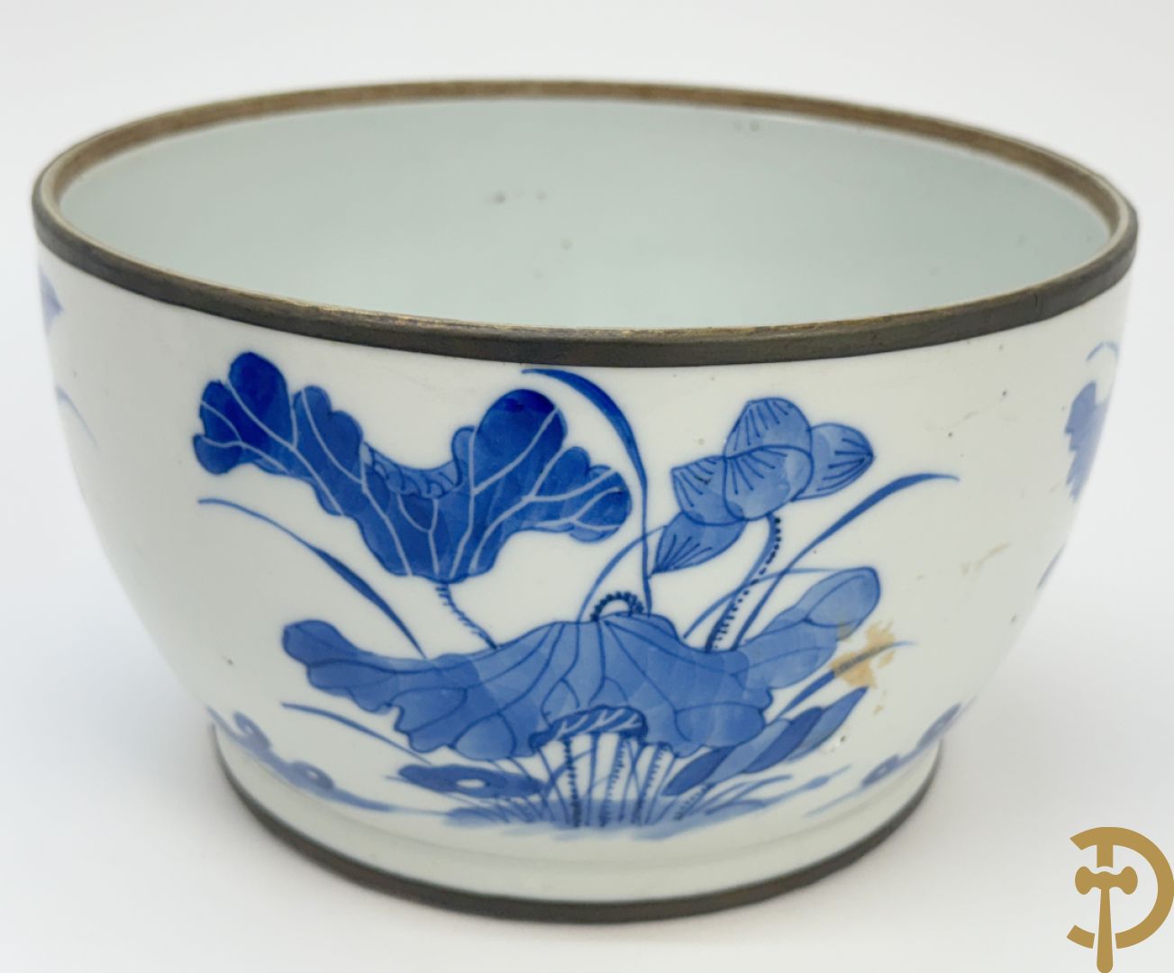 Chinese porseleinen blauw/wit coupe met landschapsdecor + kleine blauw/wit coupe met bloemendecor + porseleinen dekselkom met floraal decor