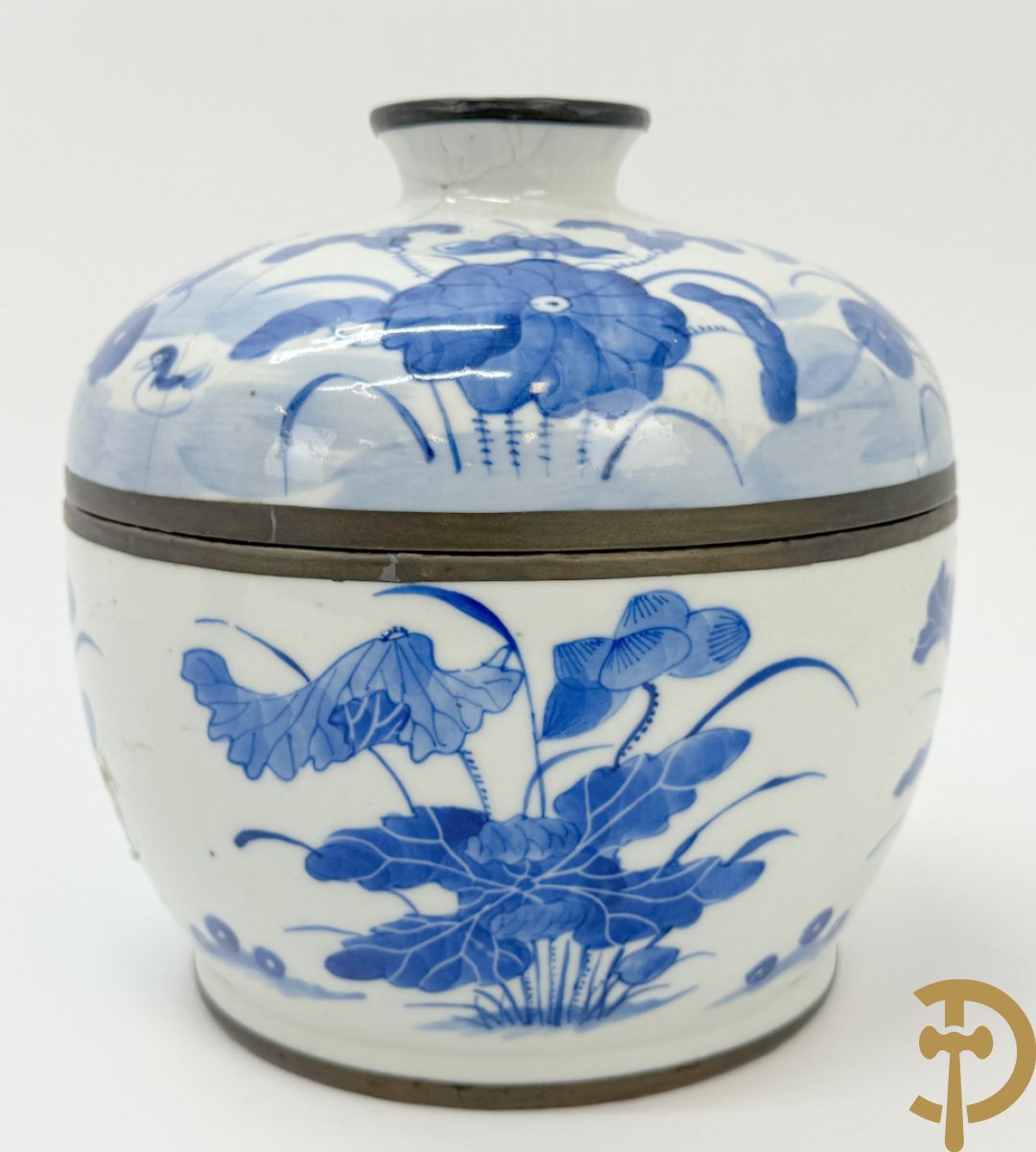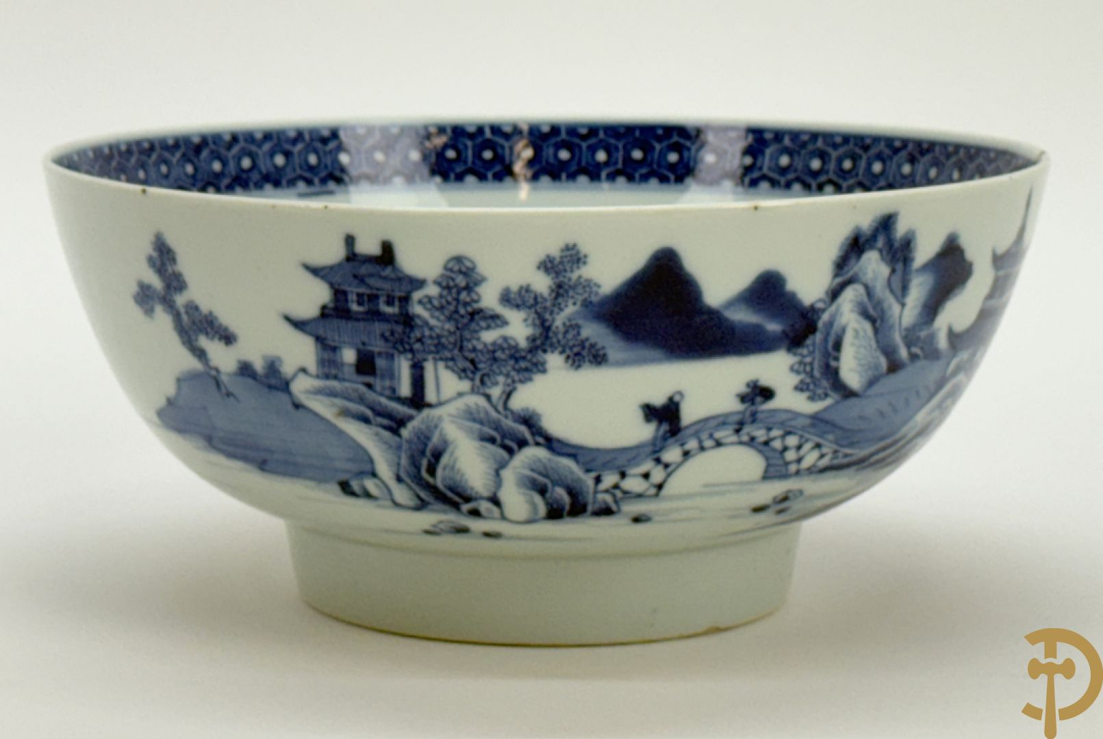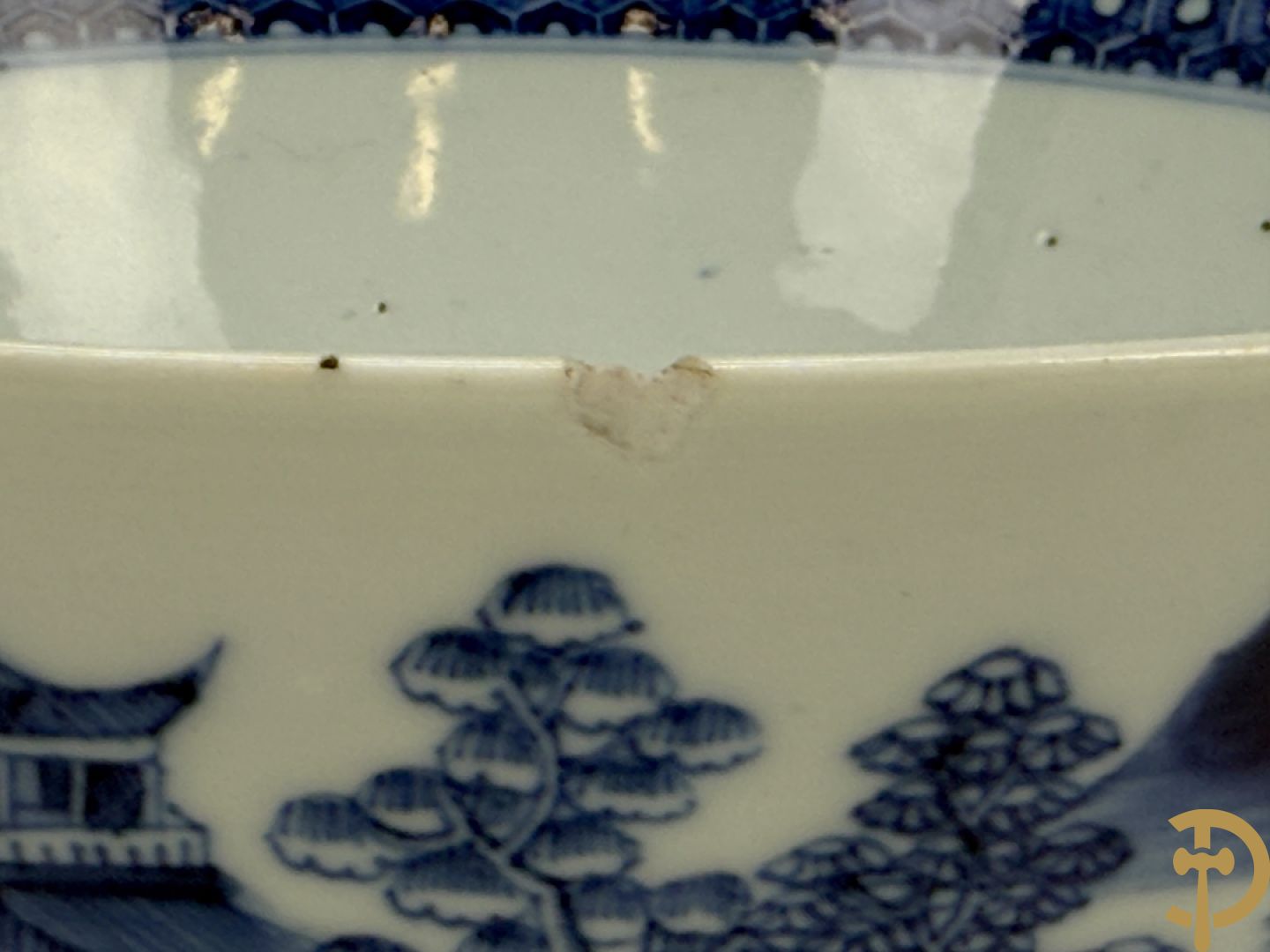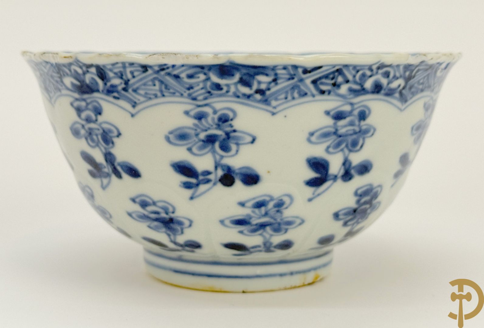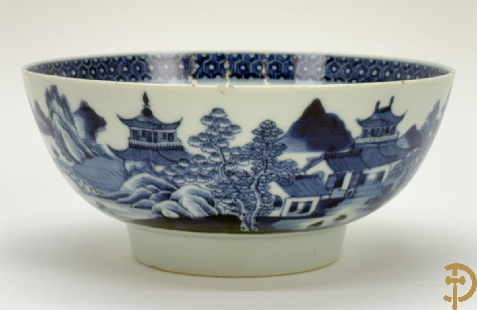 Chinese porseleinen blauw/wit coupe met landschapsdecor + kleine blauw/wit coupe met bloemendecor + porseleinen dekselkom met floraal decor