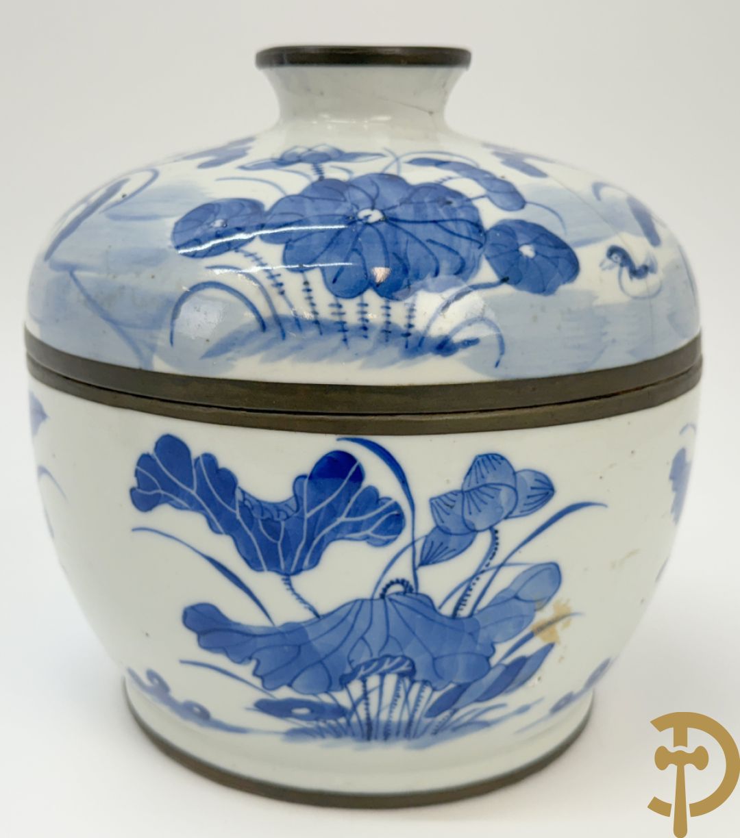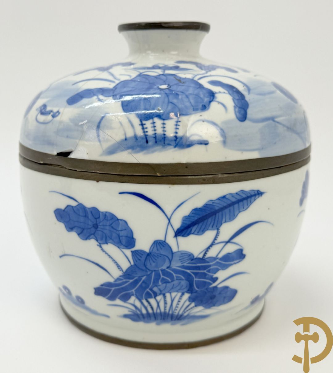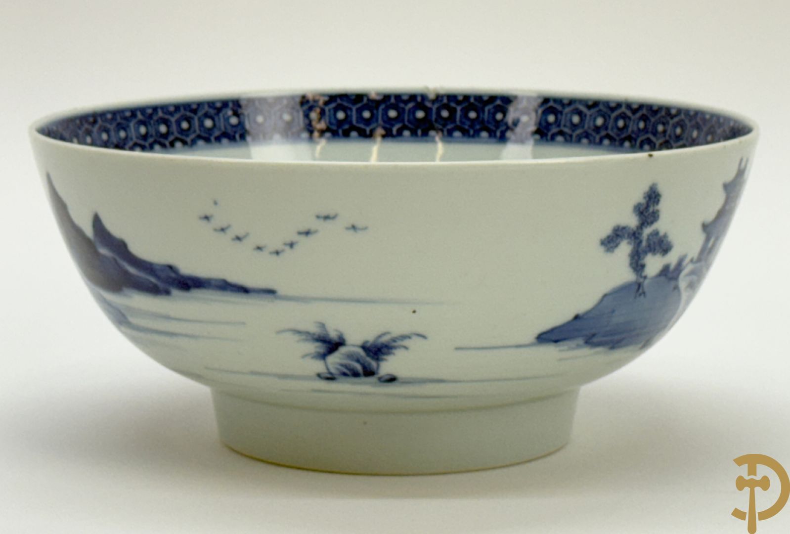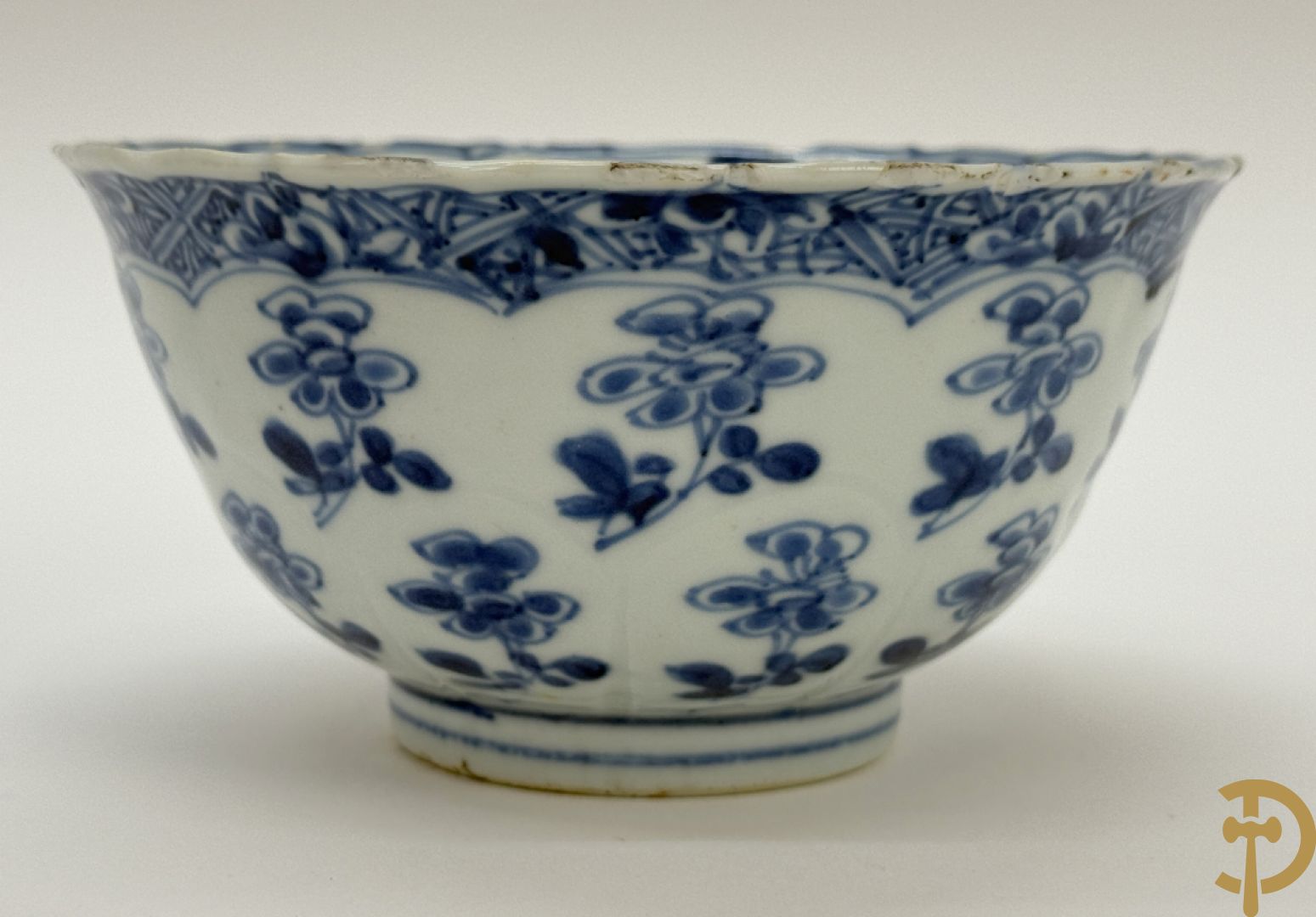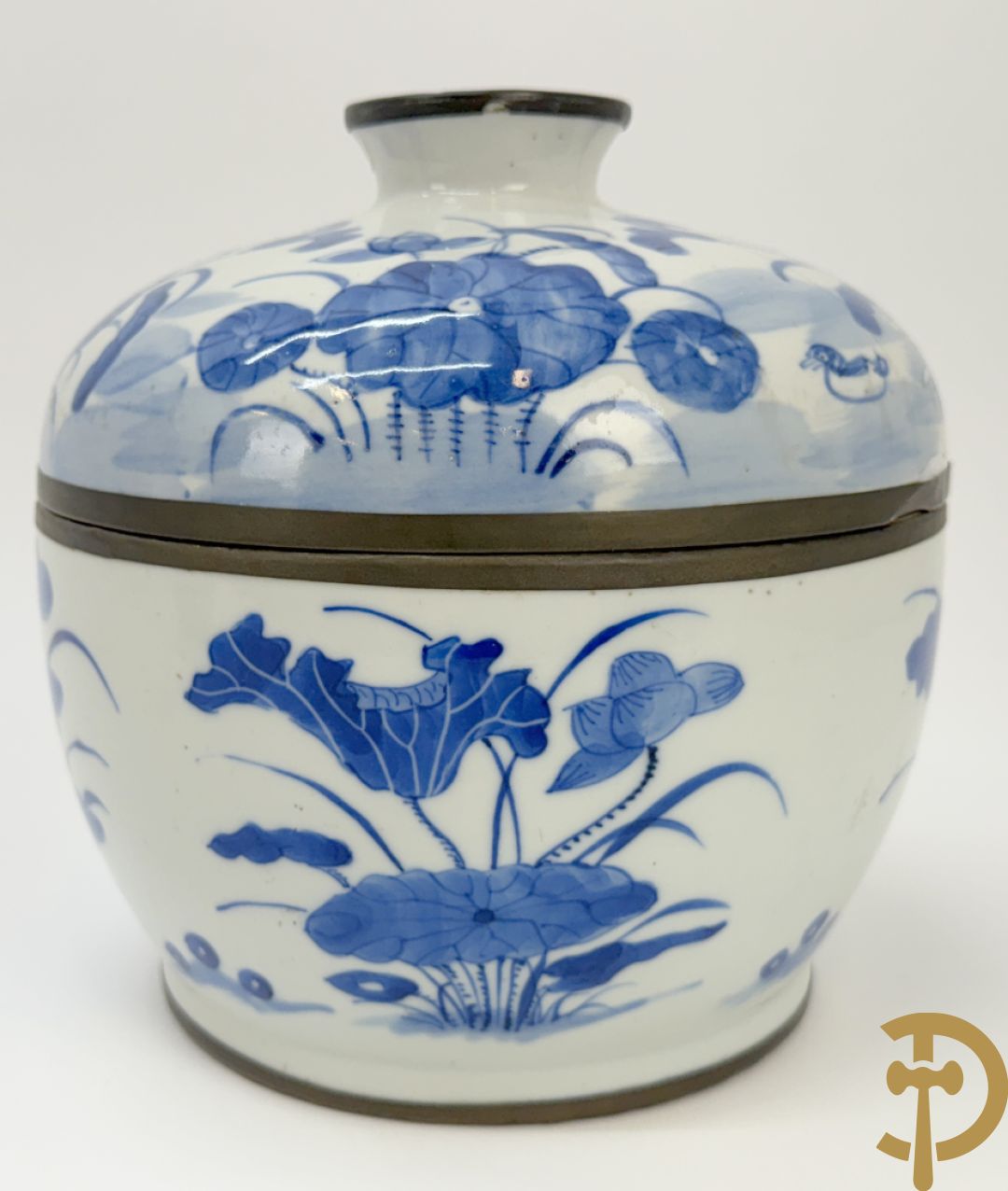 Chinese porseleinen blauw/wit coupe met landschapsdecor + kleine blauw/wit coupe met bloemendecor + porseleinen dekselkom met floraal decor