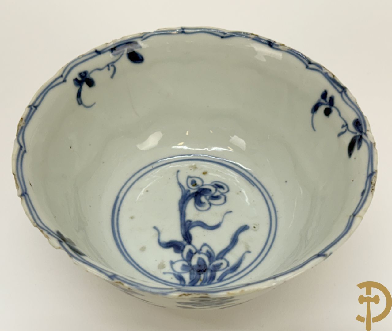 LOT 6 - Chinese porseleinen blauw/wit coupe met landschapsdecor + kleine blauw/wit coupe met bloemendecor + porseleinen dekselkom met floraal decor