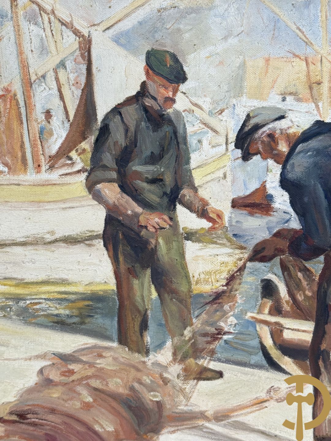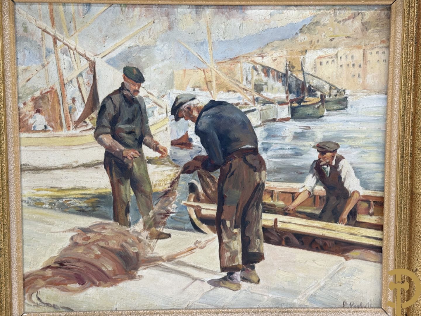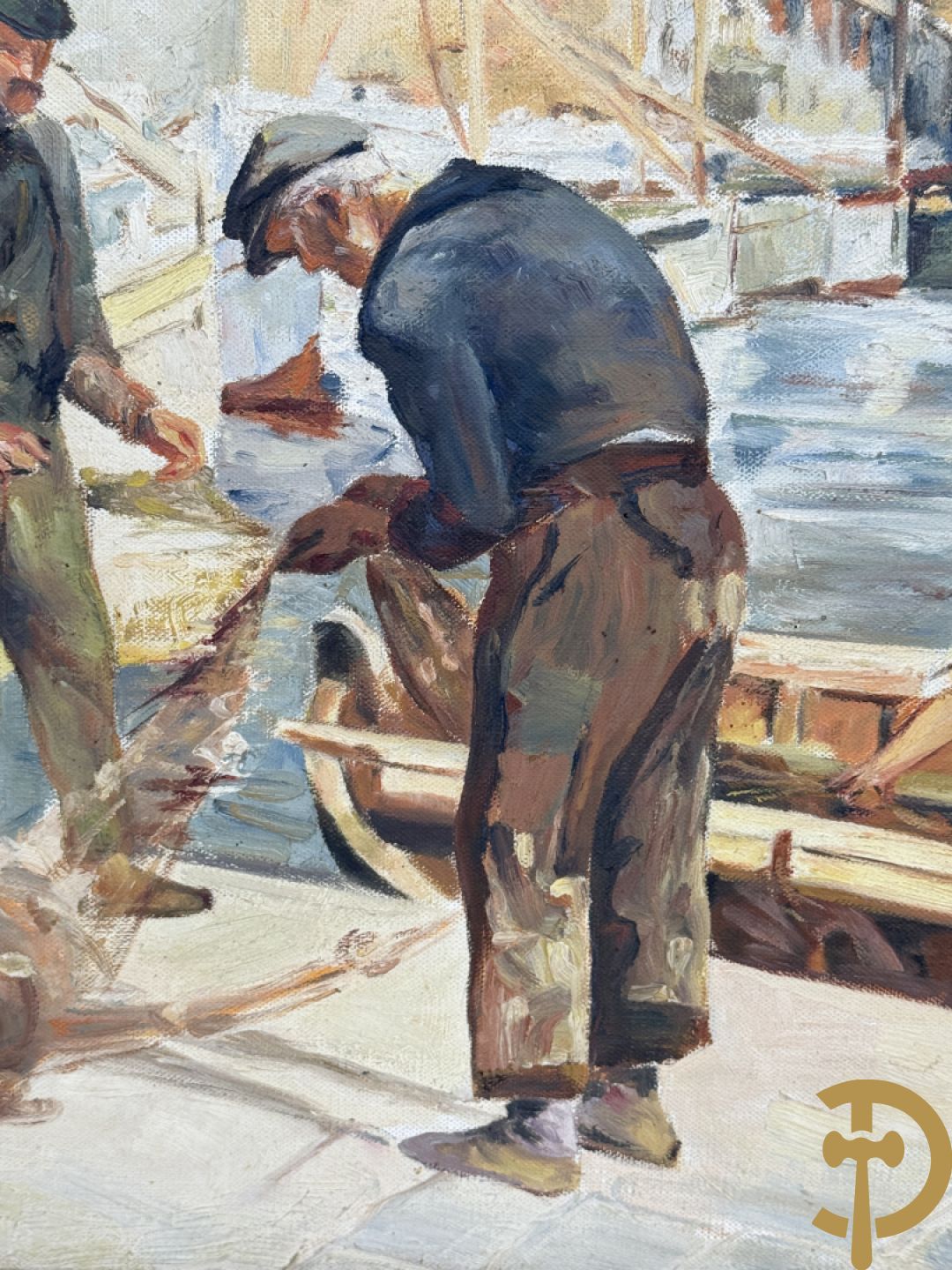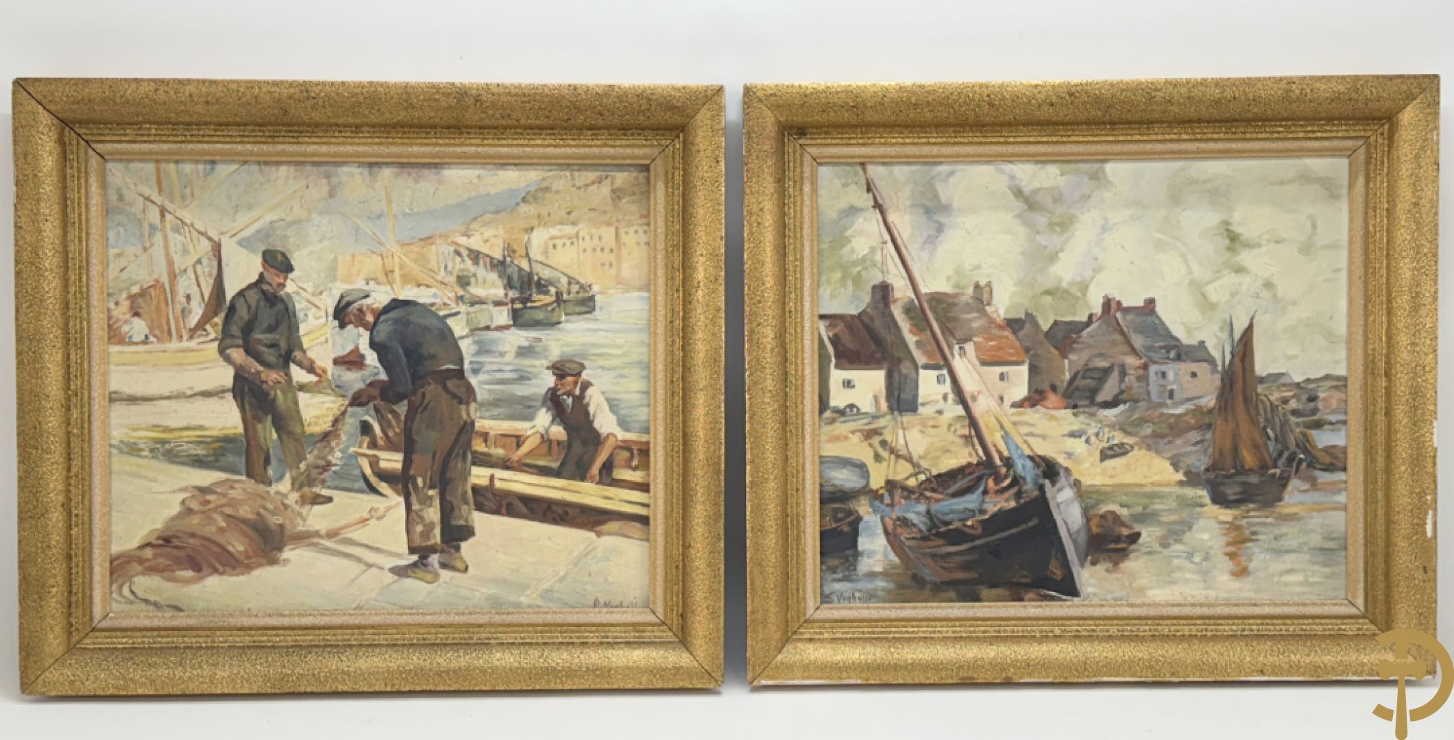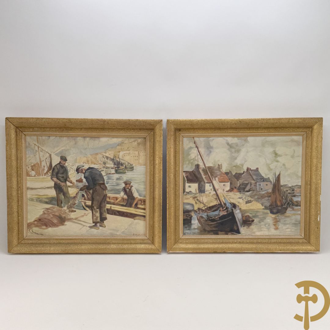 VANHULLE P. getekend 'Vissers met visnetten op de kade' olie op doek + VANHULLE getekend 'Sloepen op de kade met huizenzicht' olie op doek - pendant