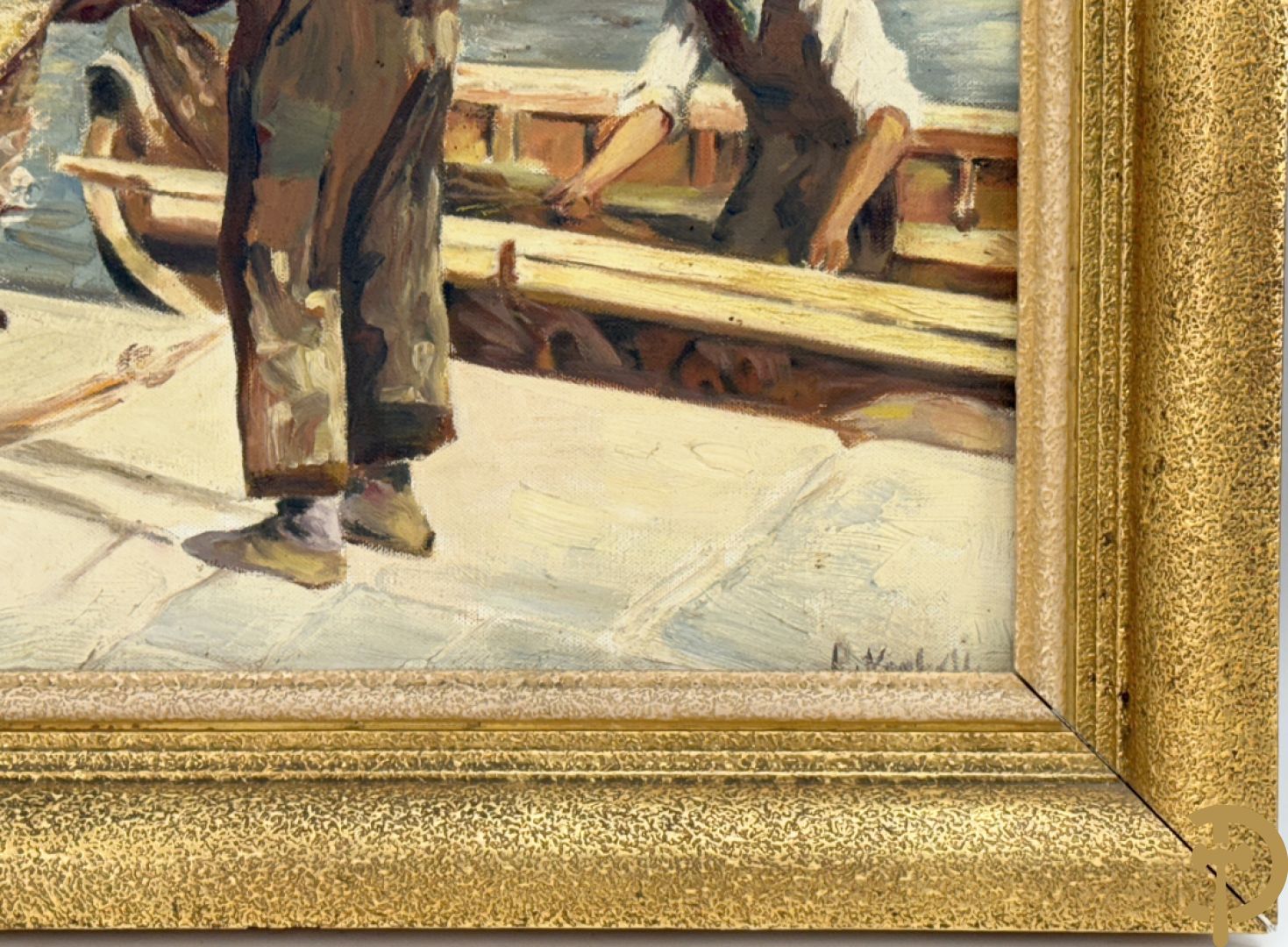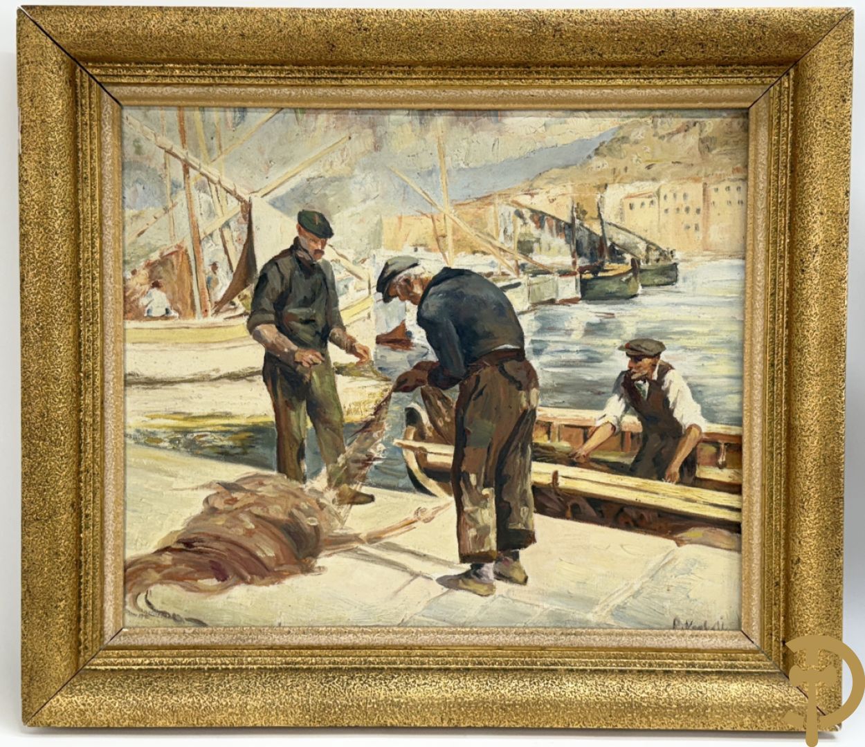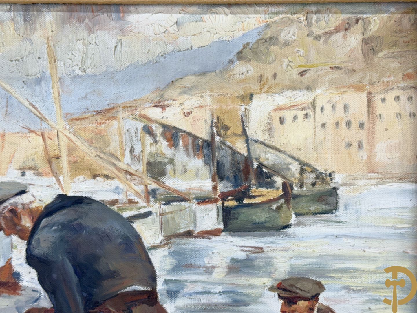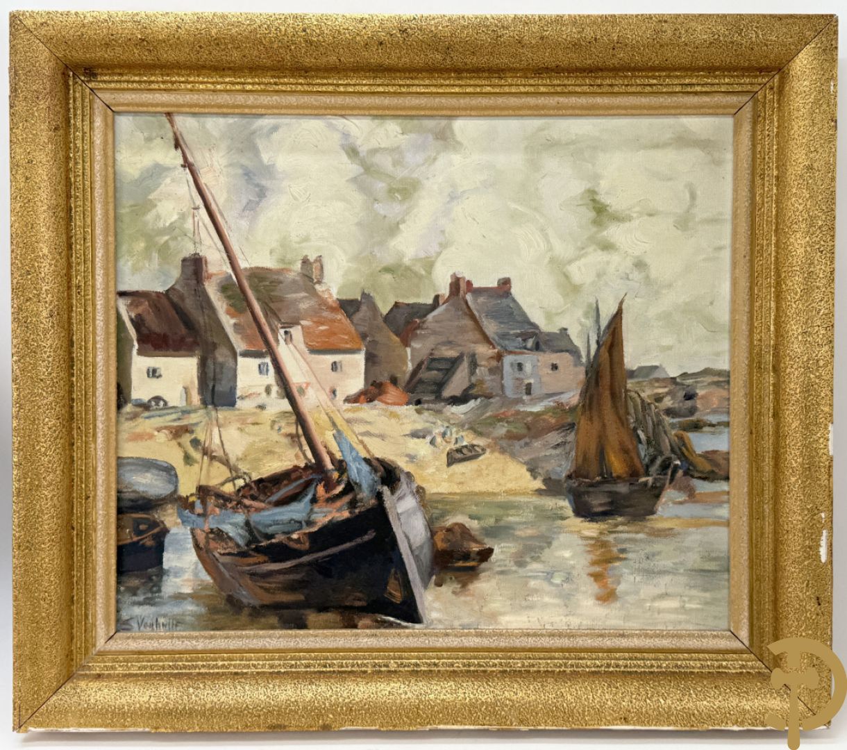 VANHULLE P. getekend 'Vissers met visnetten op de kade' olie op doek + VANHULLE getekend 'Sloepen op de kade met huizenzicht' olie op doek - pendant