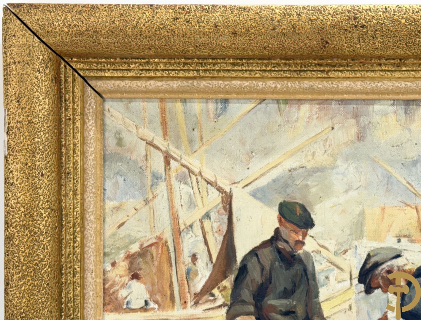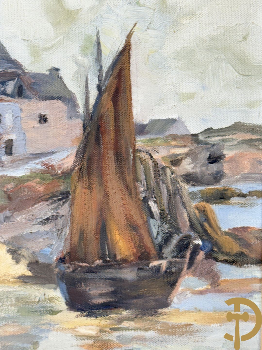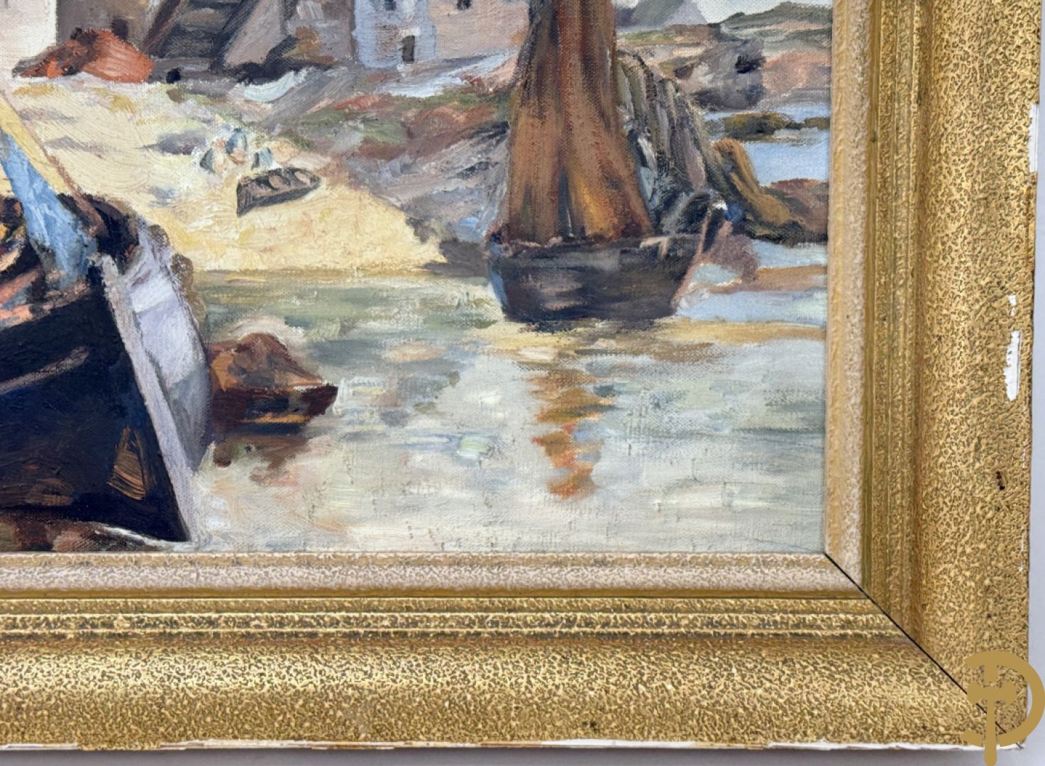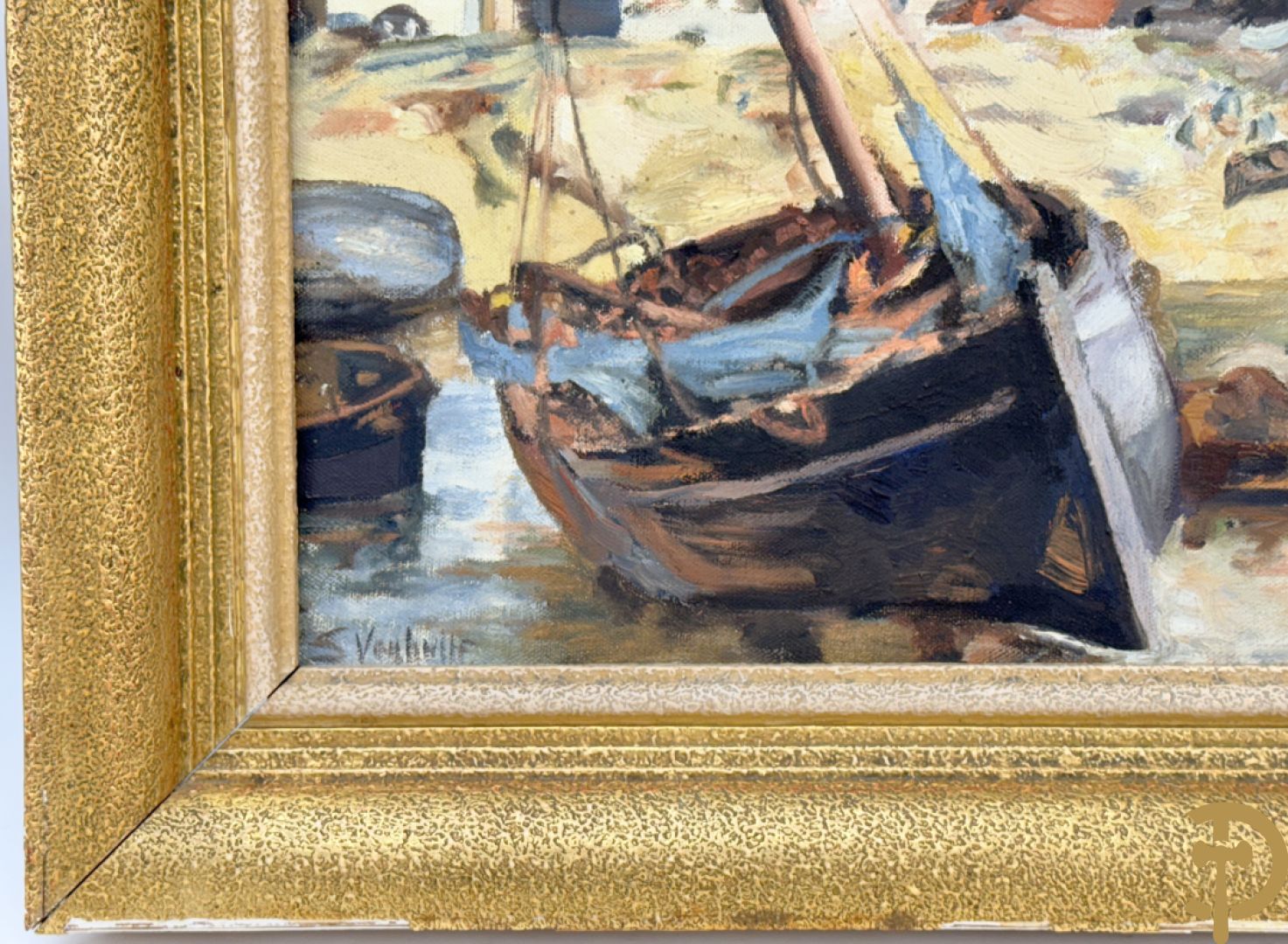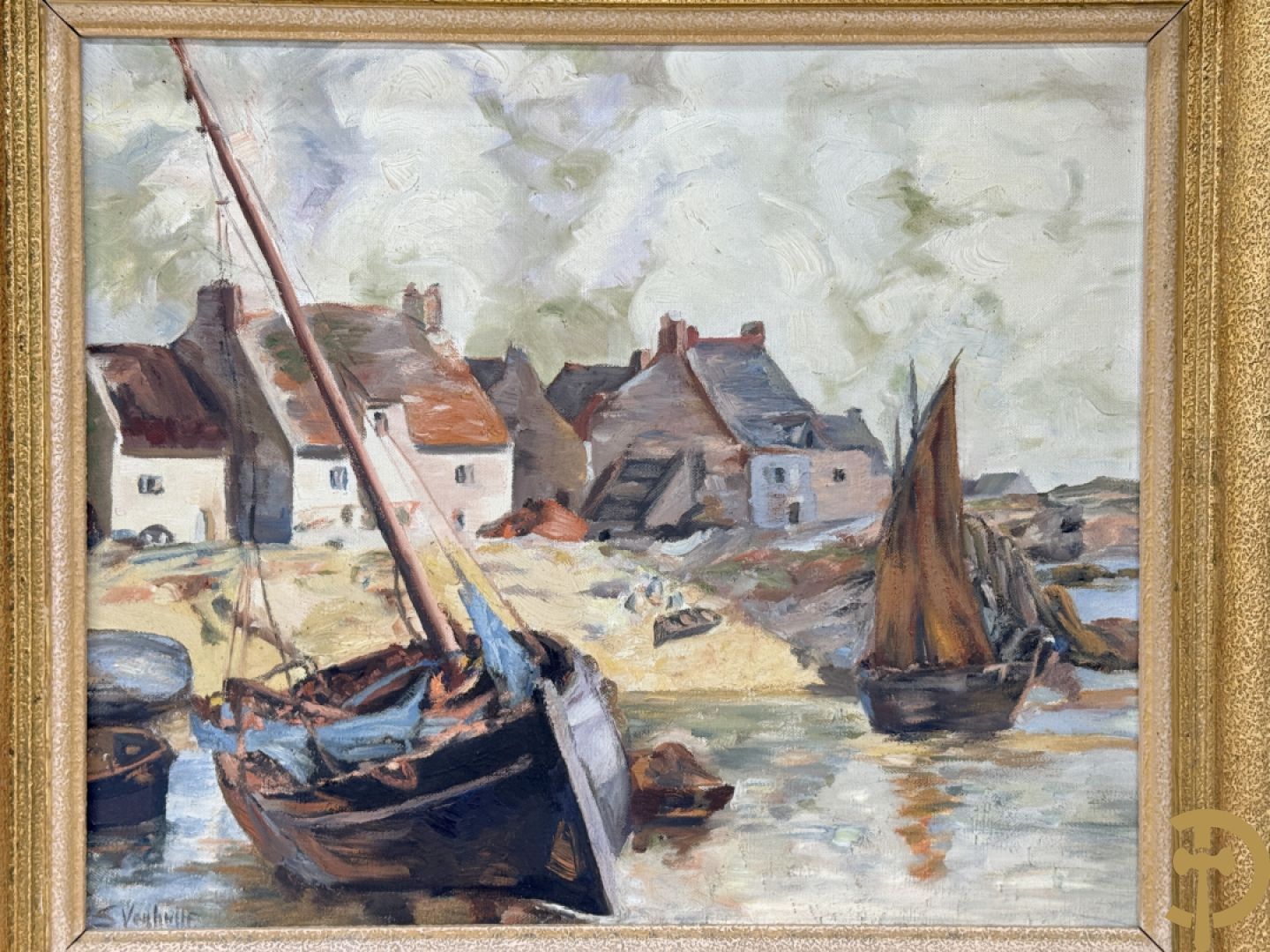 VANHULLE P. getekend 'Vissers met visnetten op de kade' olie op doek + VANHULLE getekend 'Sloepen op de kade met huizenzicht' olie op doek - pendant