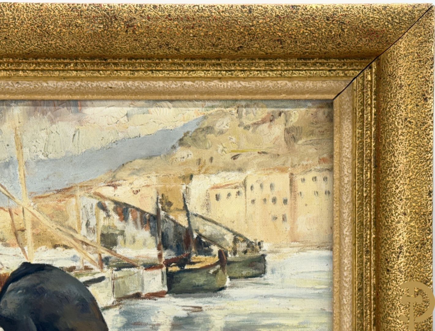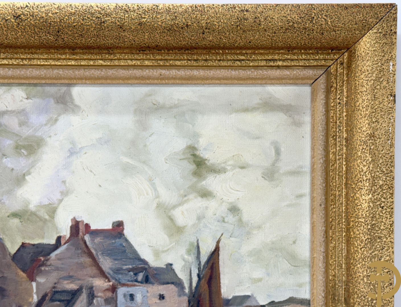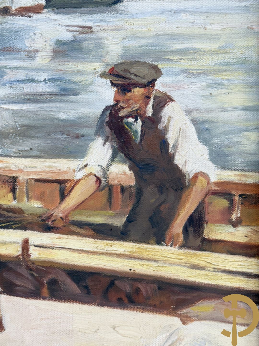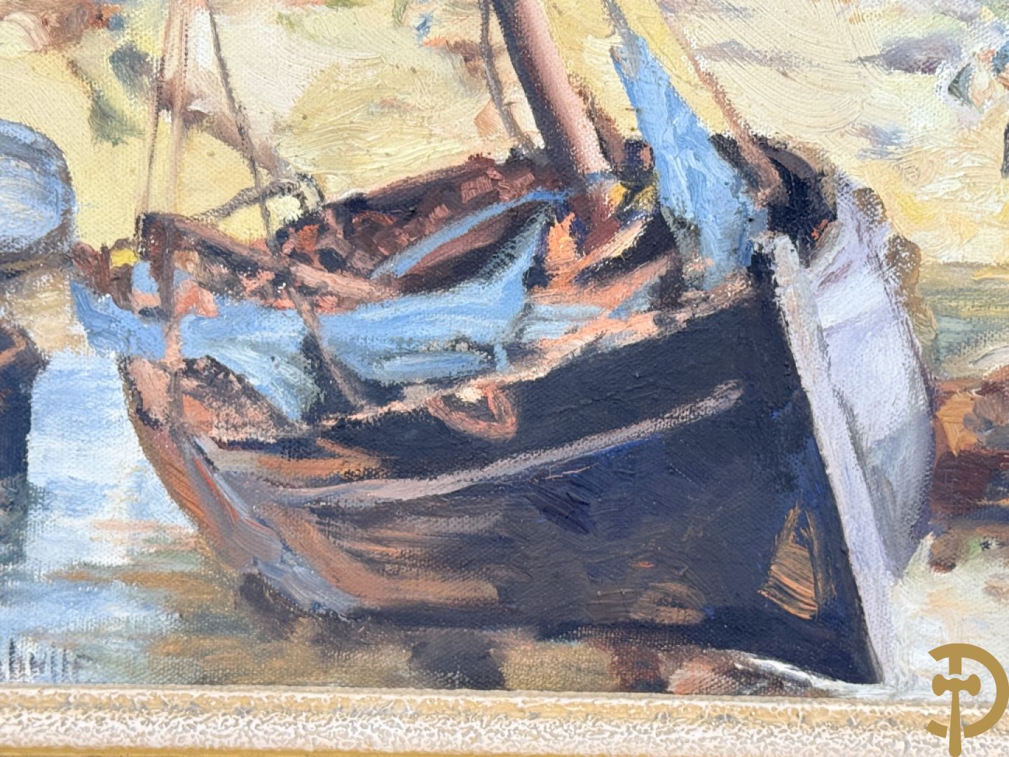 VANHULLE P. getekend 'Vissers met visnetten op de kade' olie op doek + VANHULLE getekend 'Sloepen op de kade met huizenzicht' olie op doek - pendant