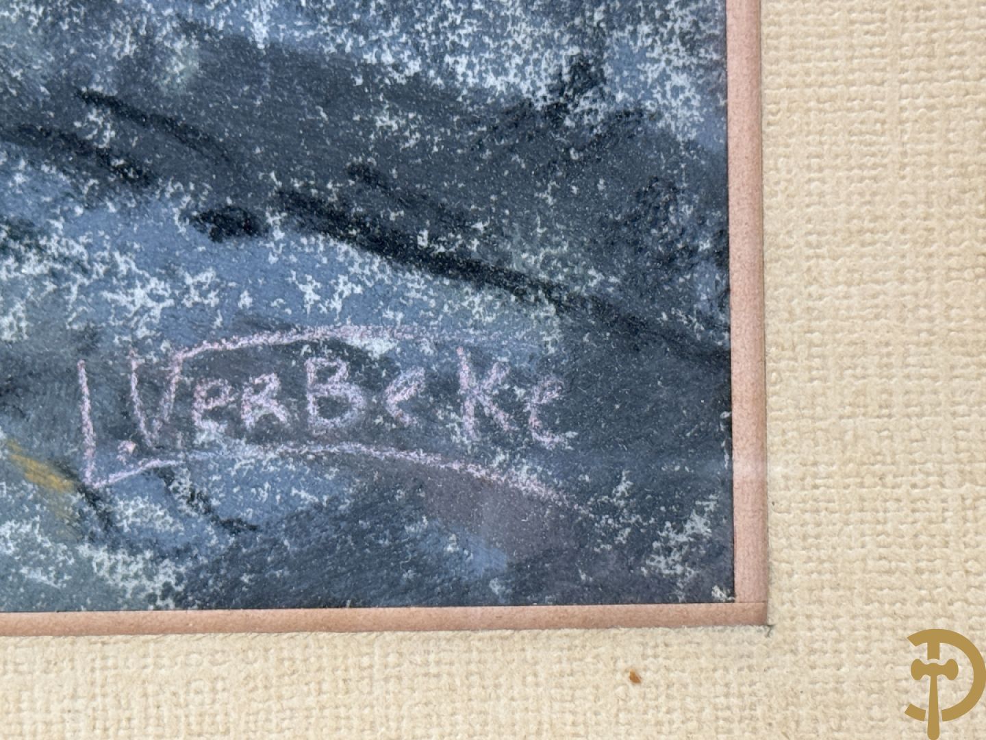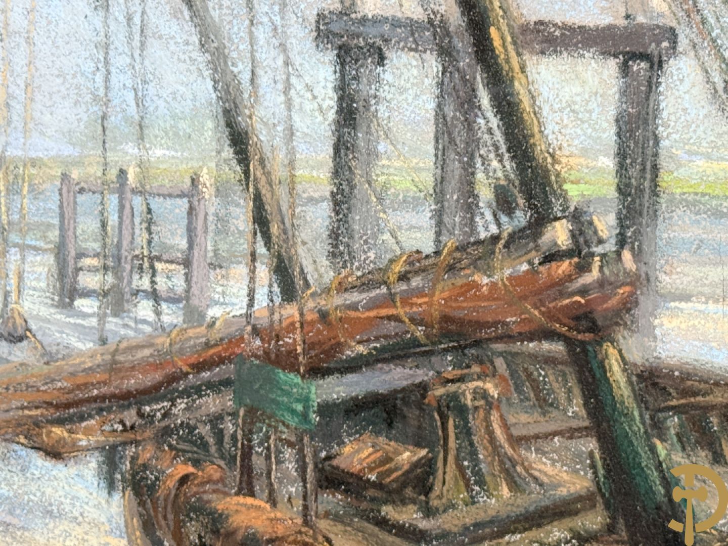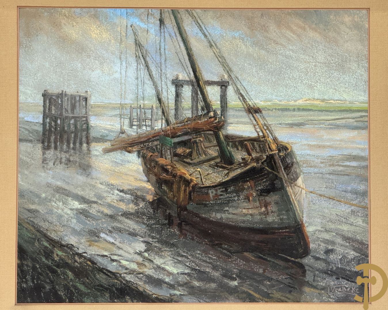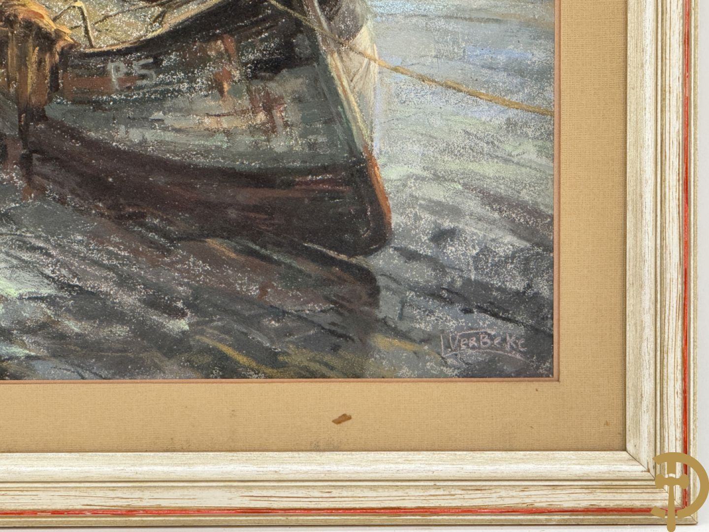 VERBEKE L. getekend 'Aangemeerde sloep bij staketsel' pastel
