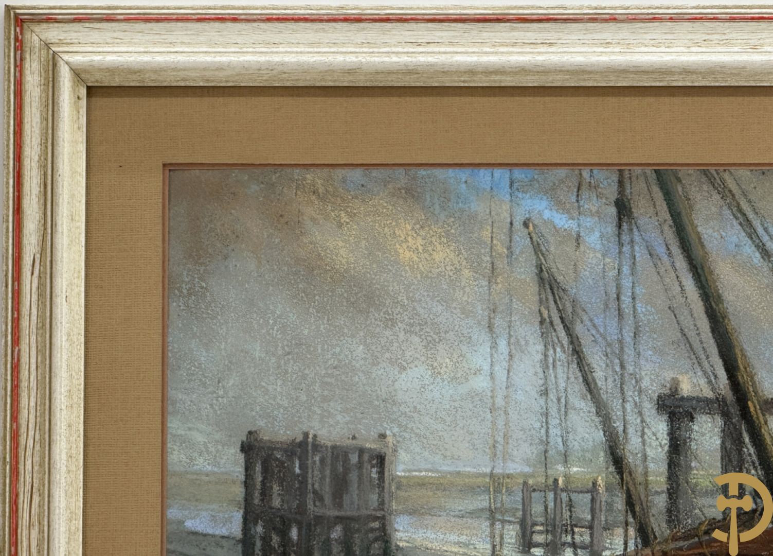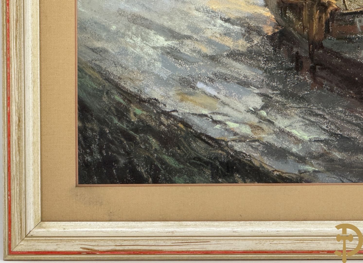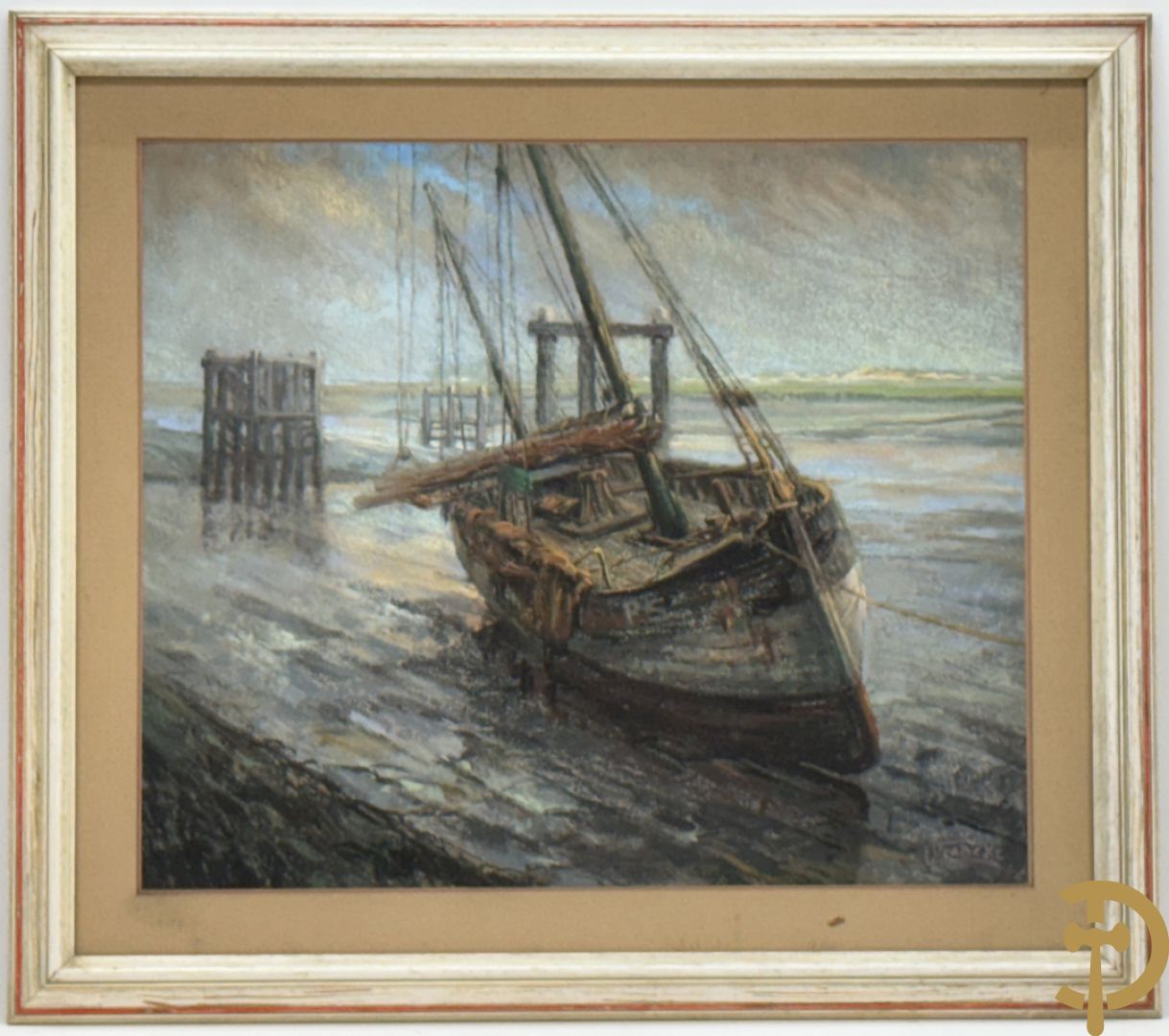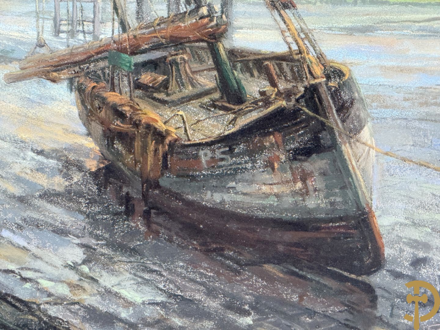 VERBEKE L. getekend 'Aangemeerde sloep bij staketsel' pastel
