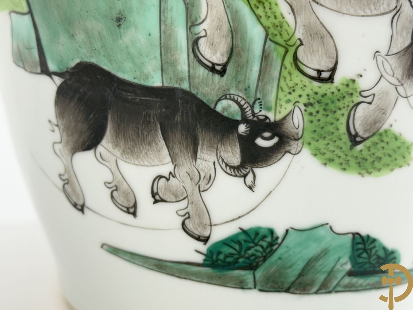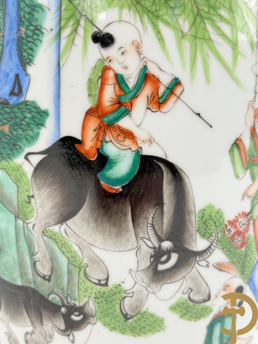 Chinese porseleinen vaas met geanimeerd landschapsdecor en kind op buffel, bovenaan getekend
