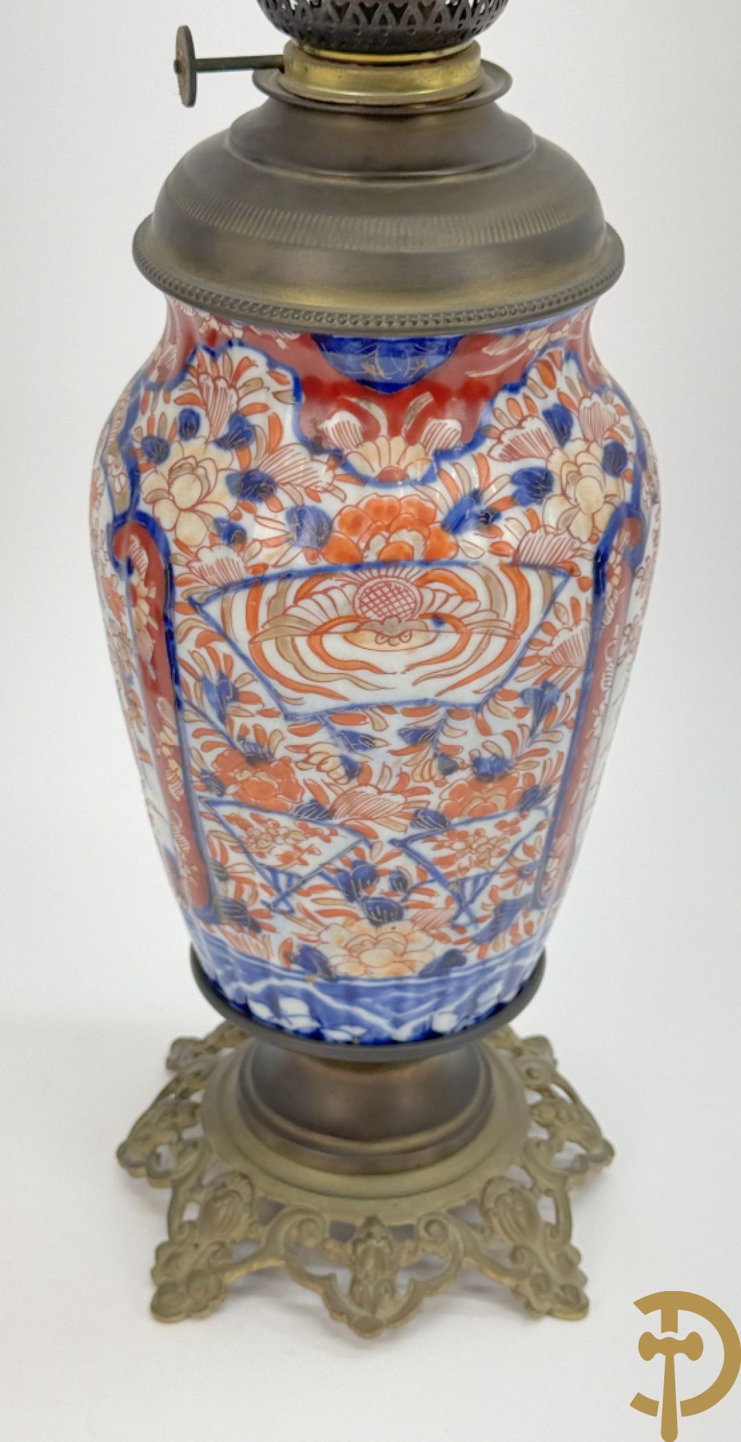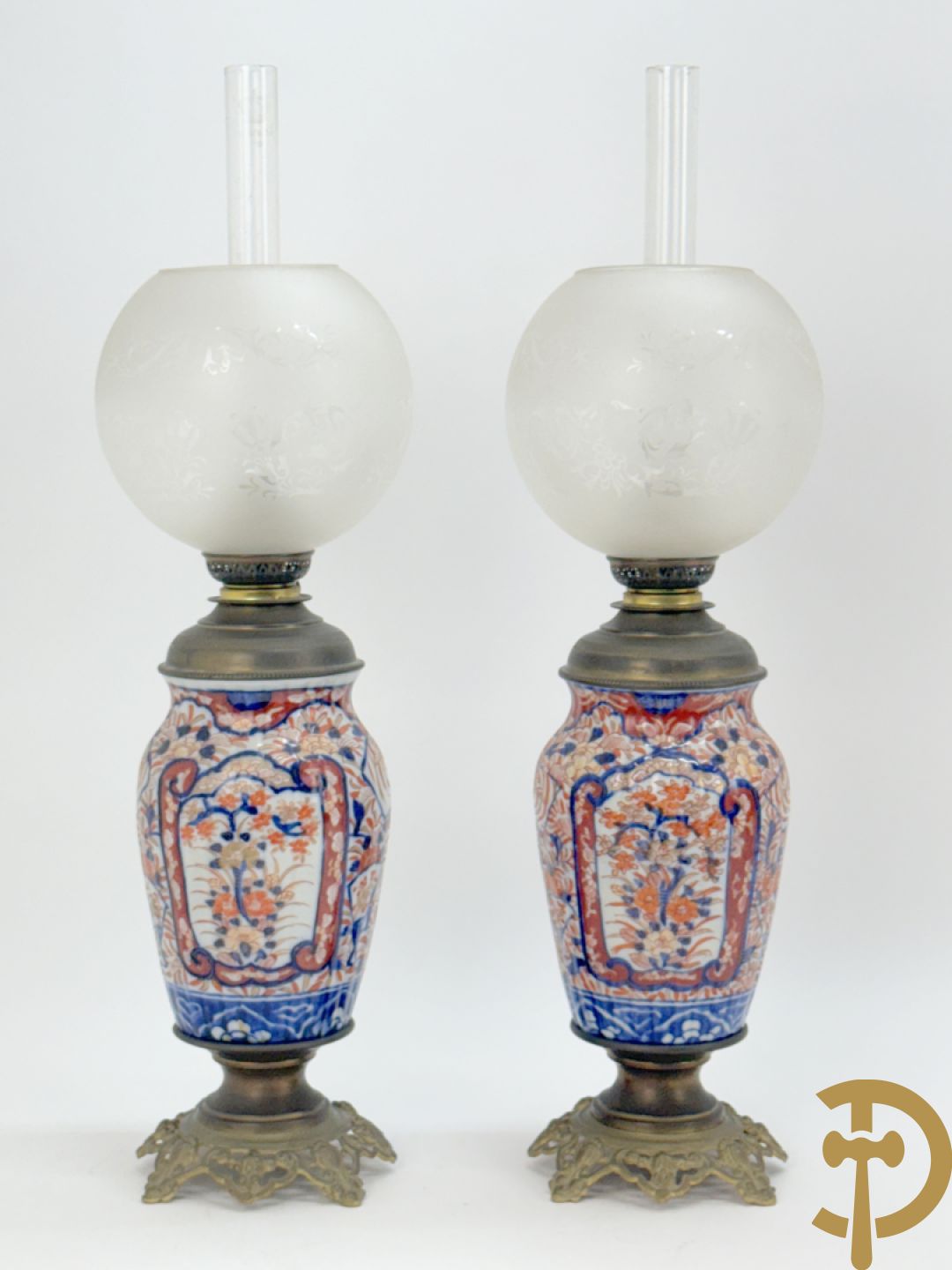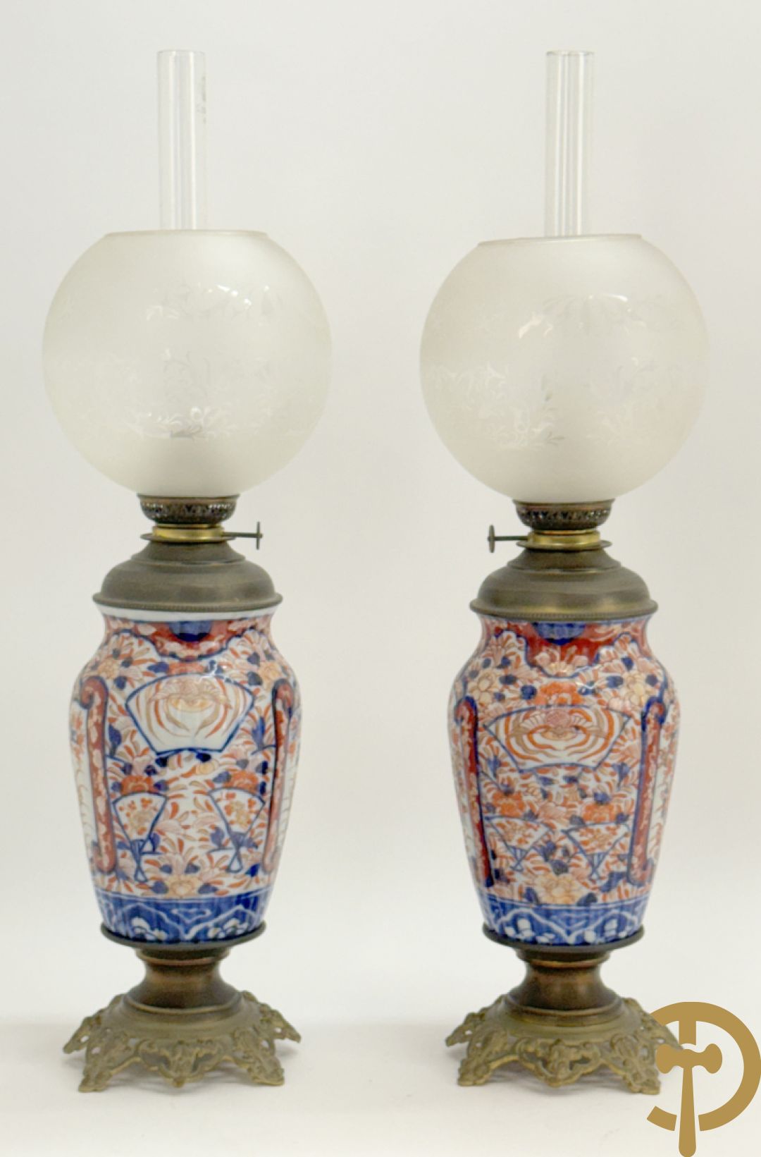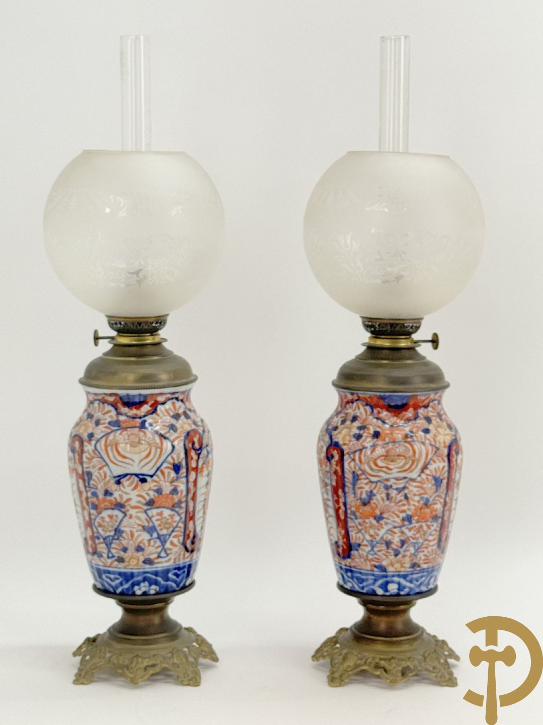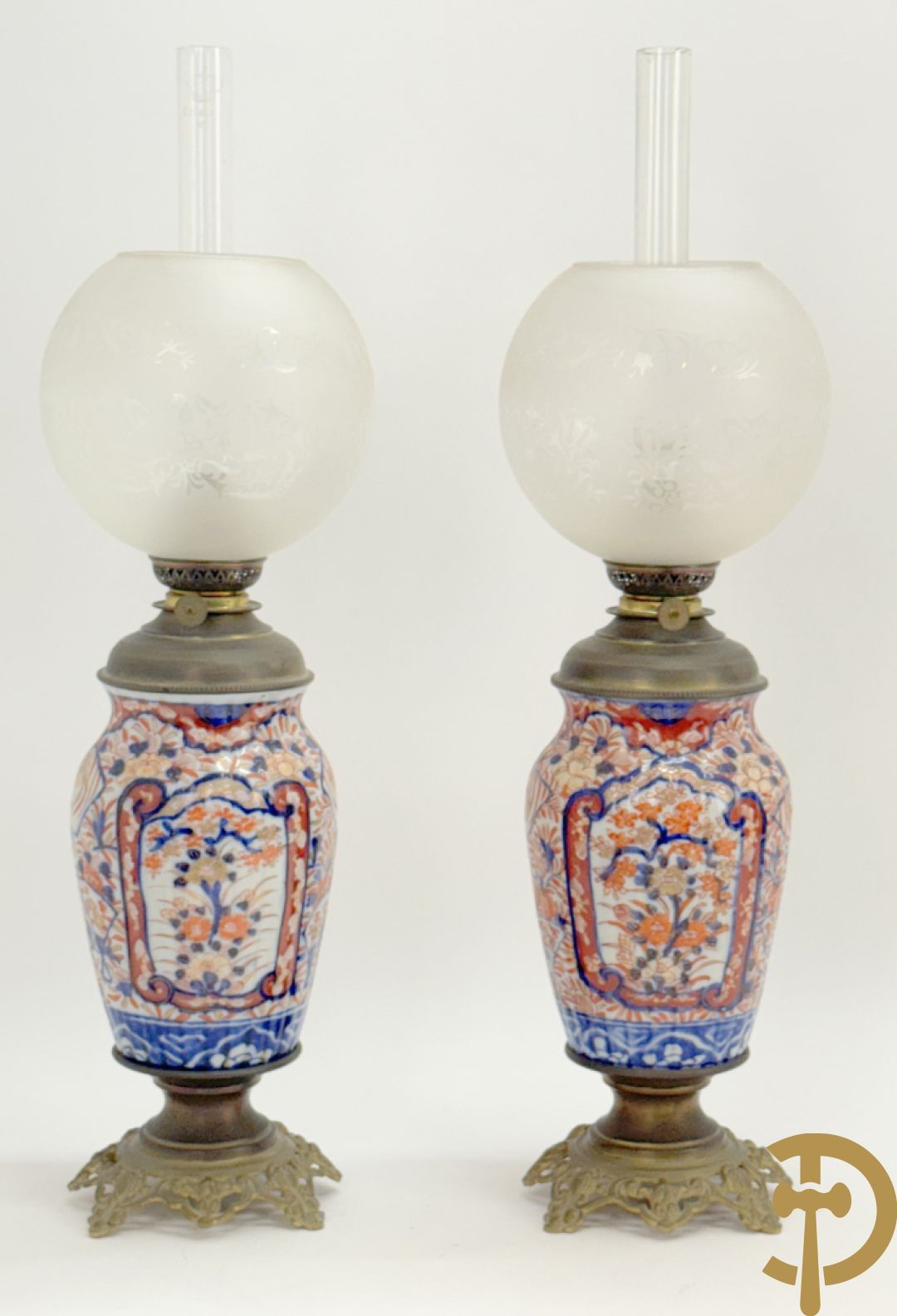 Paar Imari vazen als quinqué met olielamp gemonteerd op koperen voet
