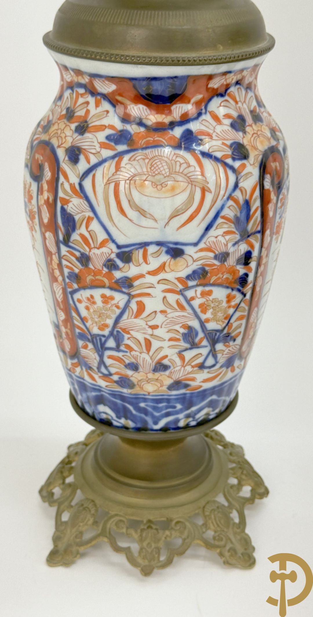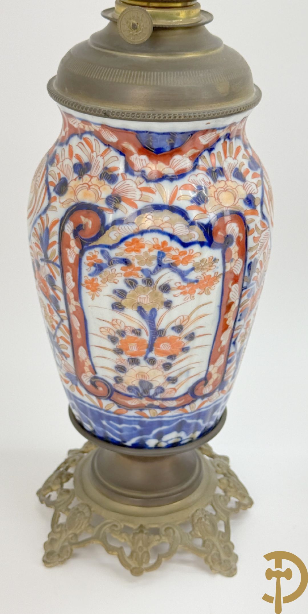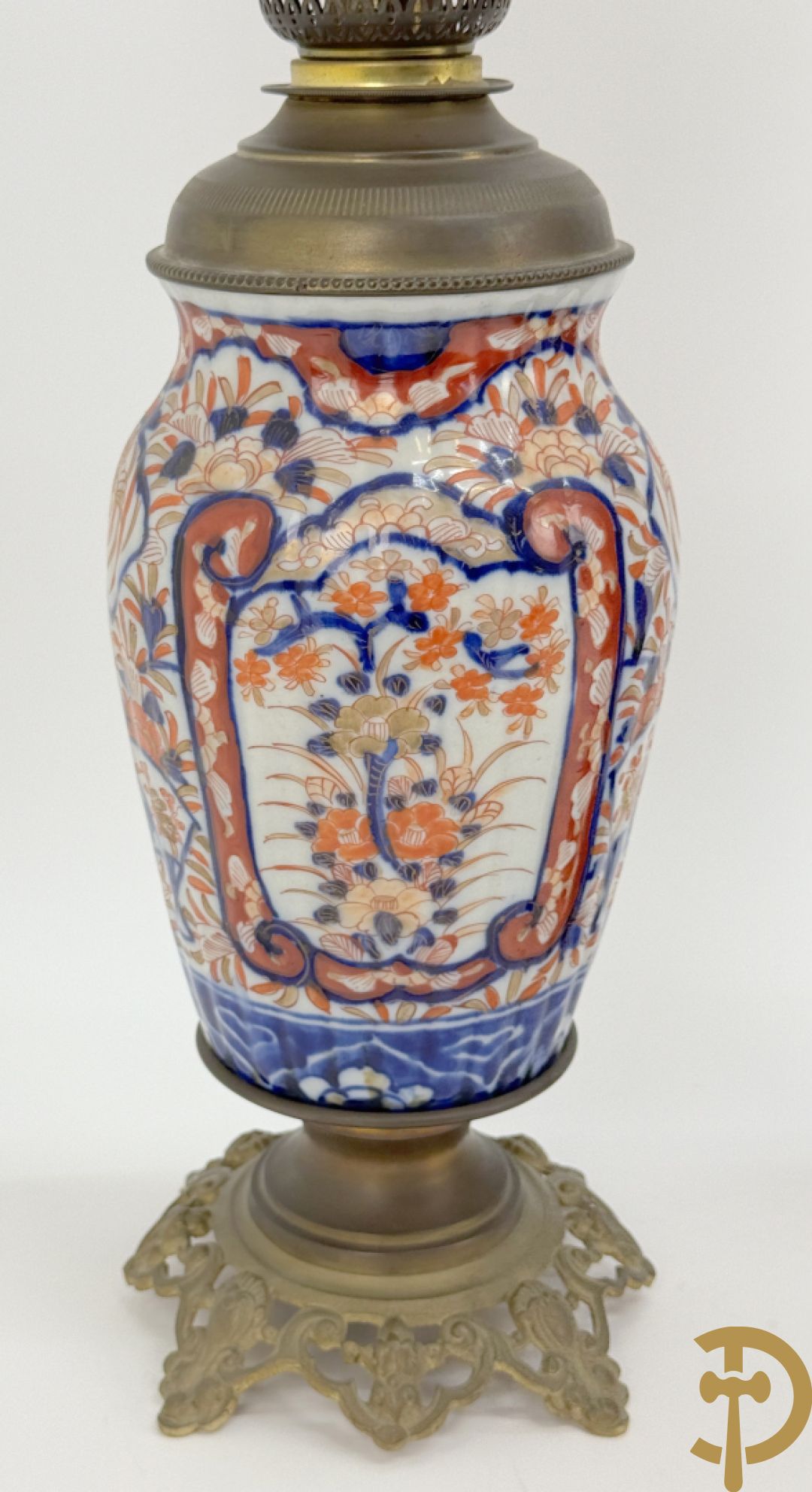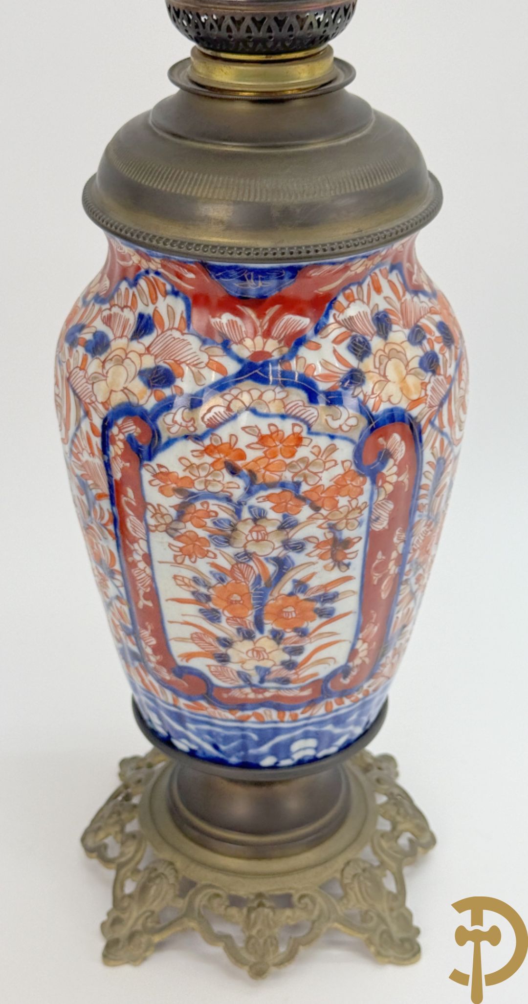 Paar Imari vazen als quinqué met olielamp gemonteerd op koperen voet