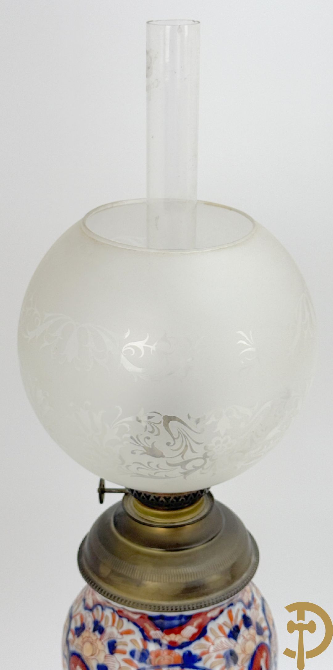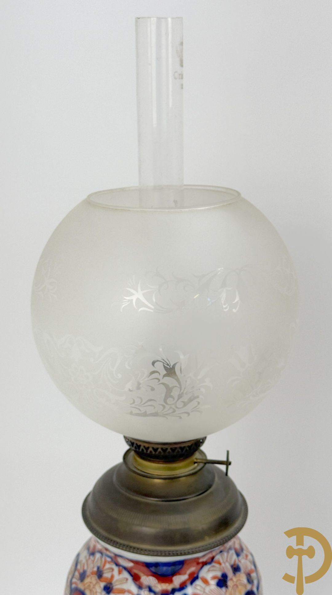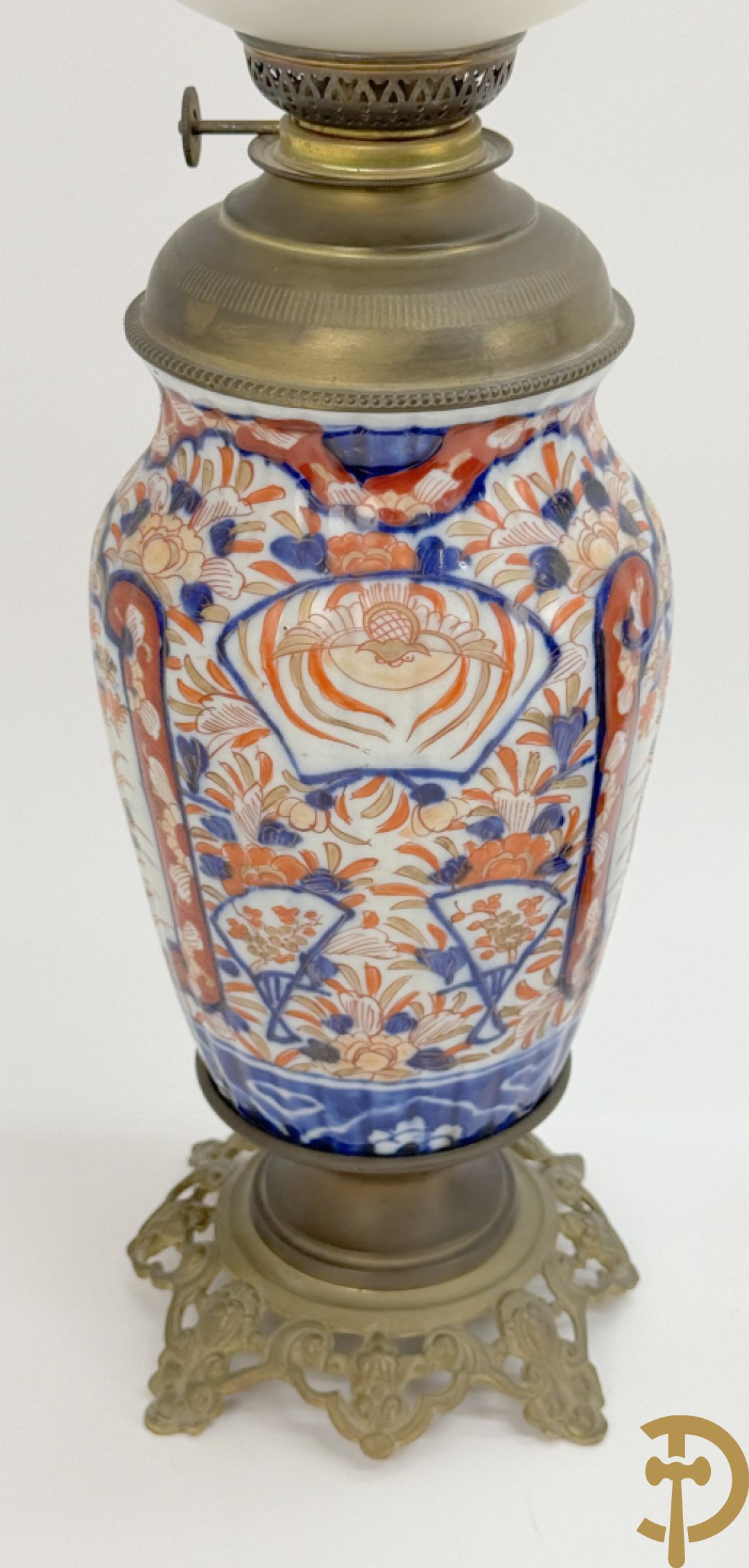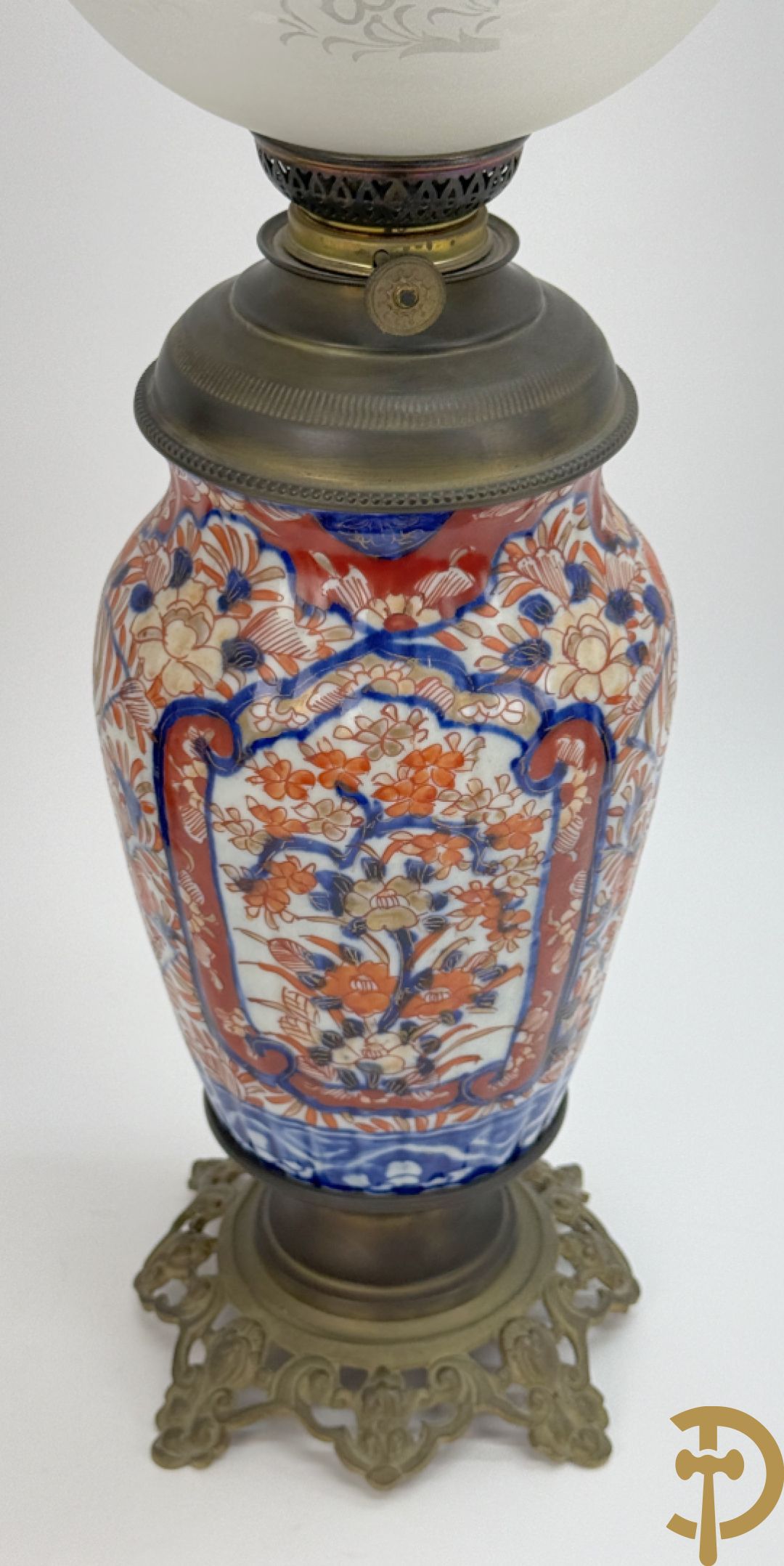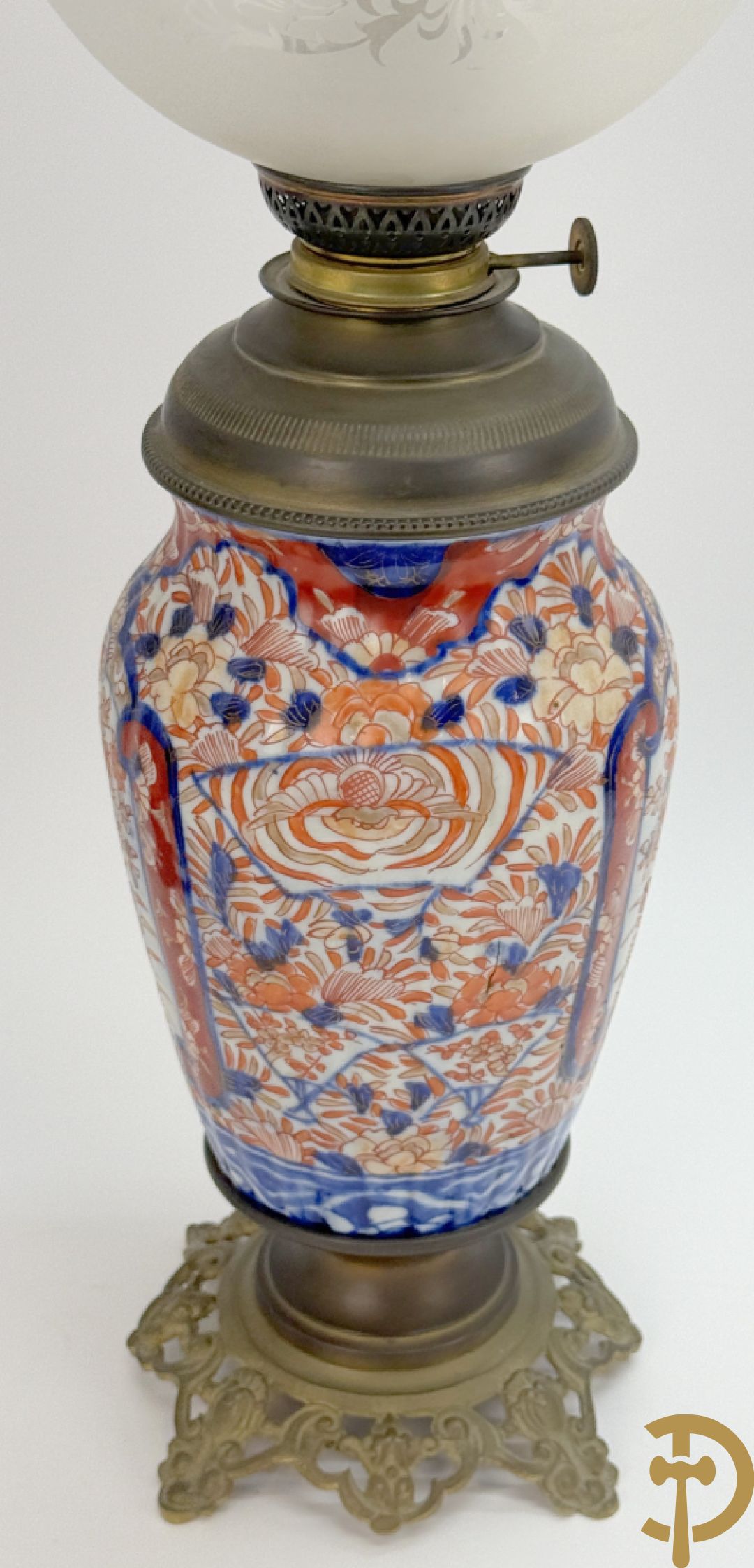 Paar Imari vazen als quinqué met olielamp gemonteerd op koperen voet