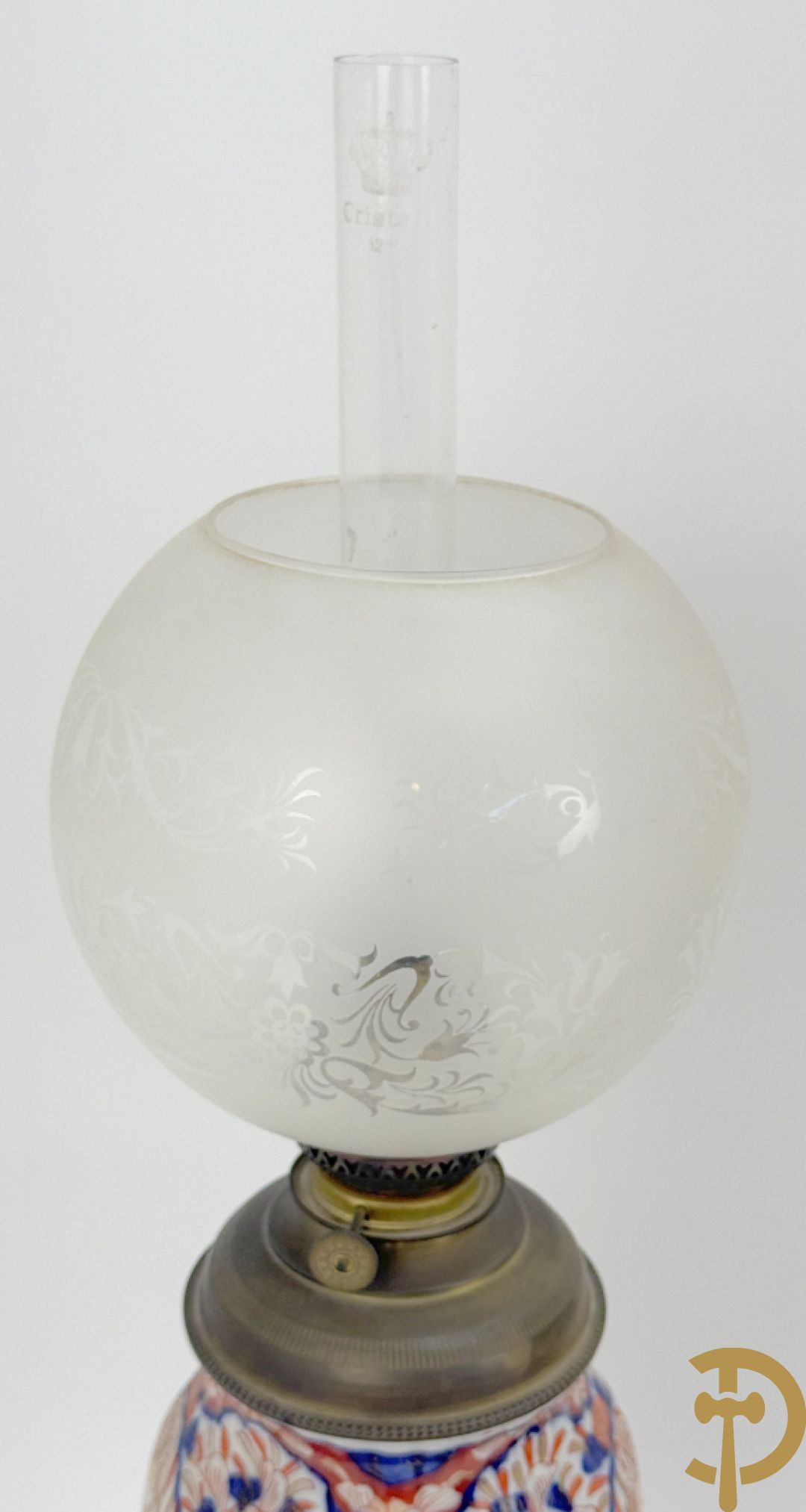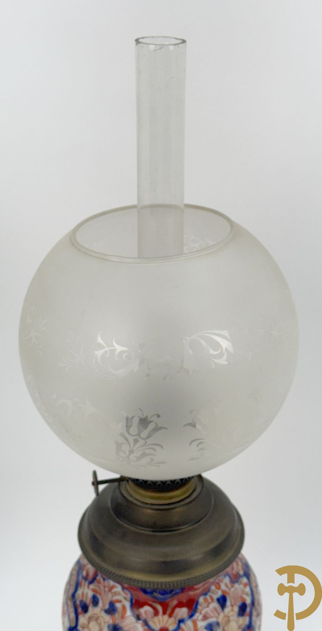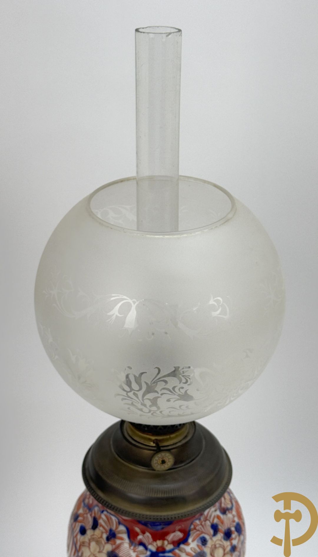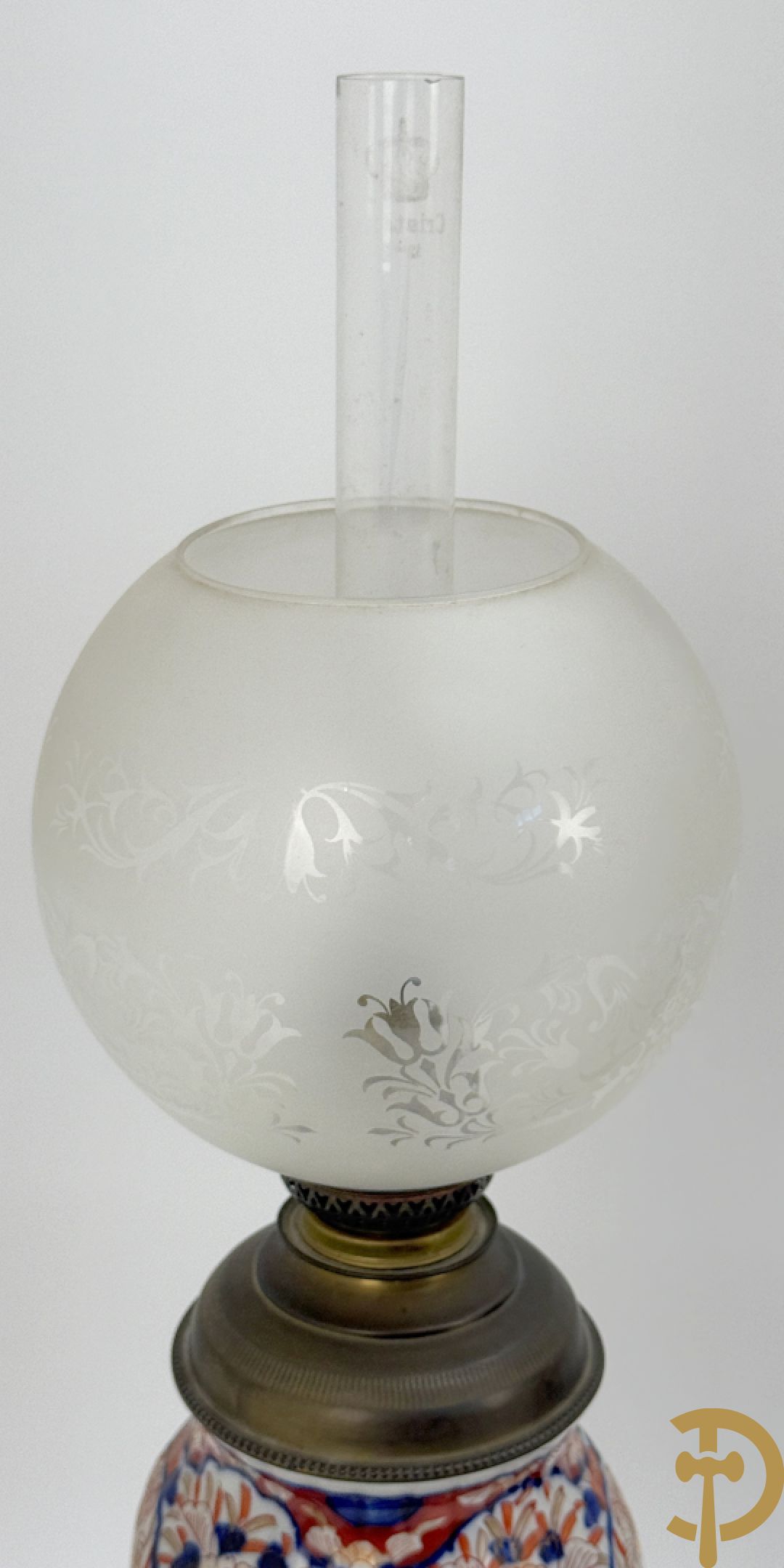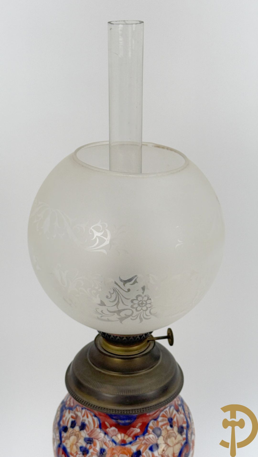 Paar Imari vazen als quinqué met olielamp gemonteerd op koperen voet