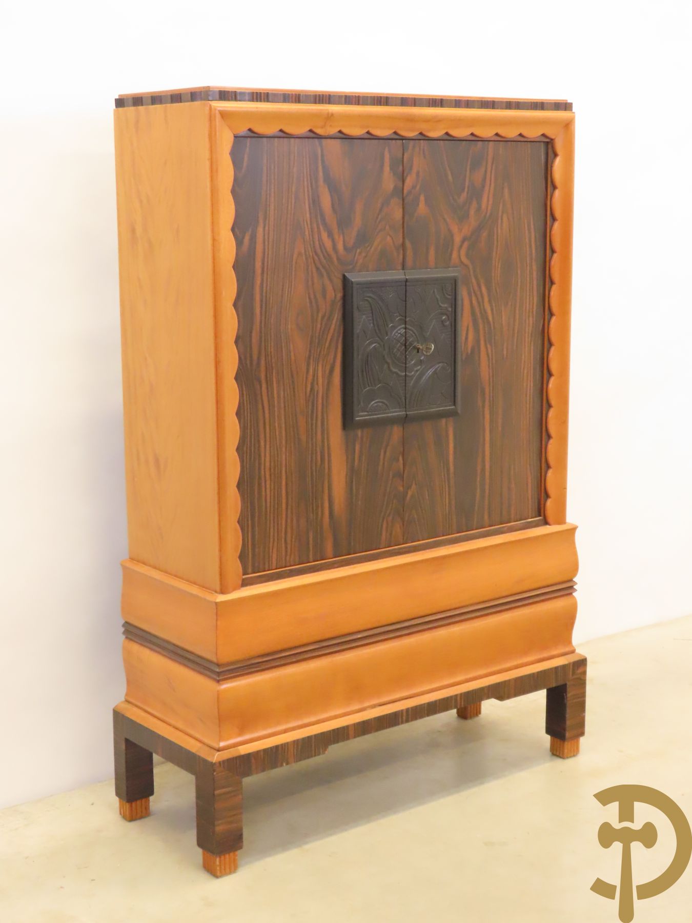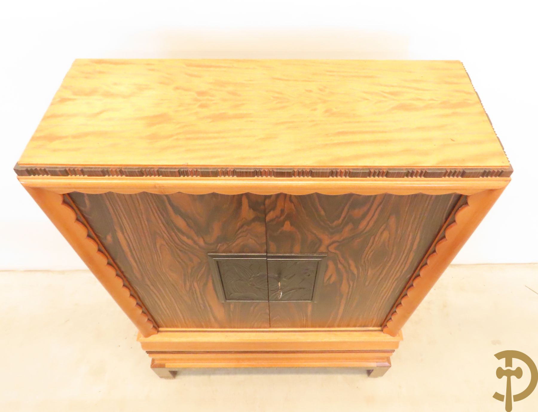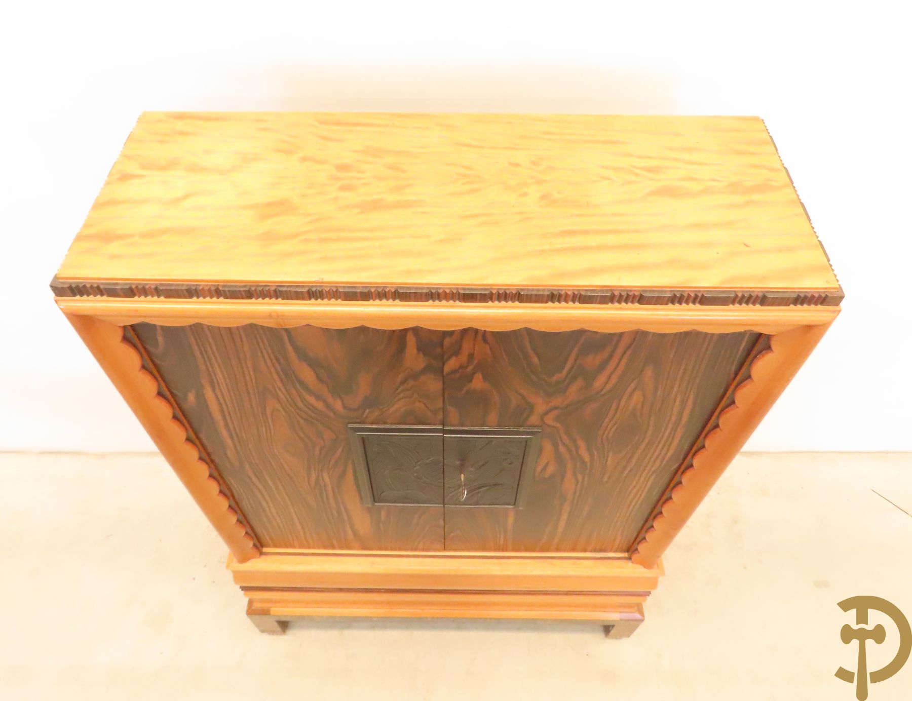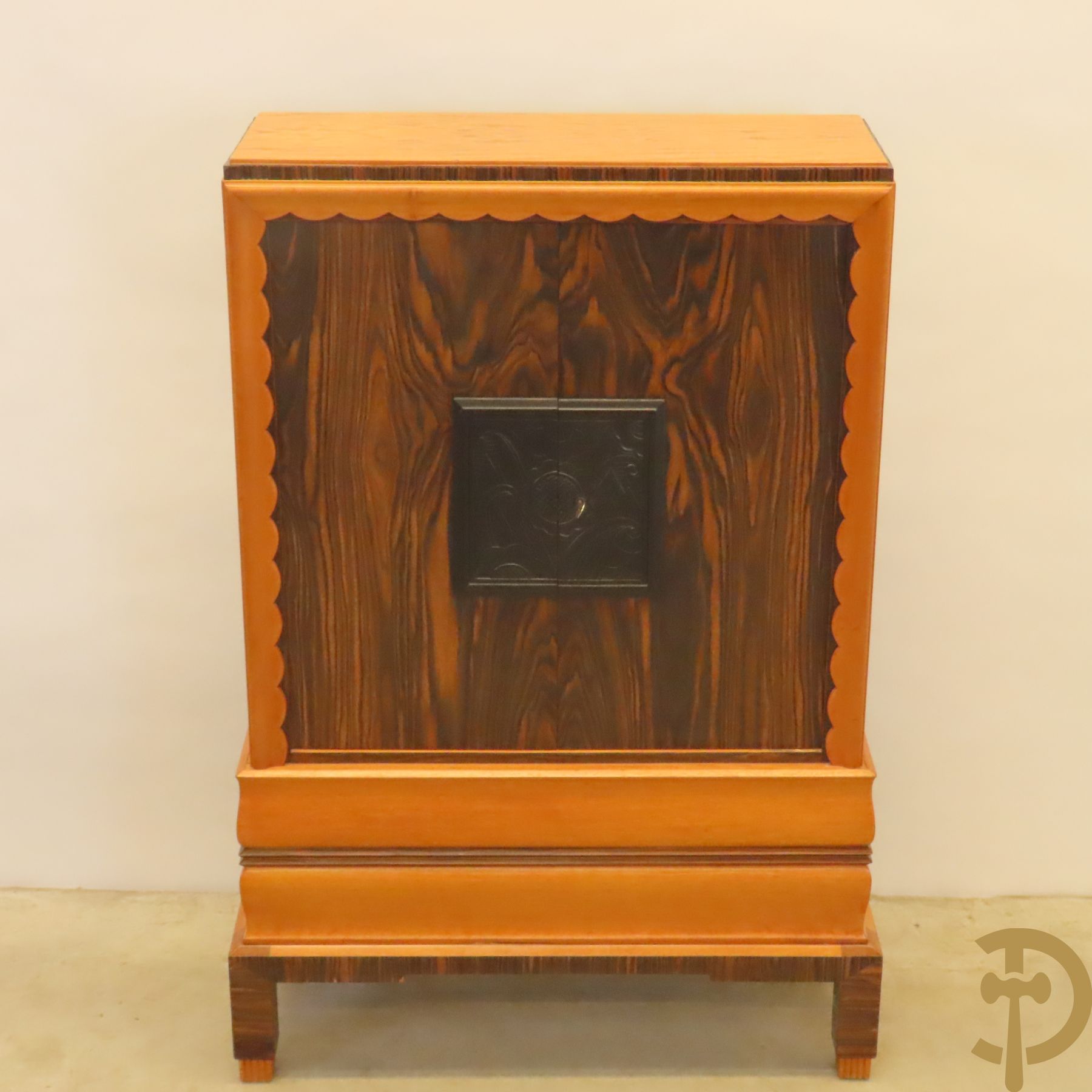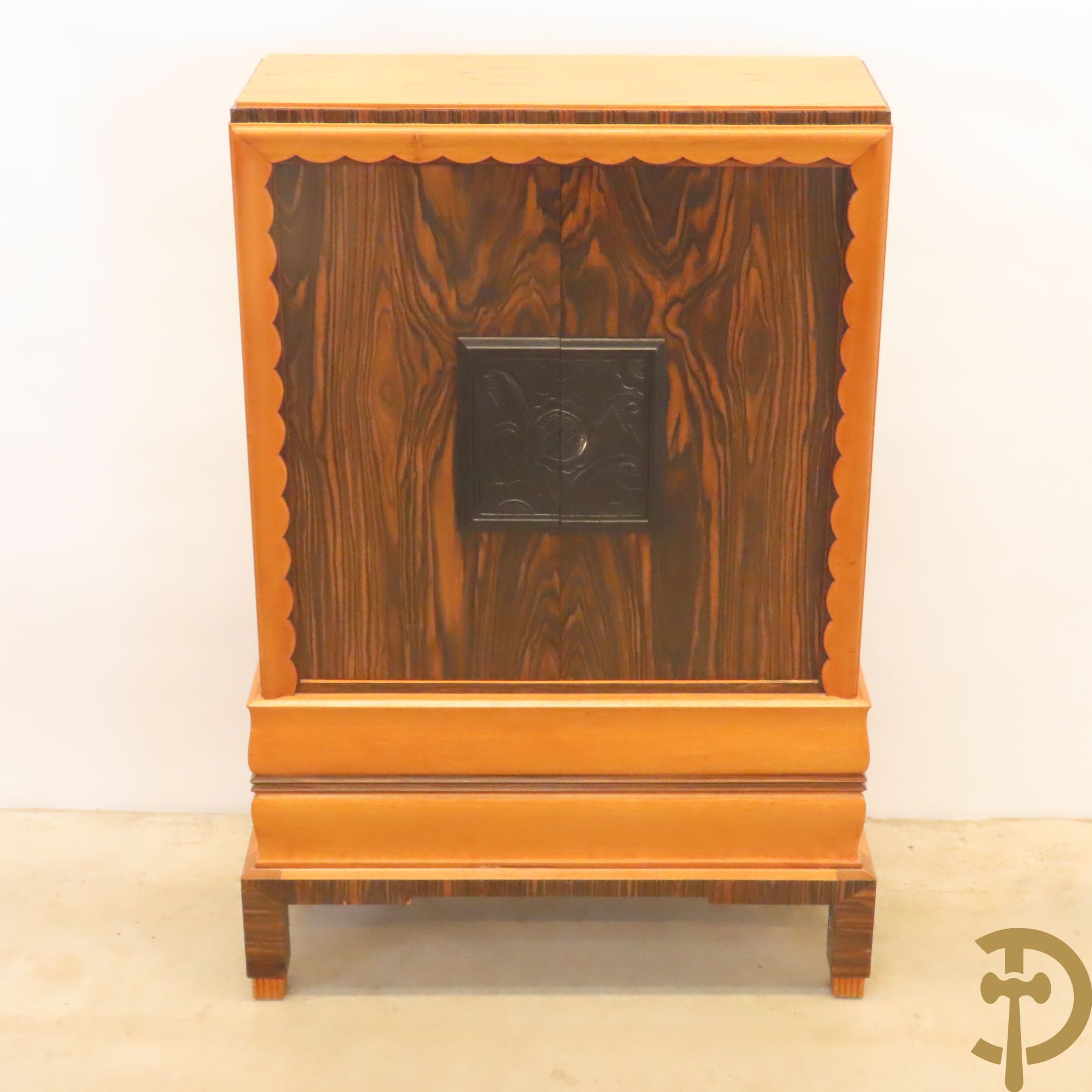 Citroenhouten Art Deco barmeubel Decoene met 2 deuren en bar achterliggend - middenin met gesculpteerd Art Deco paneel ontworpen door Noppe Karel, model Brillat