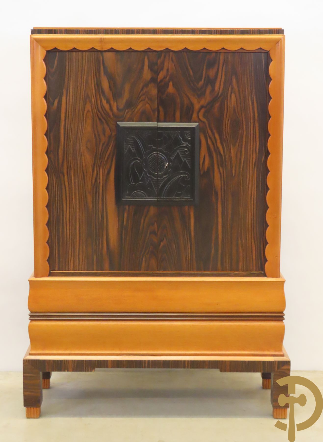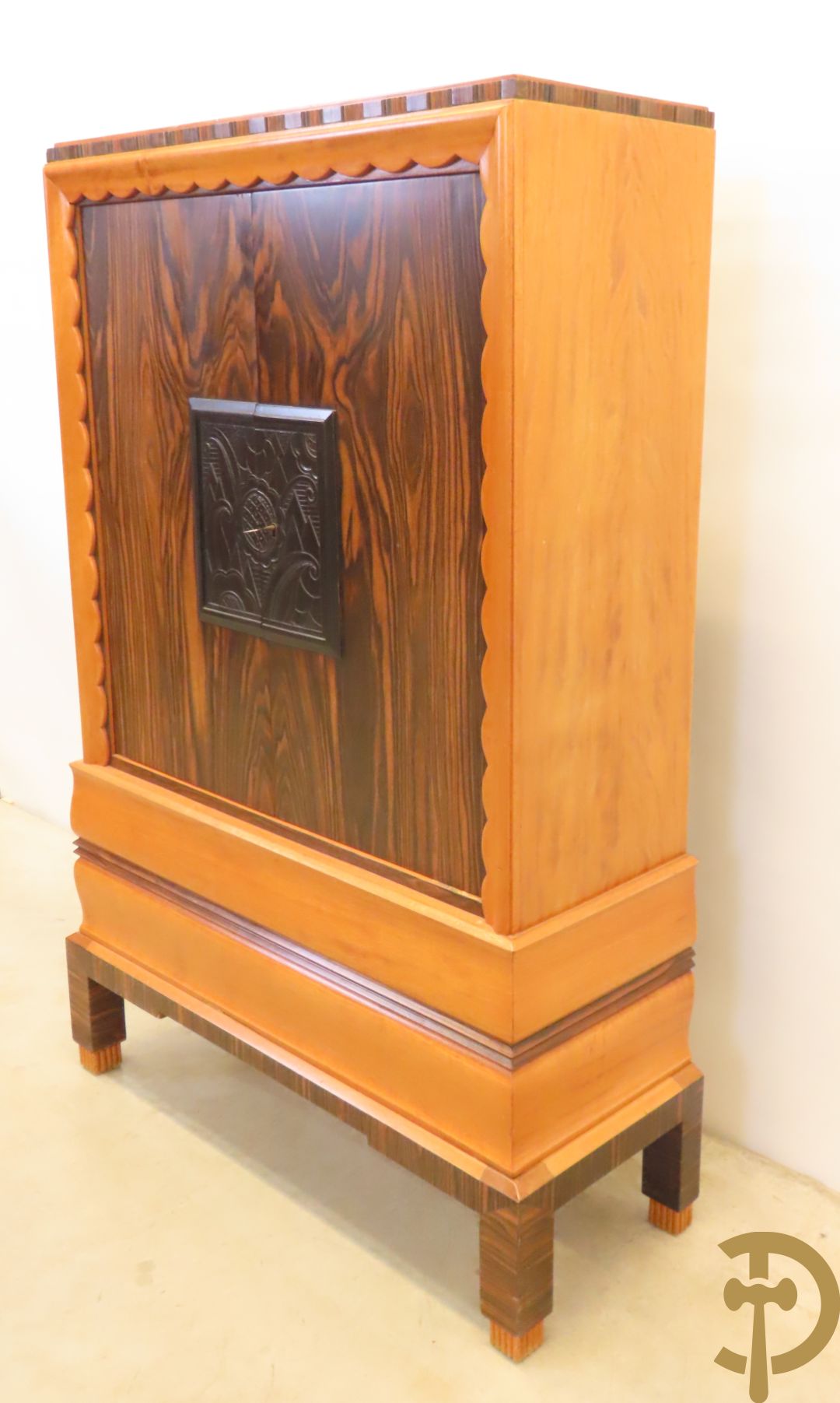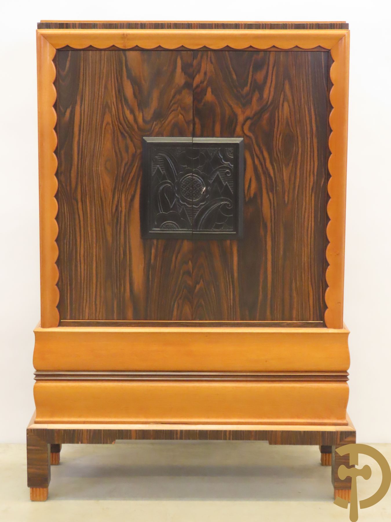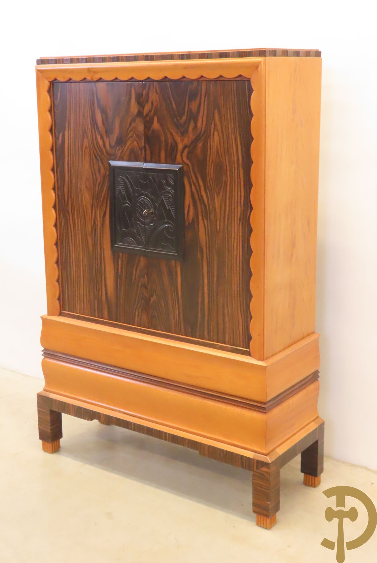 Citroenhouten Art Deco barmeubel Decoene met 2 deuren en bar achterliggend - middenin met gesculpteerd Art Deco paneel ontworpen door Noppe Karel, model Brillat