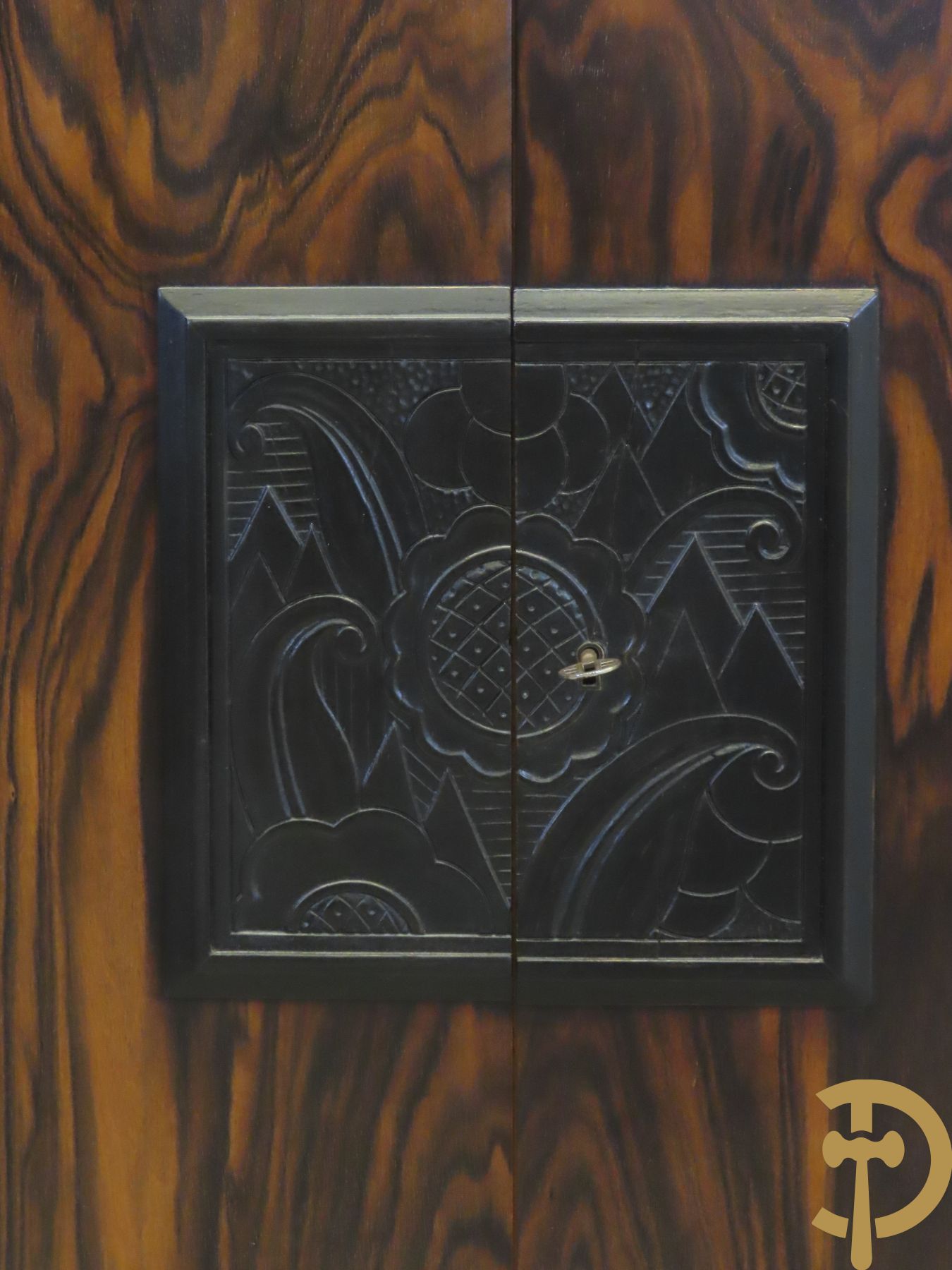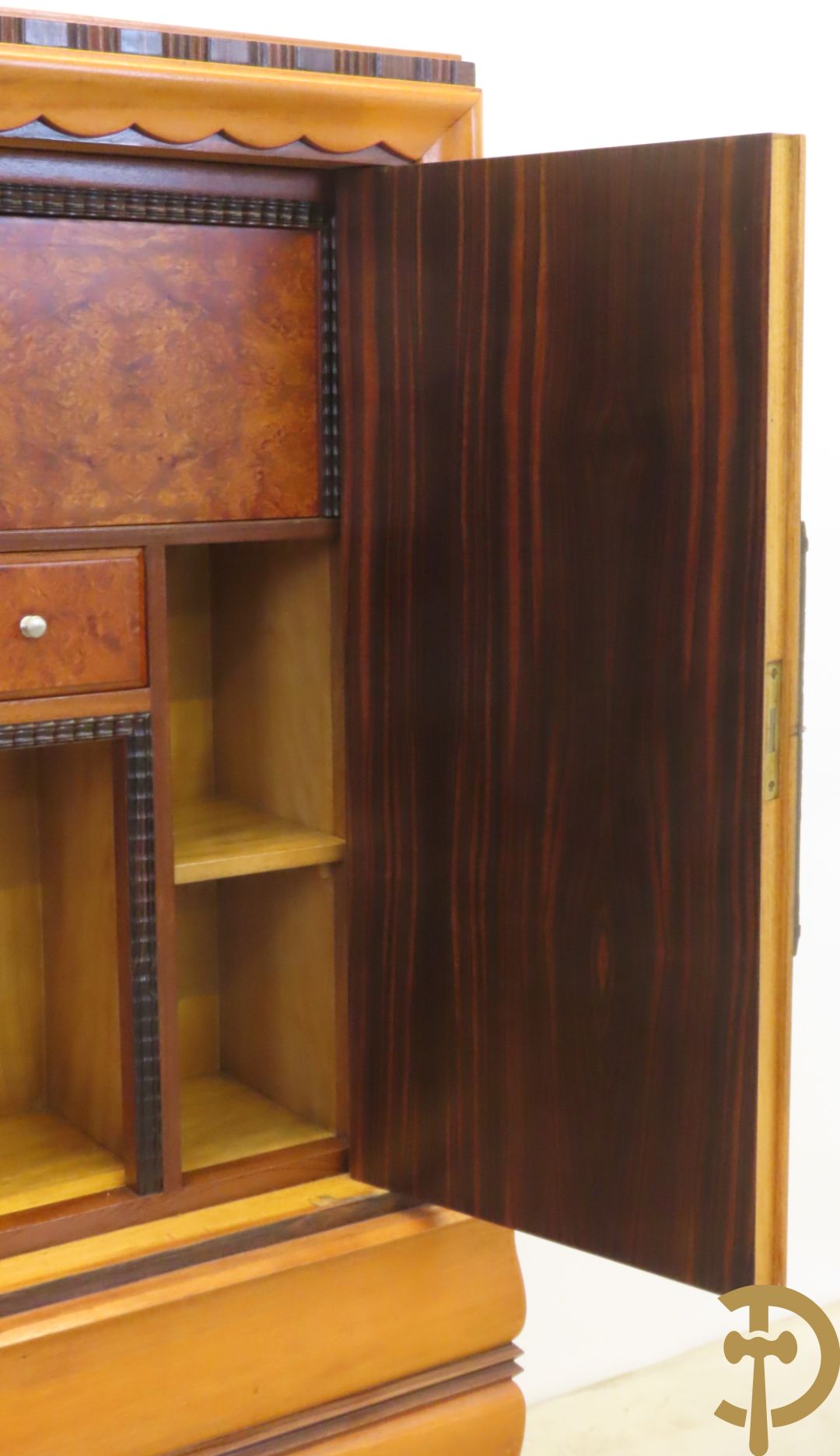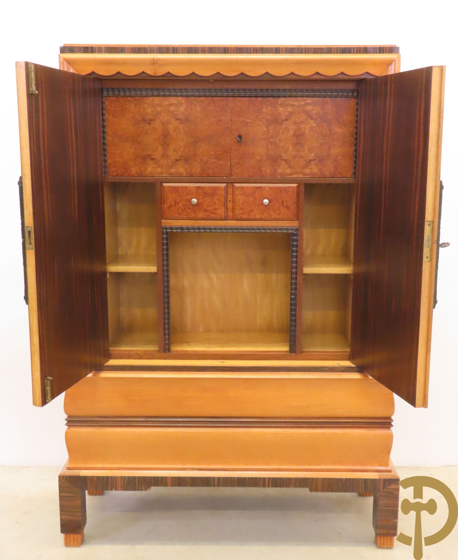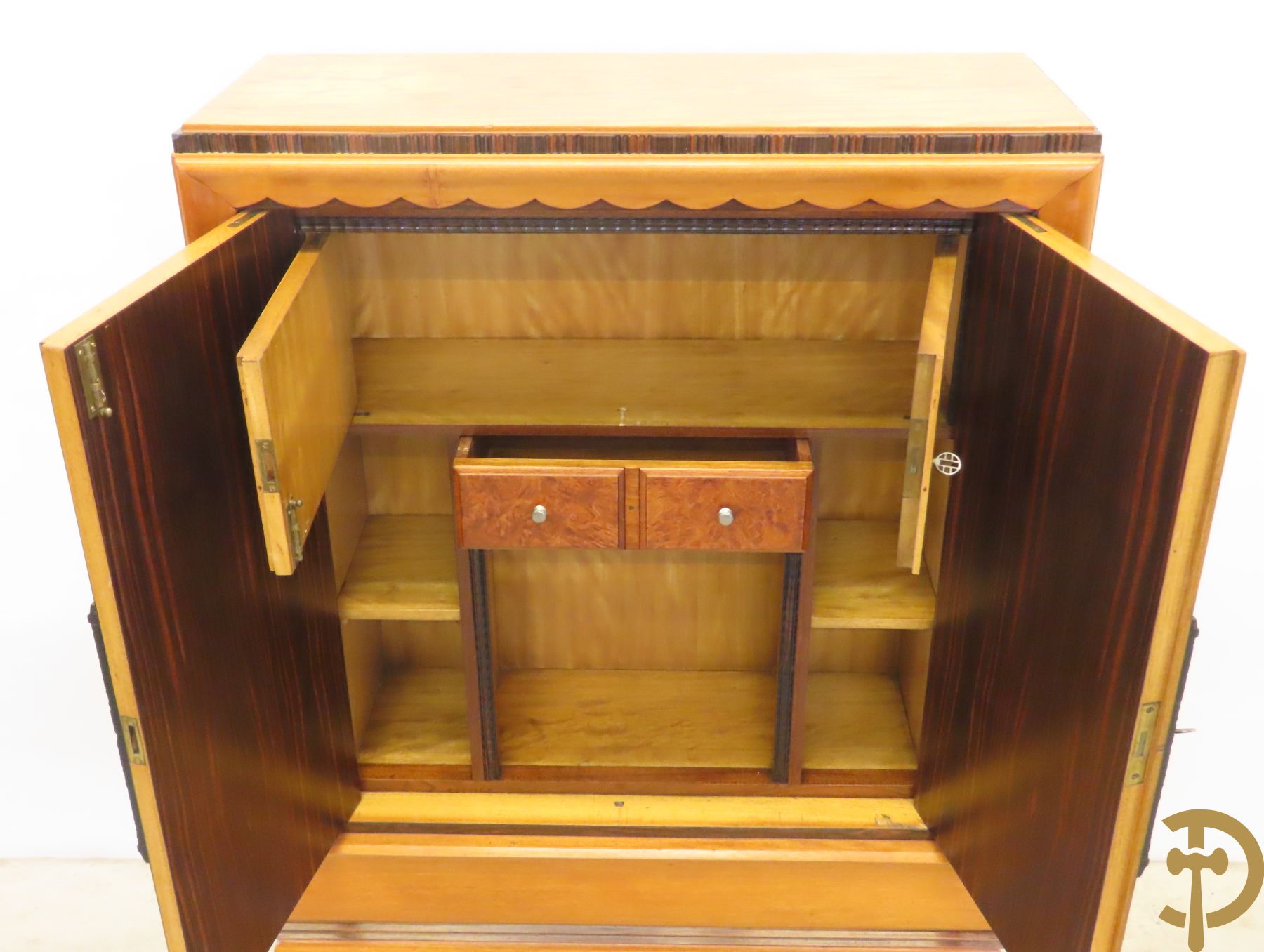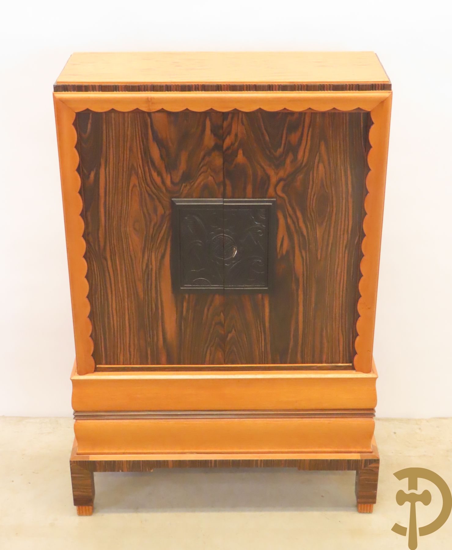 Citroenhouten Art Deco barmeubel Decoene met 2 deuren en bar achterliggend - middenin met gesculpteerd Art Deco paneel ontworpen door Noppe Karel, model Brillat