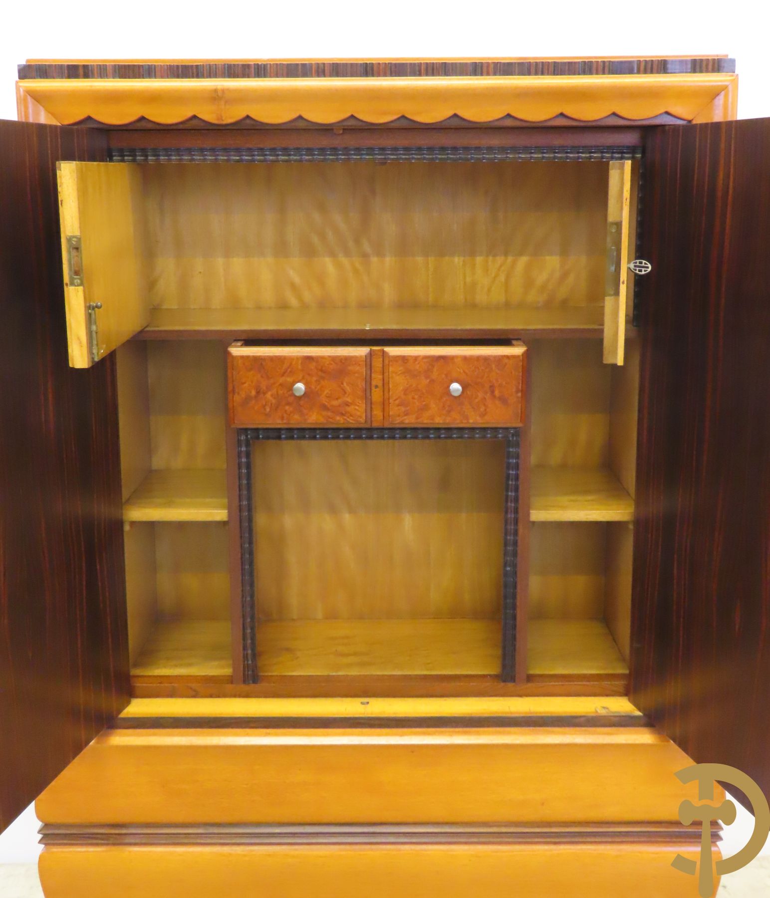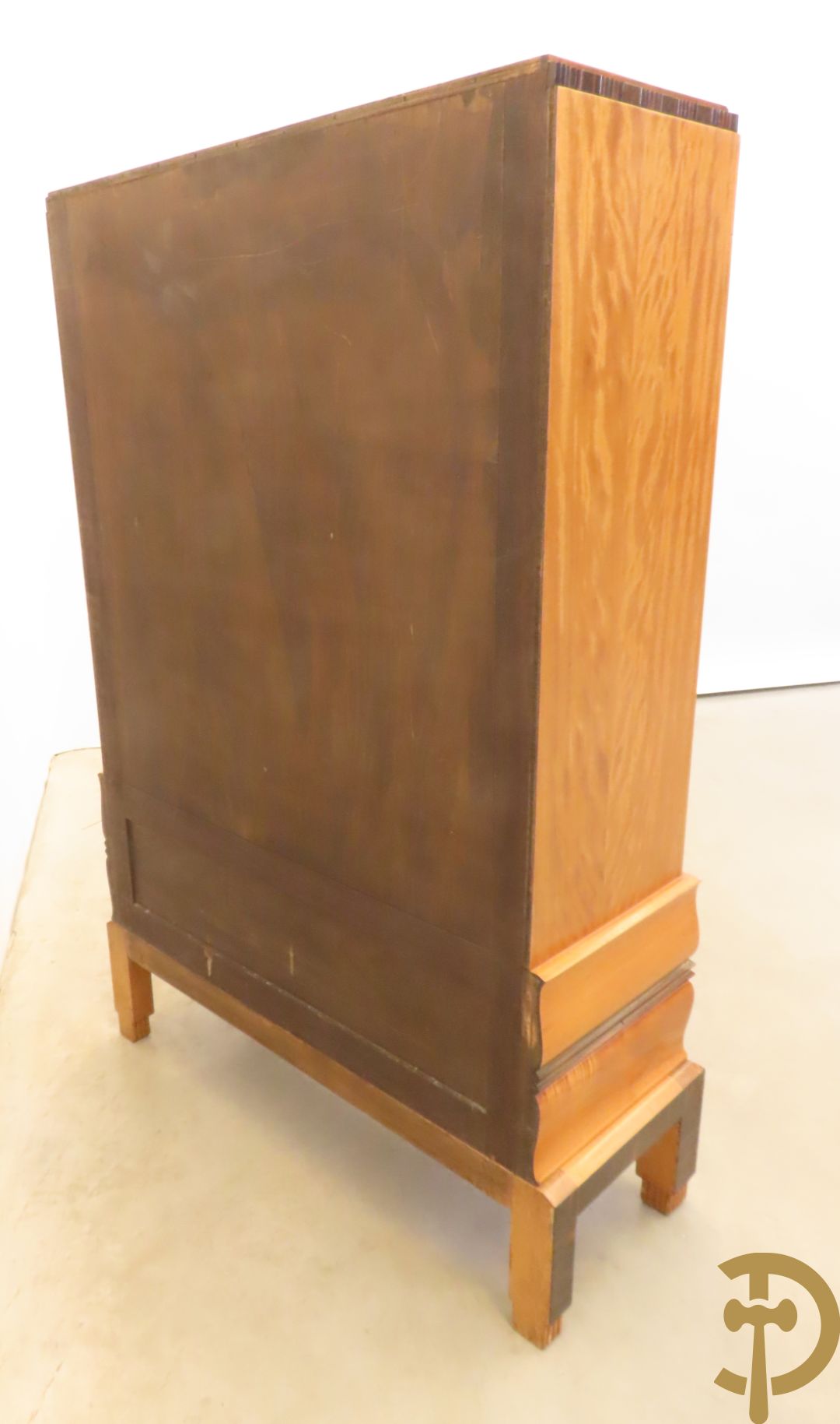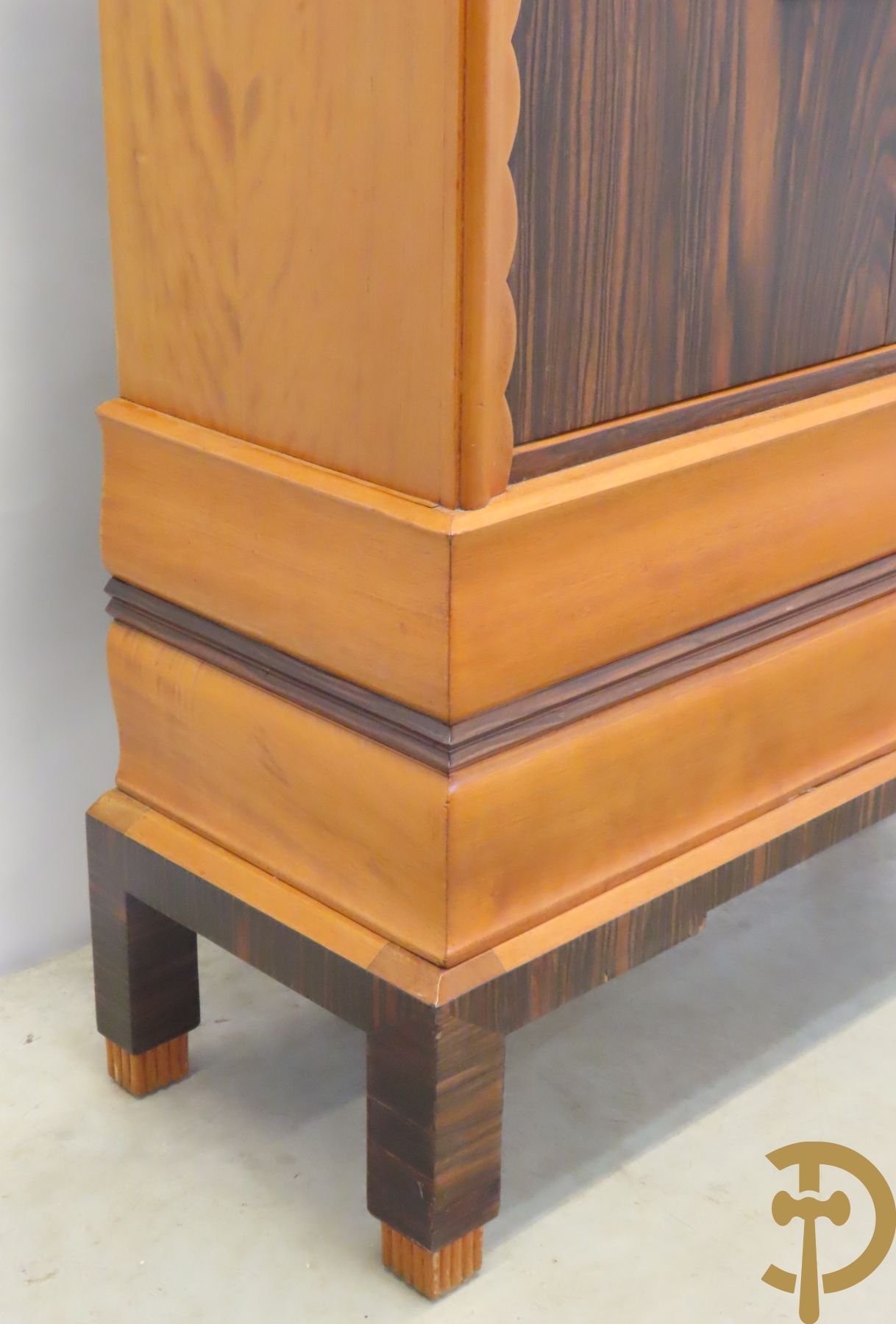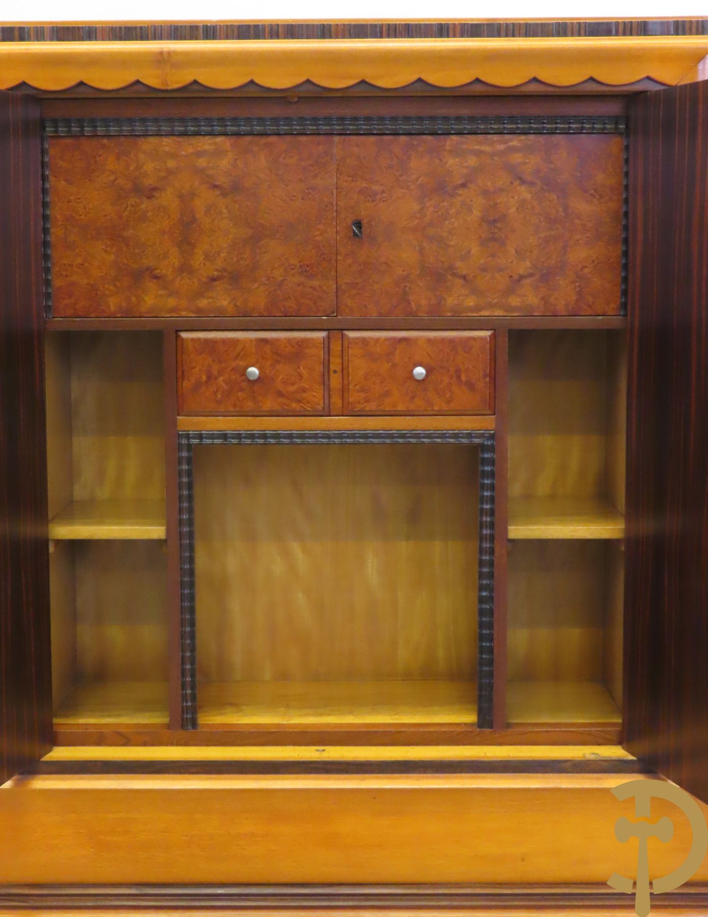 Citroenhouten Art Deco barmeubel Decoene met 2 deuren en bar achterliggend - middenin met gesculpteerd Art Deco paneel ontworpen door Noppe Karel, model Brillat