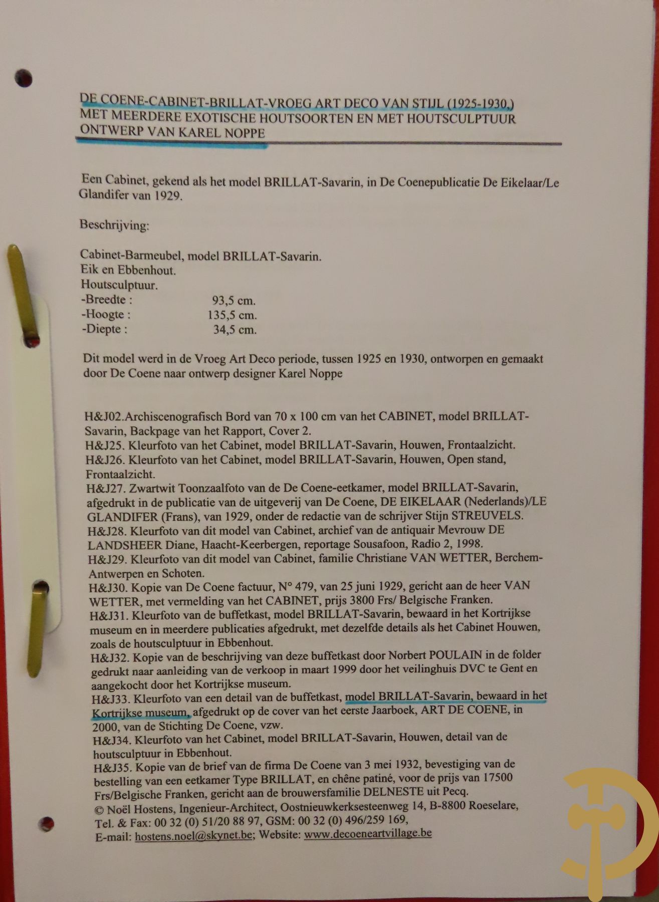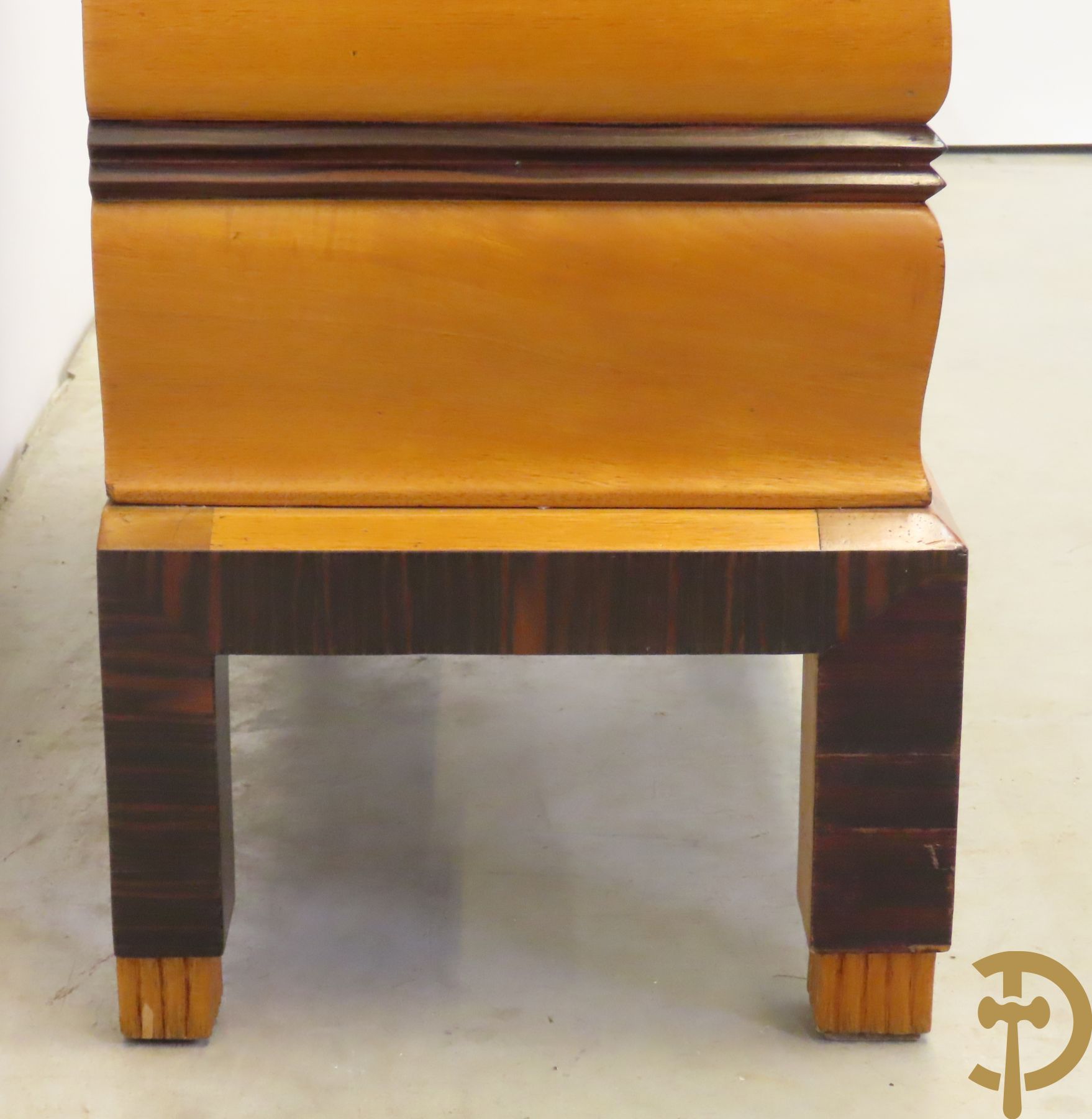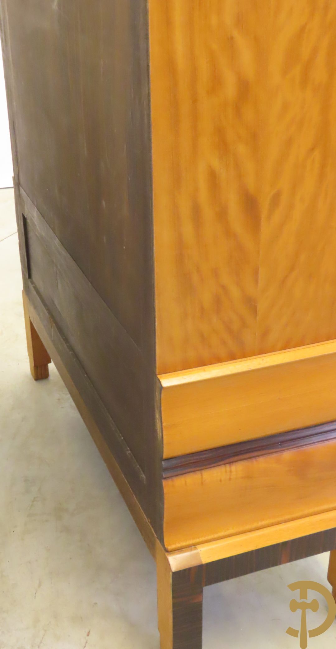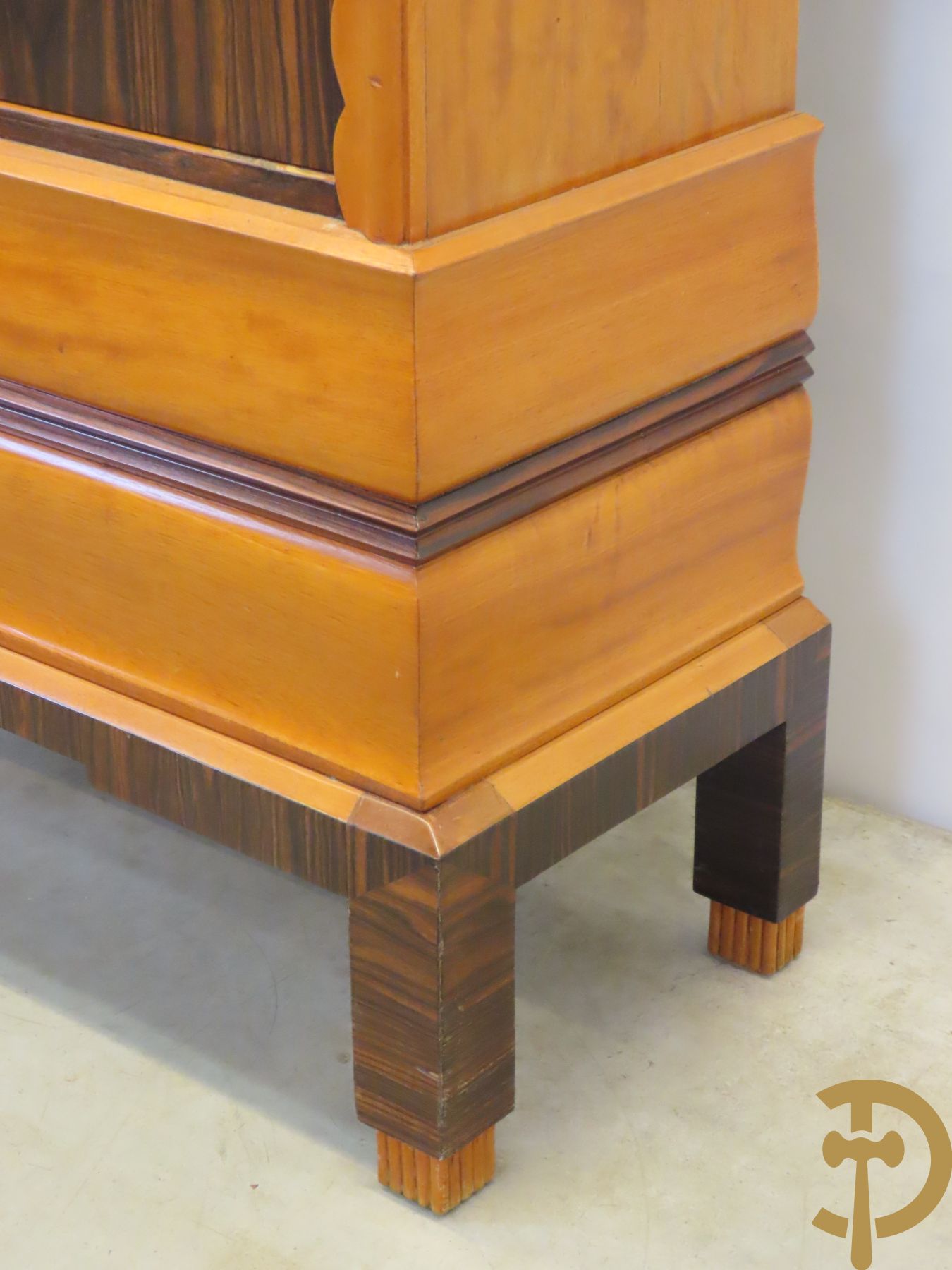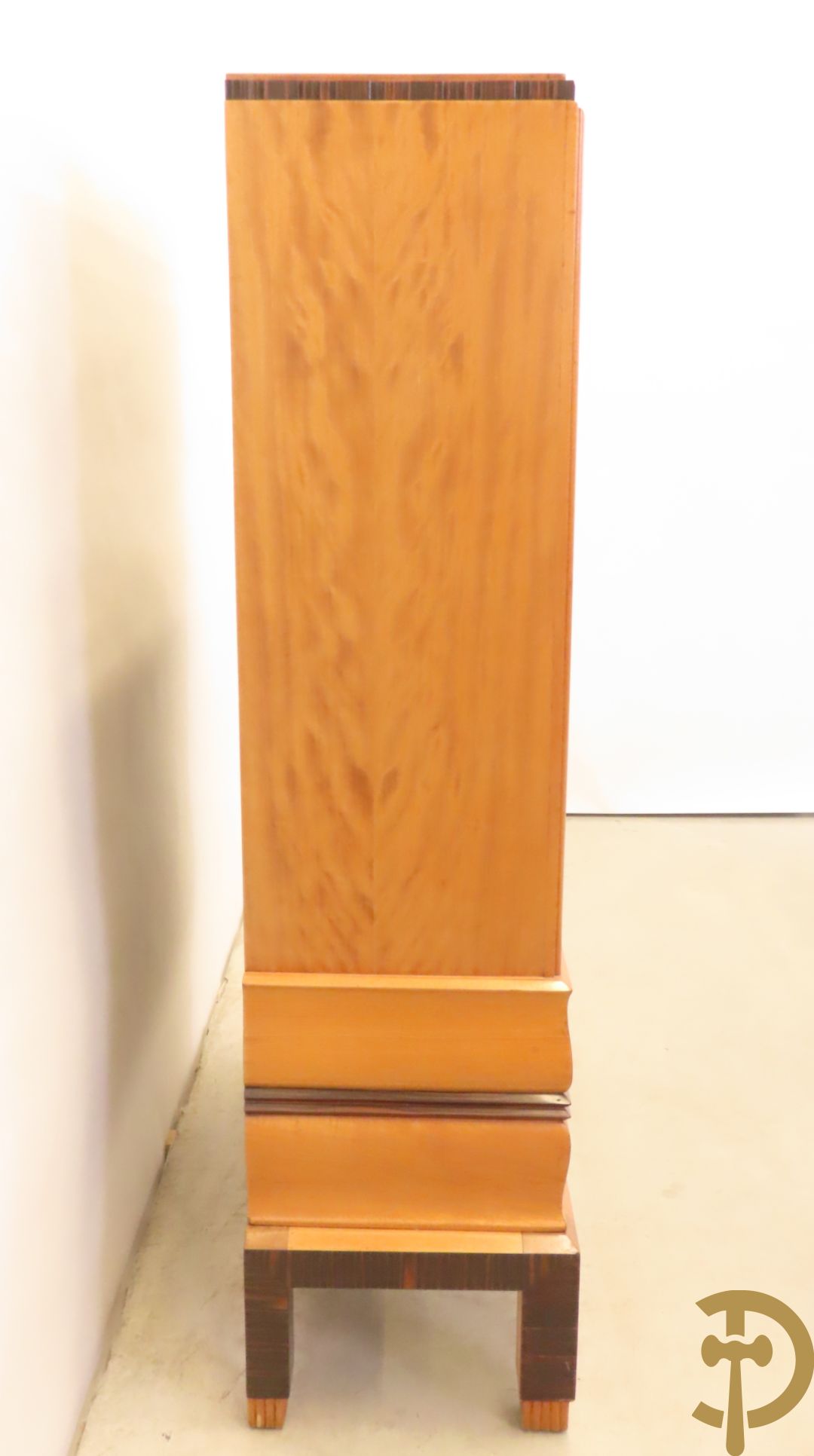 Citroenhouten Art Deco barmeubel Decoene met 2 deuren en bar achterliggend - middenin met gesculpteerd Art Deco paneel ontworpen door Noppe Karel, model Brillat