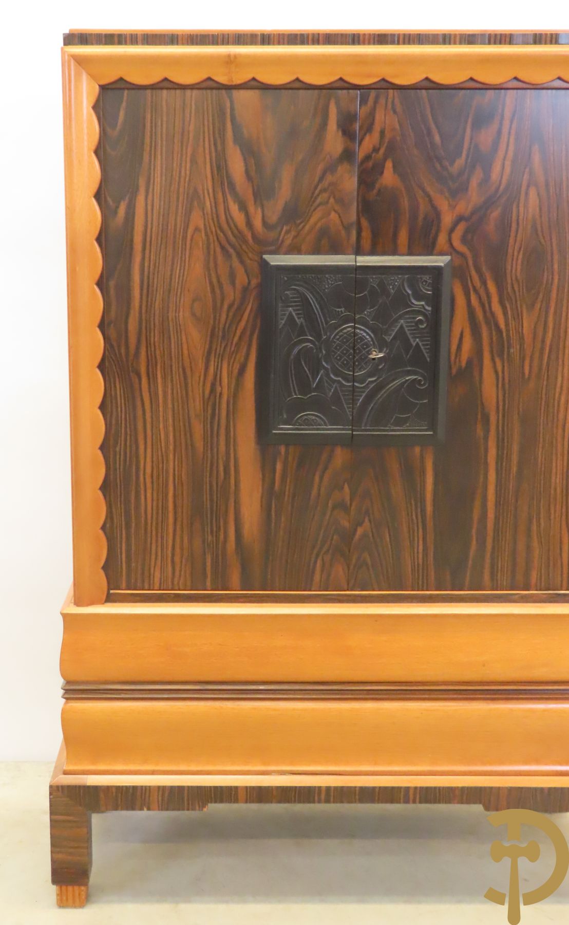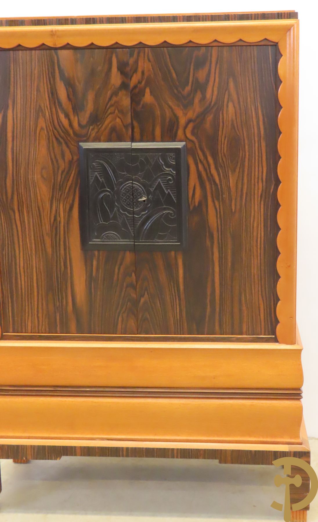 LOT 614 - Citroenhouten Art Deco barmeubel Decoene met 2 deuren en bar achterliggend - middenin met gesculpteerd Art Deco paneel ontworpen door Noppe Karel, model Brillat