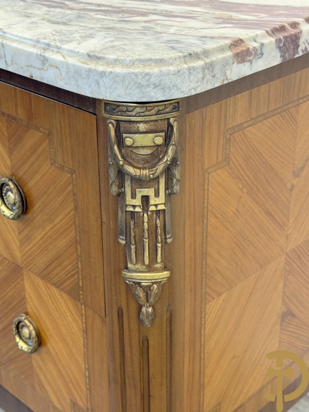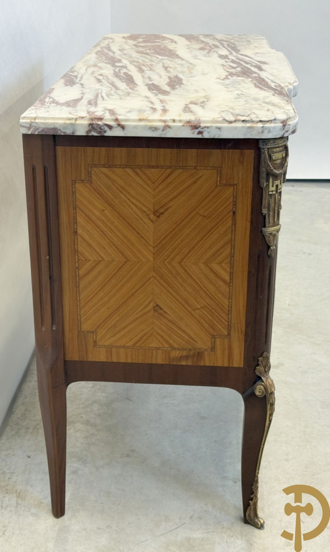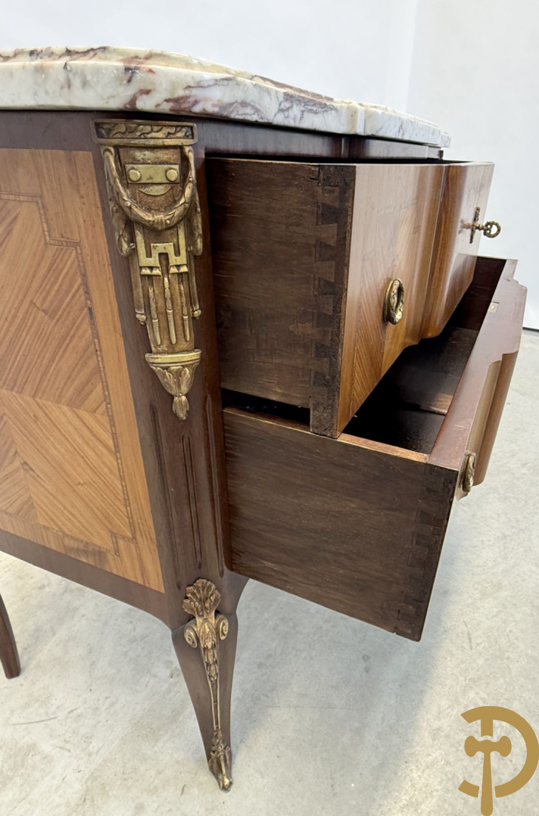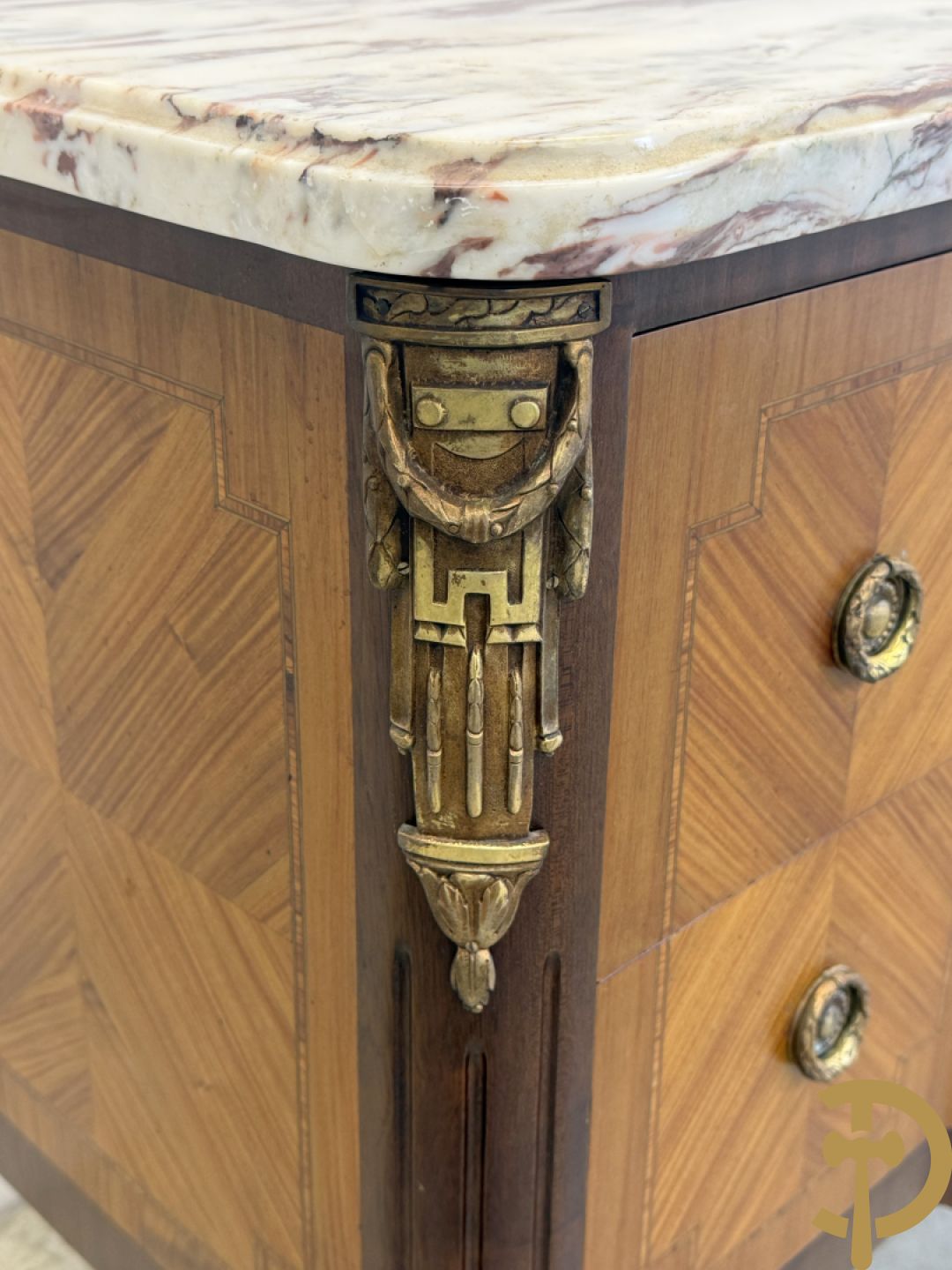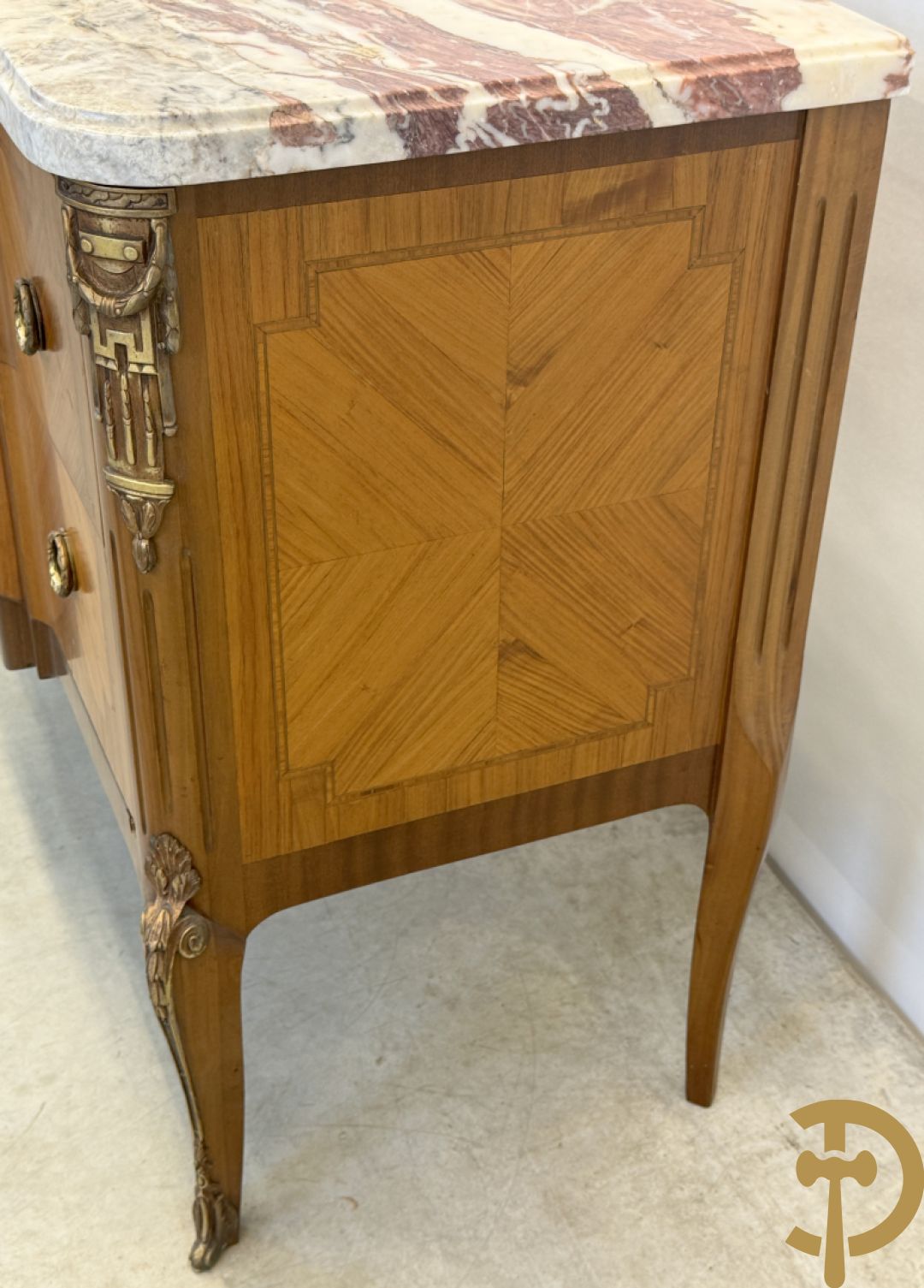 Notelaren tweeladen commode Louis XVI met bronsbeslag en marmeren blad op voluutvormige poten