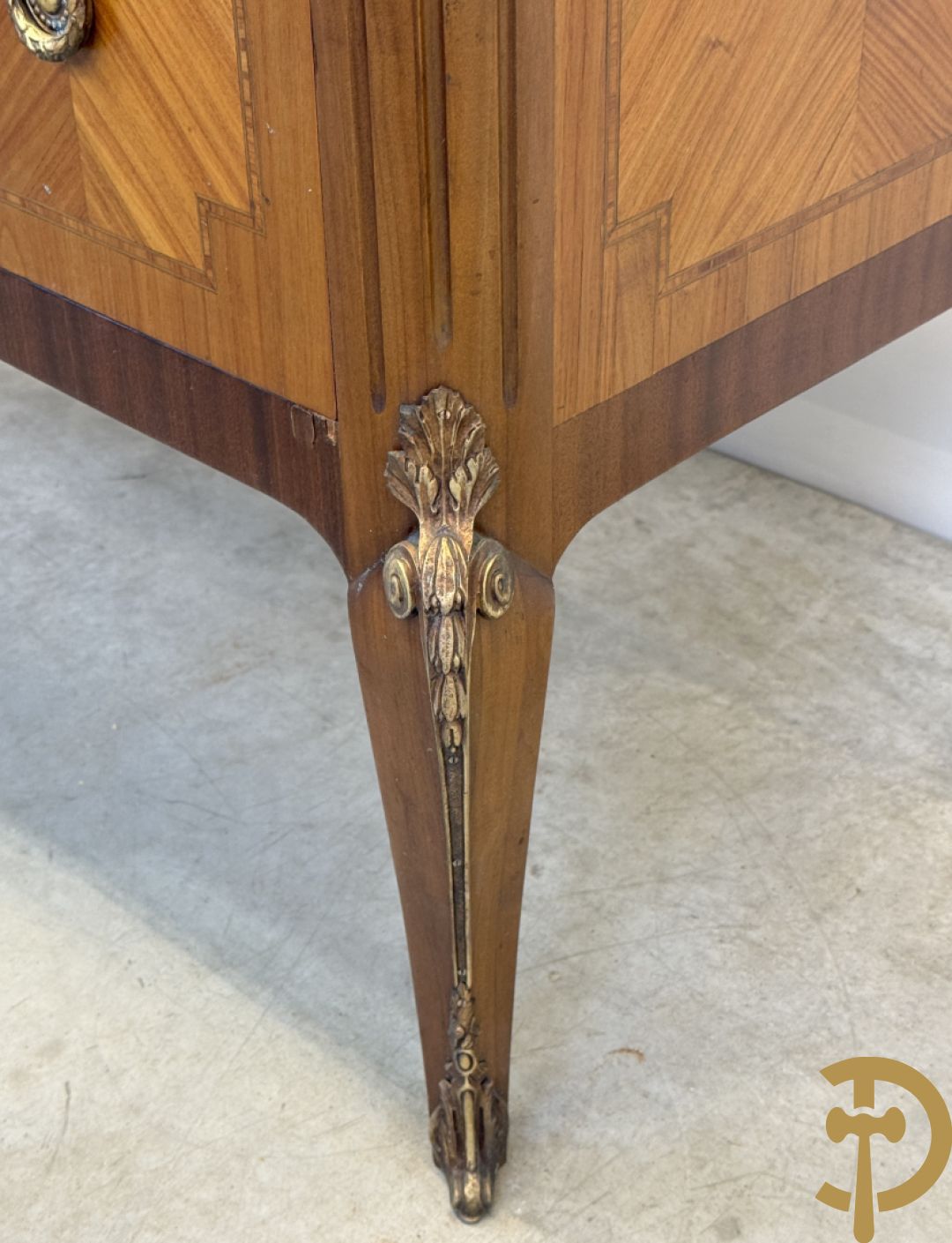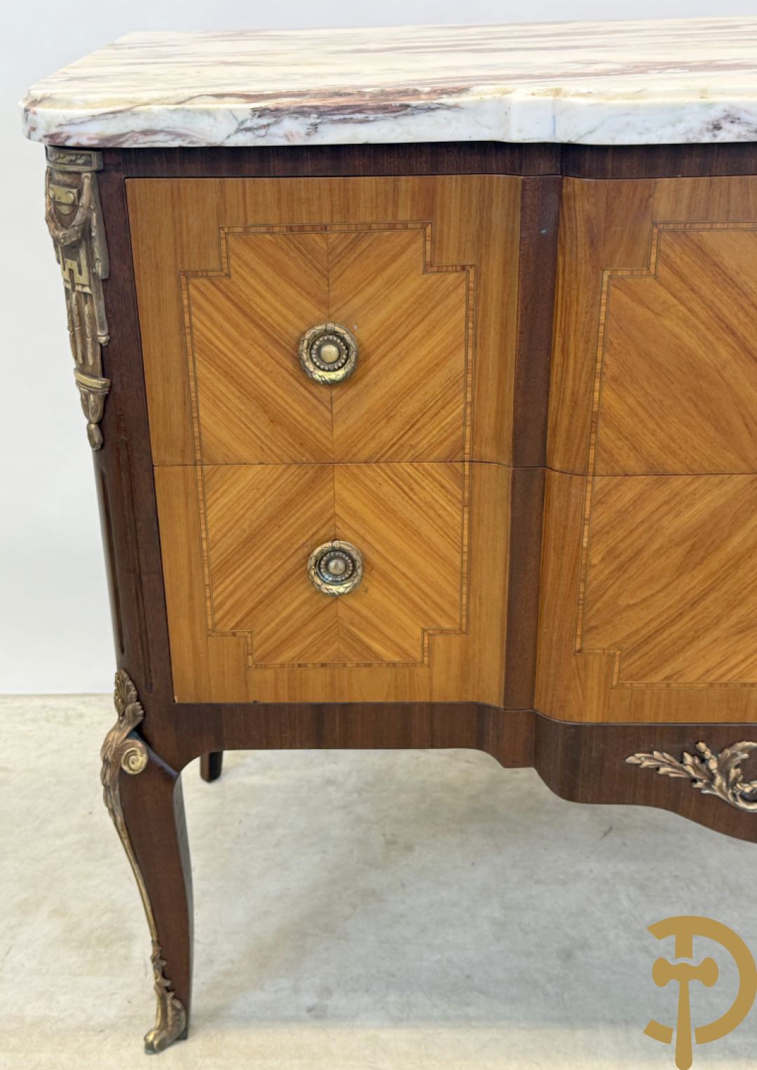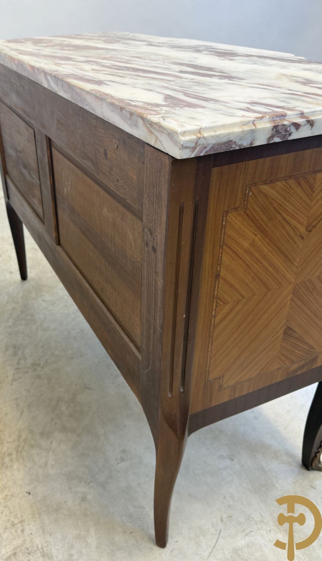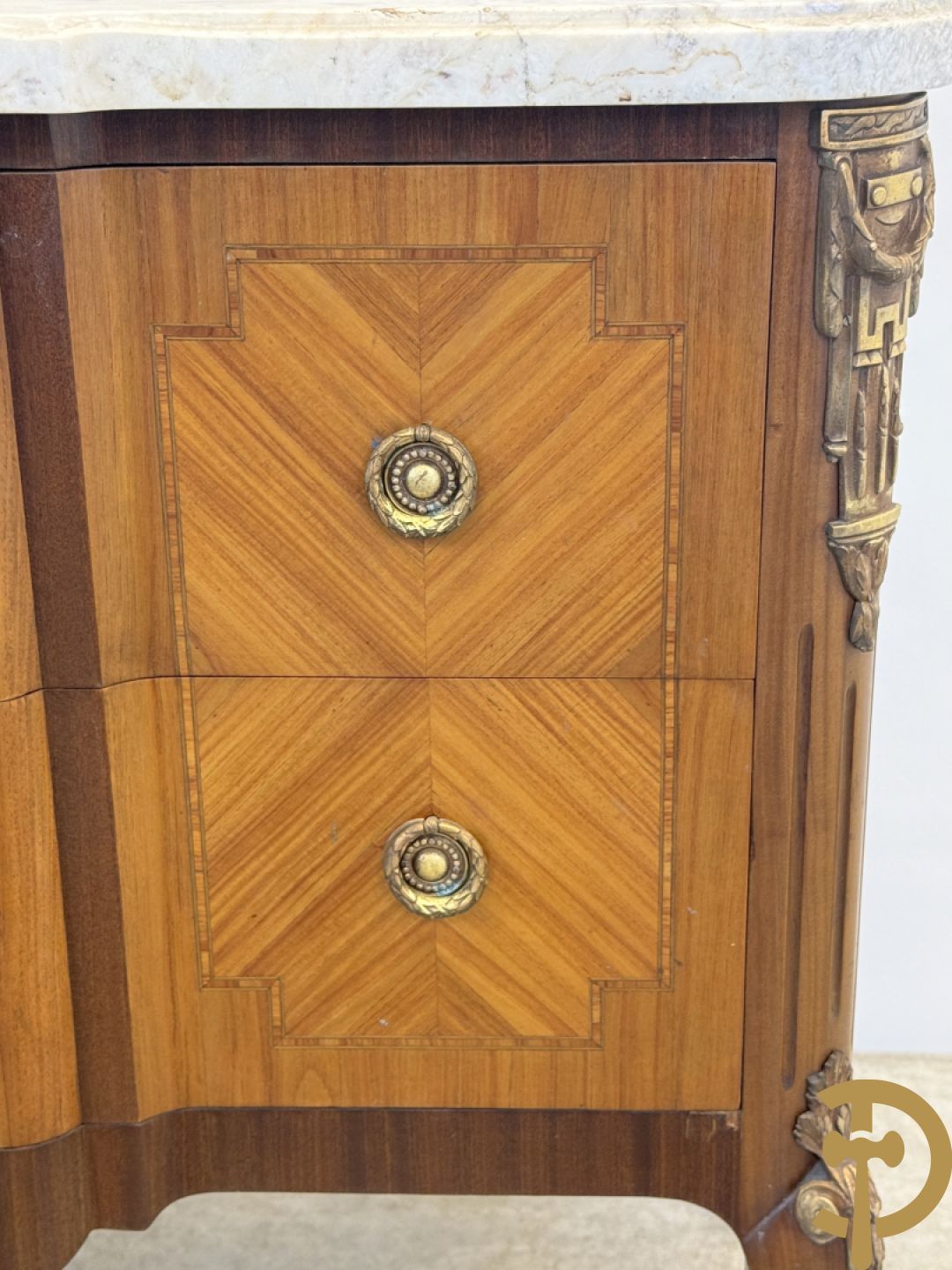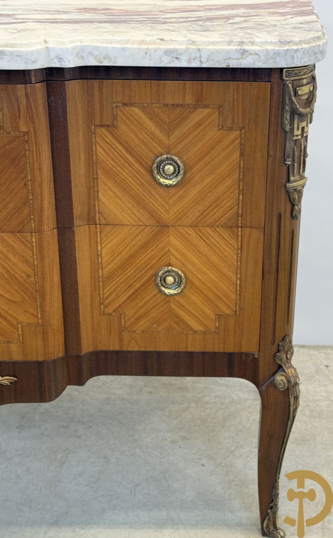 Notelaren tweeladen commode Louis XVI met bronsbeslag en marmeren blad op voluutvormige poten