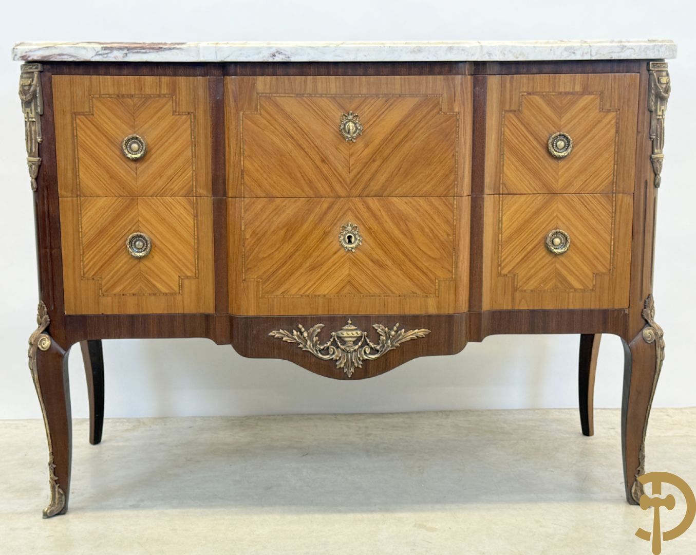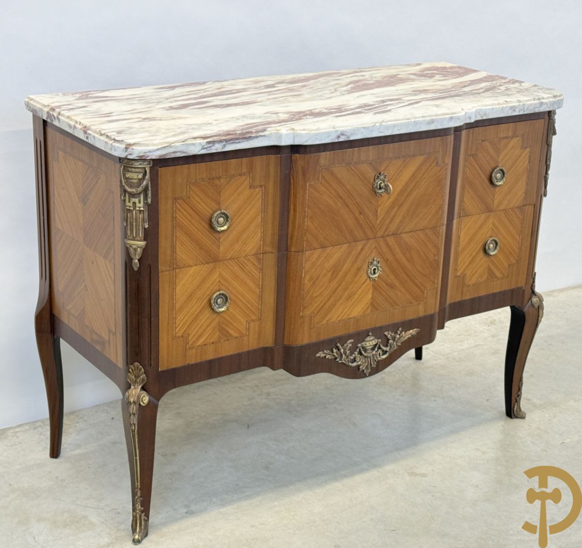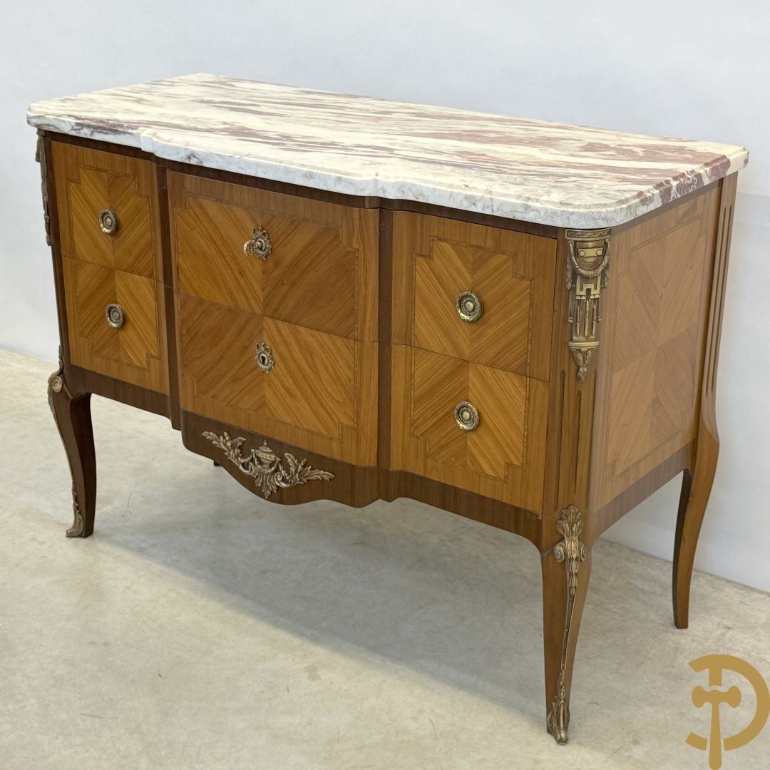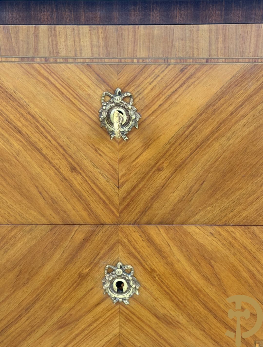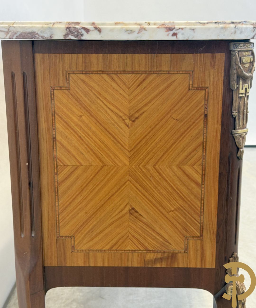 Notelaren tweeladen commode Louis XVI met bronsbeslag en marmeren blad op voluutvormige poten