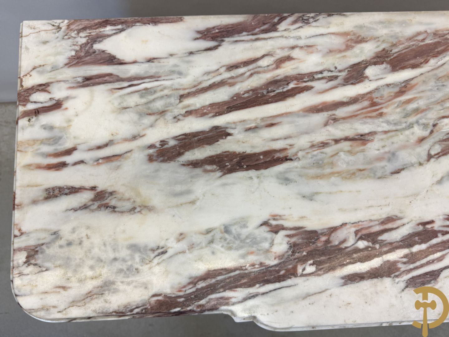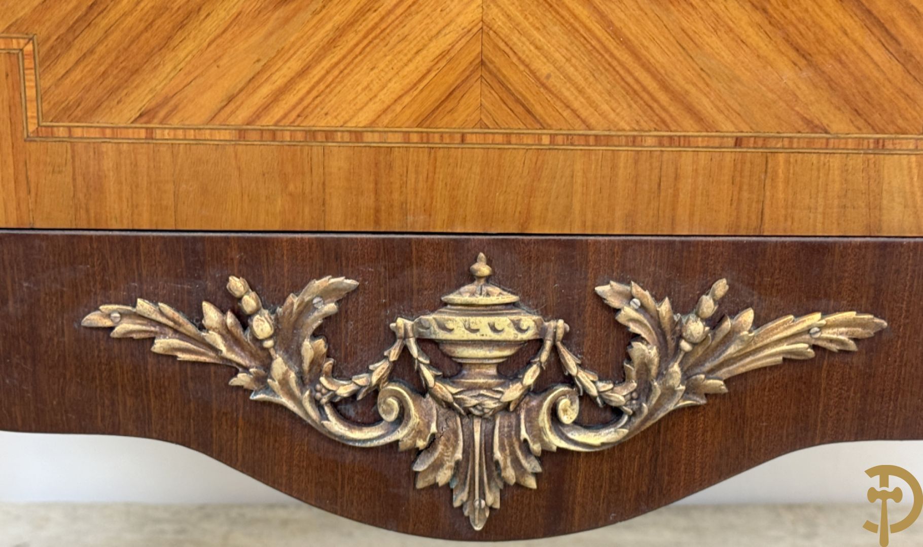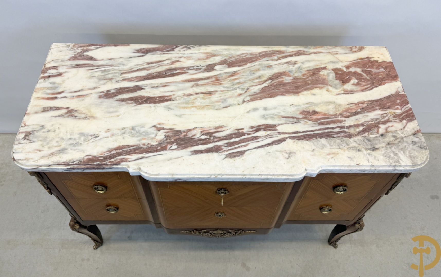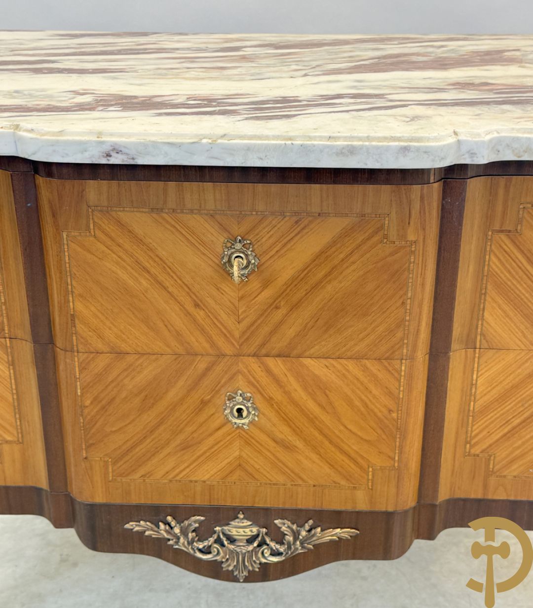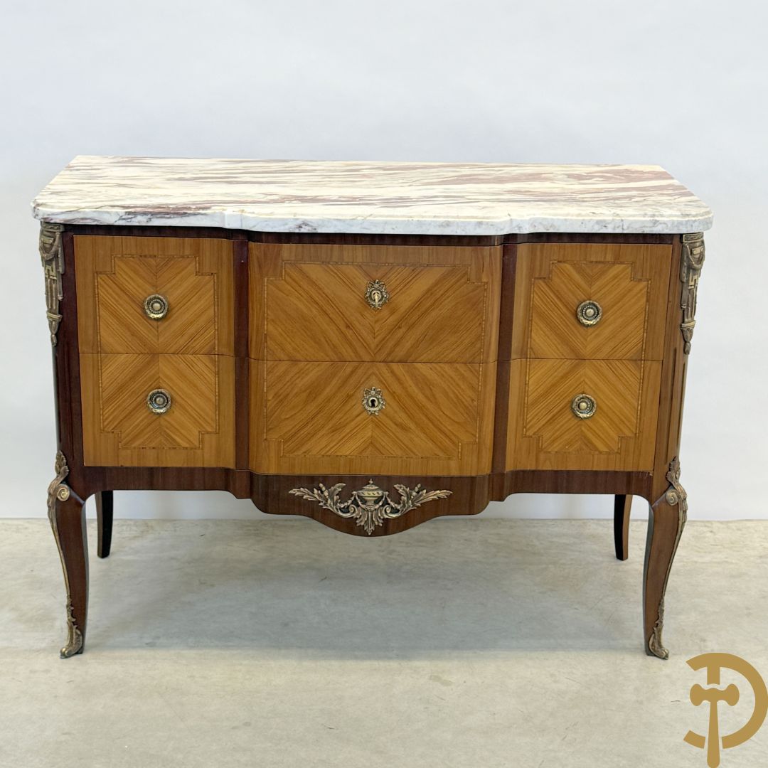 Notelaren tweeladen commode Louis XVI met bronsbeslag en marmeren blad op voluutvormige poten