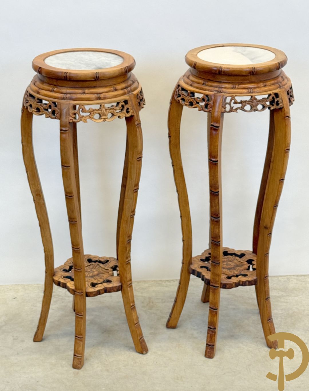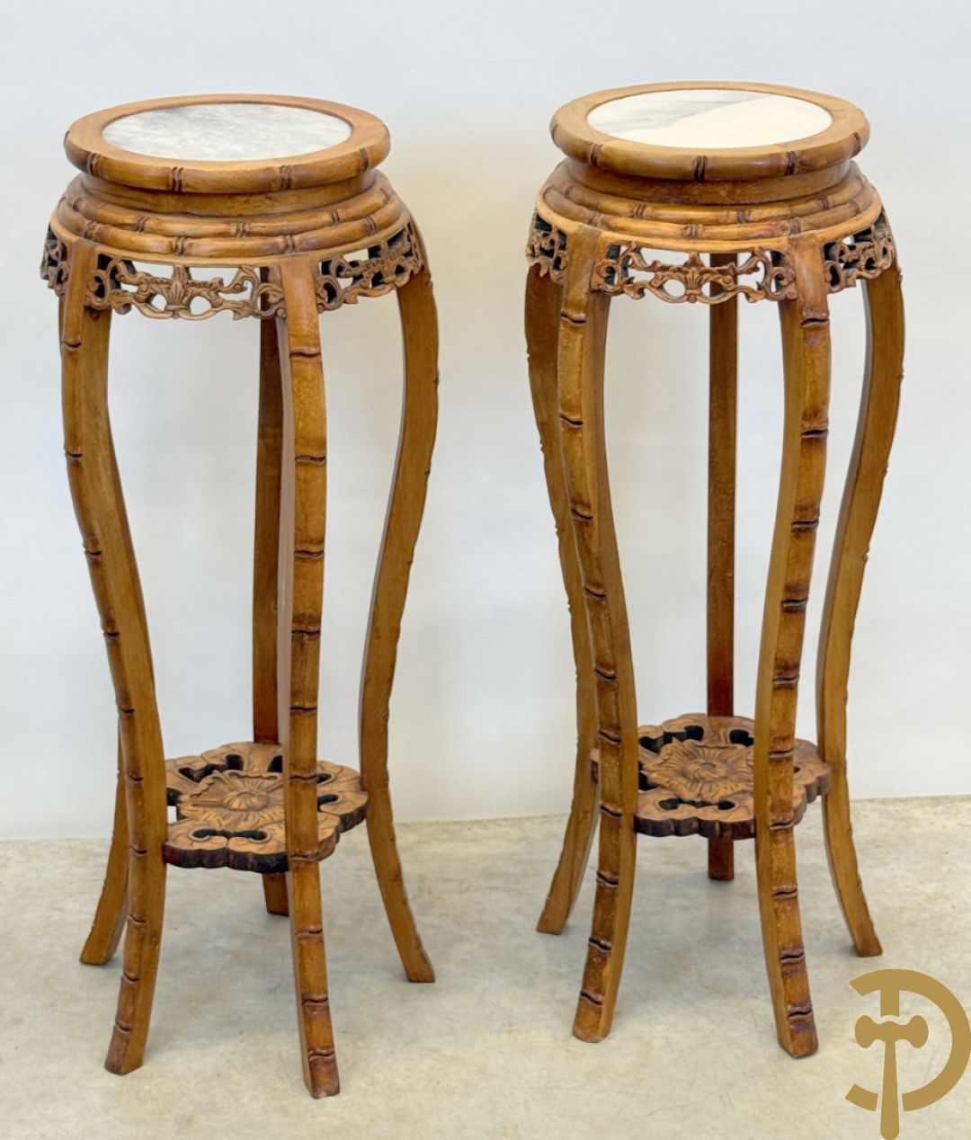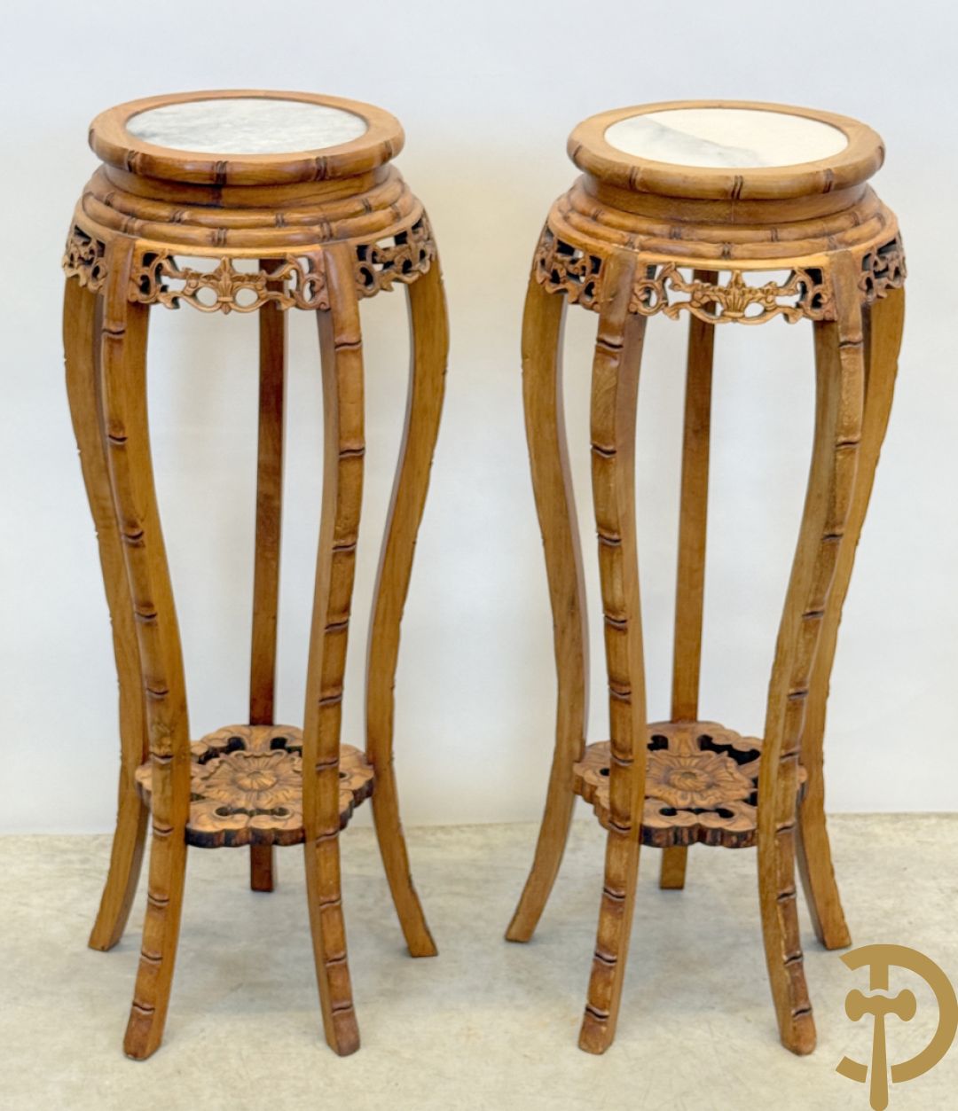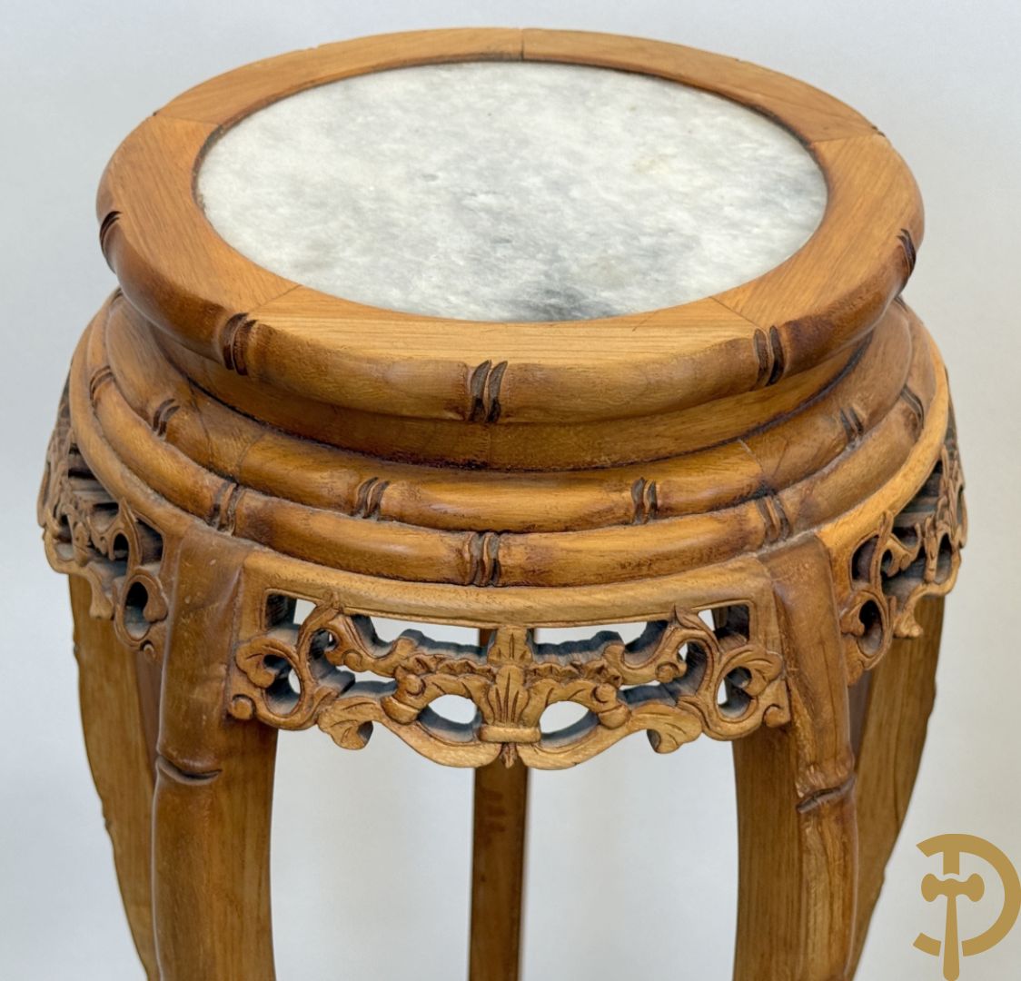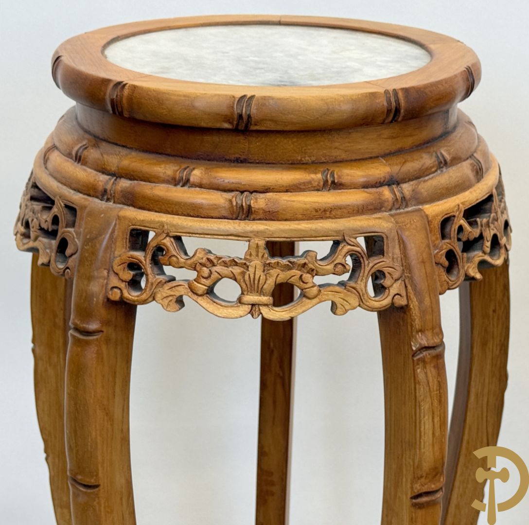 Paar Chinese sokkels met bloemensculptuur
