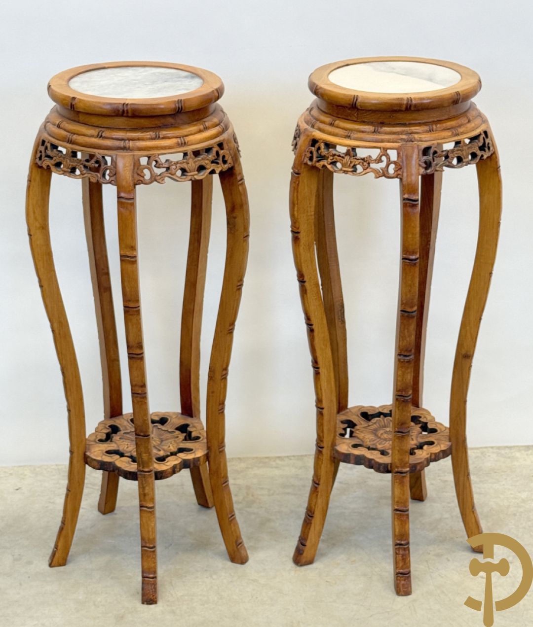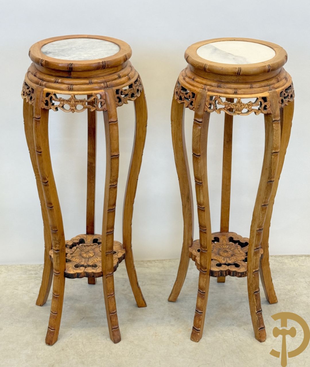LOT 601 - Paar Chinese sokkels met bloemensculptuur
