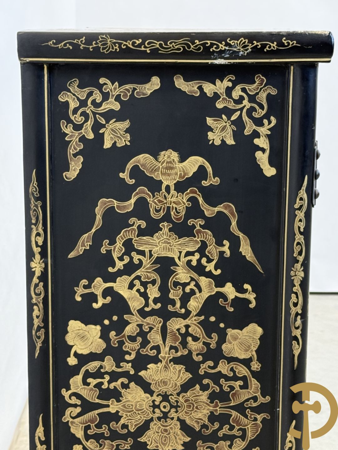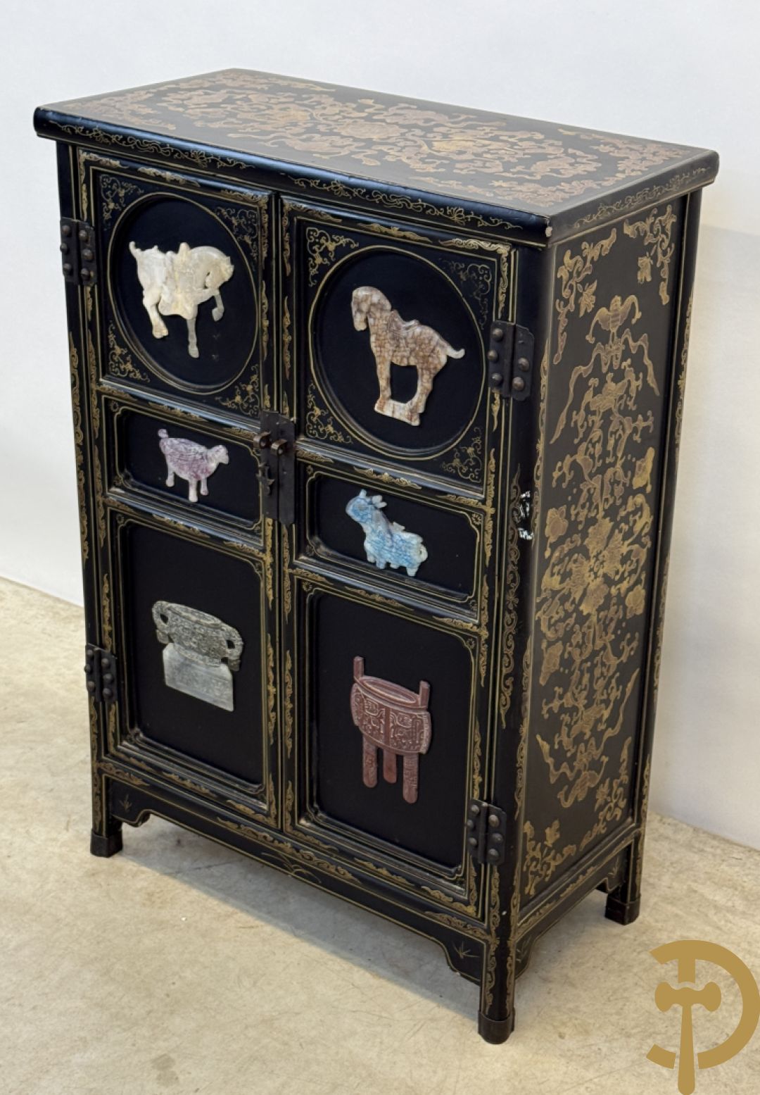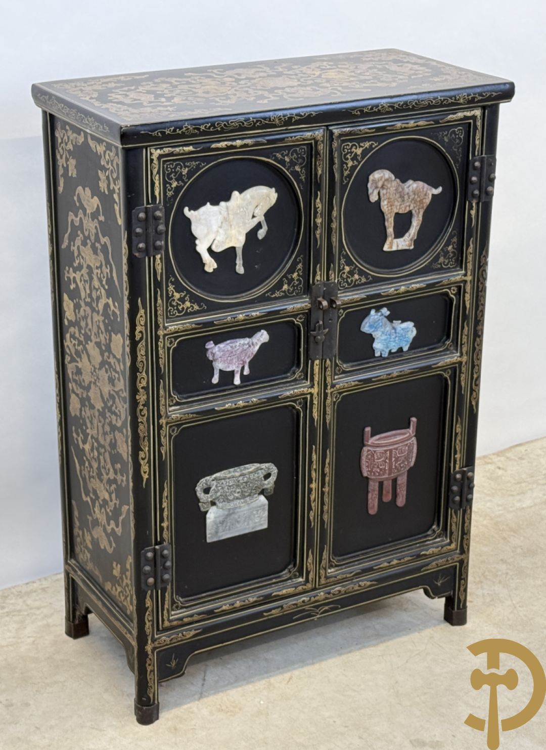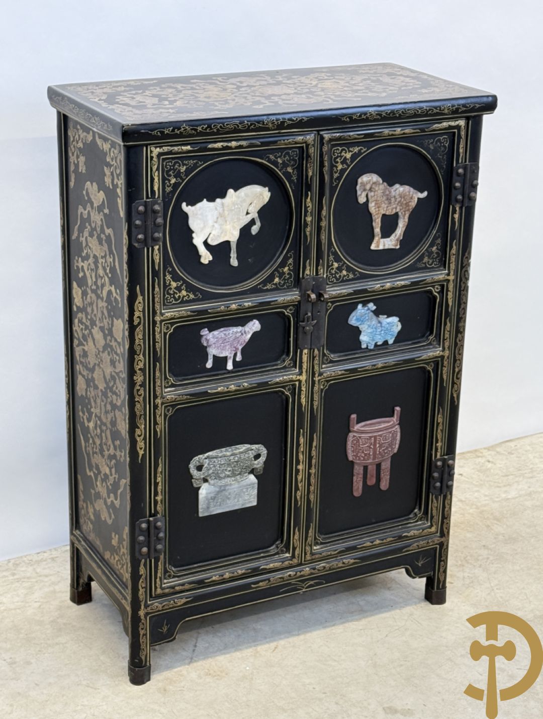 Zwartgelakt Chinees bijzetkastje met 2 deuren en bezet met dierenmotieven en verguld decor