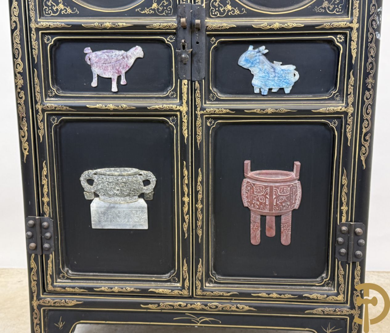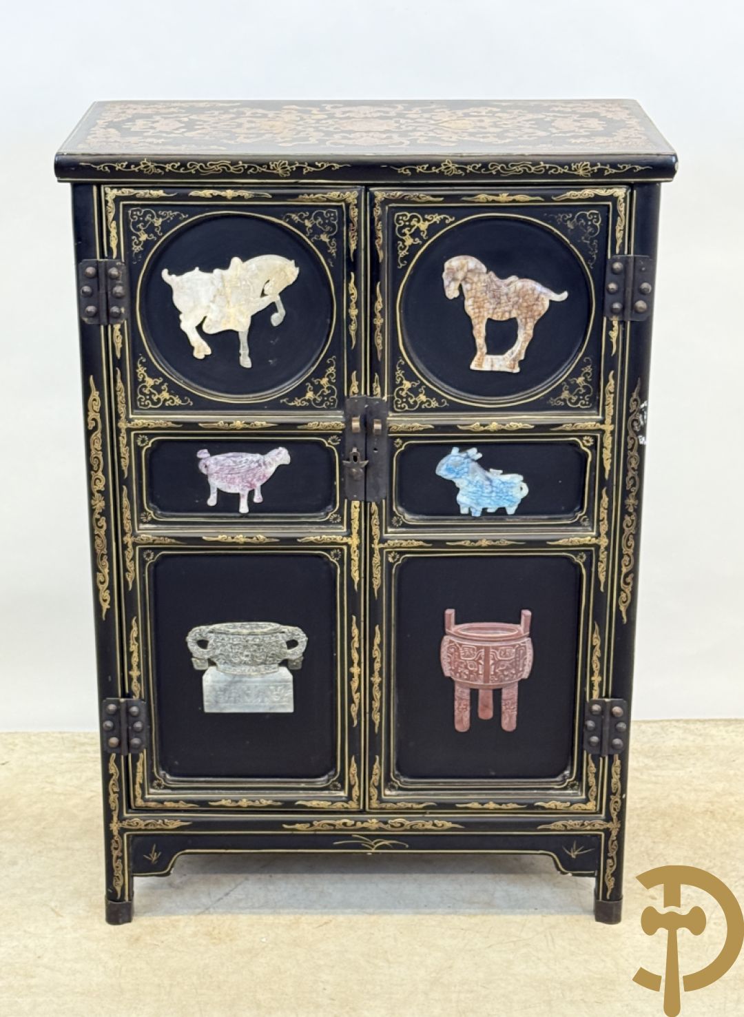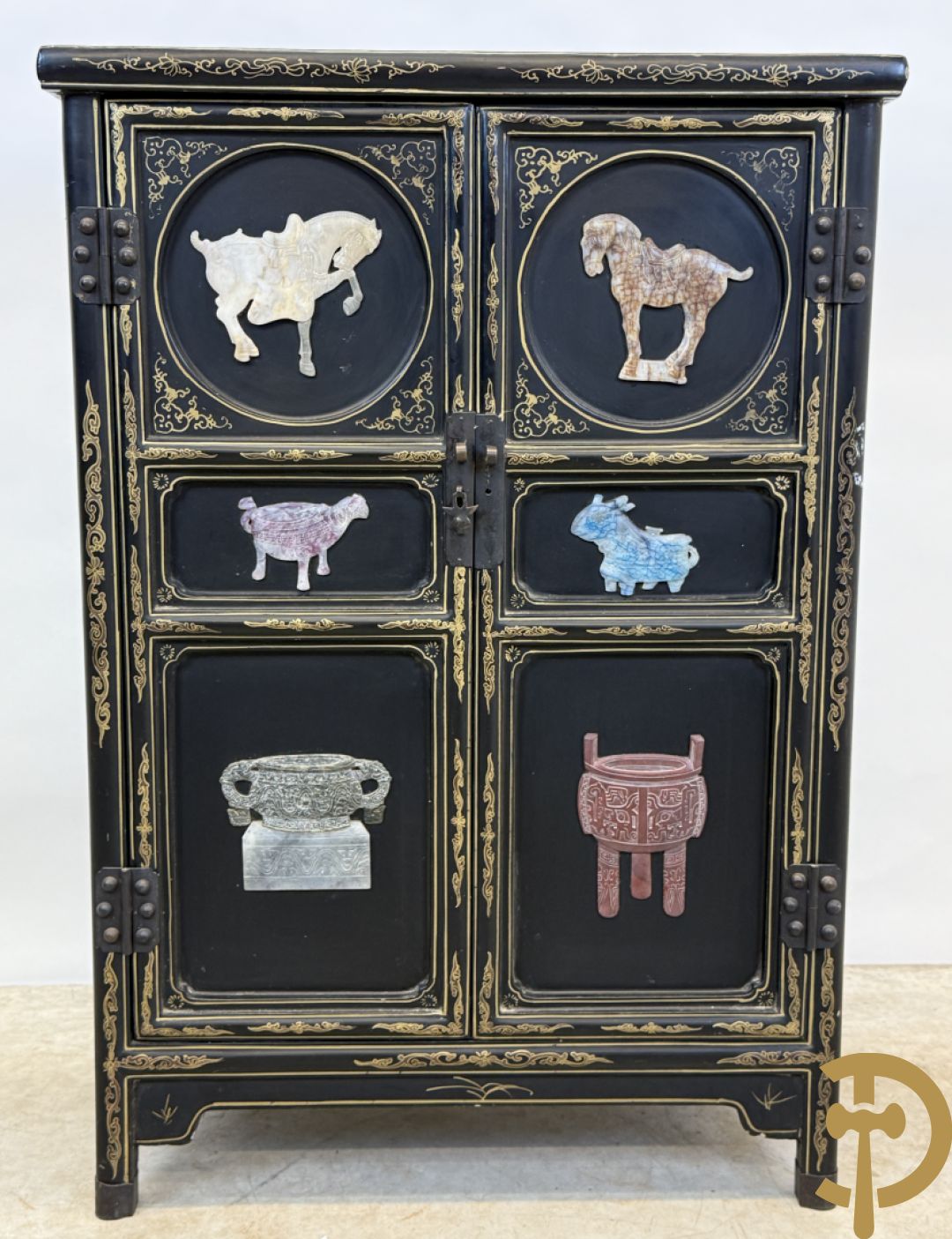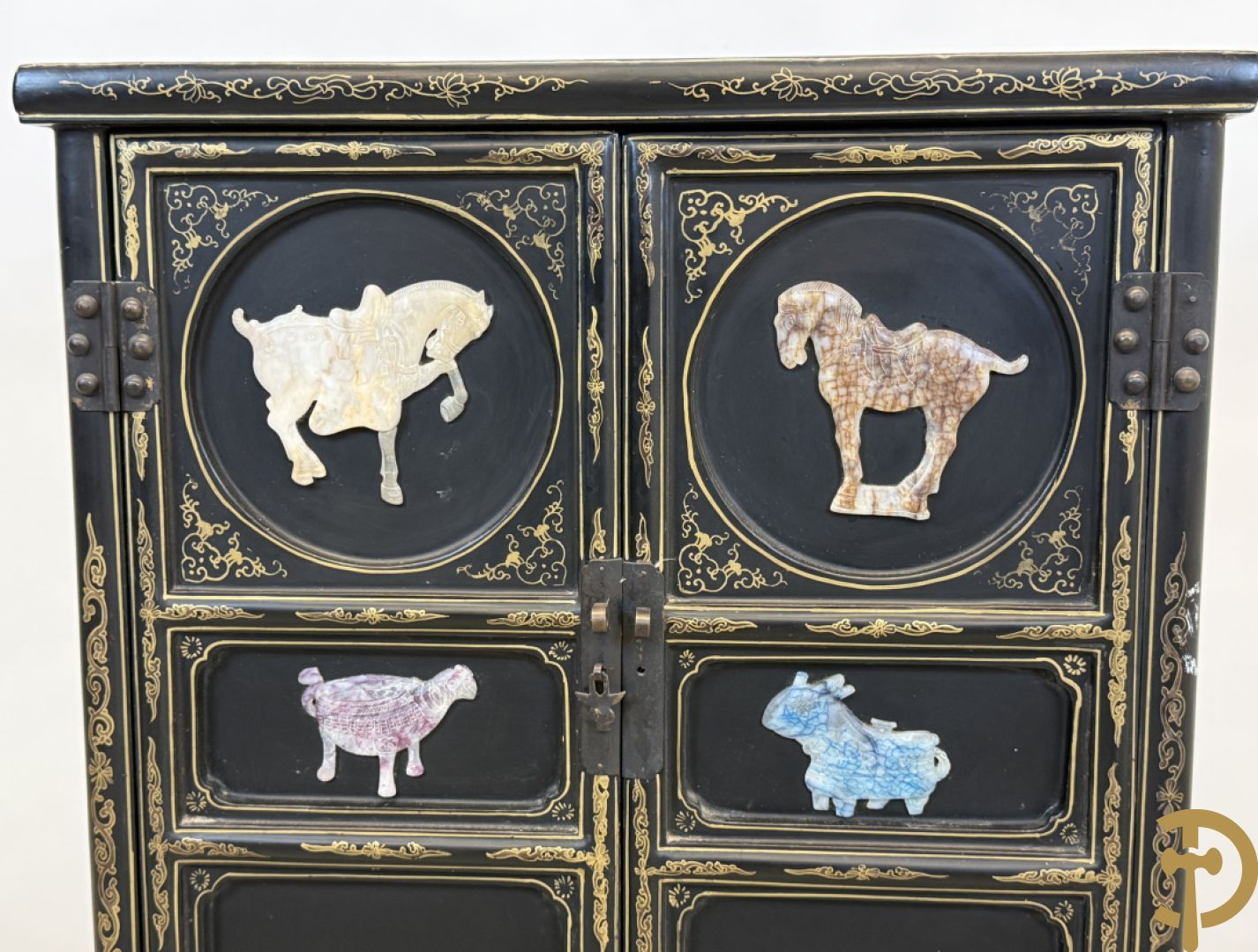 Zwartgelakt Chinees bijzetkastje met 2 deuren en bezet met dierenmotieven en verguld decor