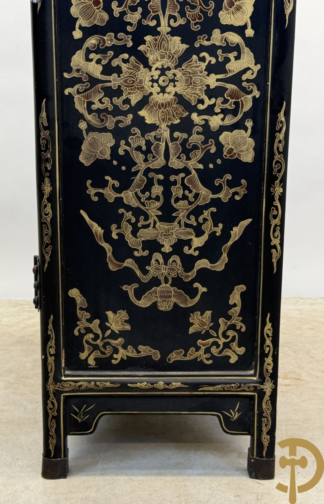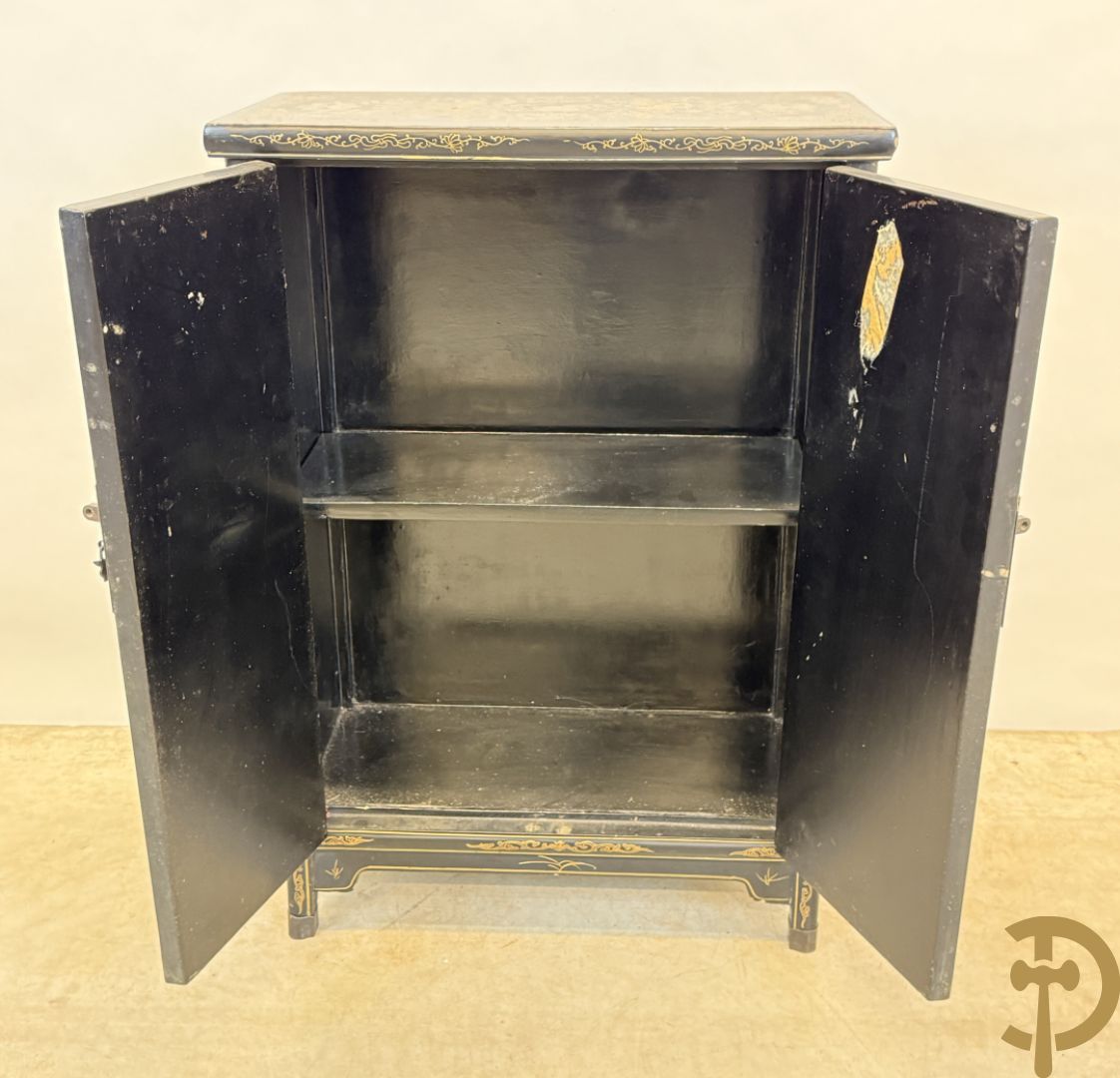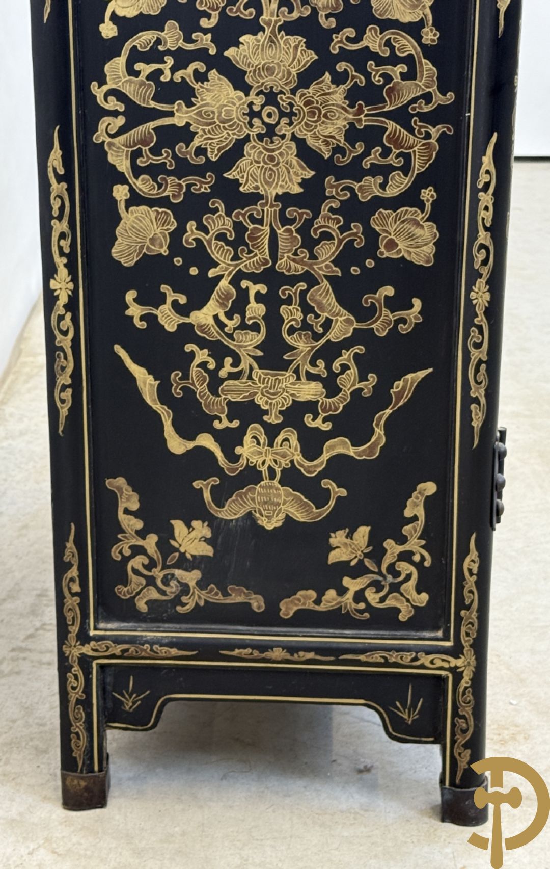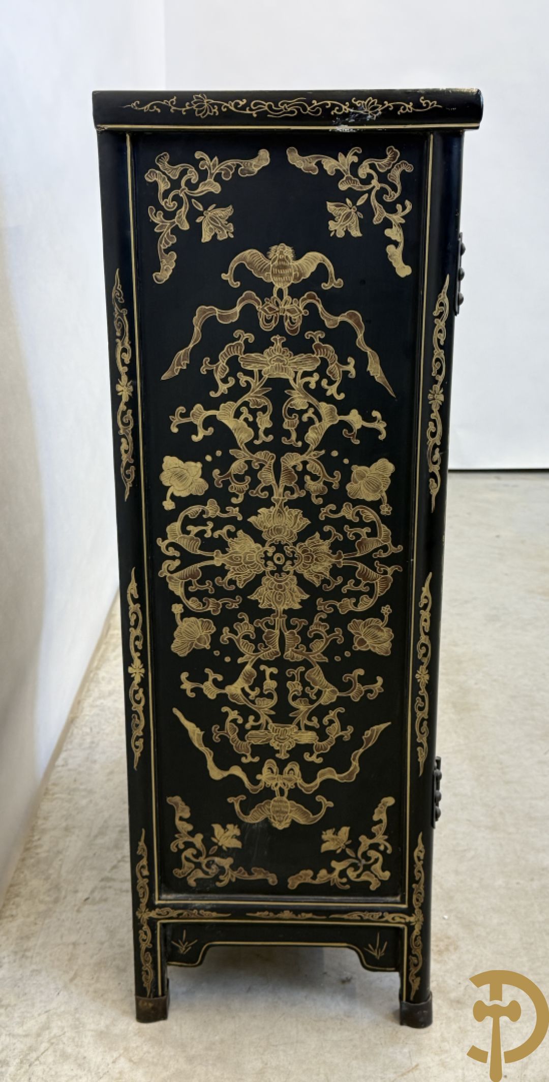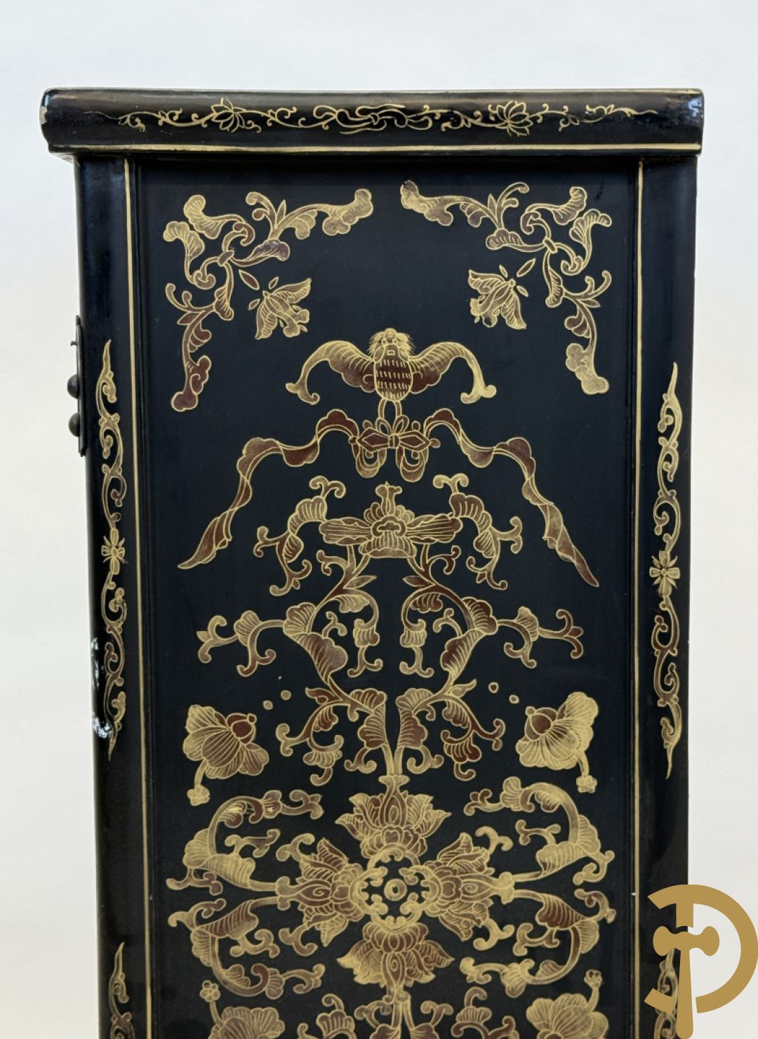 Zwartgelakt Chinees bijzetkastje met 2 deuren en bezet met dierenmotieven en verguld decor