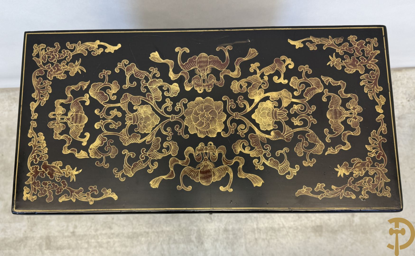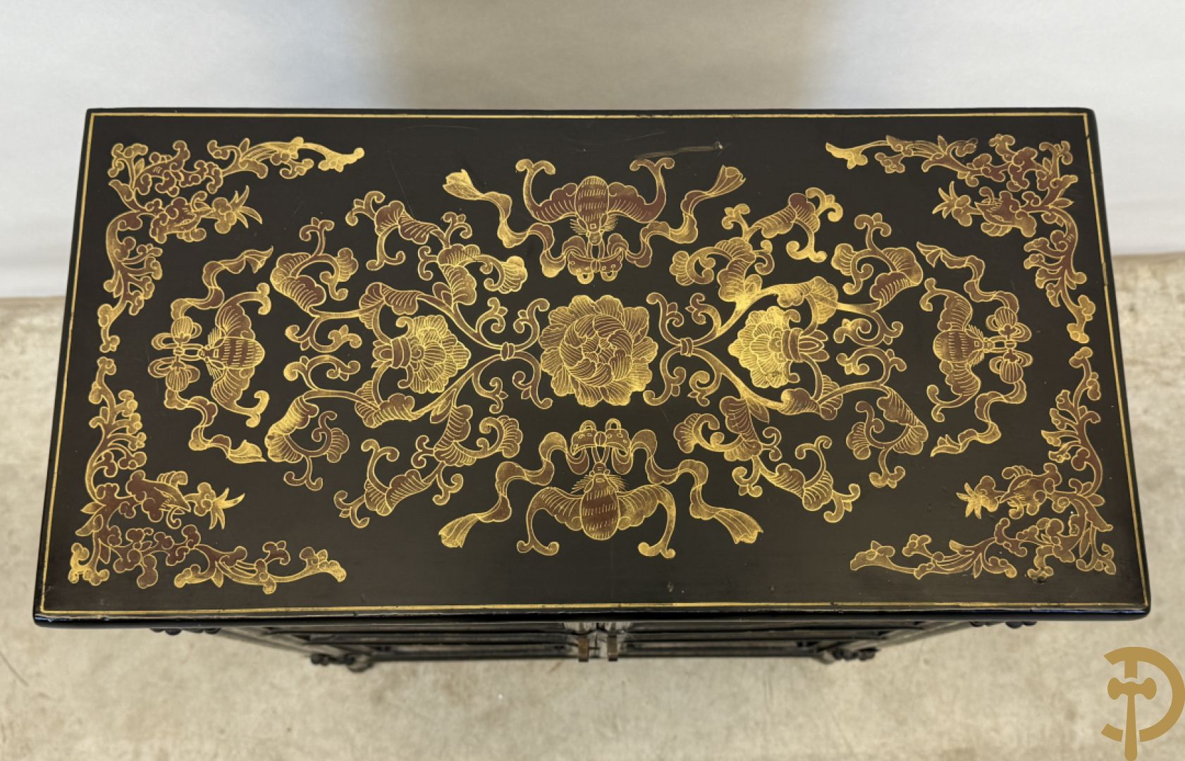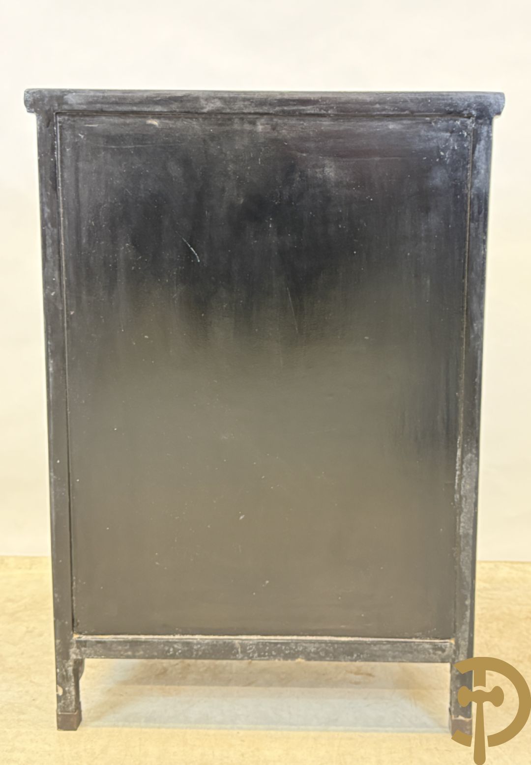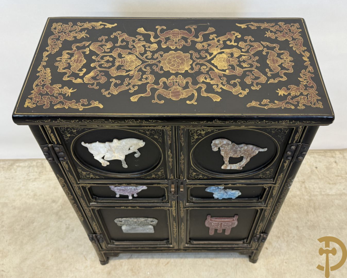 Zwartgelakt Chinees bijzetkastje met 2 deuren en bezet met dierenmotieven en verguld decor