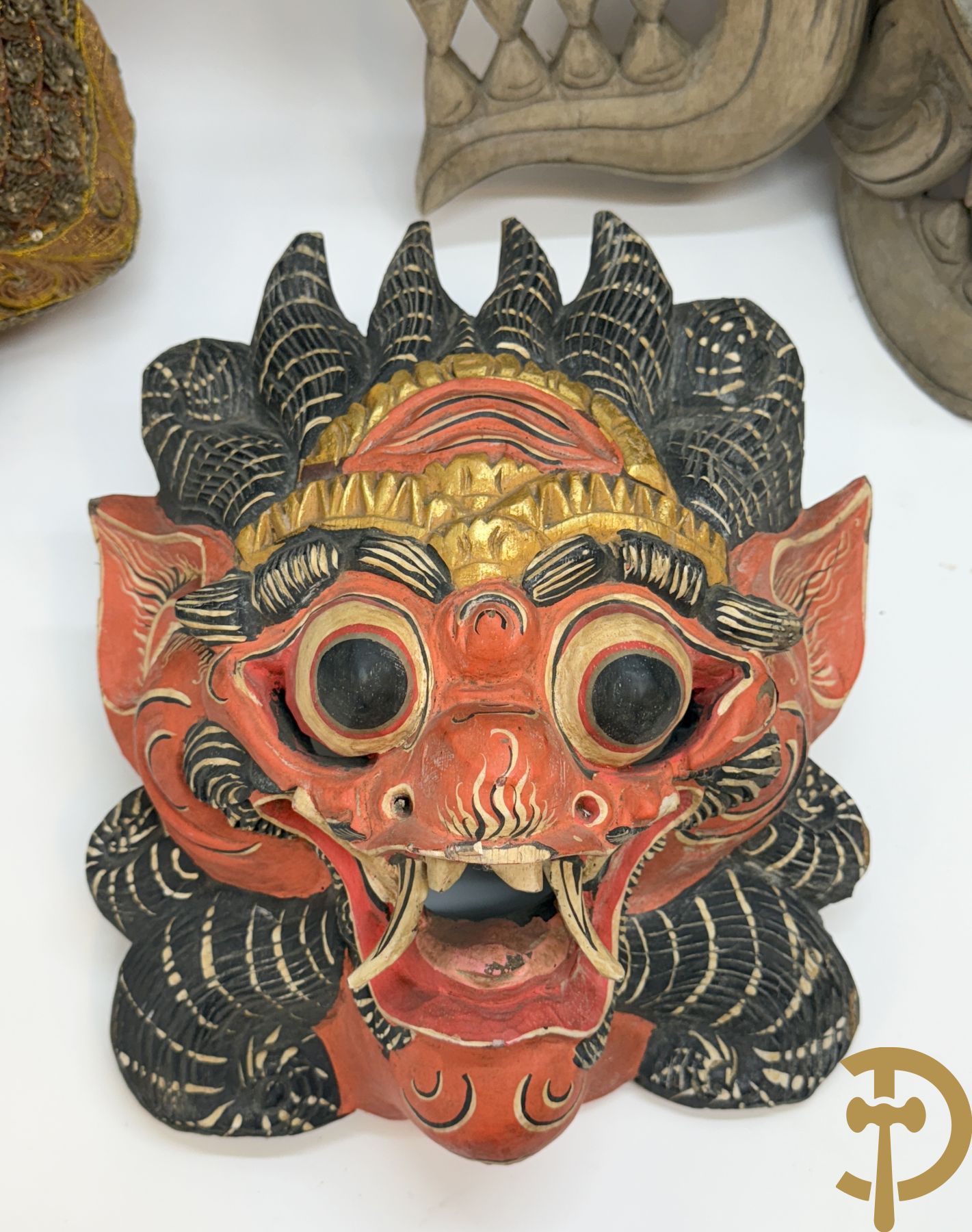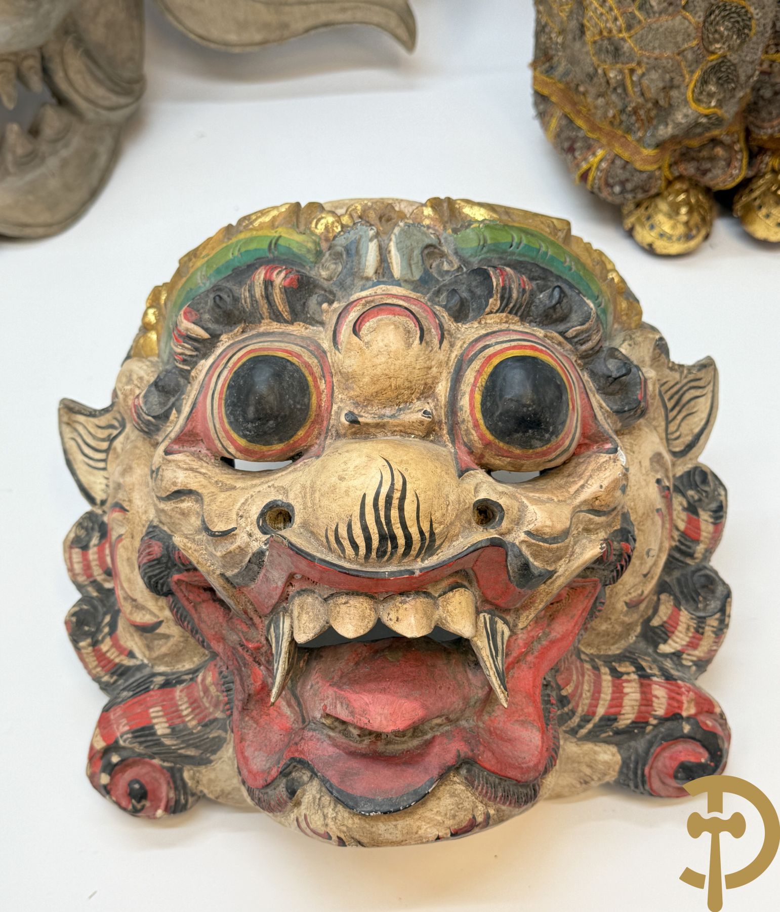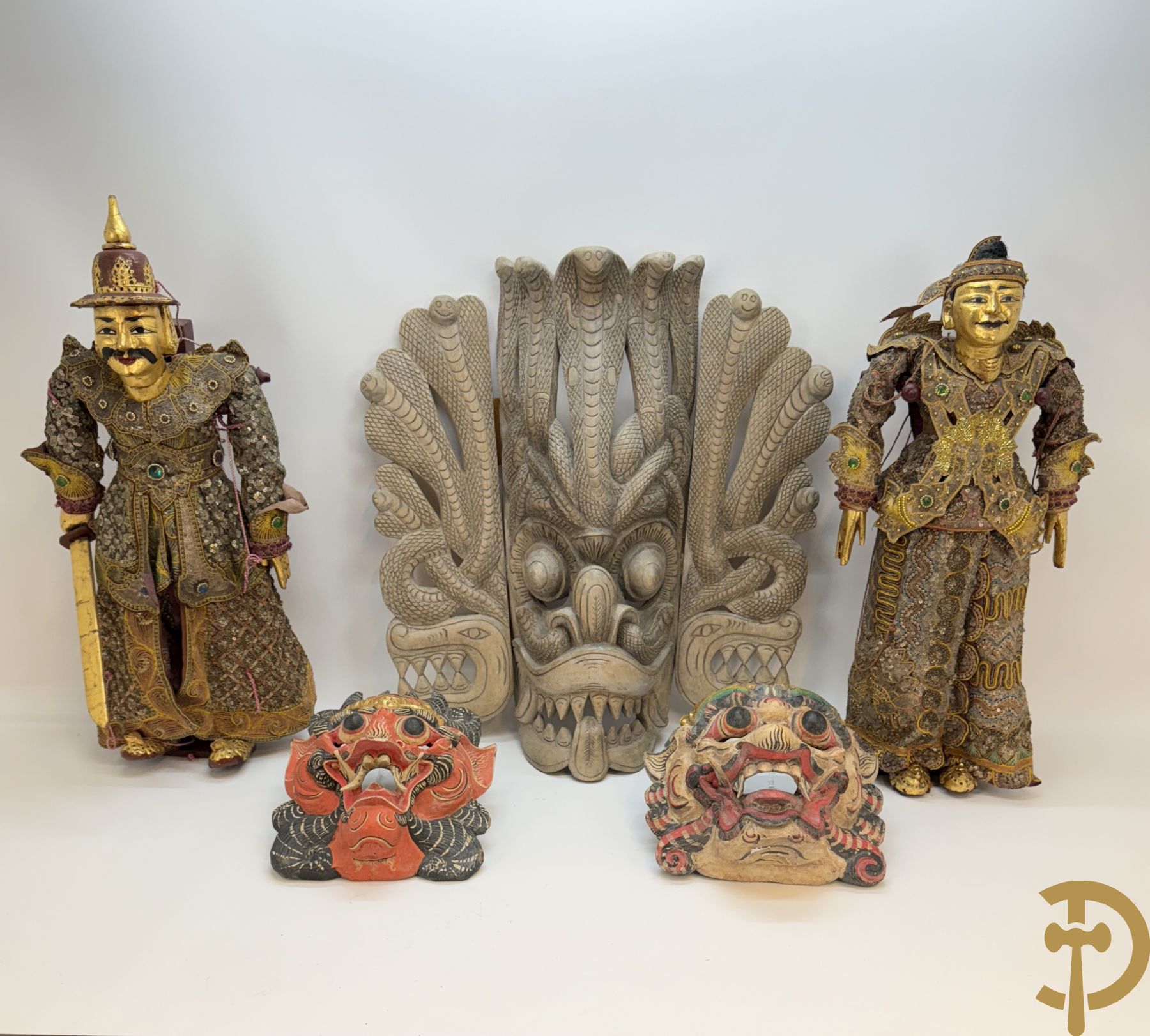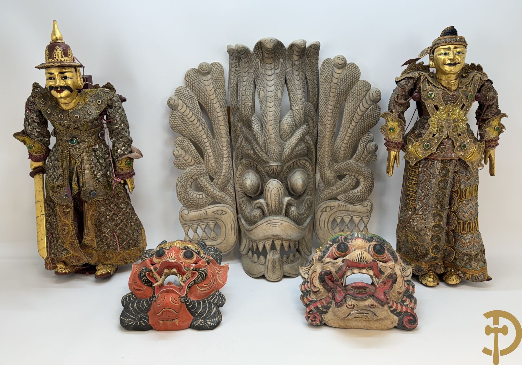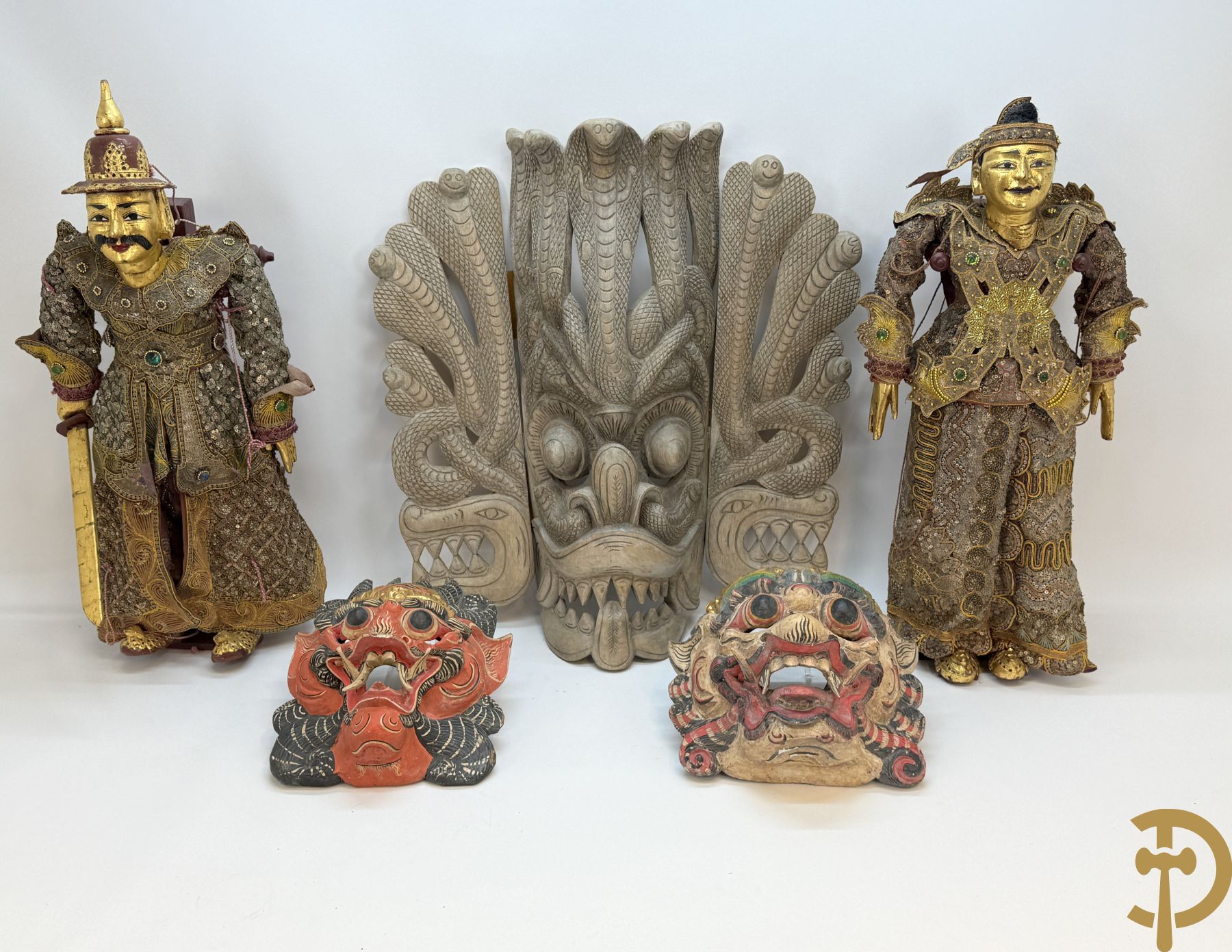 Balinese kunst : groot gesculpteerd masker + 2 gepolychromeerde maskers + 2 houtgesculpteerde poppen met fijne klederdracht