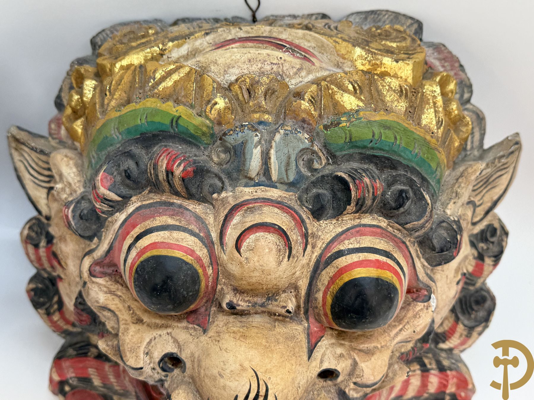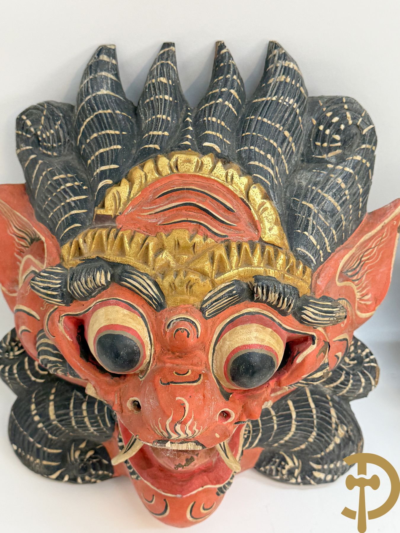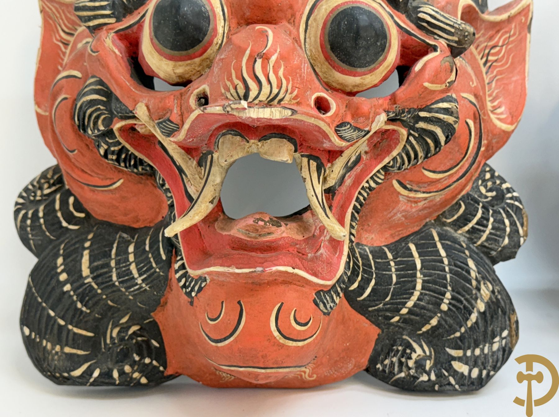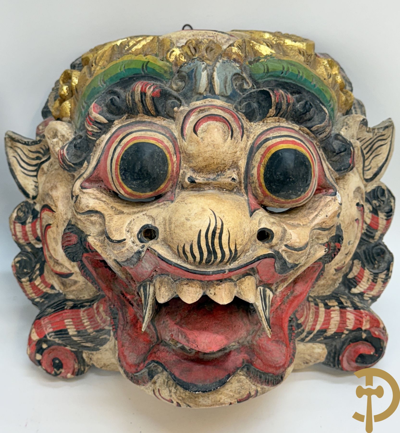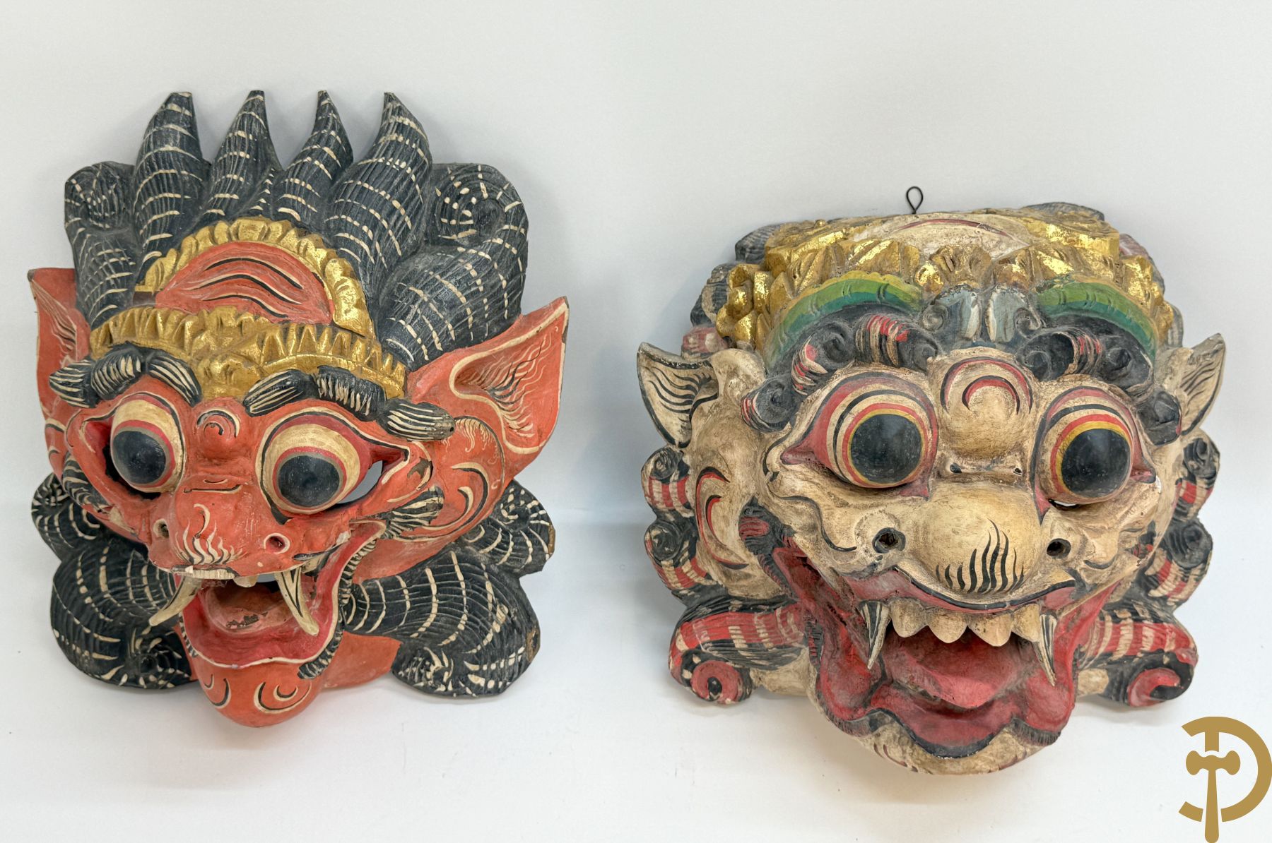 Balinese kunst : groot gesculpteerd masker + 2 gepolychromeerde maskers + 2 houtgesculpteerde poppen met fijne klederdracht