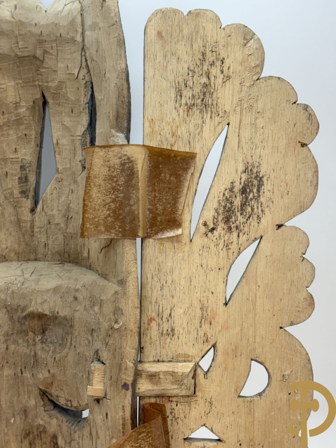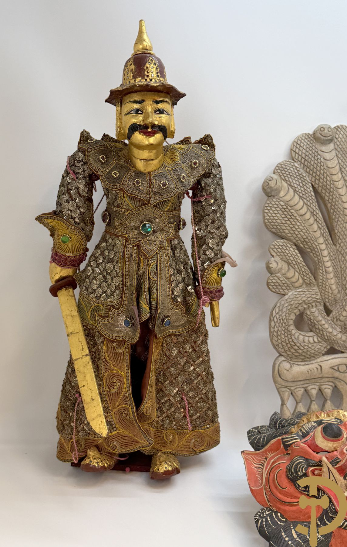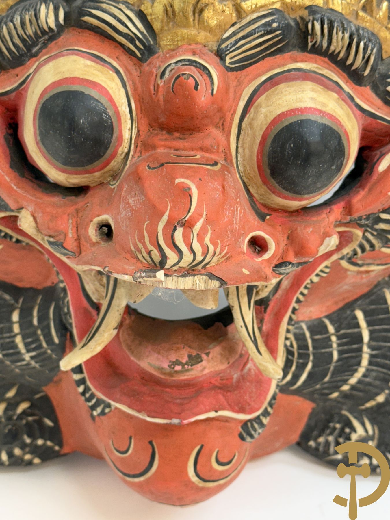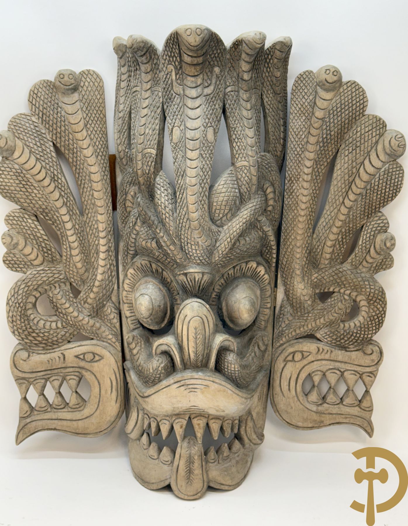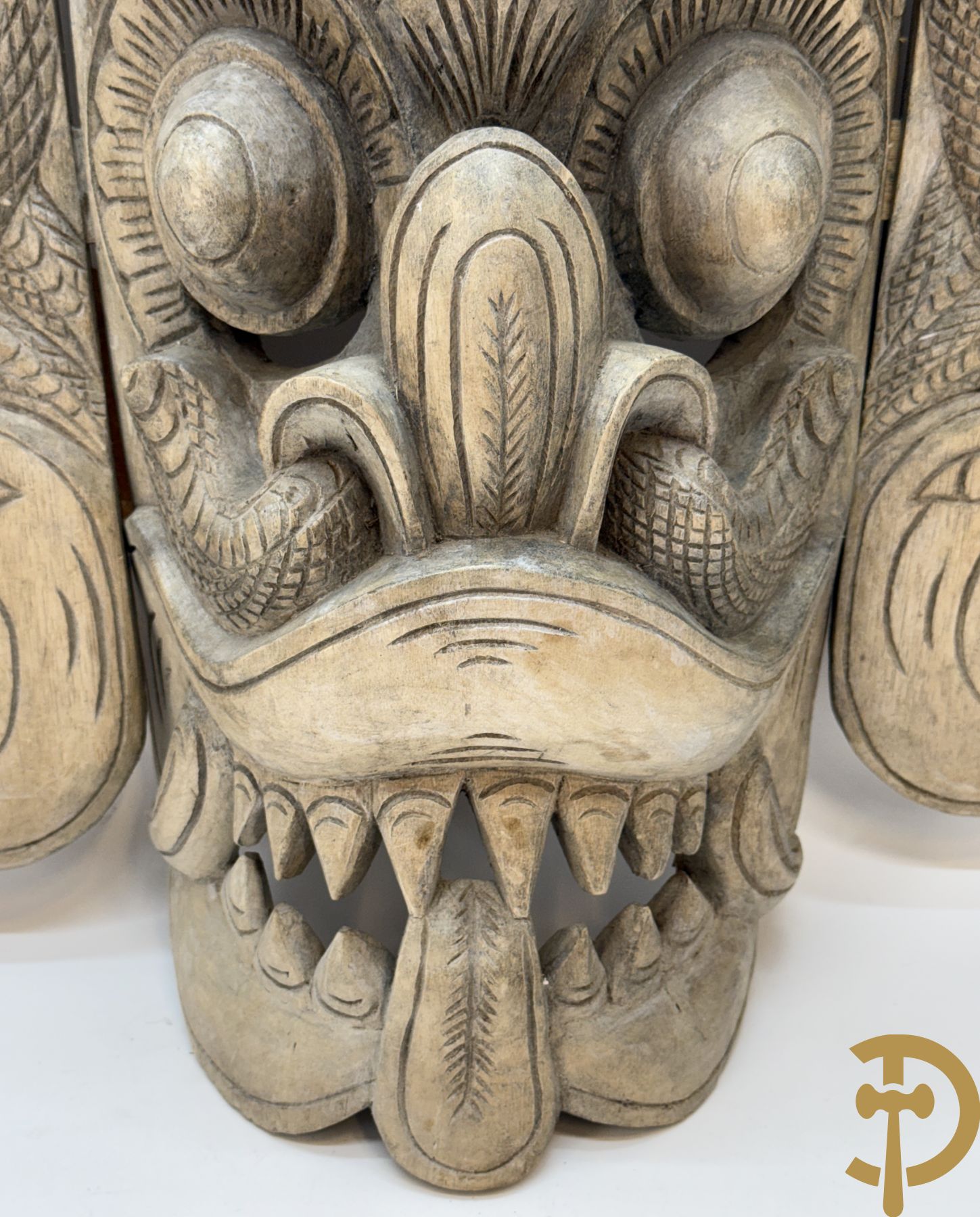 Balinese kunst : groot gesculpteerd masker + 2 gepolychromeerde maskers + 2 houtgesculpteerde poppen met fijne klederdracht