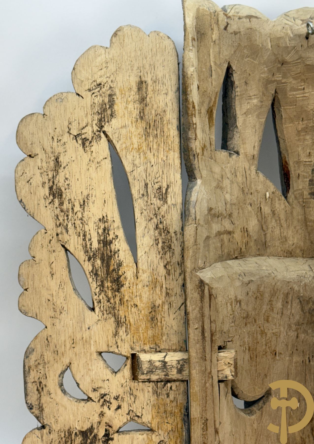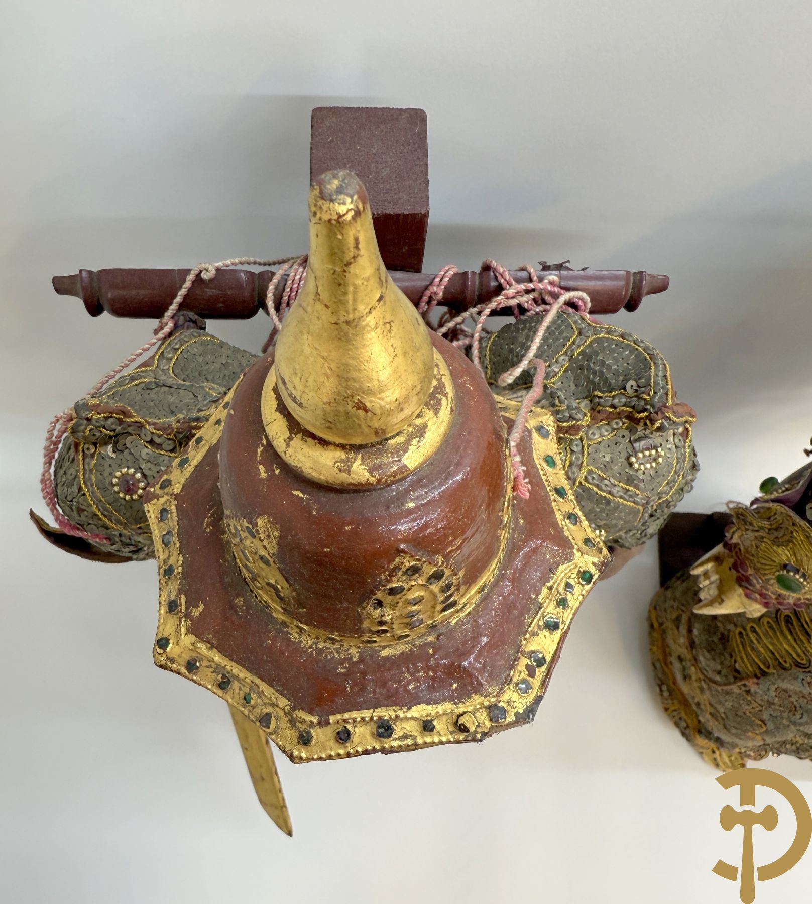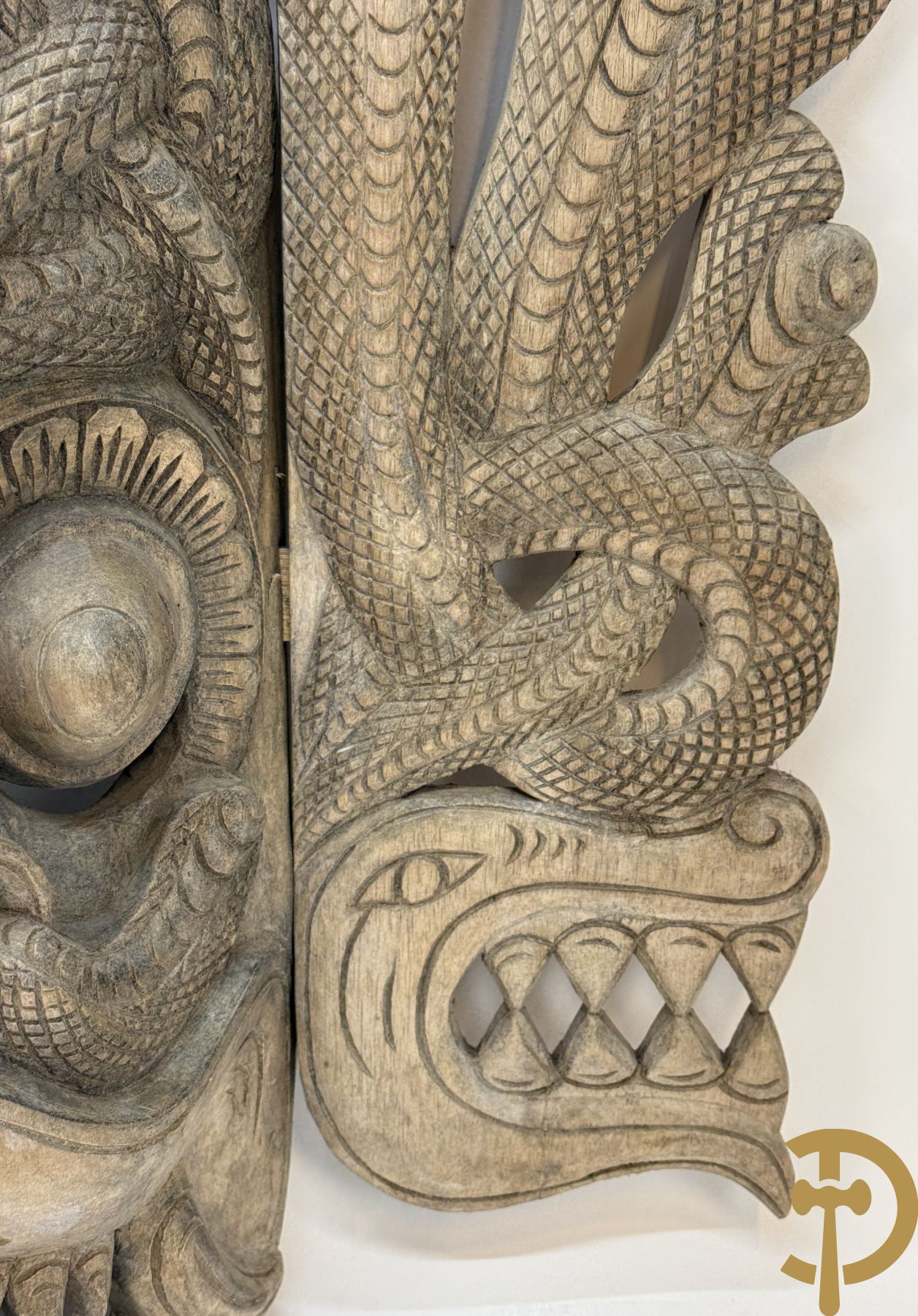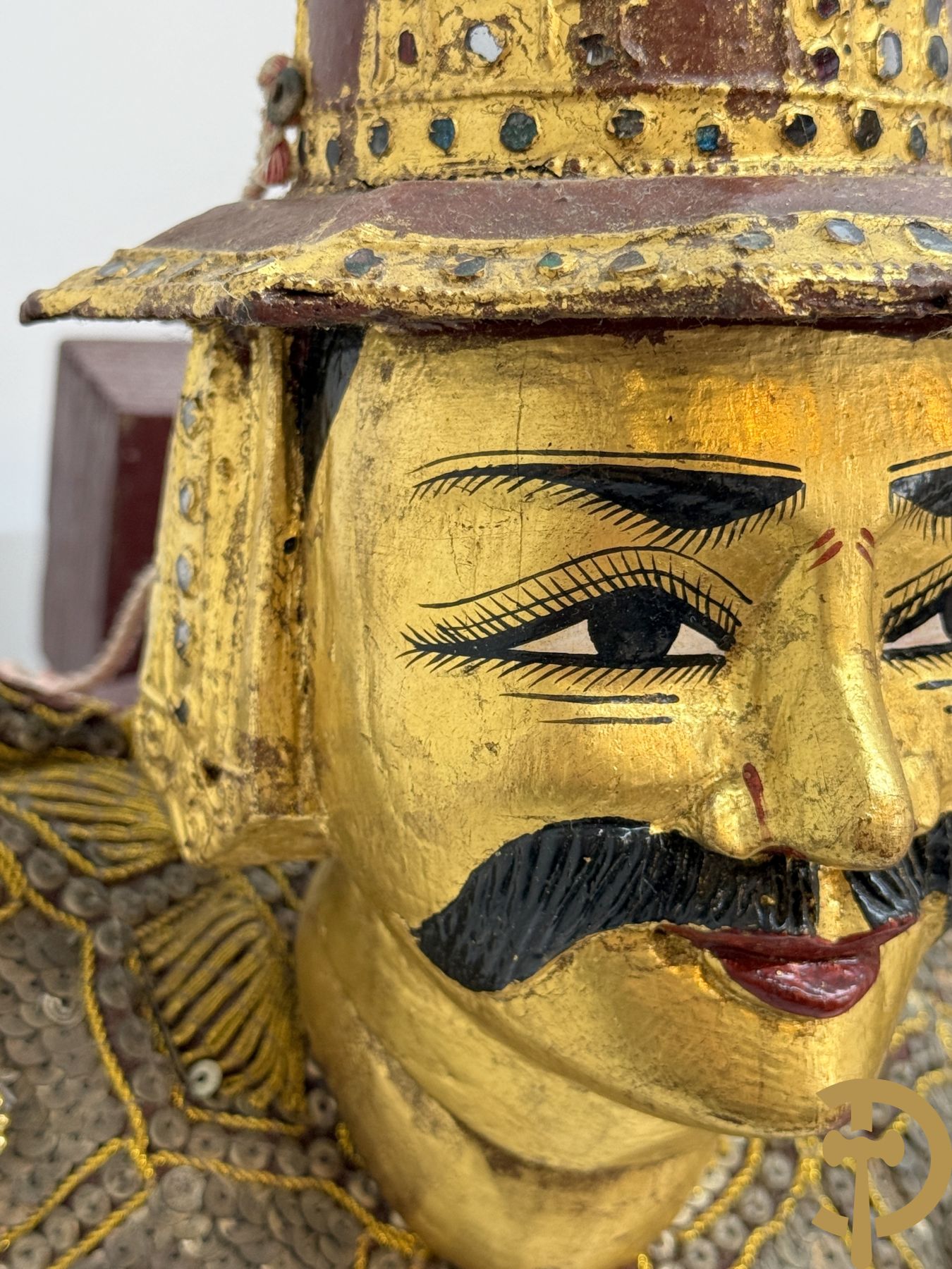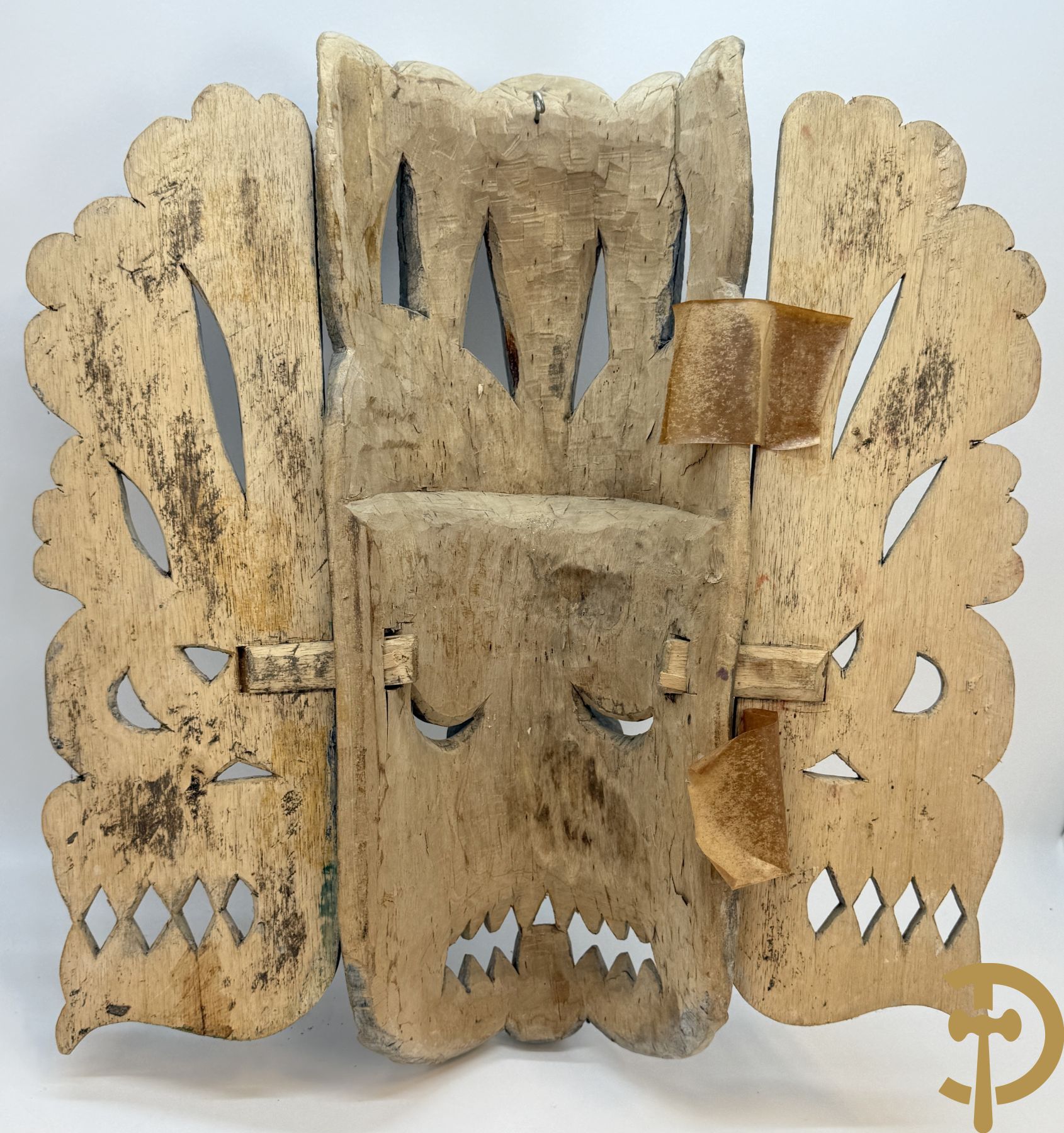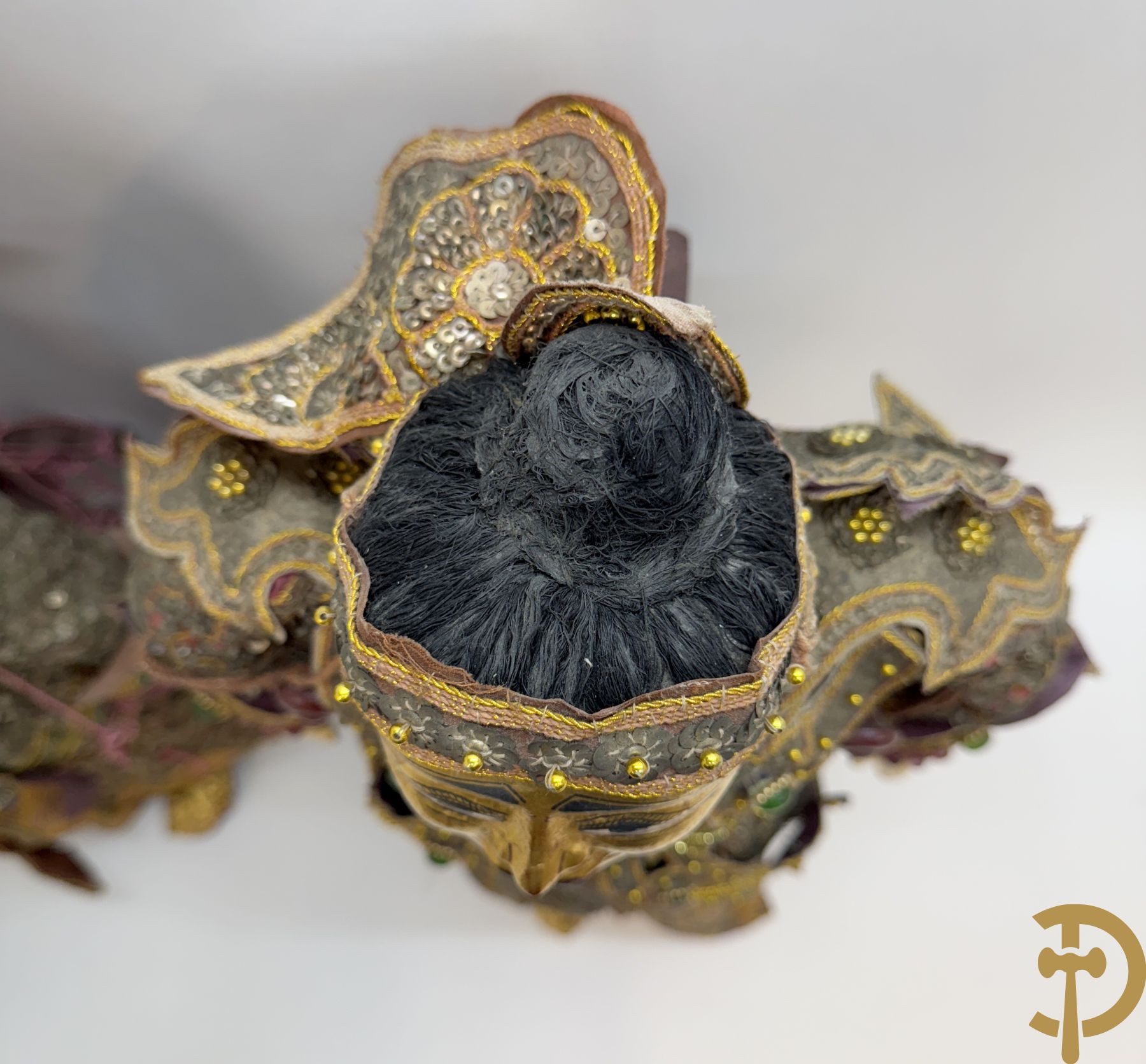 Balinese kunst : groot gesculpteerd masker + 2 gepolychromeerde maskers + 2 houtgesculpteerde poppen met fijne klederdracht