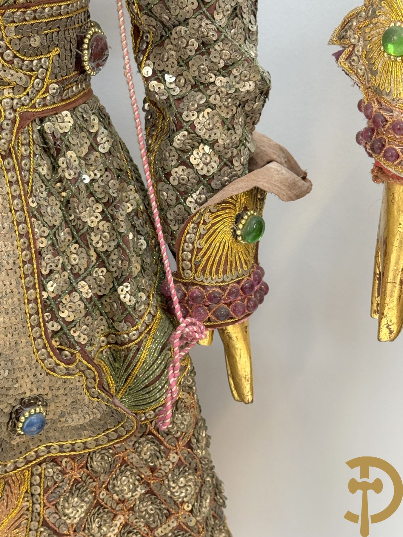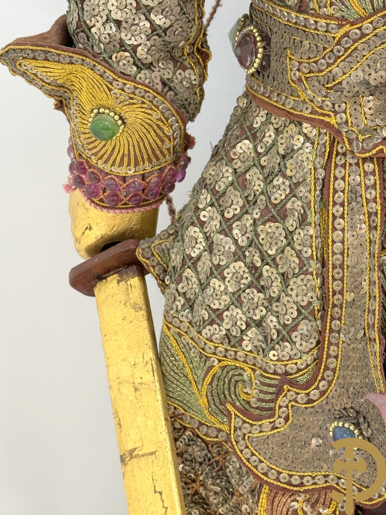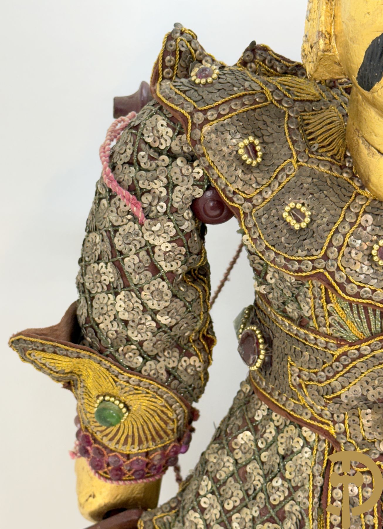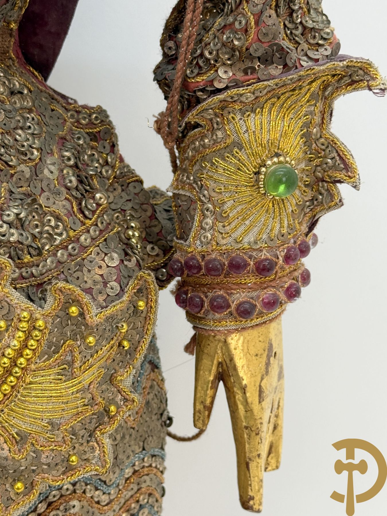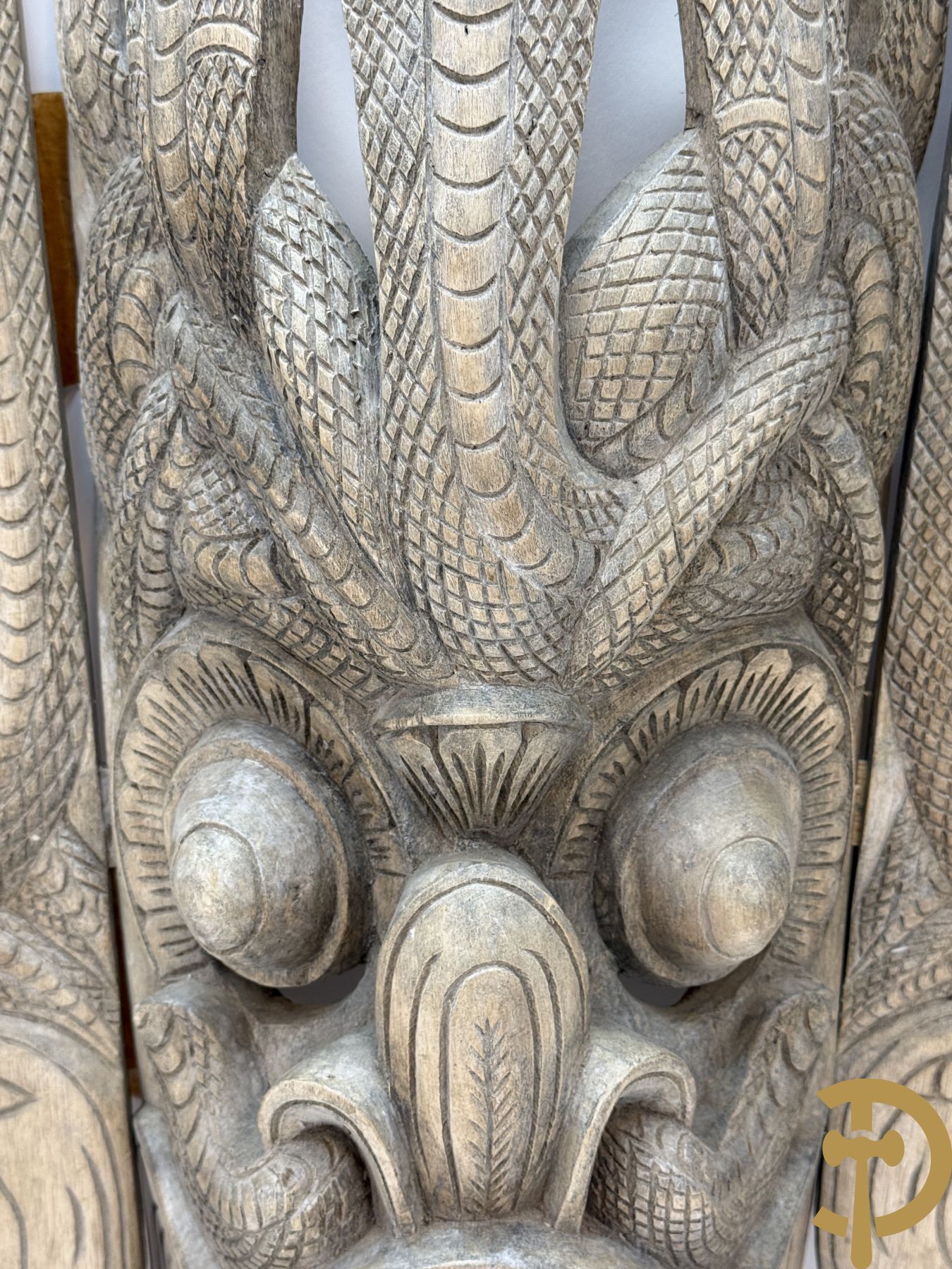 Balinese kunst : groot gesculpteerd masker + 2 gepolychromeerde maskers + 2 houtgesculpteerde poppen met fijne klederdracht