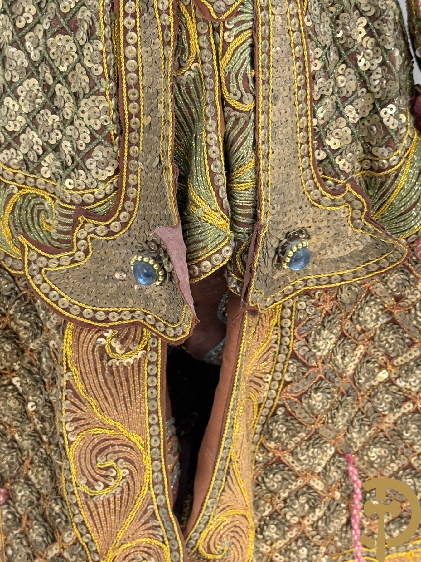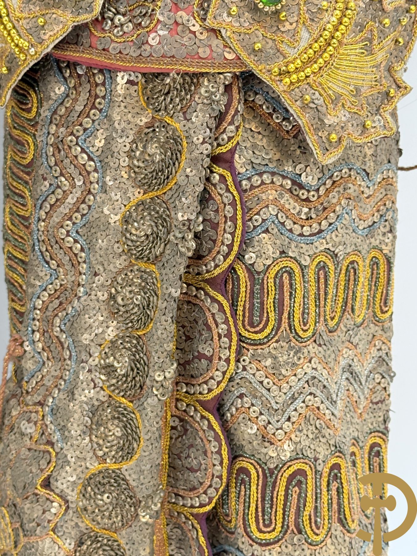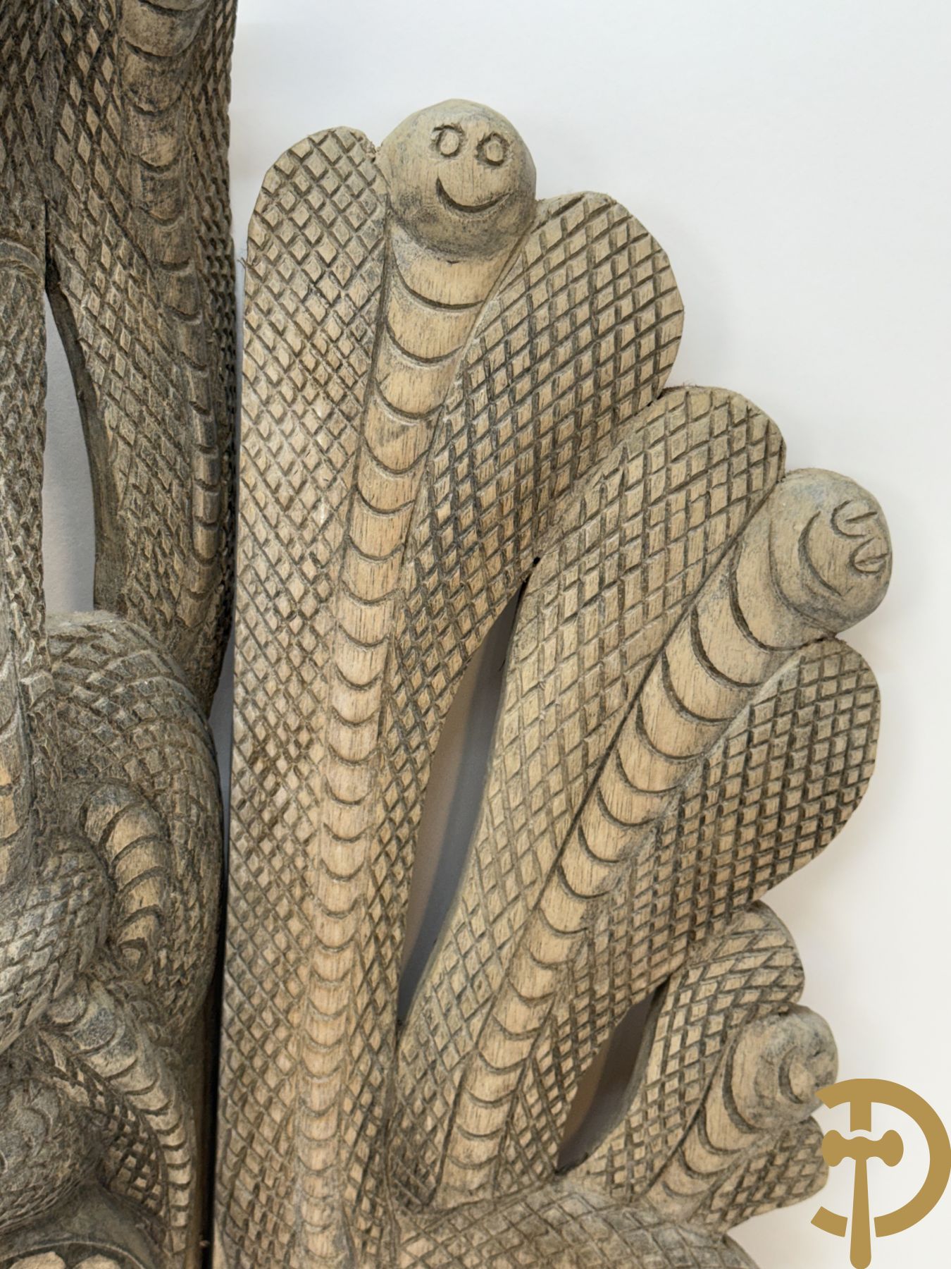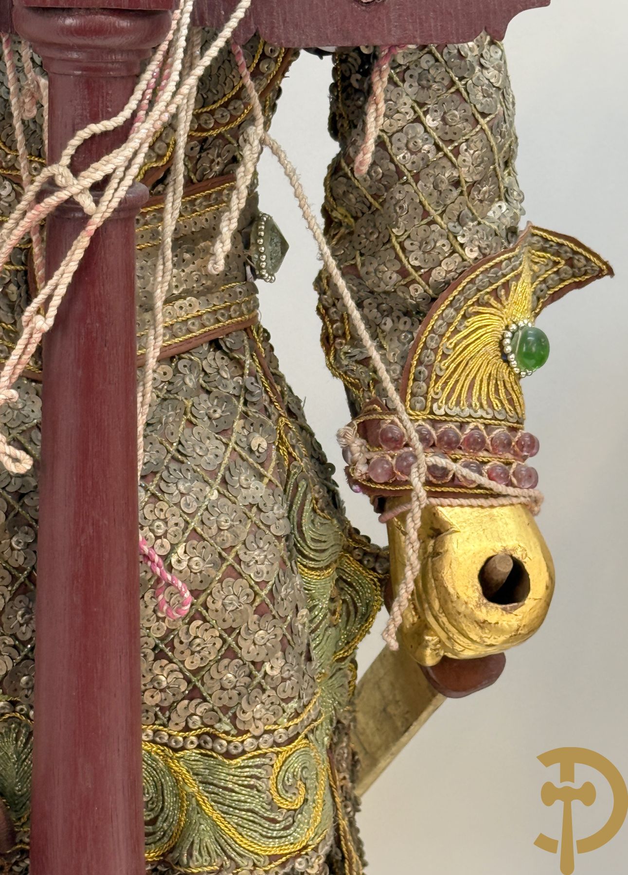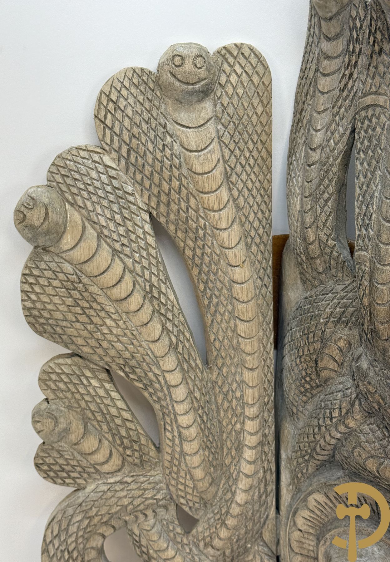 Balinese kunst : groot gesculpteerd masker + 2 gepolychromeerde maskers + 2 houtgesculpteerde poppen met fijne klederdracht