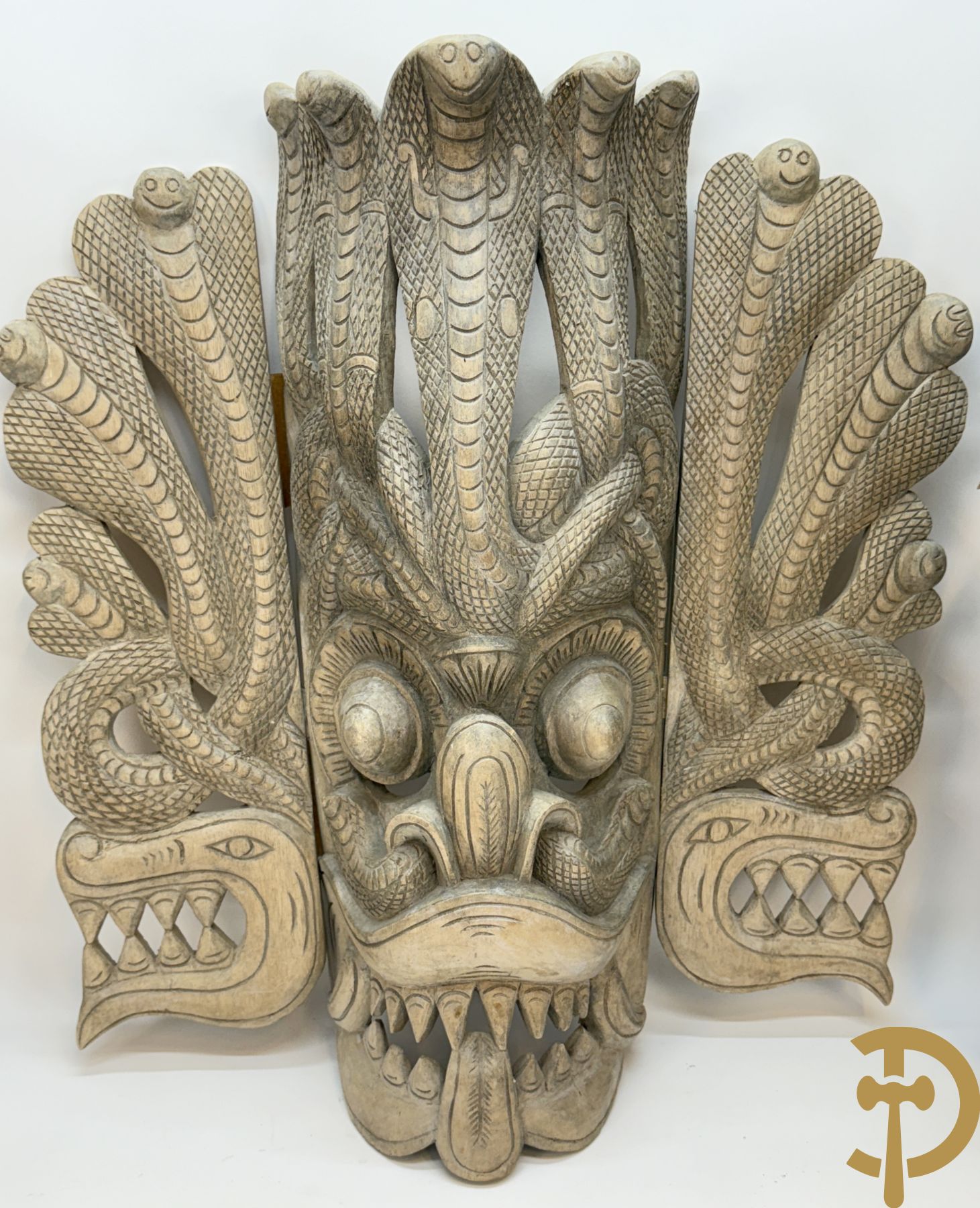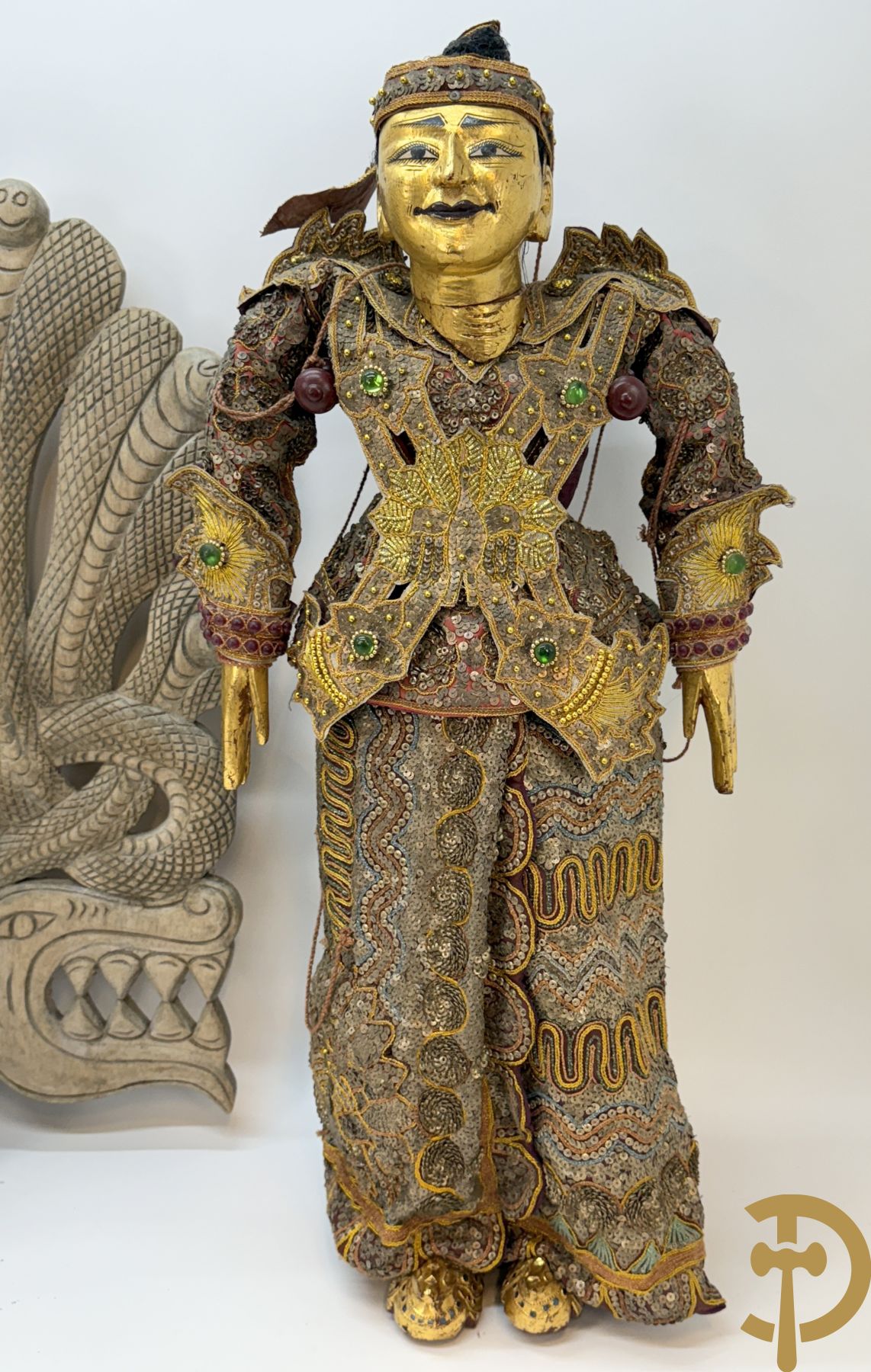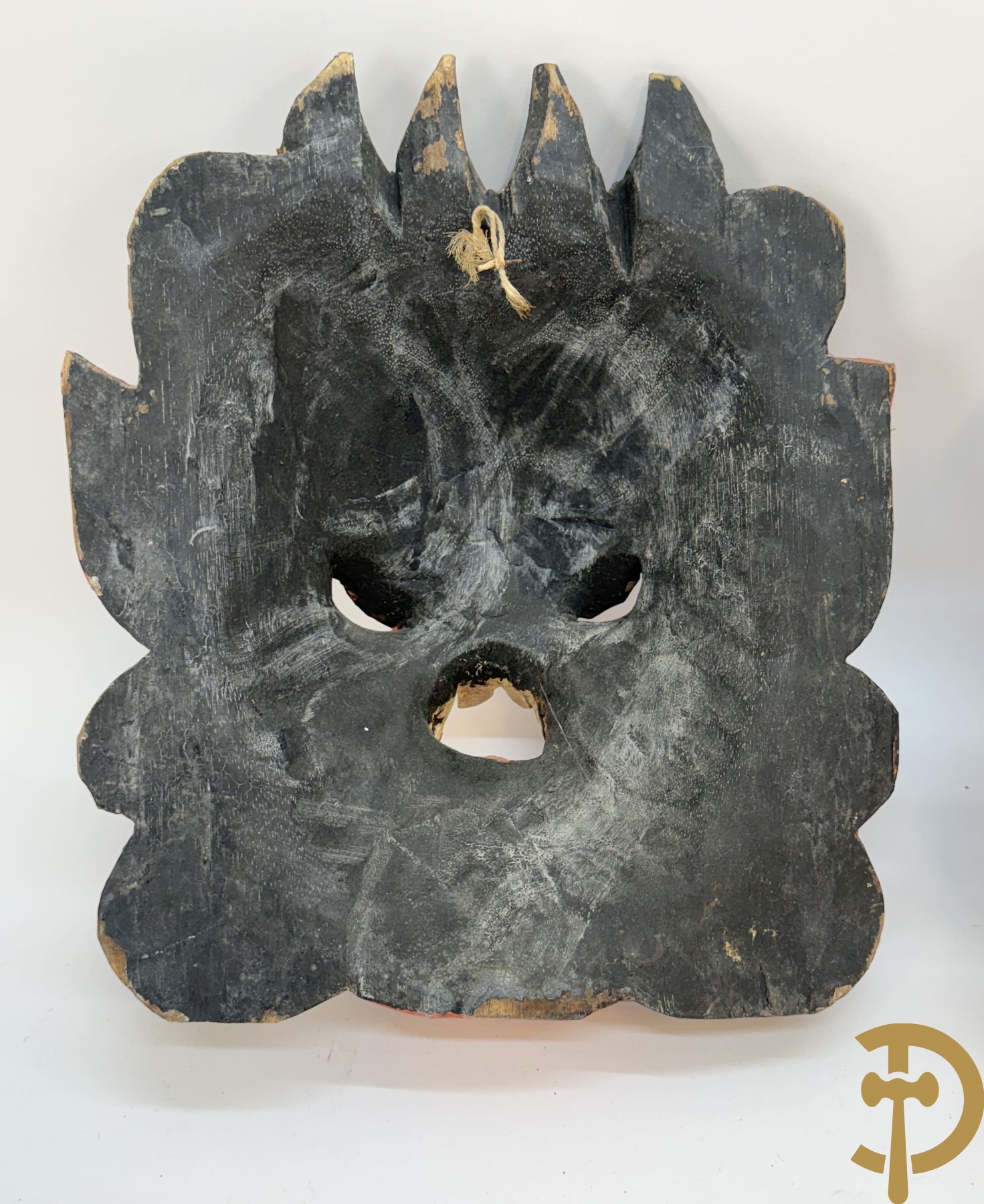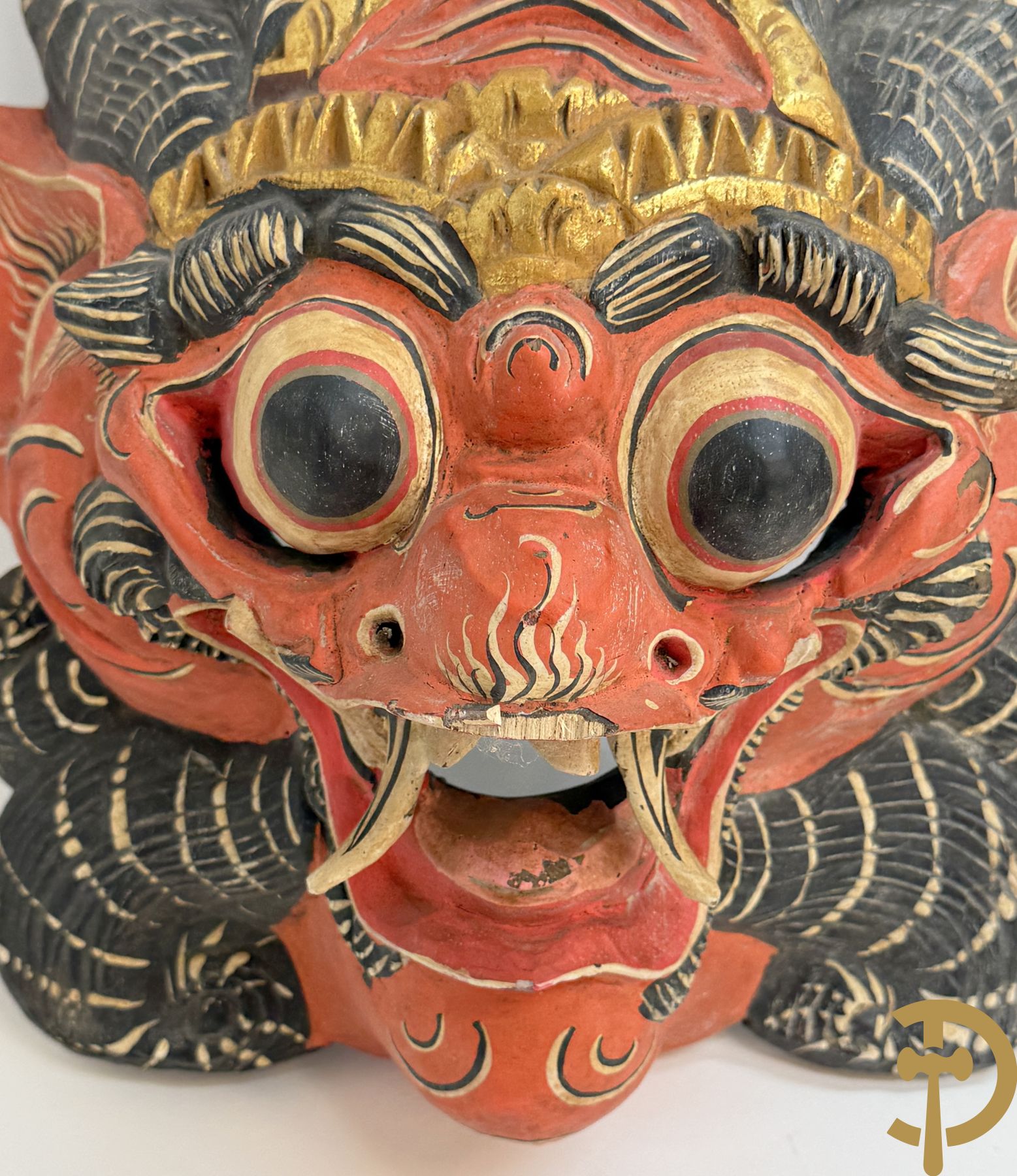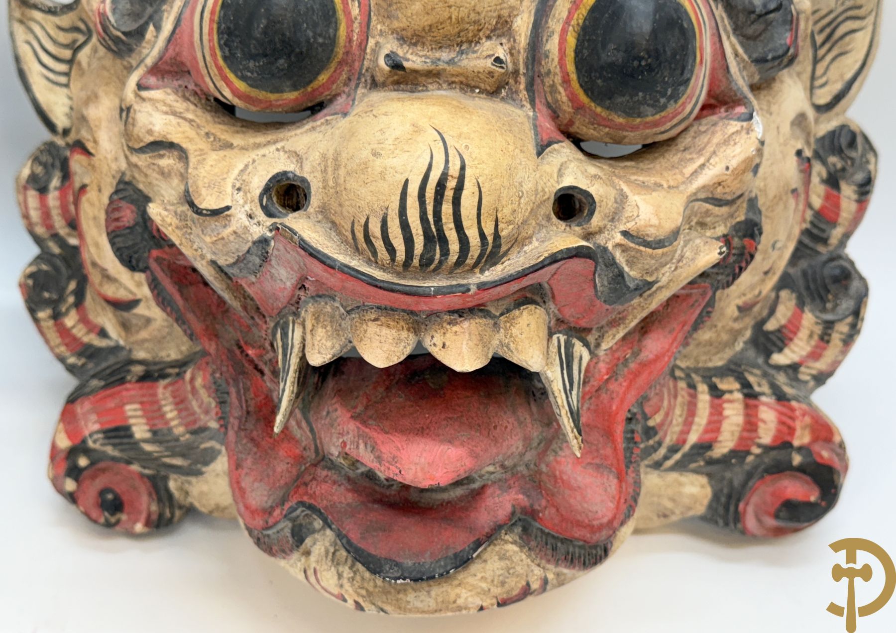 LOT 45 - Balinese kunst : groot gesculpteerd masker + 2 gepolychromeerde maskers + 2 houtgesculpteerde poppen met fijne klederdracht