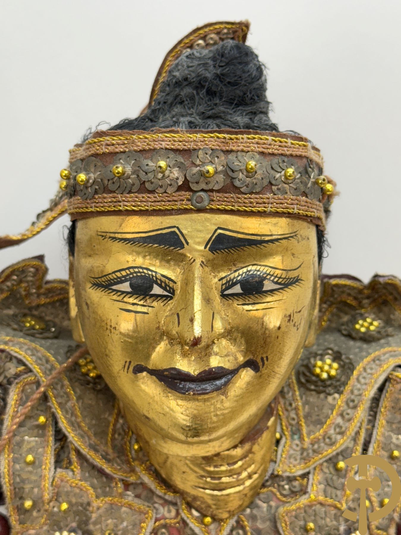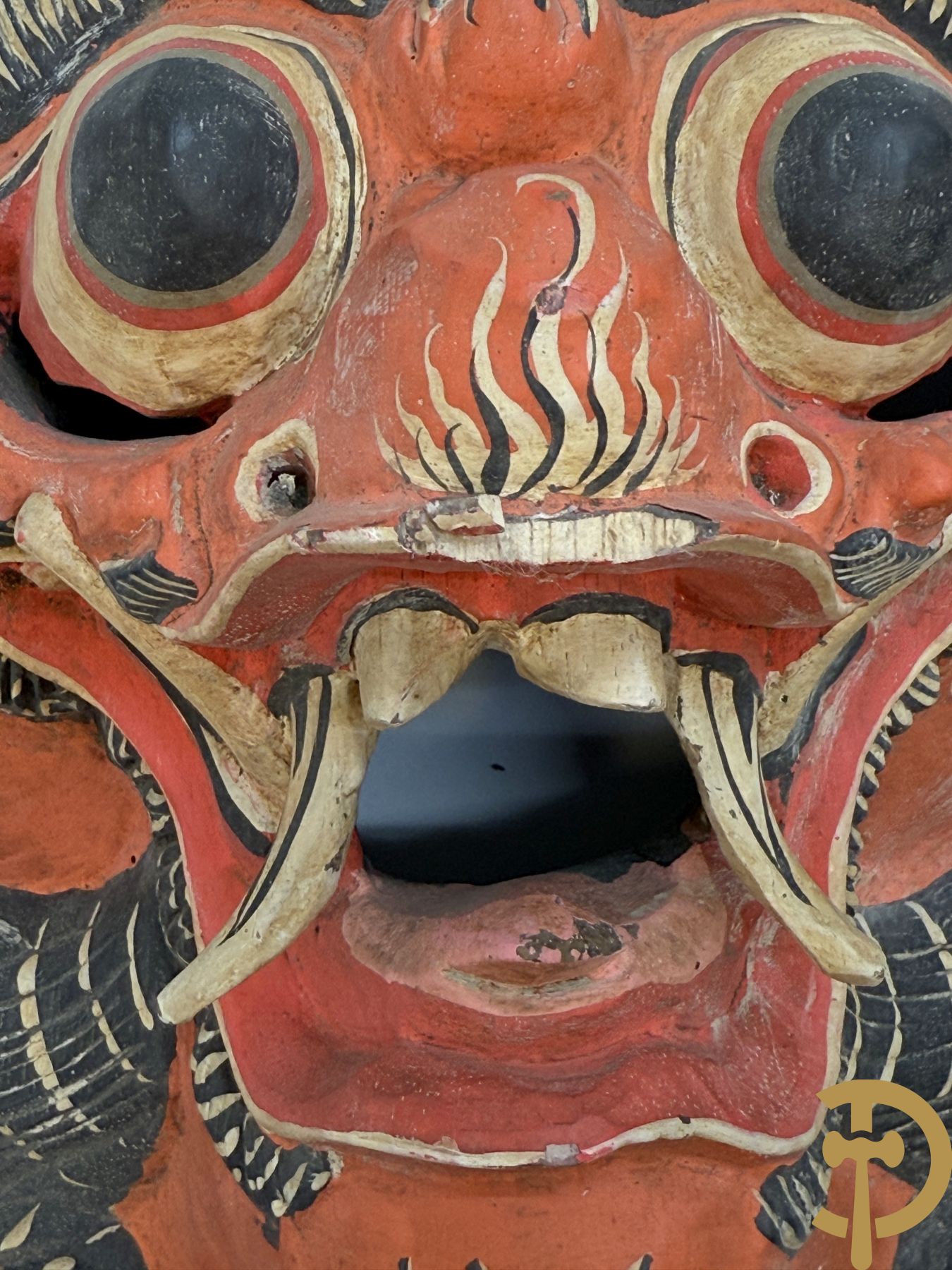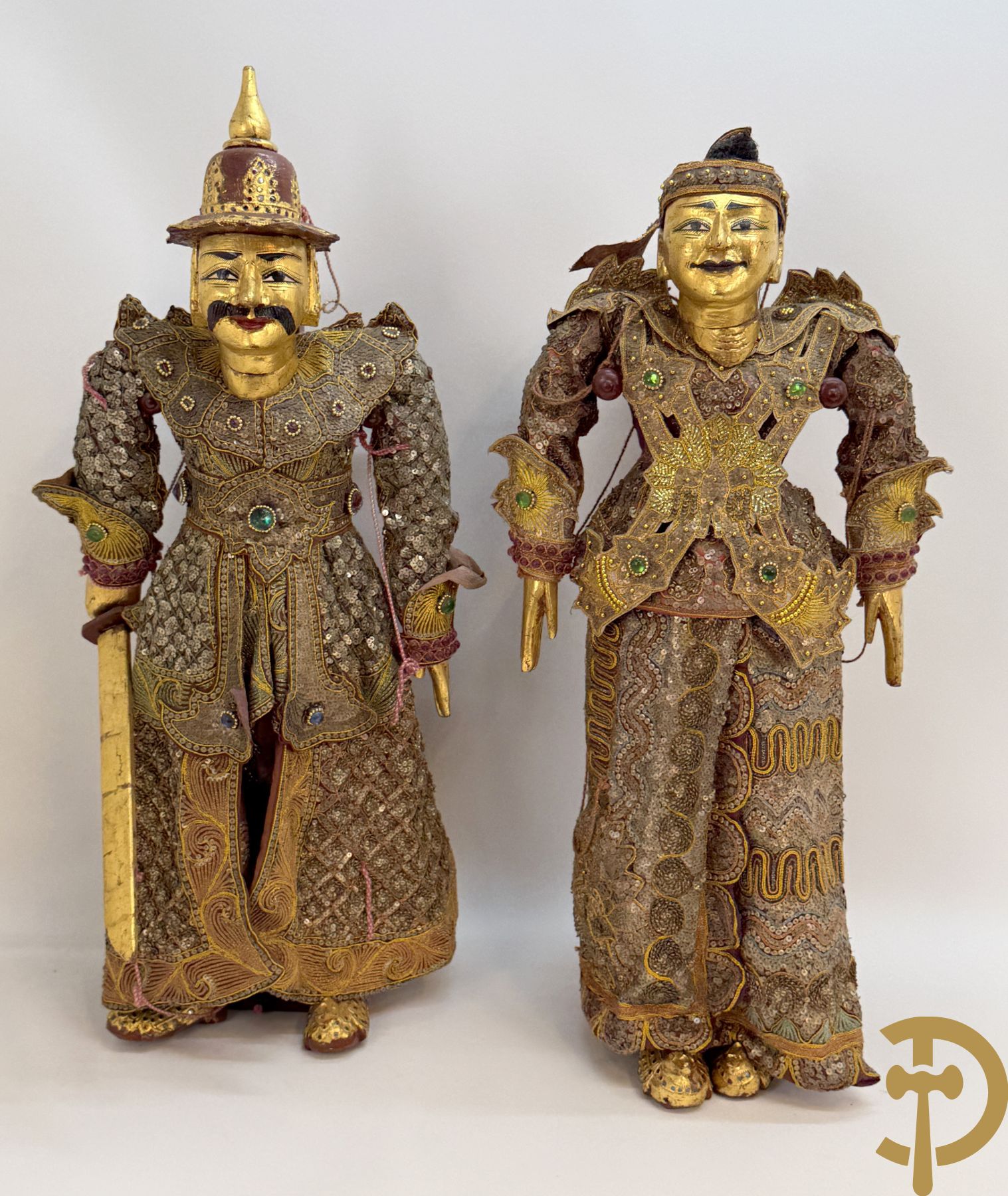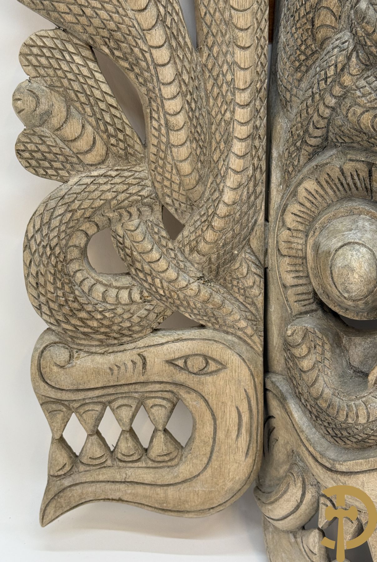 LOT 45 - Balinese kunst : groot gesculpteerd masker + 2 gepolychromeerde maskers + 2 houtgesculpteerde poppen met fijne klederdracht